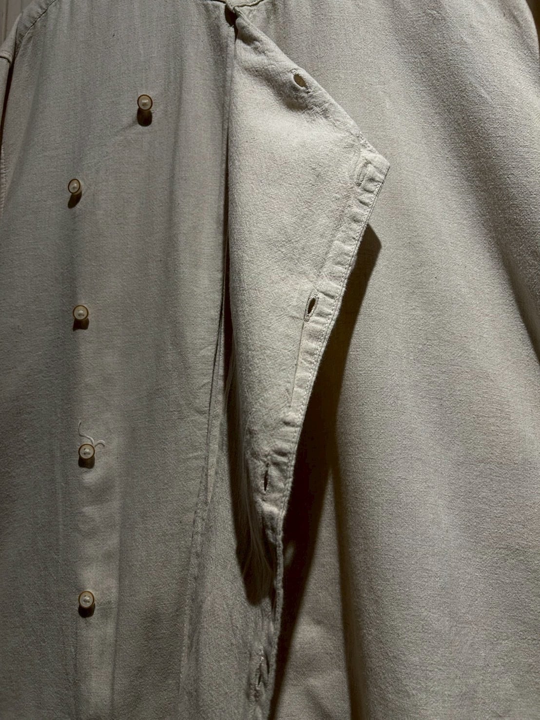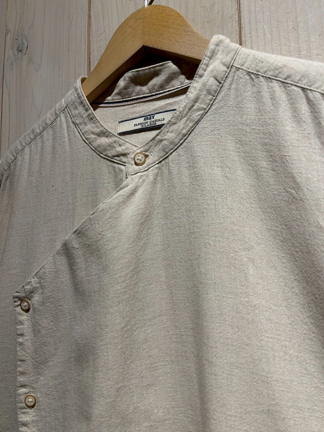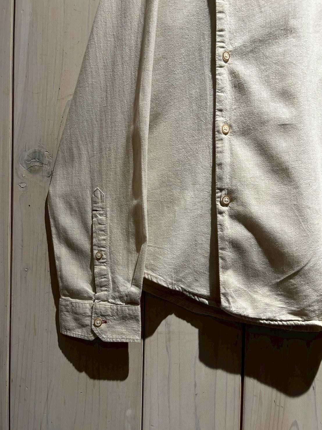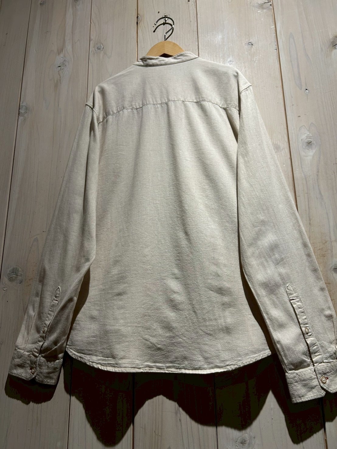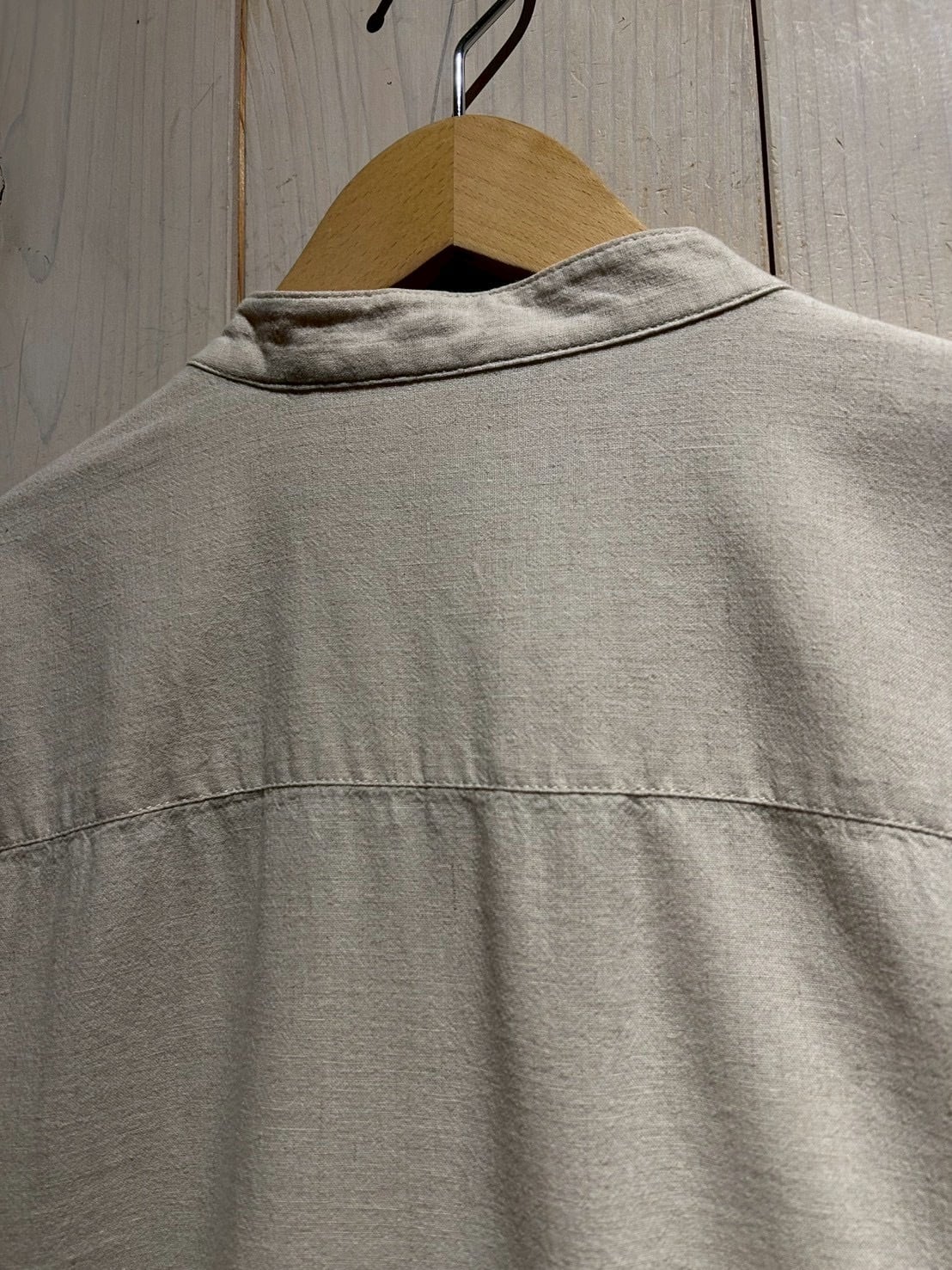 フロントは斜めに走るアシンメトリーな前立てが最大の特徴。スタンドカラーと組み合わさることで、通常のシャツとは一線を画すモードな印象に仕上がっています。
