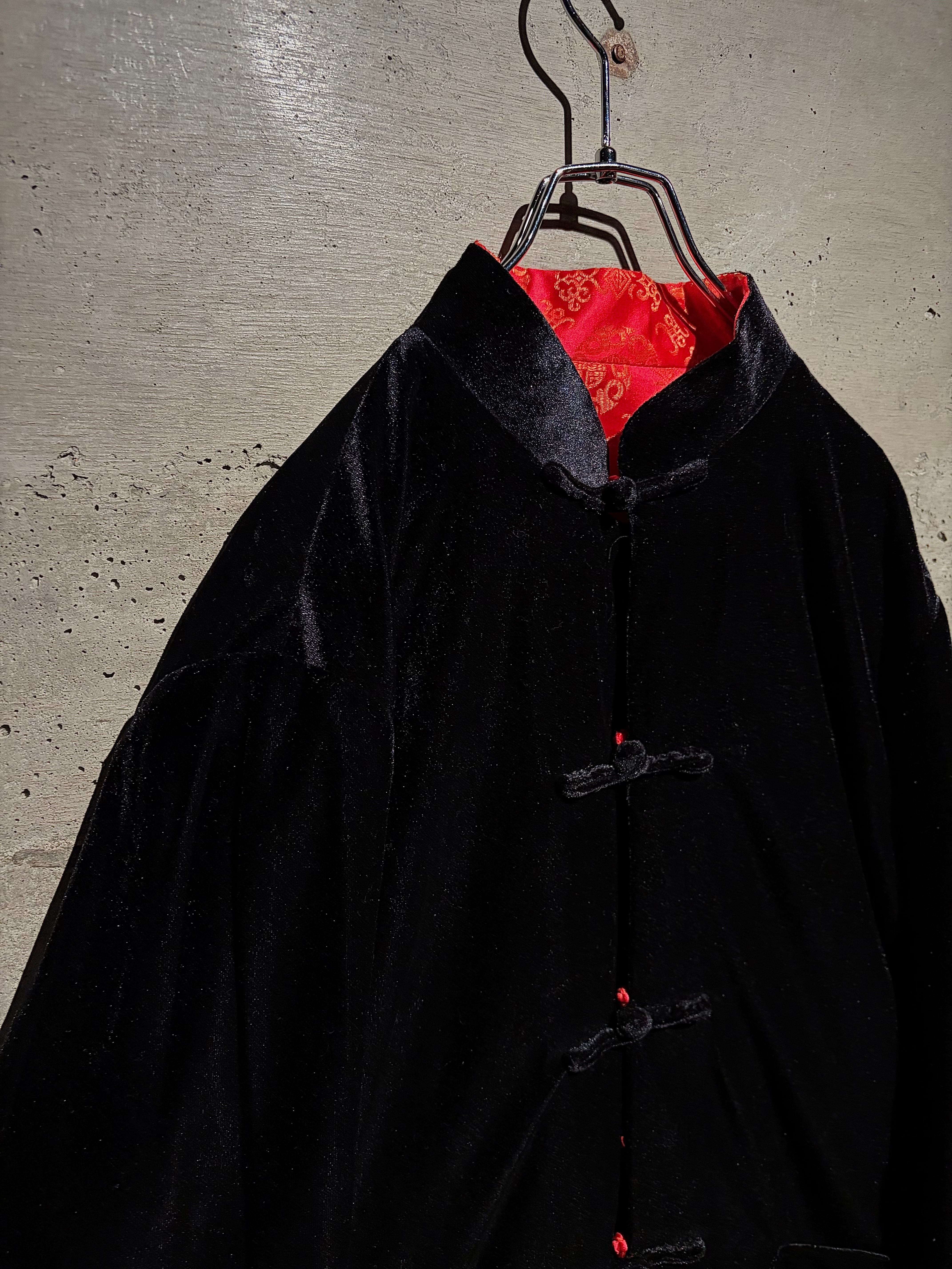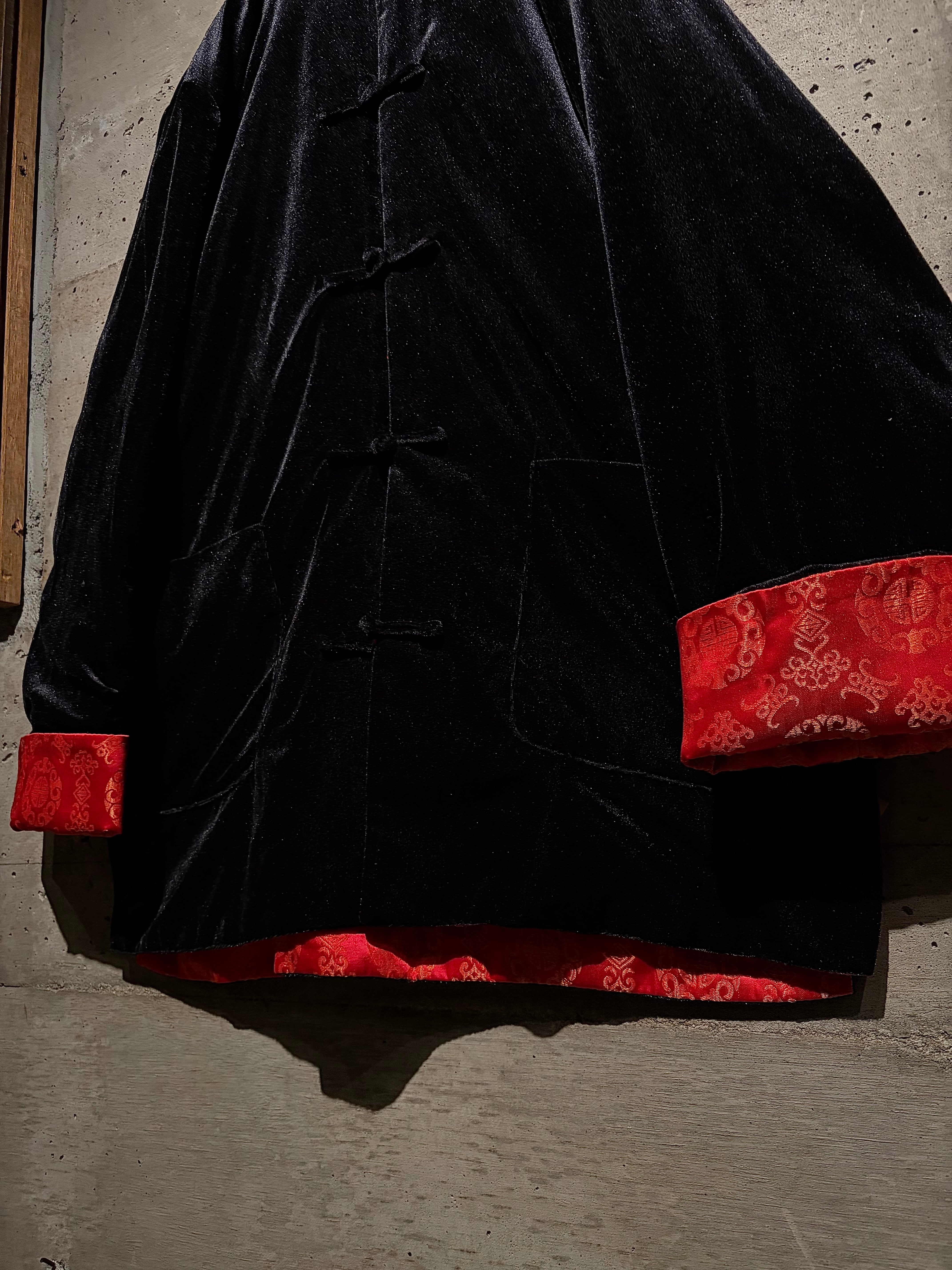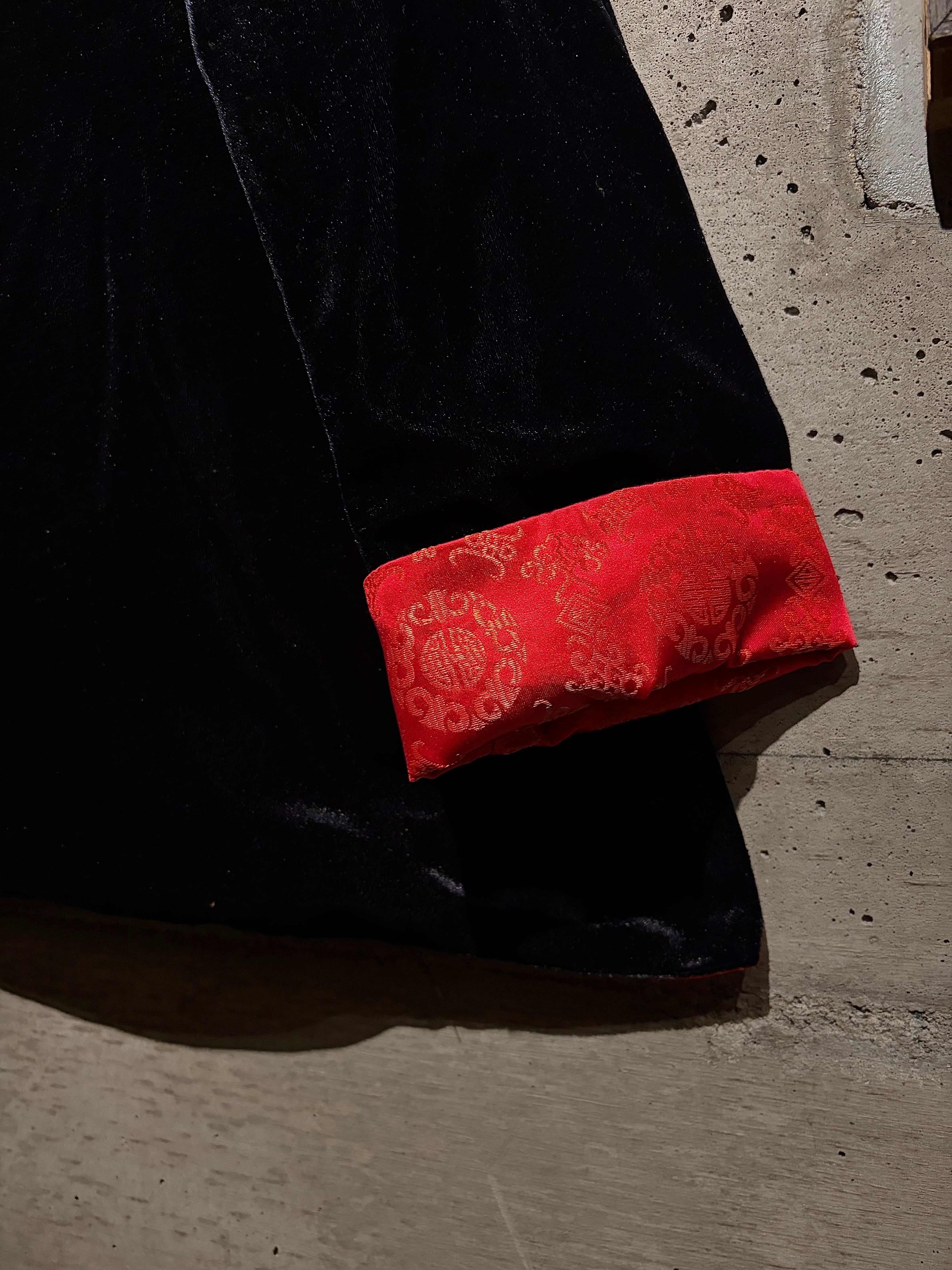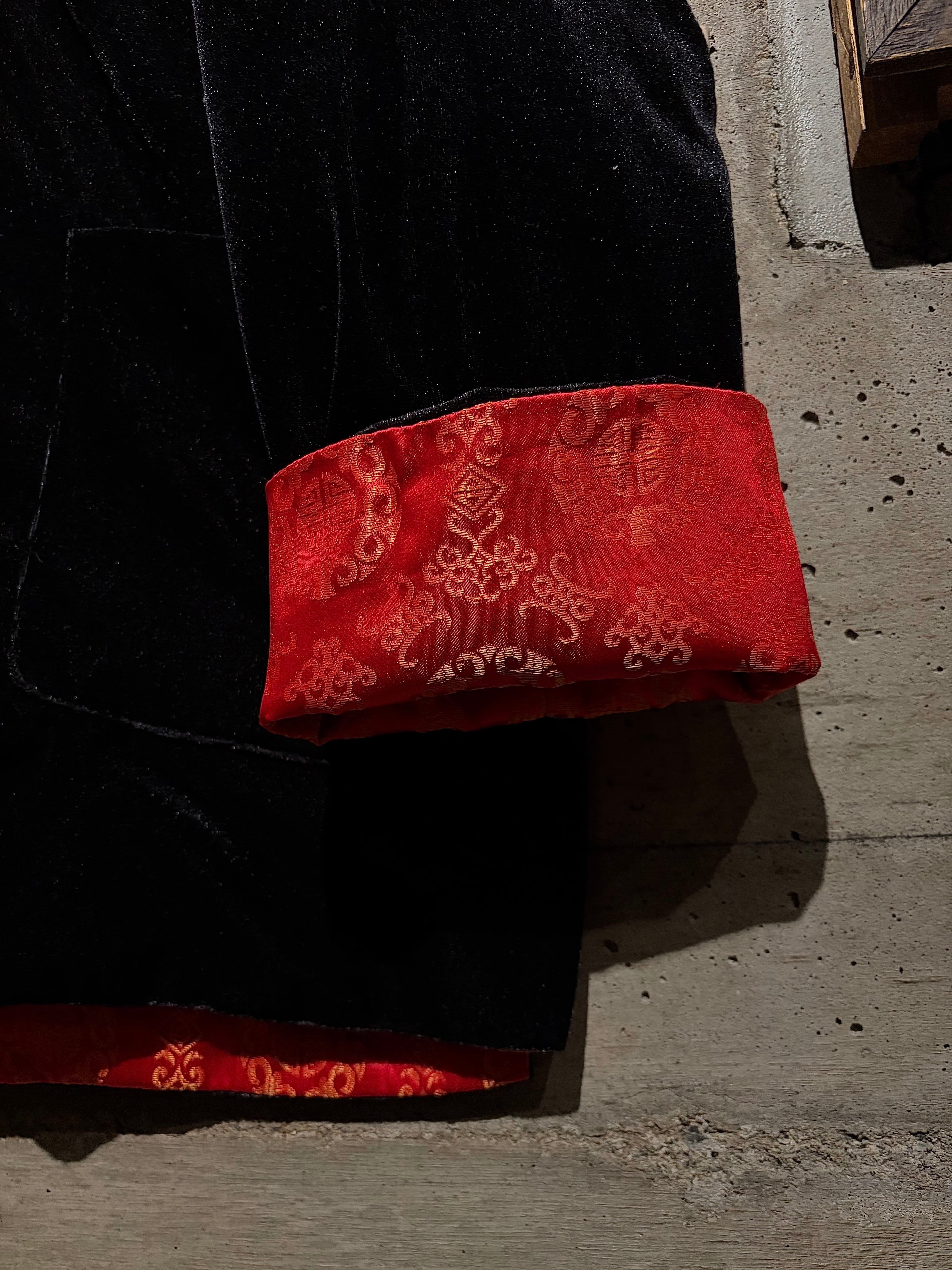 リバーシブルはチャイナシャツ自体でも珍しい仕様ですが、ベロア面を備えたリバーシブルは特に稀少。シンプルなブラックと華やかなレッド、全く異なる表情を1着で楽しめます。