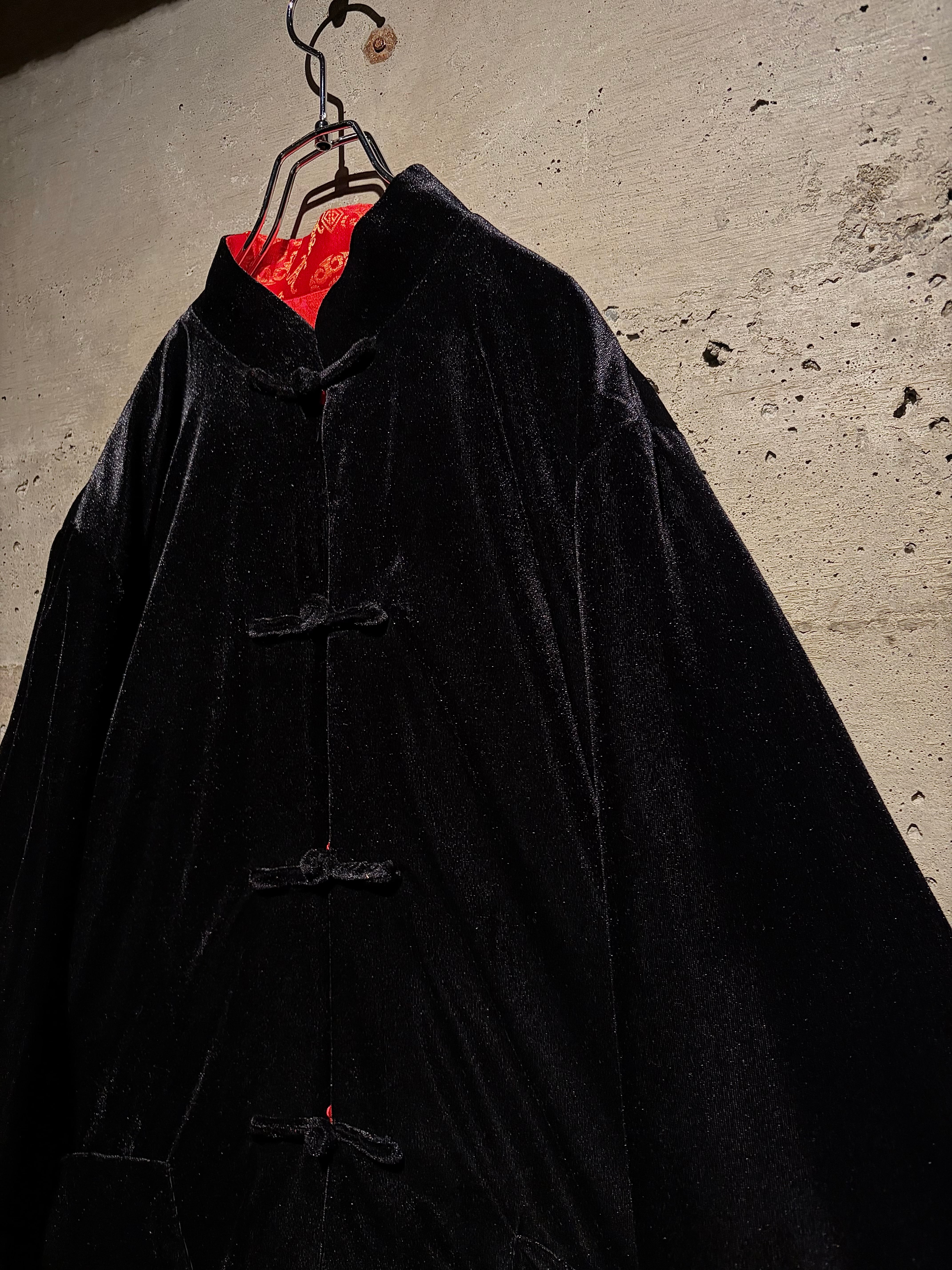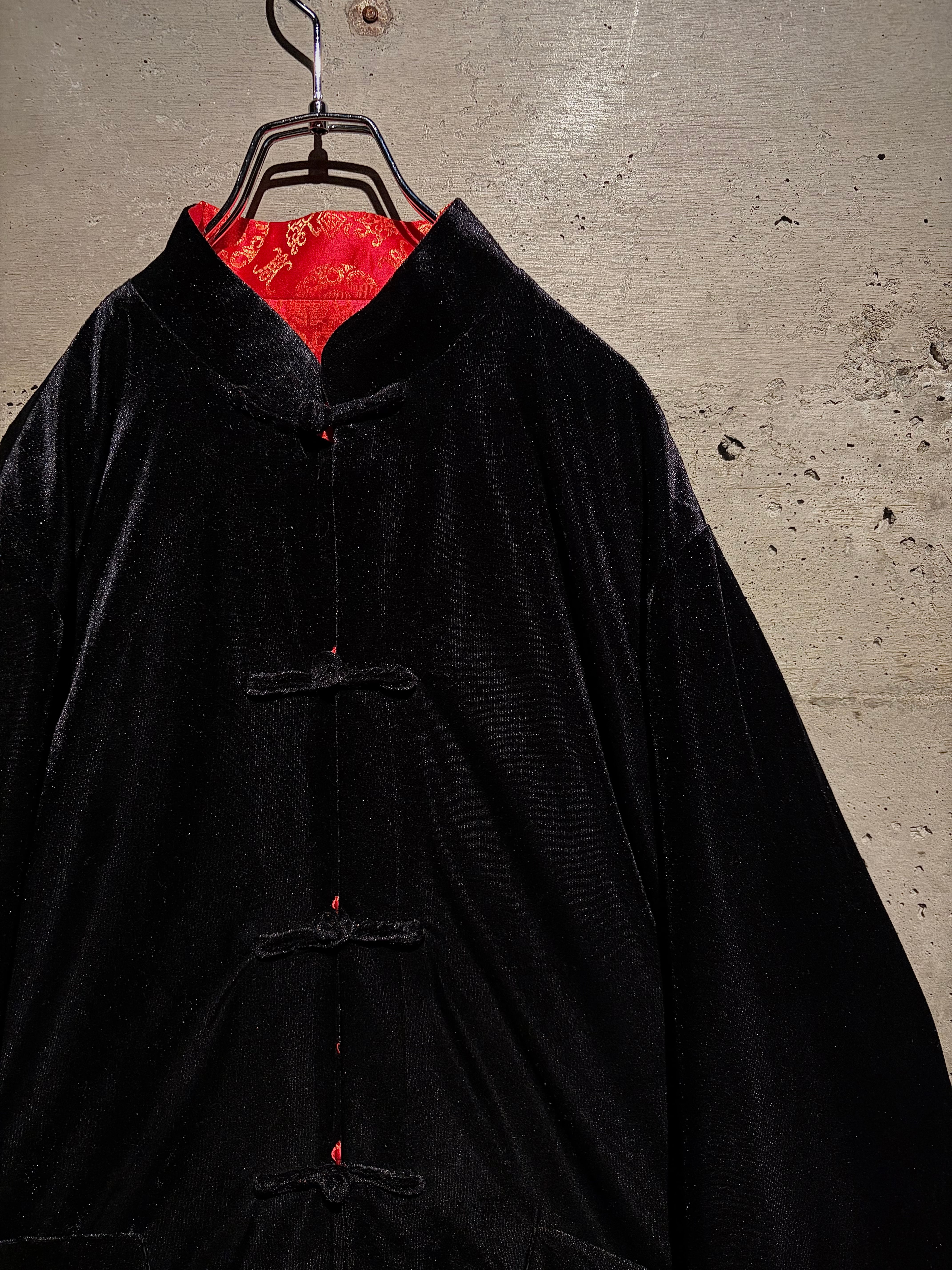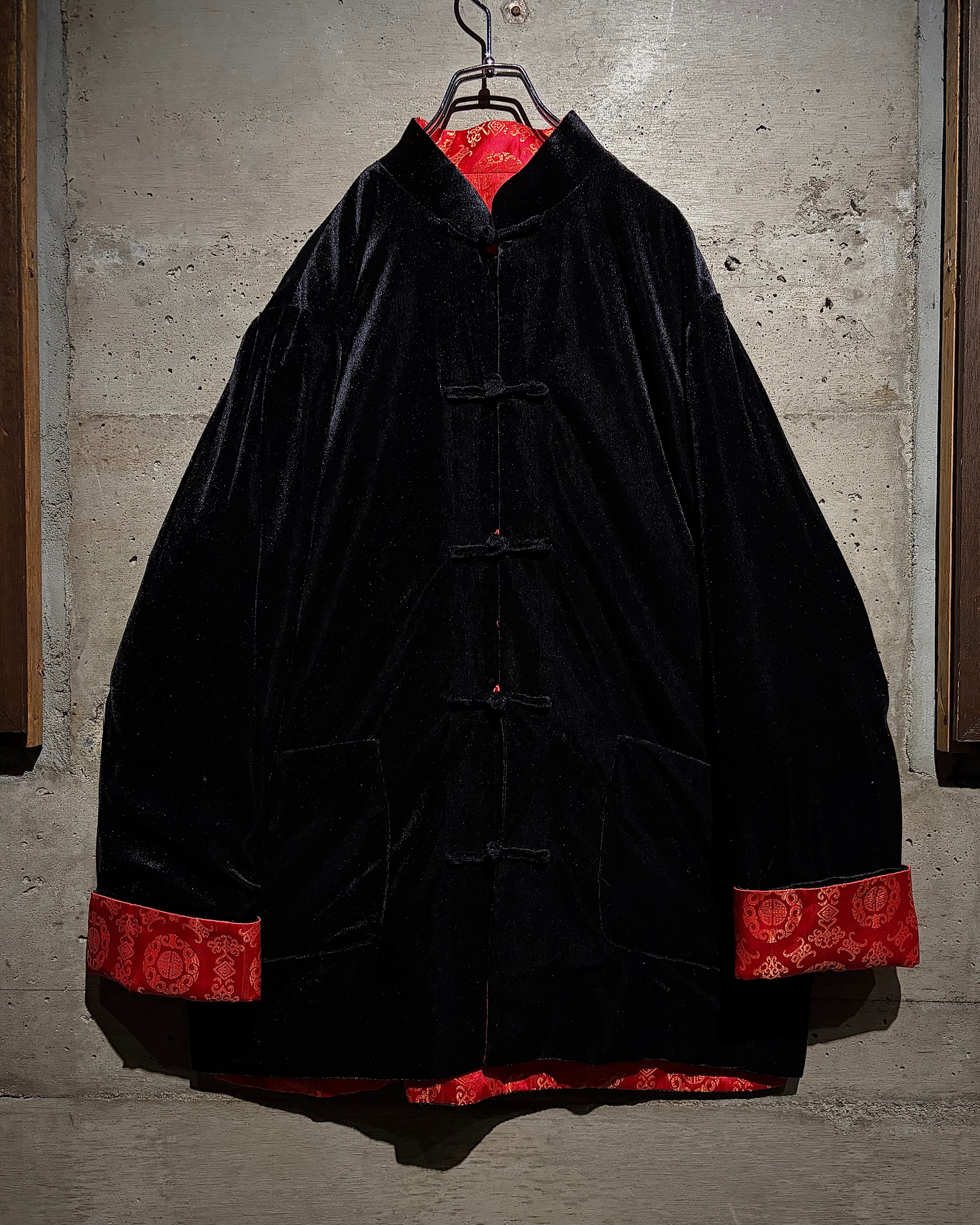 リバーシブルはチャイナシャツ自体でも珍しい仕様ですが、ベロア面を備えたリバーシブルは特に稀少。シンプルなブラックと華やかなレッド、全く異なる表情を1着で楽しめます。