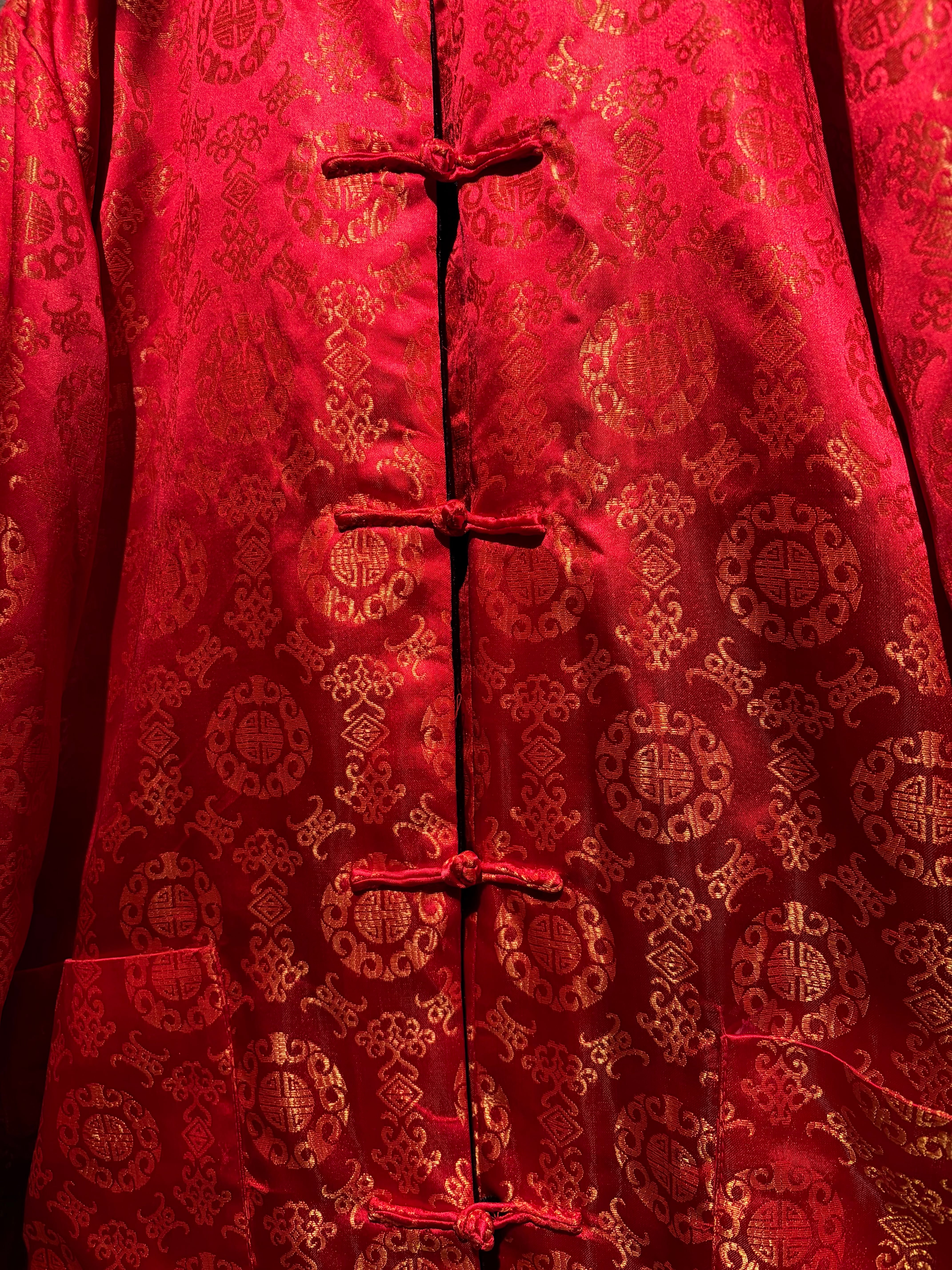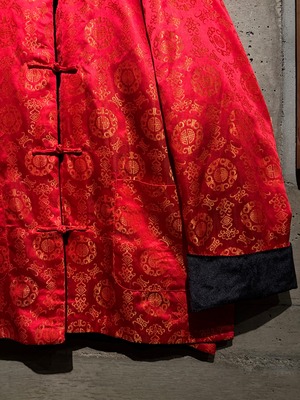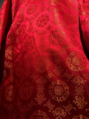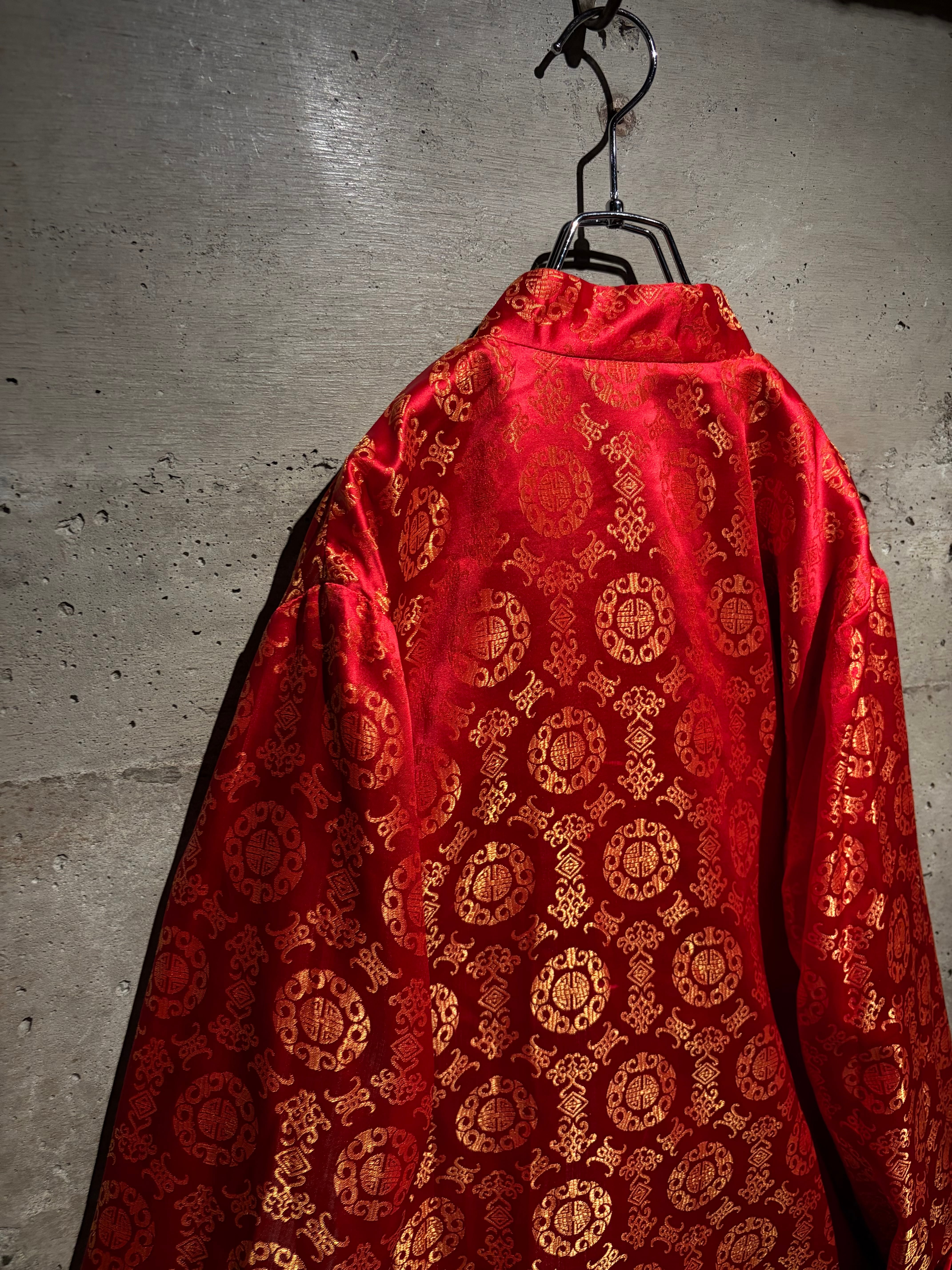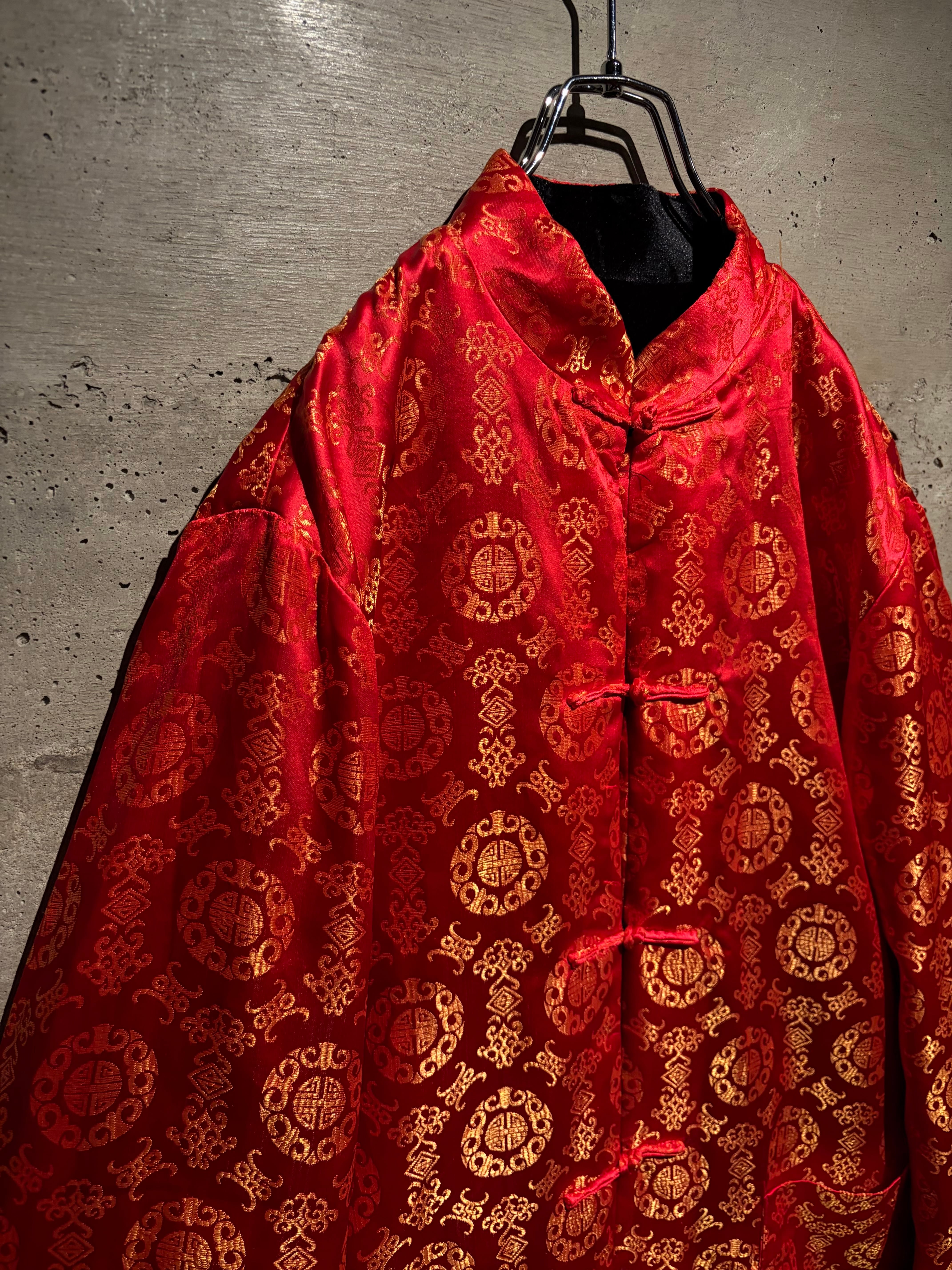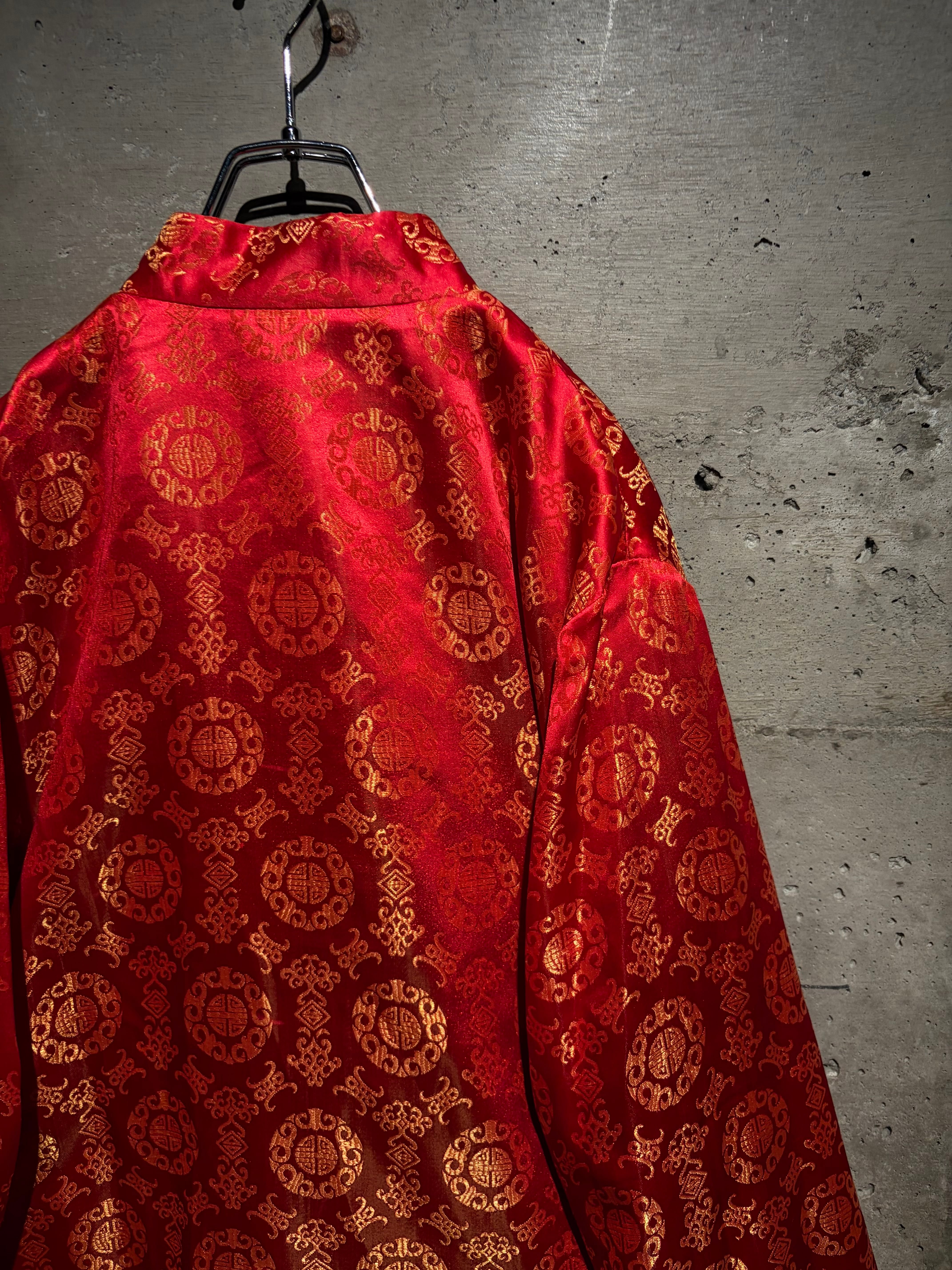 もう片面は鮮やかな赤をベースに、織りで中華紋様を表現したテキスタイル。ゴールドで織り込まれた伝統的な文様が全体に散りばめられた、チャイナ特有のオリエンタルな華やかさを見せています。