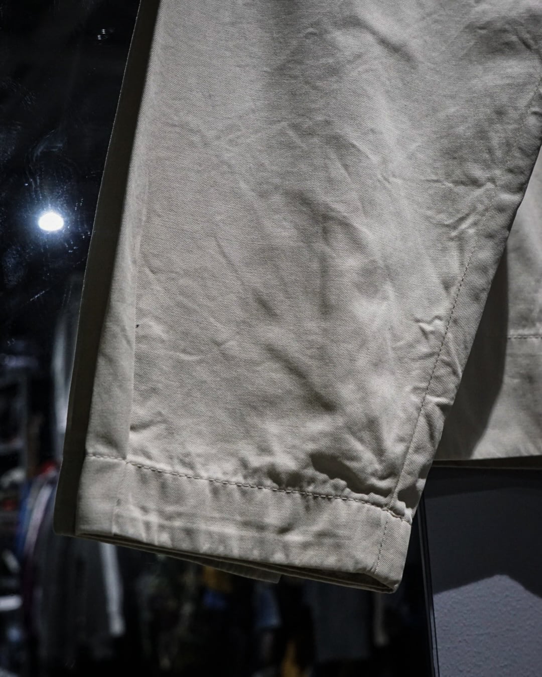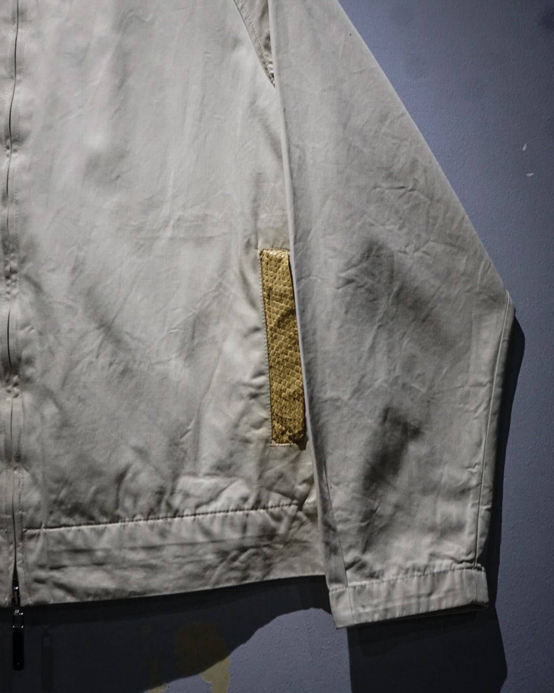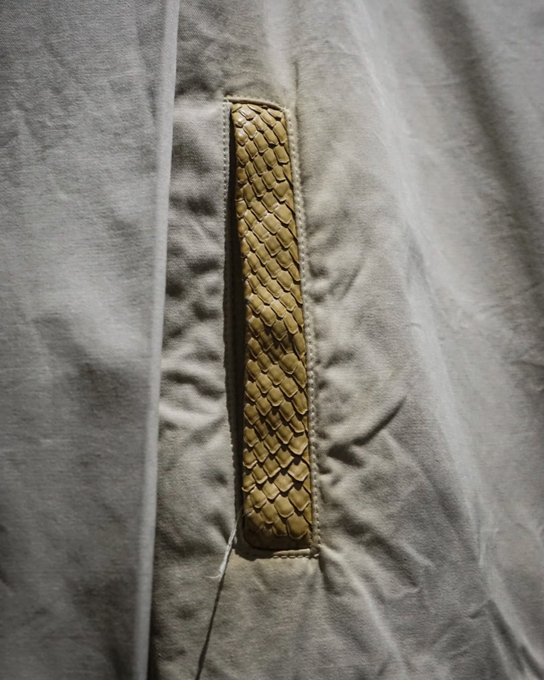 特筆すべきはポケット周りのディテール。ポケットの縁には 鱗状にカッティングされたレザー を使用し、その奥のポケット本体にはリアルシープレザーを採用。控えめなパーツながら非常に贅沢な仕様で、ブランドのモノ作りへの魂を感じられますね。