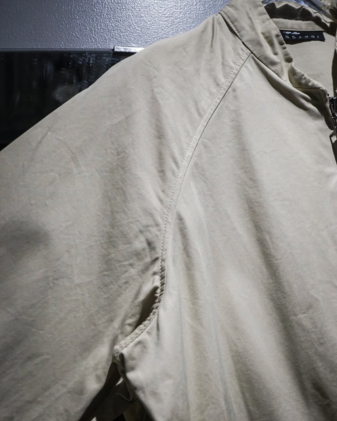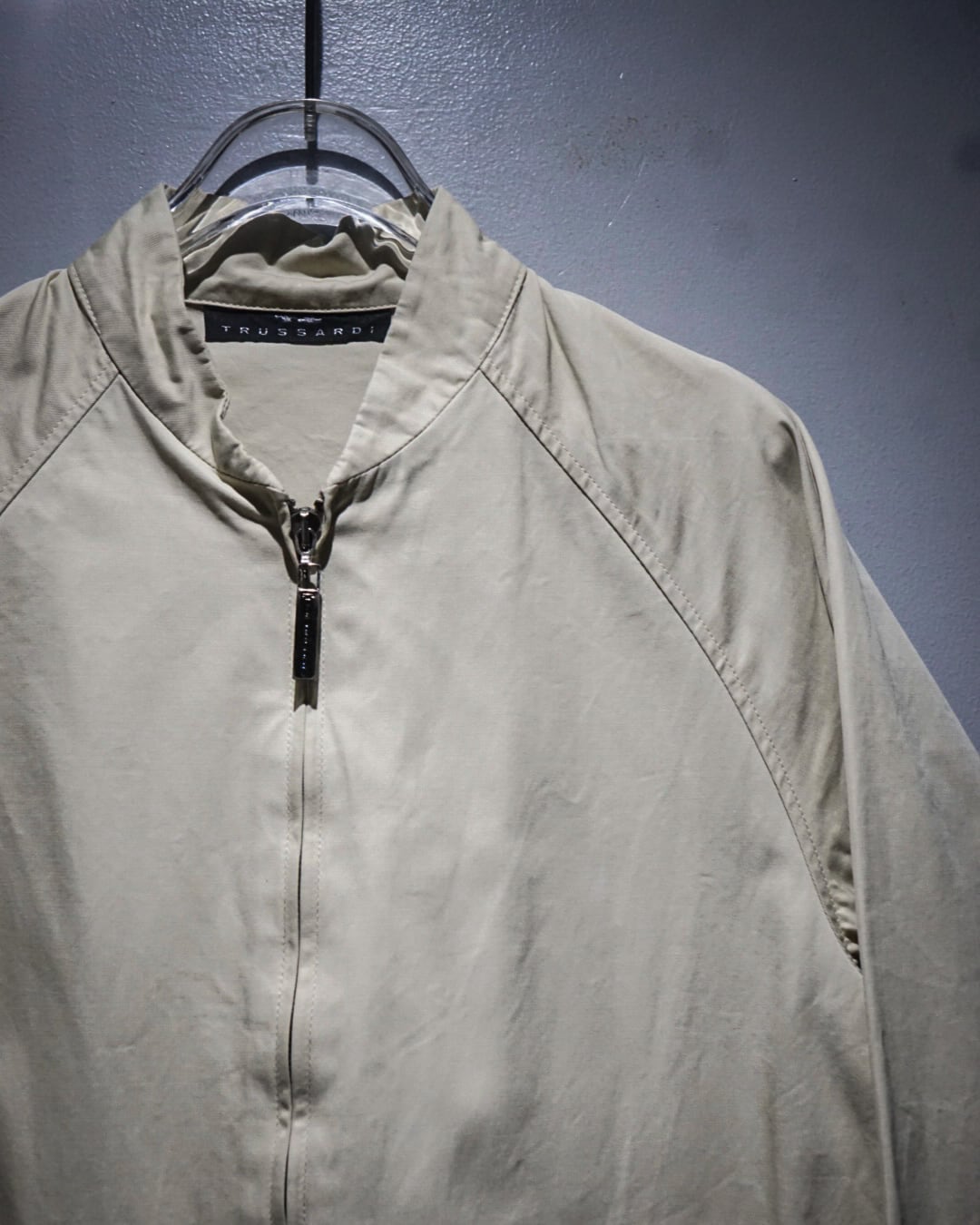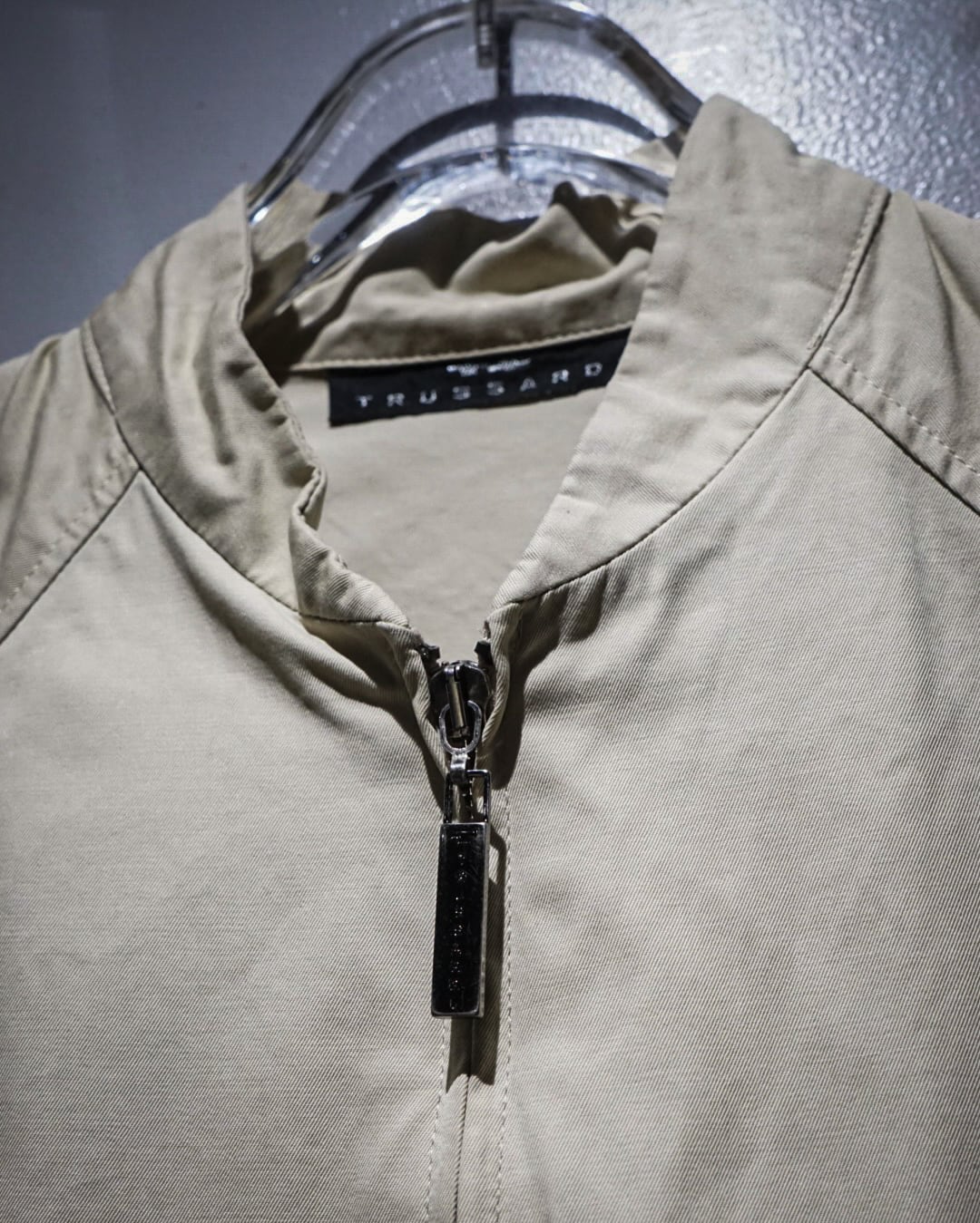 フロントはダブルジップ、立ち襟仕様のミニマルなディテールで仕上げることで、Trussardiらしい洗練された印象に。ラグランスリーブの柔らかなラインも相まって、肩周りの収まりが良く上品なシルエットを演出します。