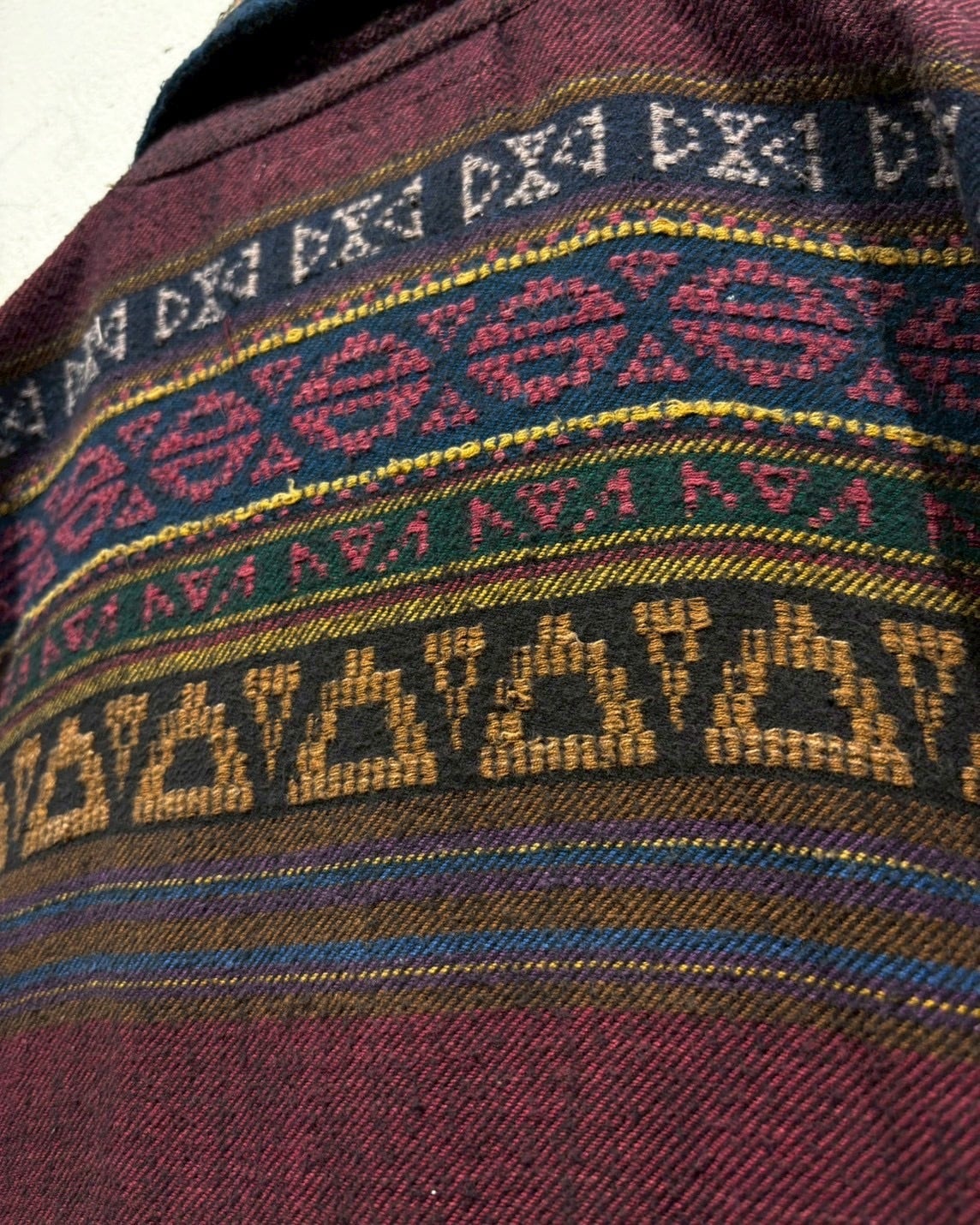全面にはネイティブ調の織り柄を配置。ボルドーやネイビーを基調にした落ち着いた配色の中に、幾何学模様やトライバルなモチーフを織り込むことで、民族的な雰囲気を放つ仕上がりに。