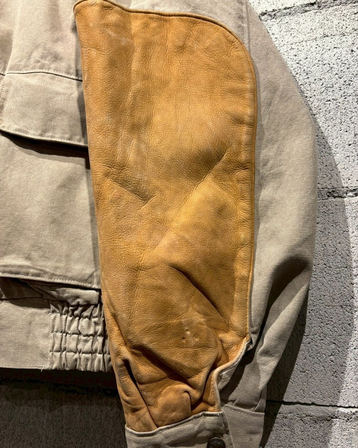 本来補強の意味合いで施されたレザーですが、異素材のアクセントとしても◎フロントは比翼仕立て、フロントにはマチ付きフラップポケットを配置し、機能的なディテールが落とし込まれています。