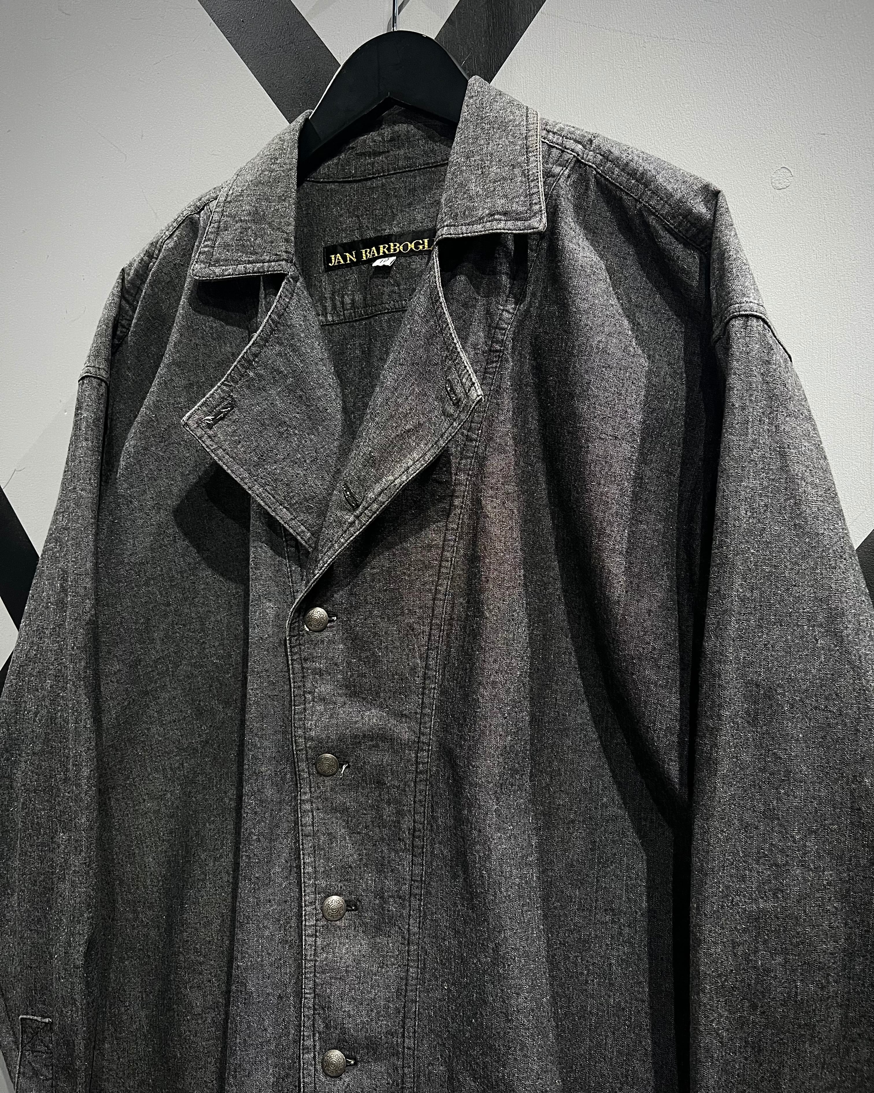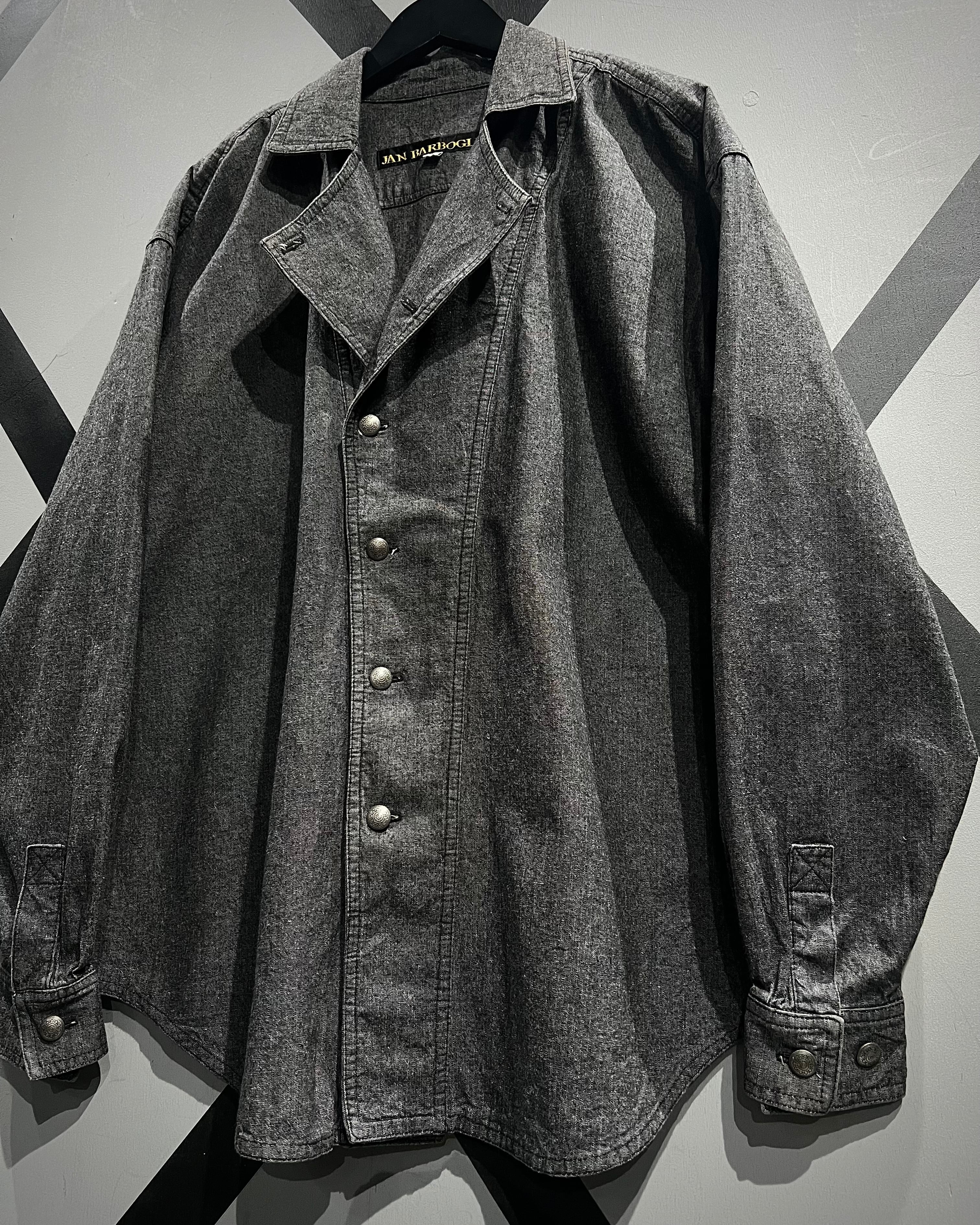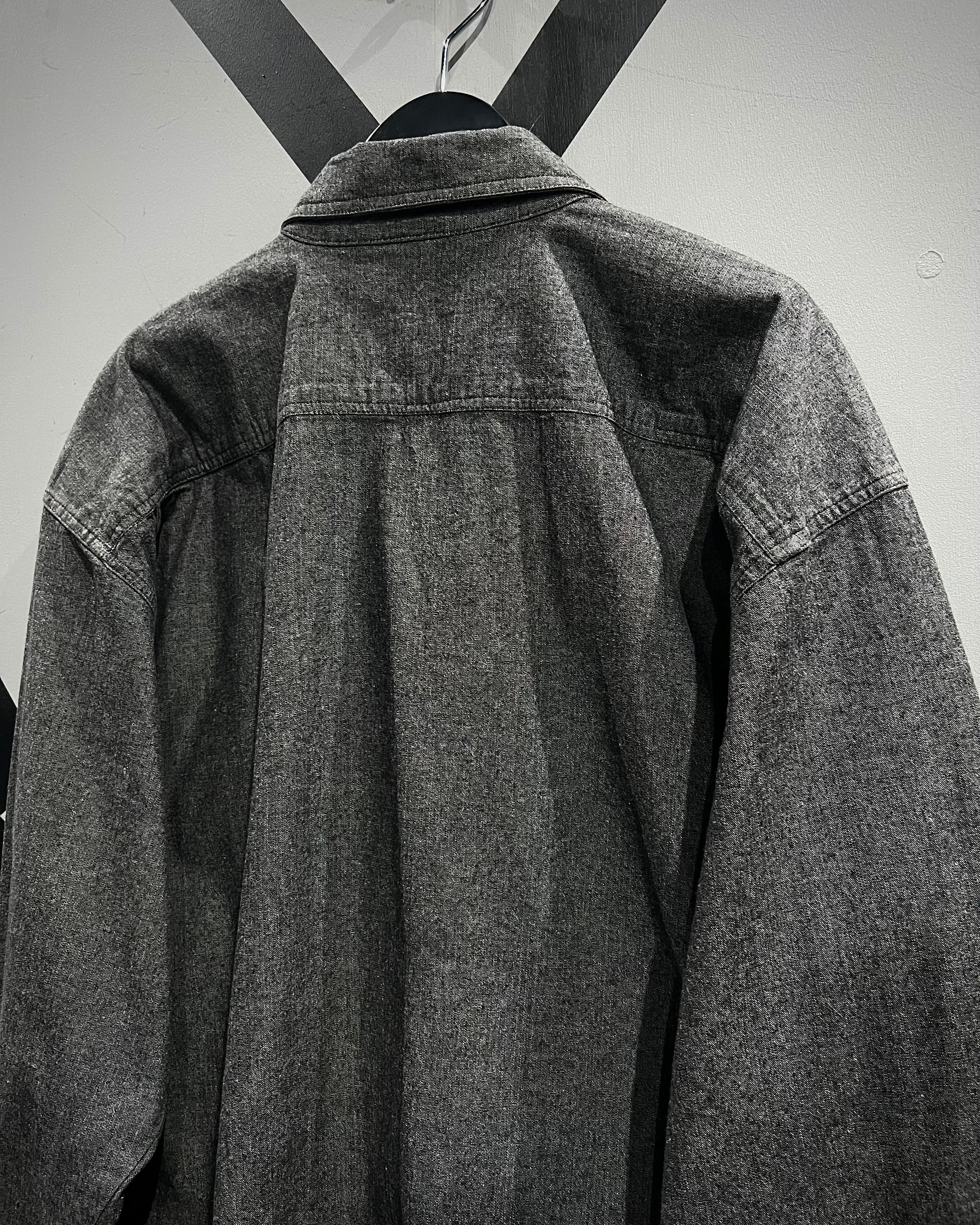 フロントはダブルのようなアシンメトリーなデザインで、シェフシャツを思わせる独特なディテールが特徴。通常のシャツとは異なる重なりのある前立てとメタルボタンの配置がさりげないアクセントとなり、ミニマルながらも個性を感じさせる仕上がりに。