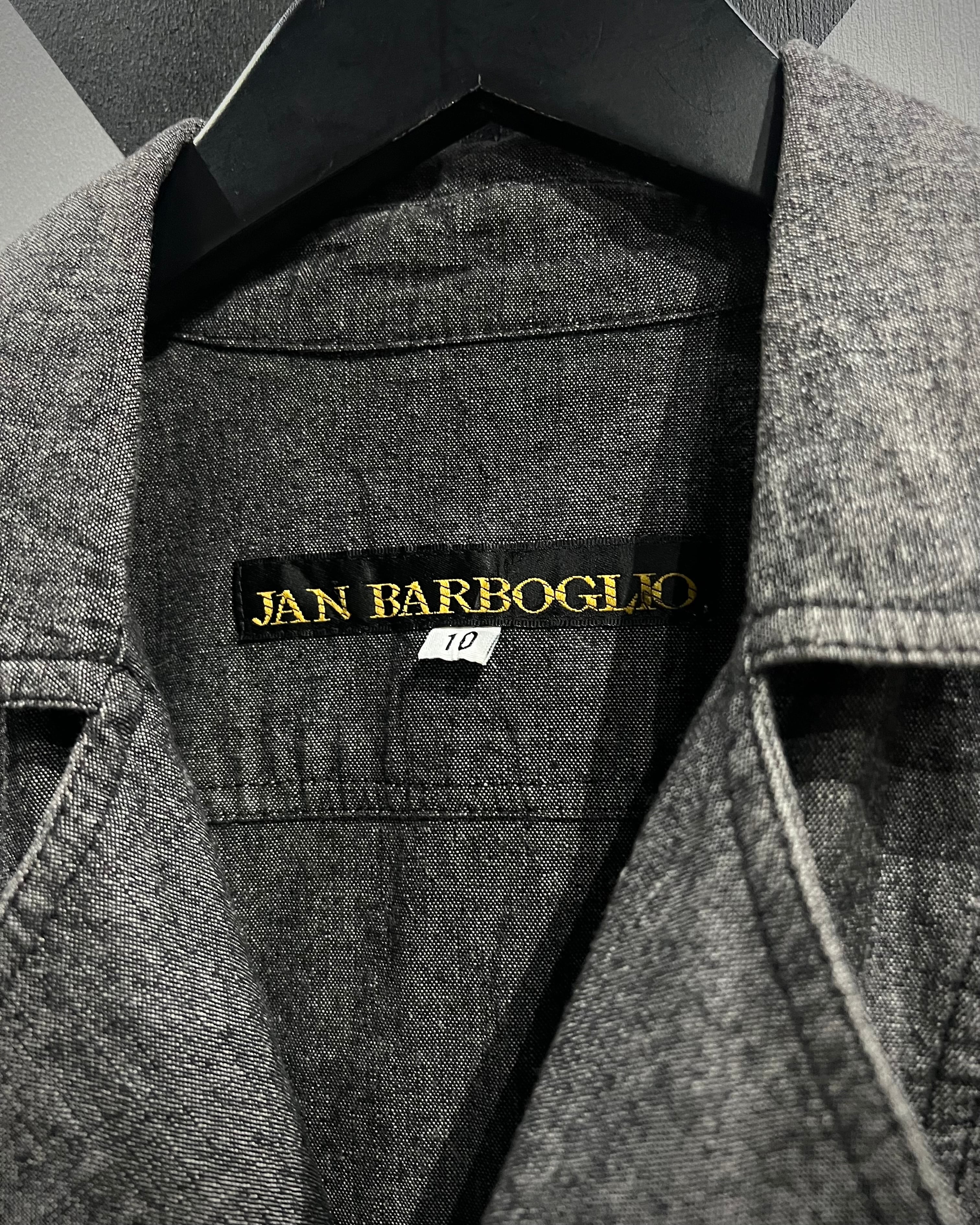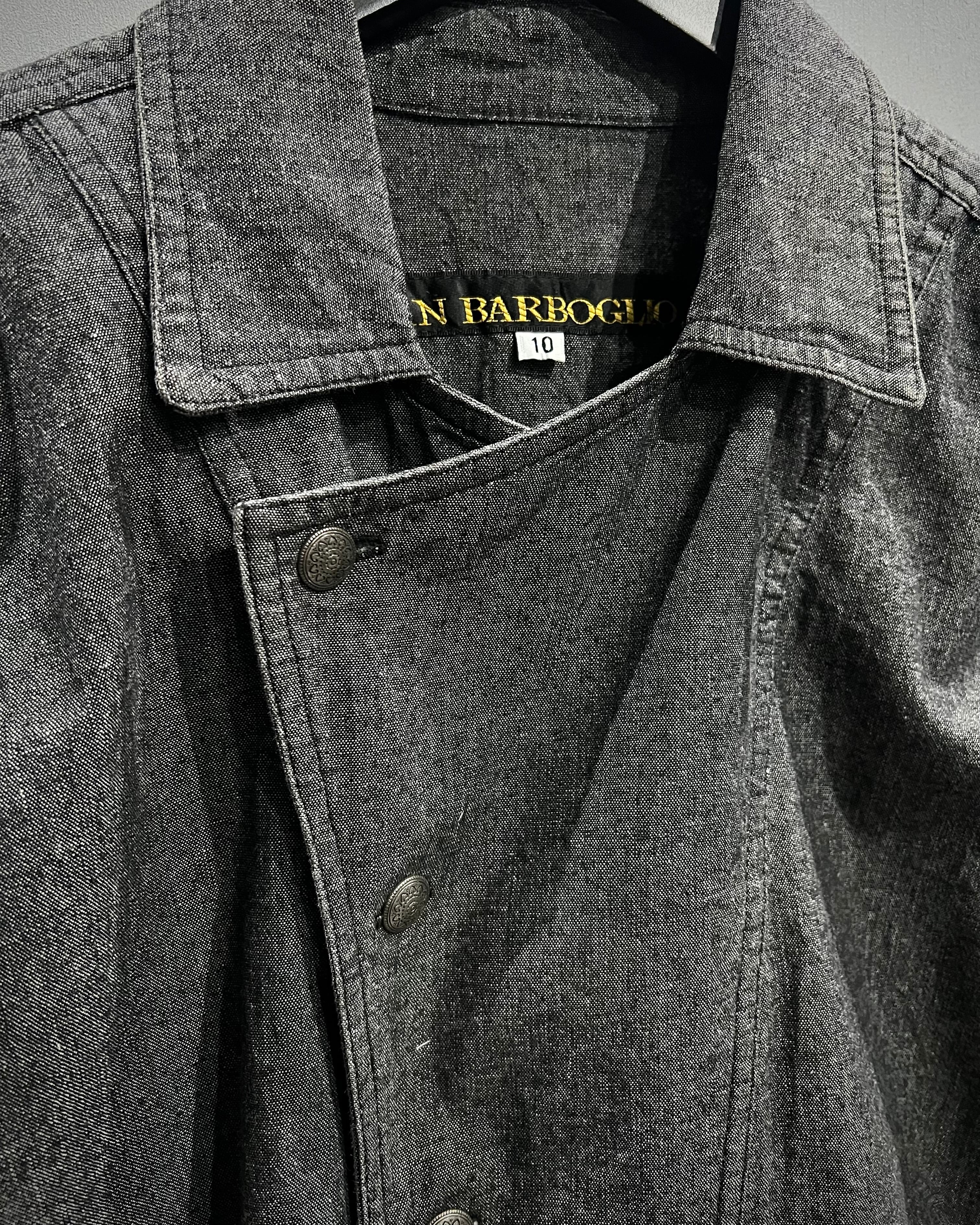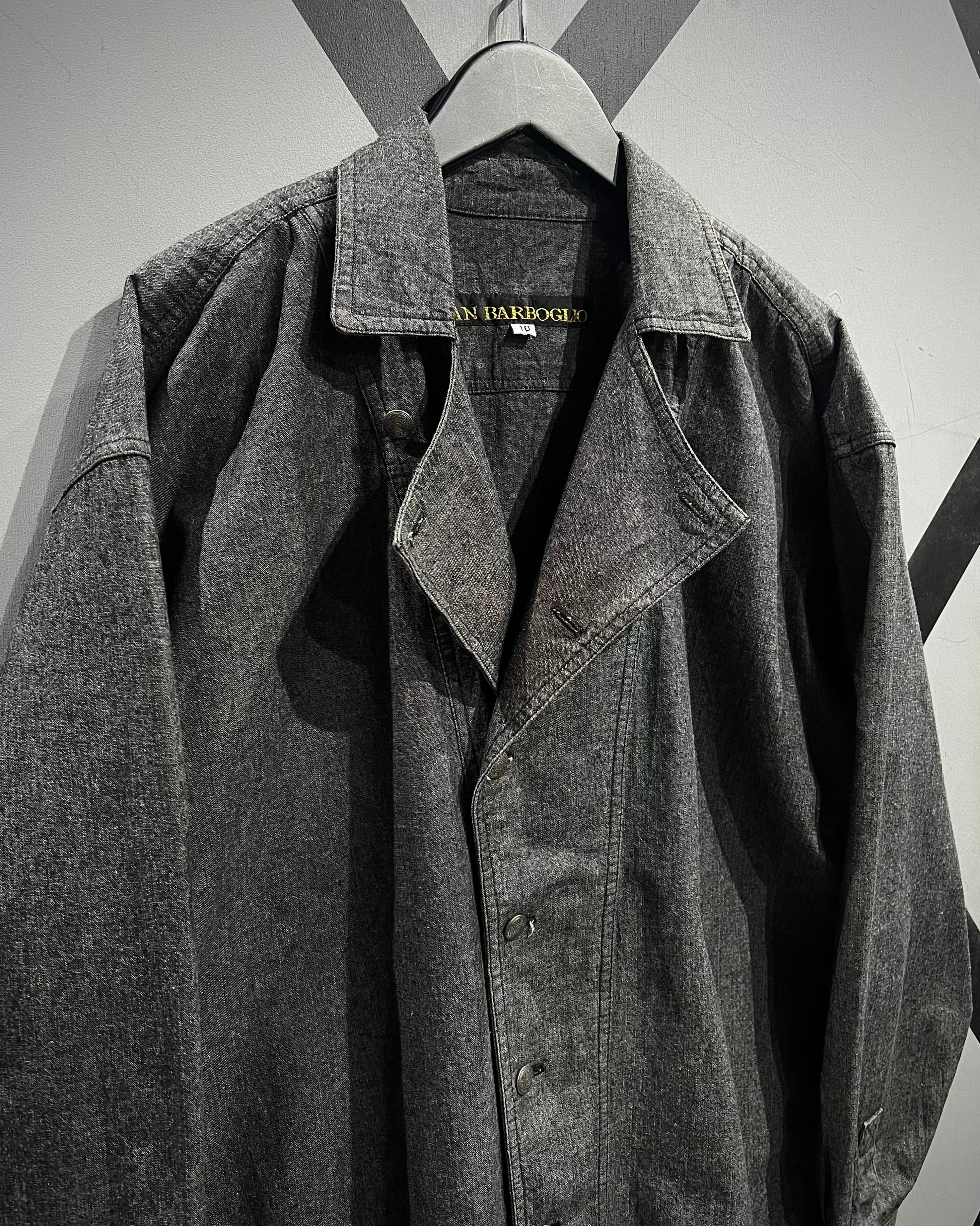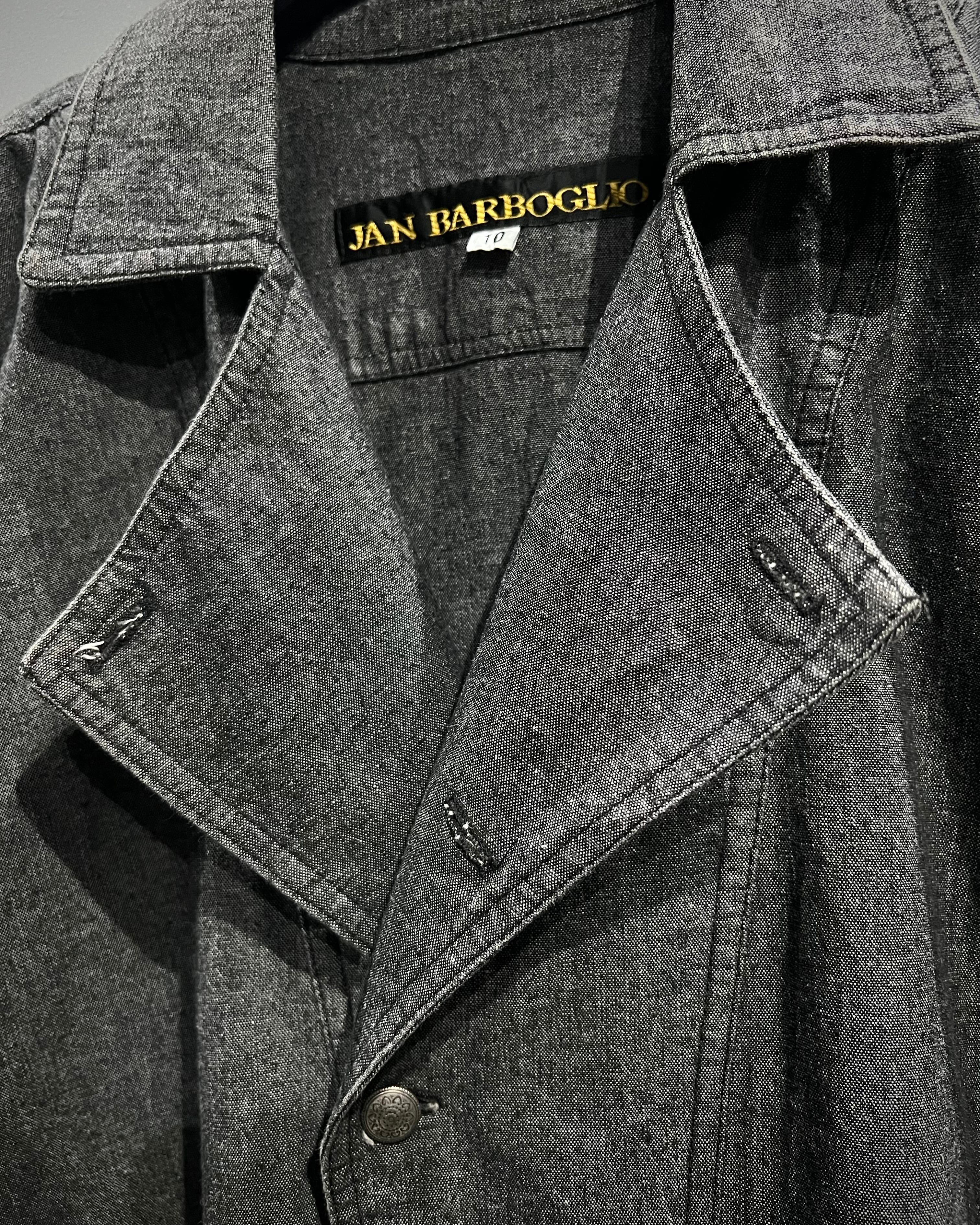フロントはダブルのようなアシンメトリーなデザインで、シェフシャツを思わせる独特なディテールが特徴。通常のシャツとは異なる重なりのある前立てとメタルボタンの配置がさりげないアクセントとなり、ミニマルながらも個性を感じさせる仕上がりに。