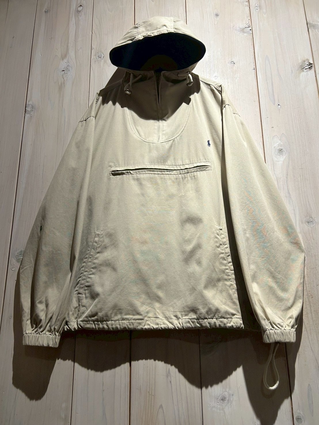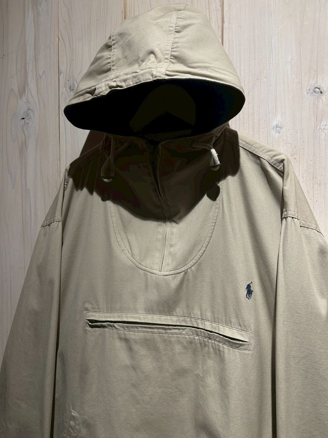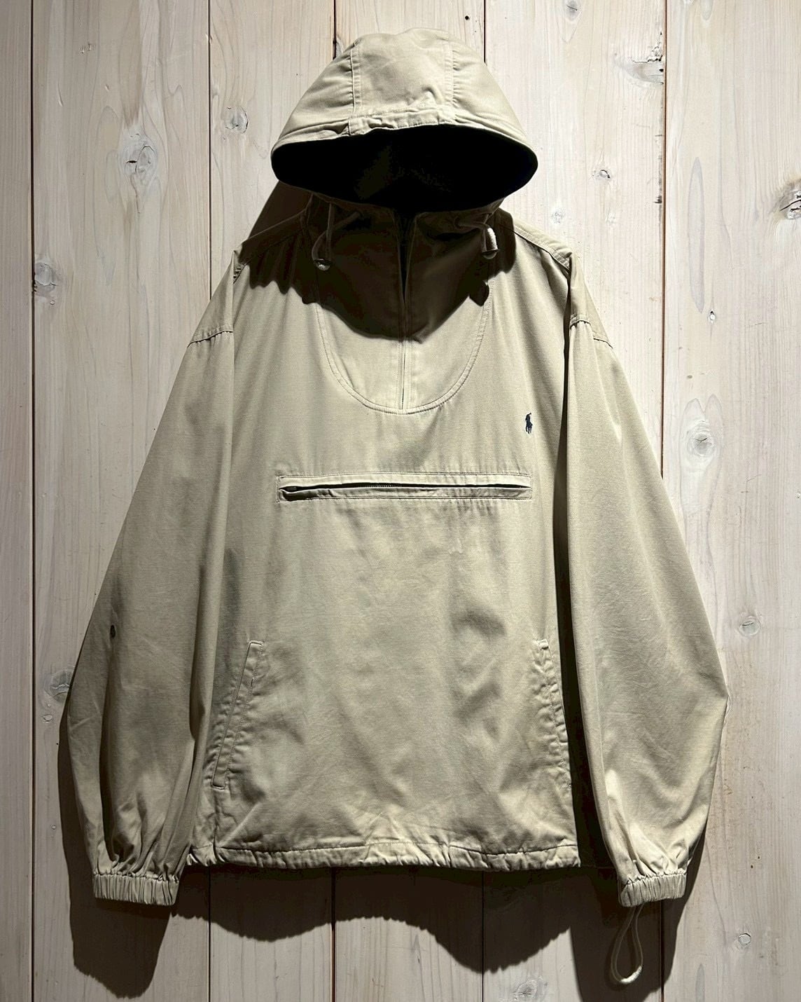 フロントにはアノラック特有のハーフジップ構造に加え、ジップ付きのカンガルーポケットを配置。胸元にはブランドを象徴するポニーロゴ刺繍がさりげなく施され、ミニマルなデザインの中で確かな存在感を放っています。