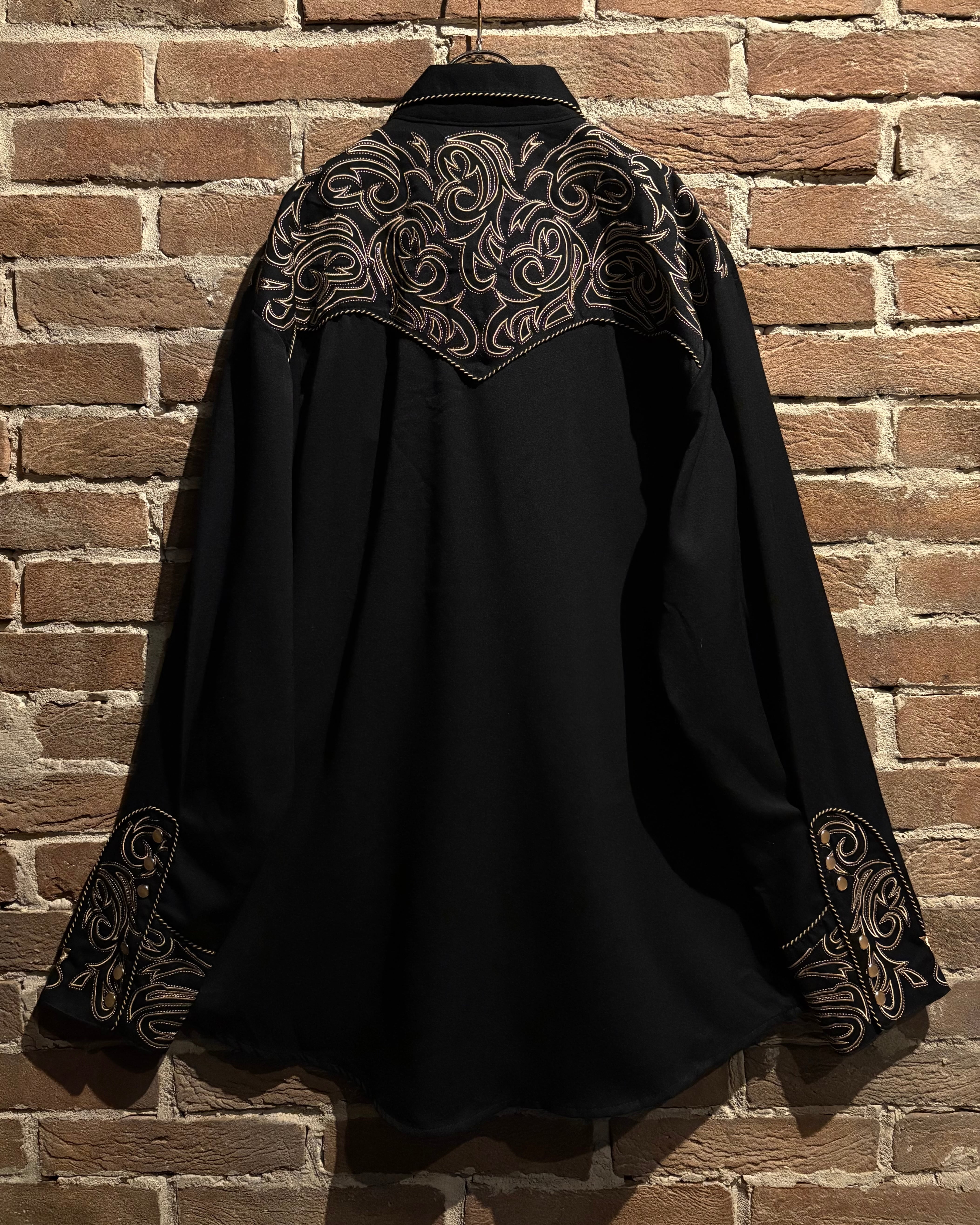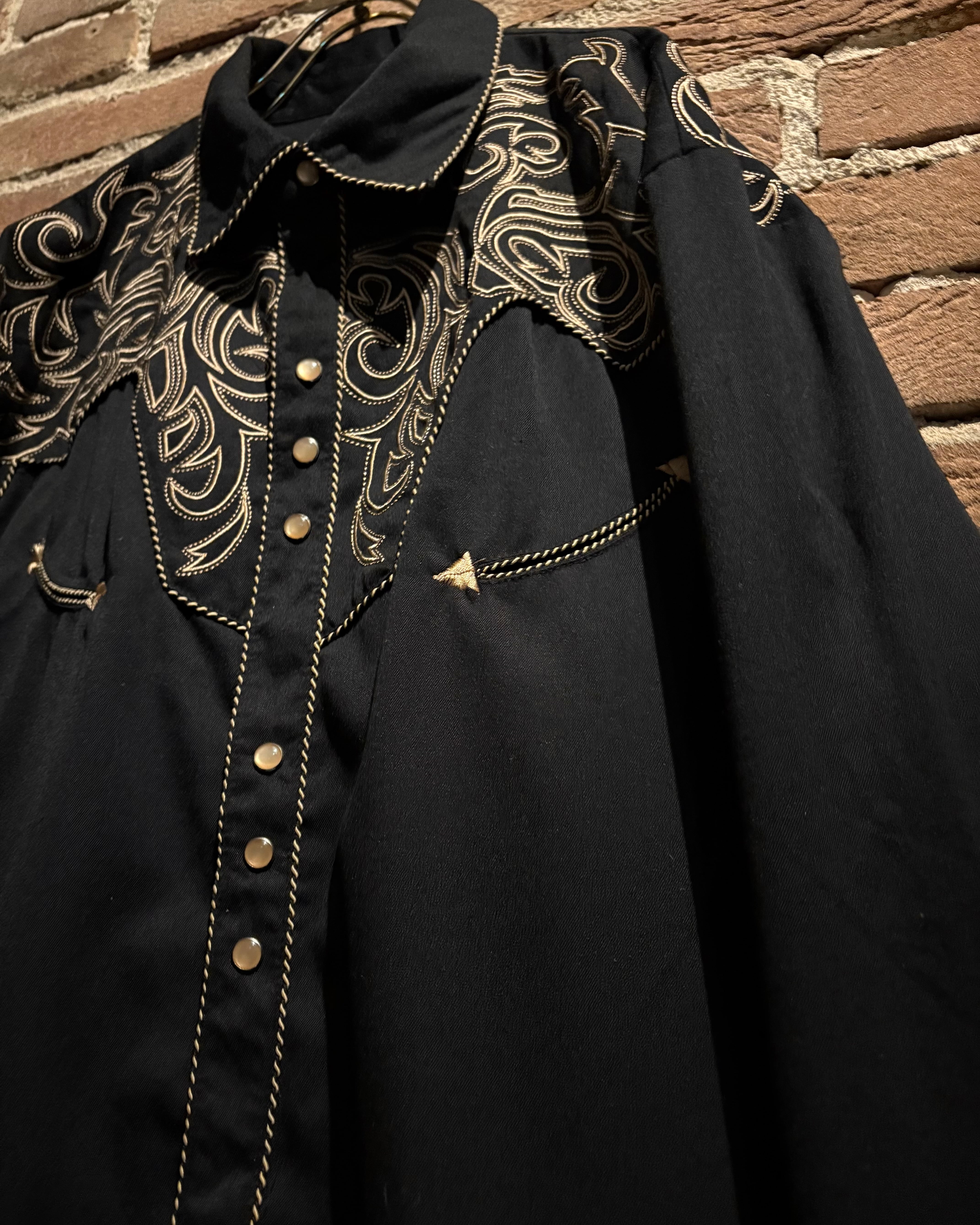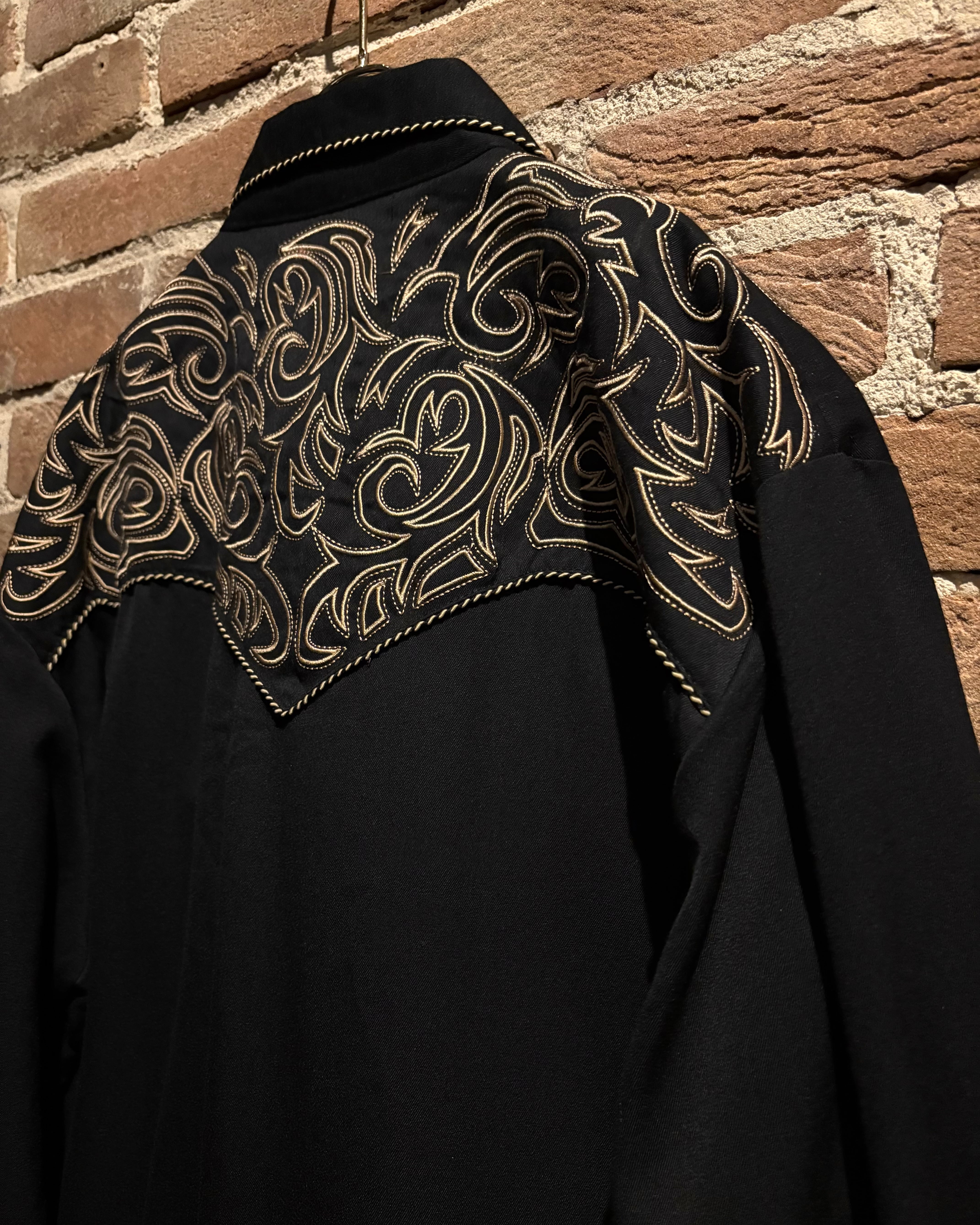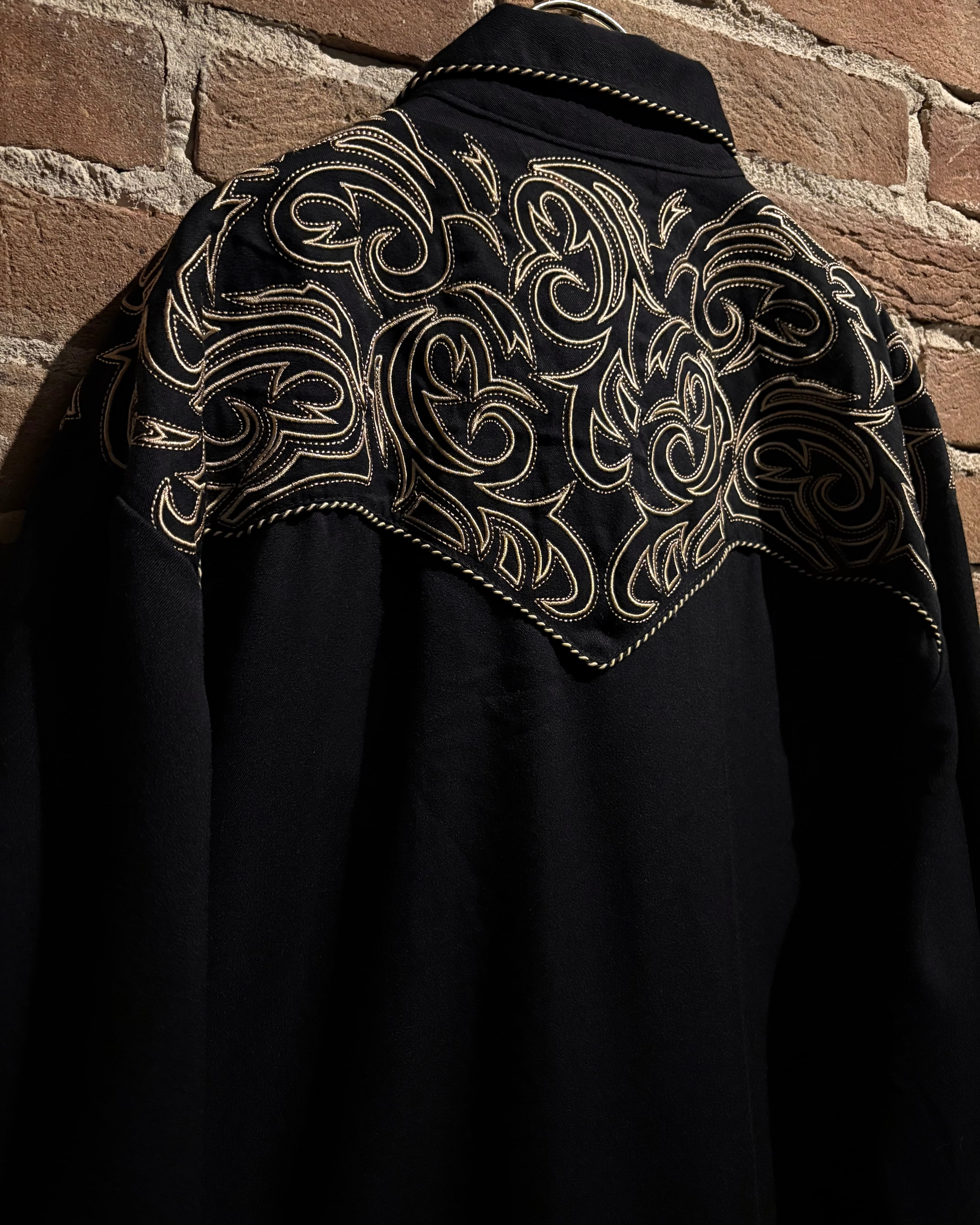 ブラックのボディをベースに、前後のヨーク、袖口にまでトライバル調の金刺繍を刻んだスペシャルなウエスタンシャツ。