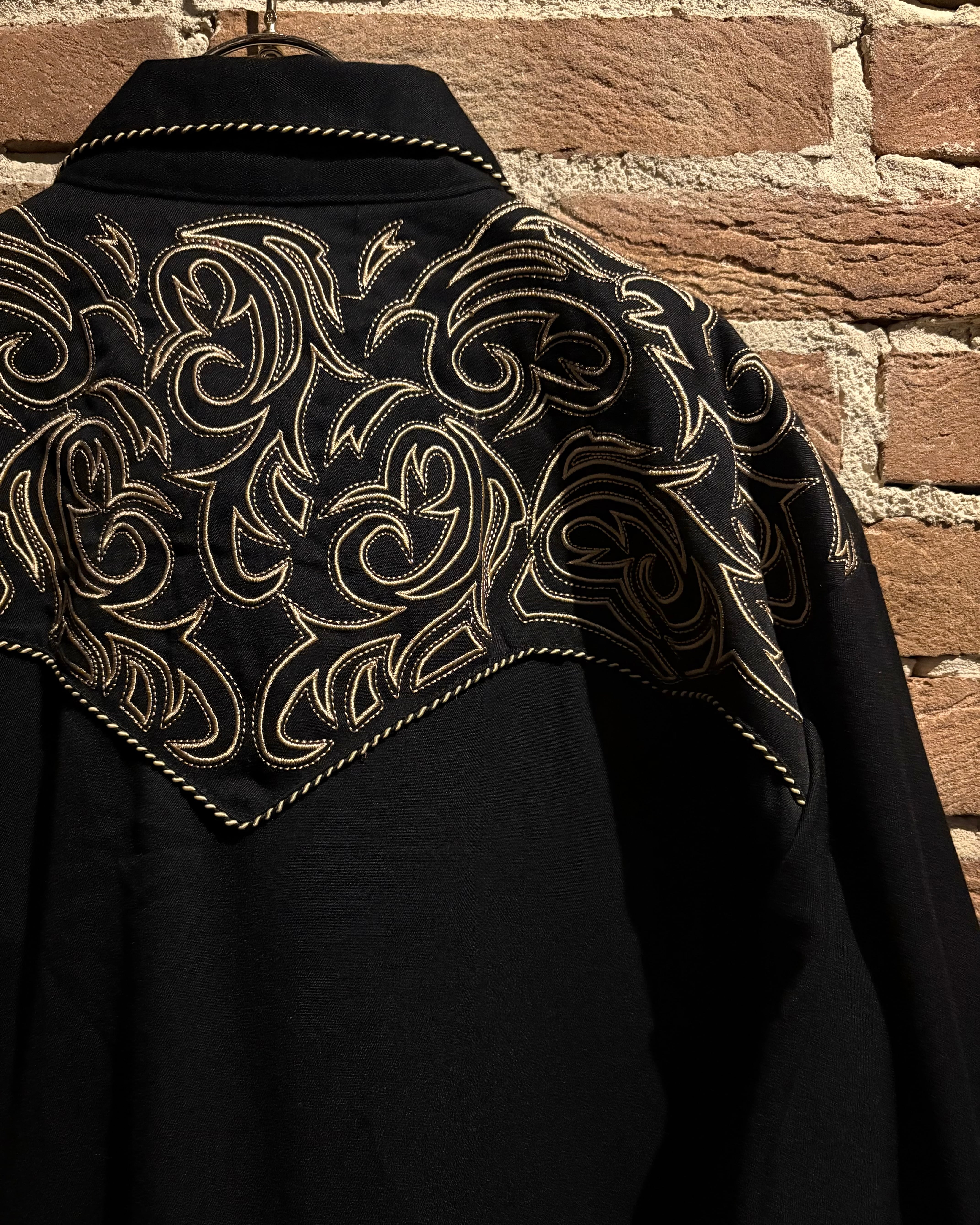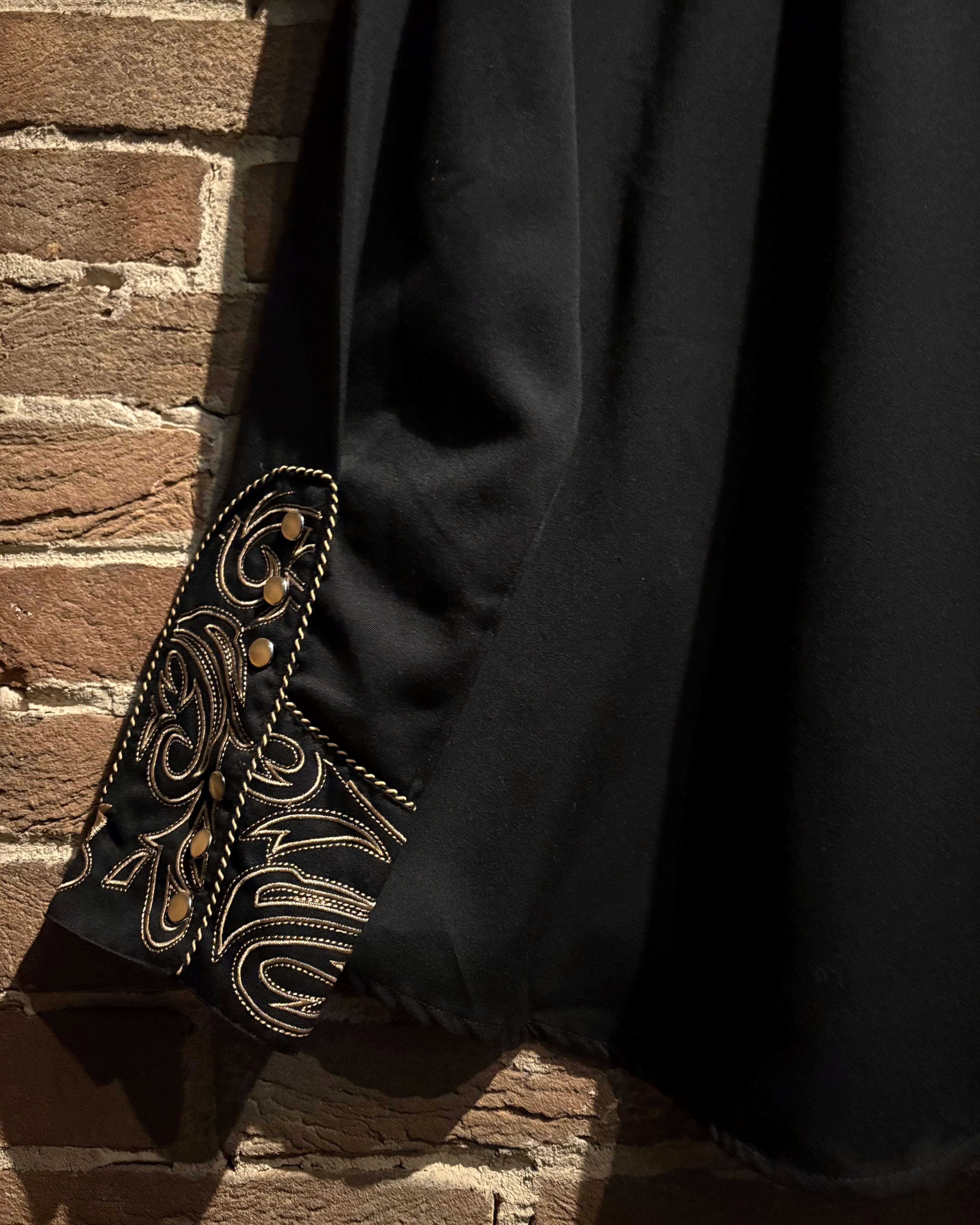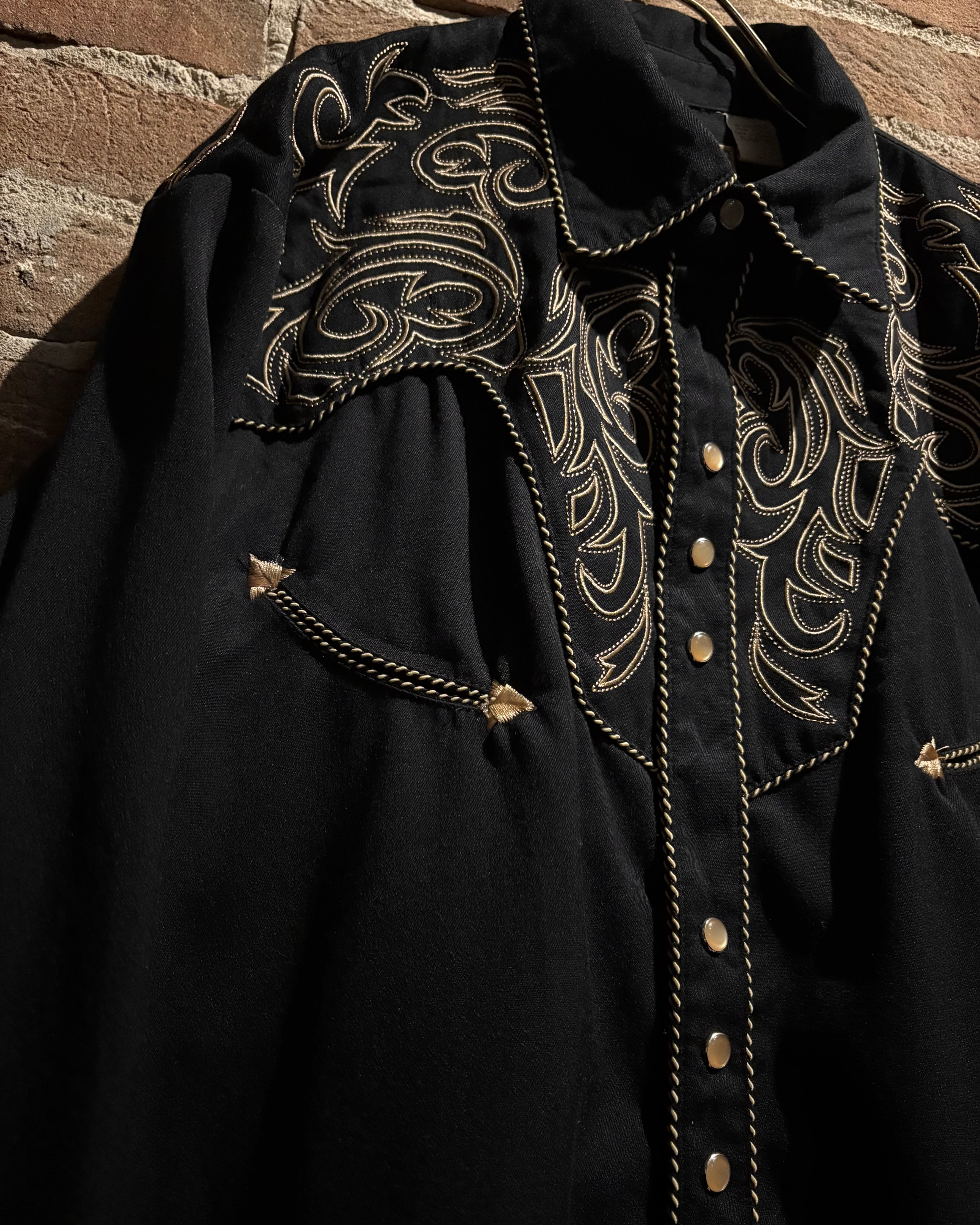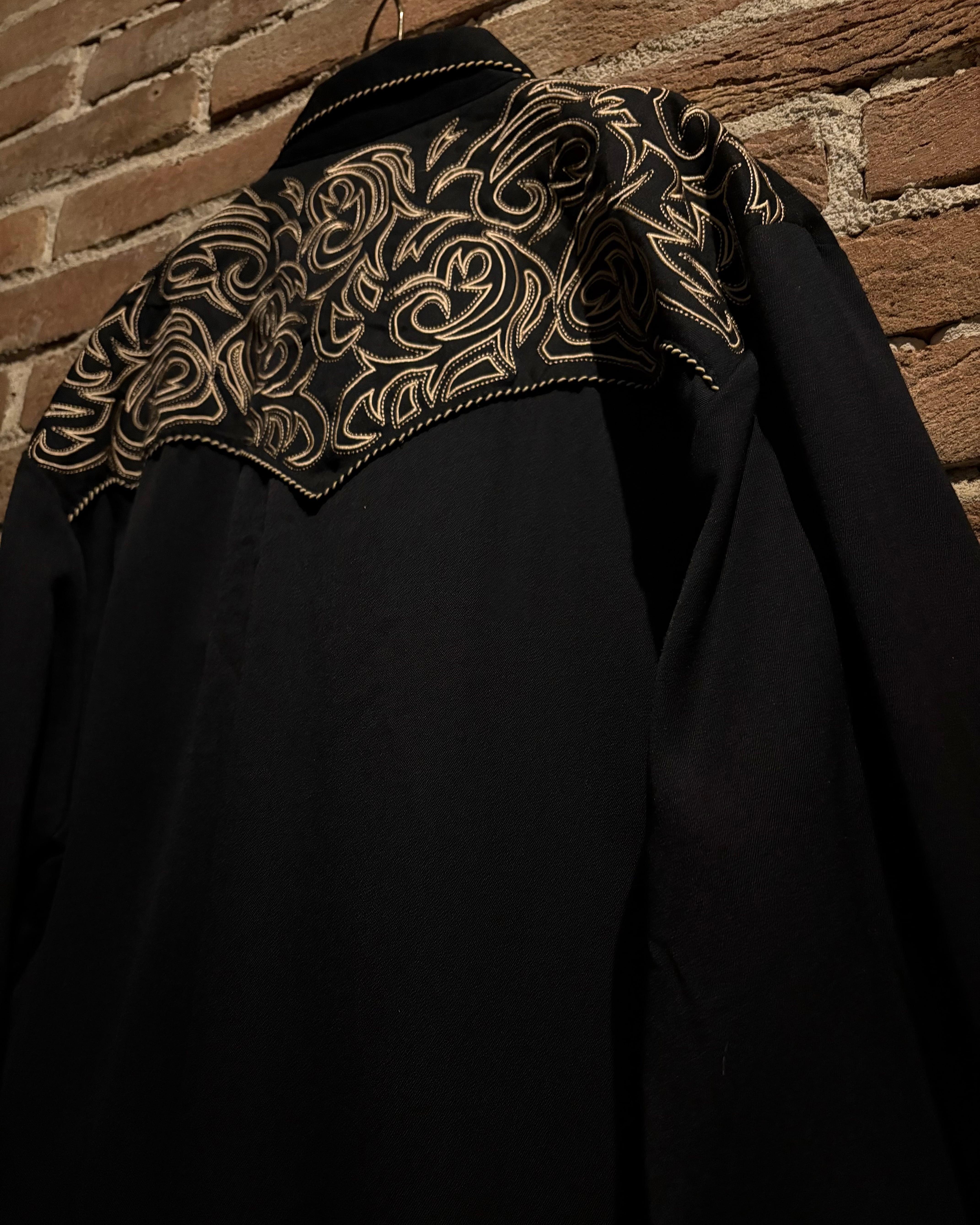 ブラックのボディをベースに、前後のヨーク、袖口にまでトライバル調の金刺繍を刻んだスペシャルなウエスタンシャツ。