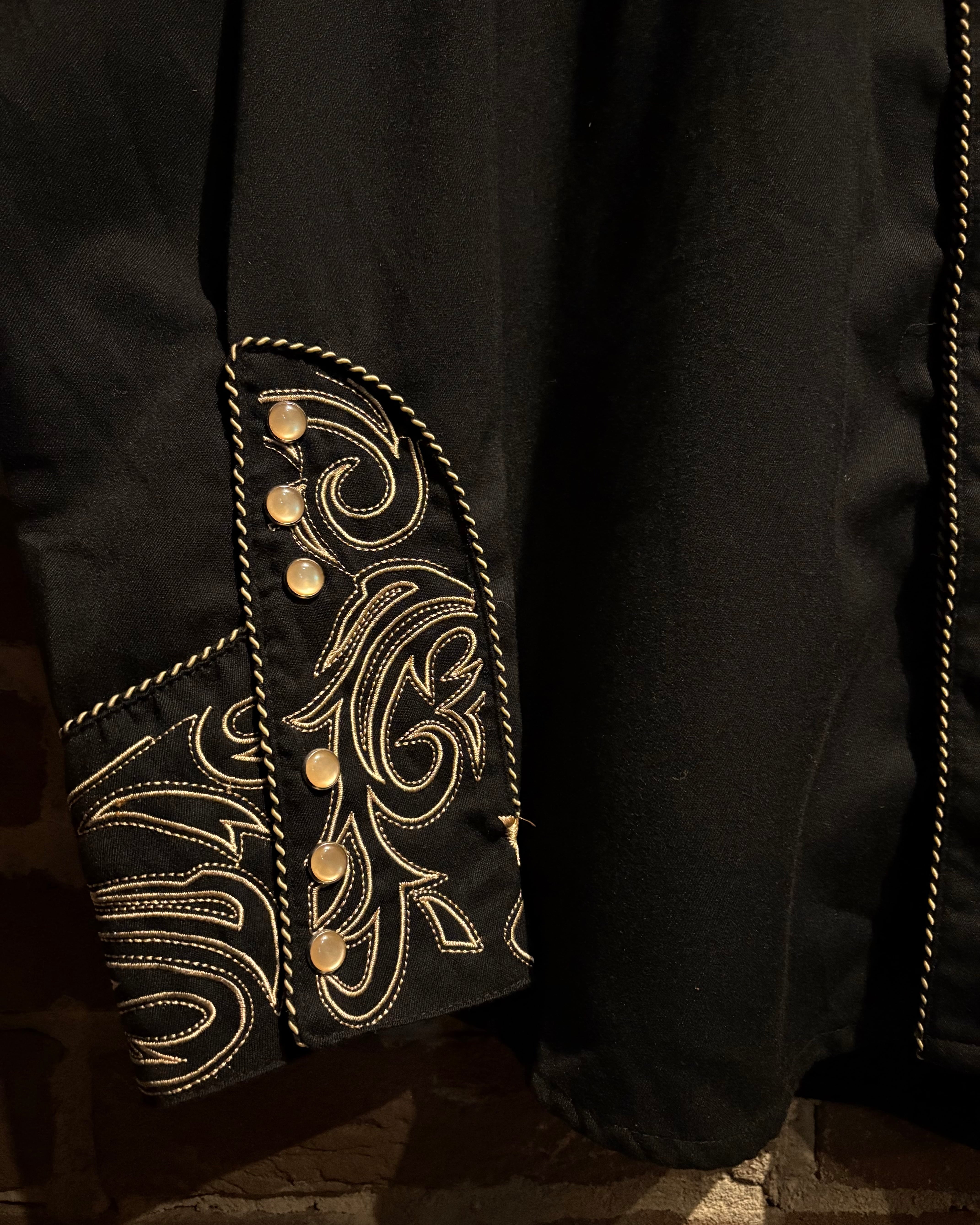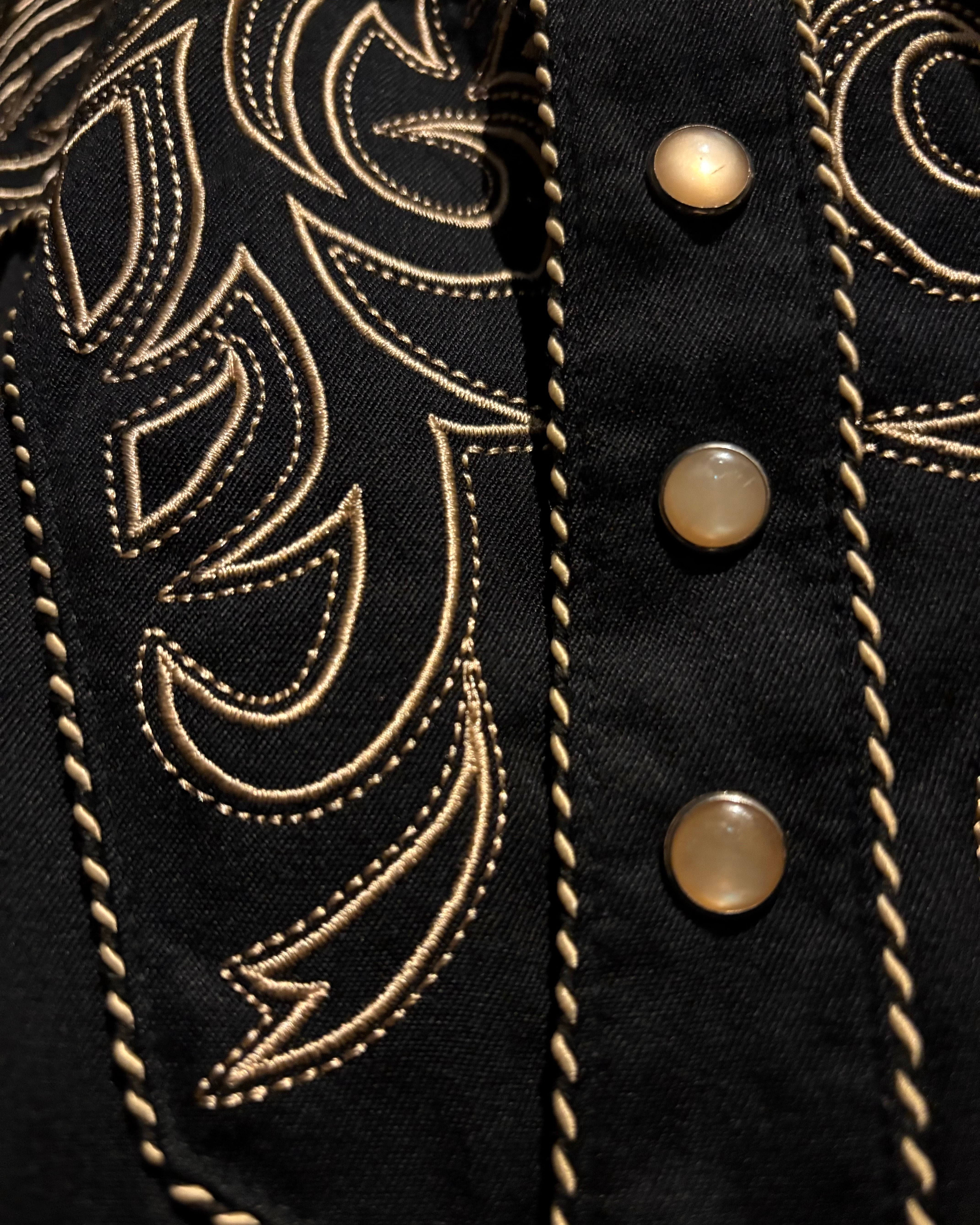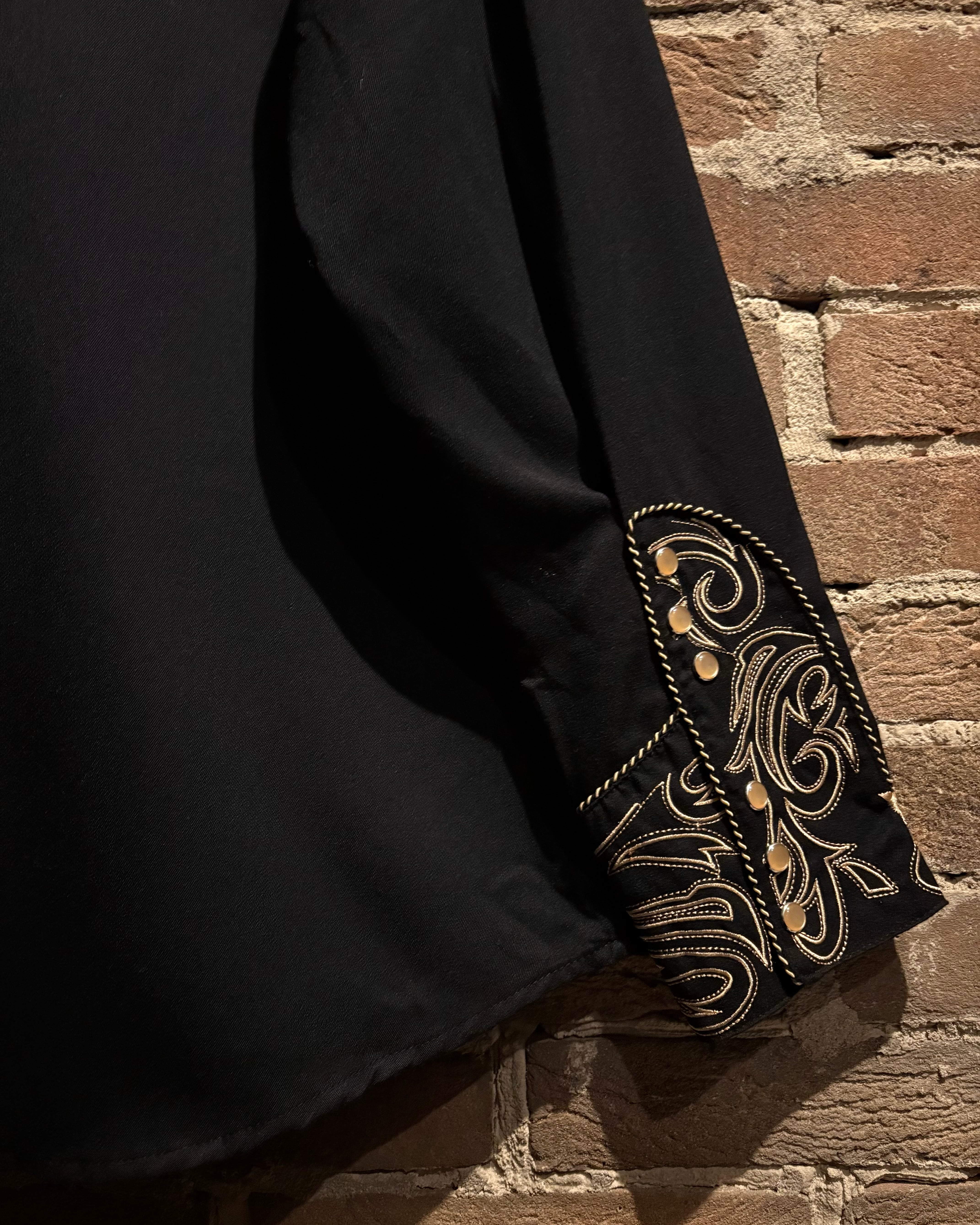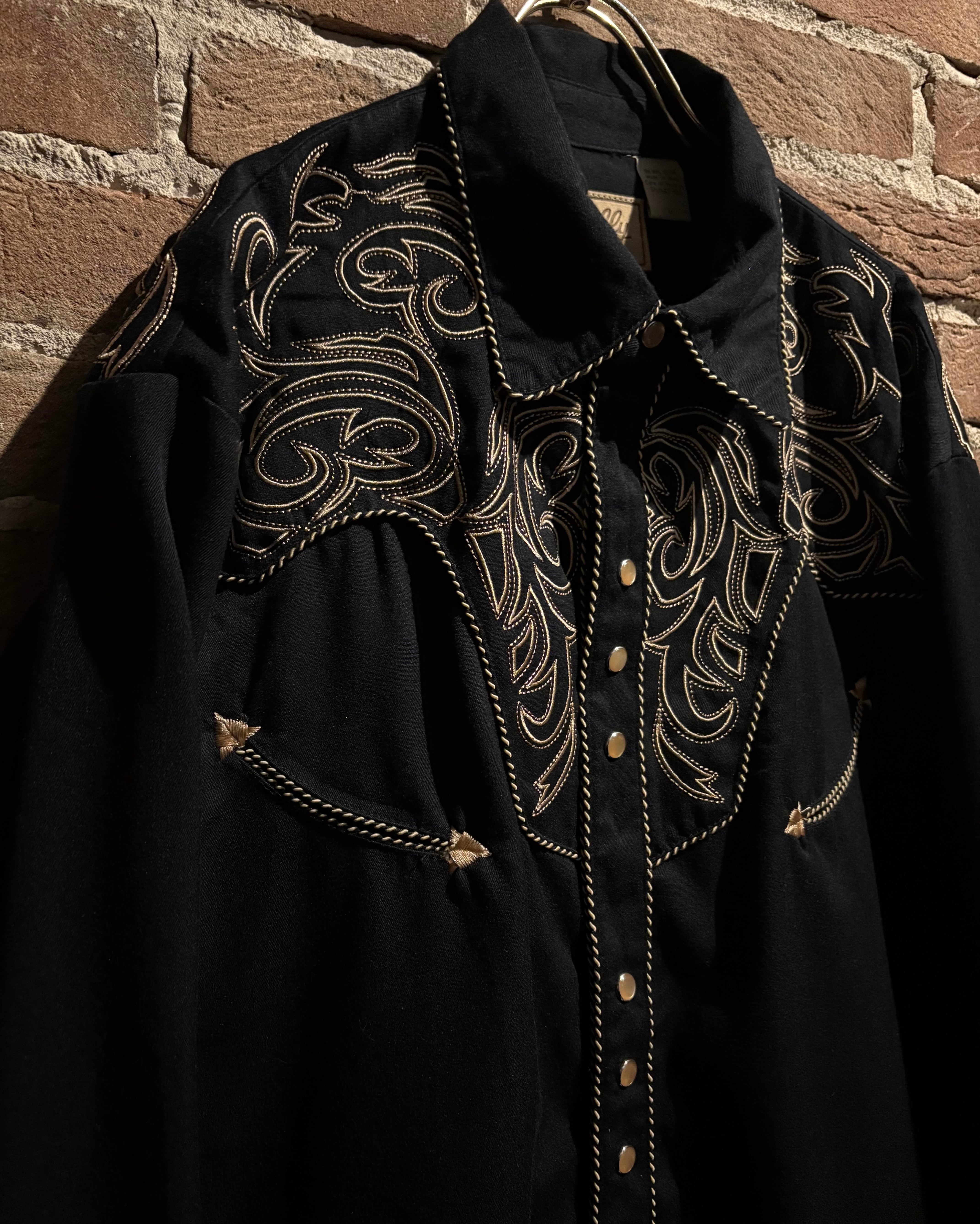 ブラックのボディをベースに、前後のヨーク、袖口にまでトライバル調の金刺繍を刻んだスペシャルなウエスタンシャツ。
