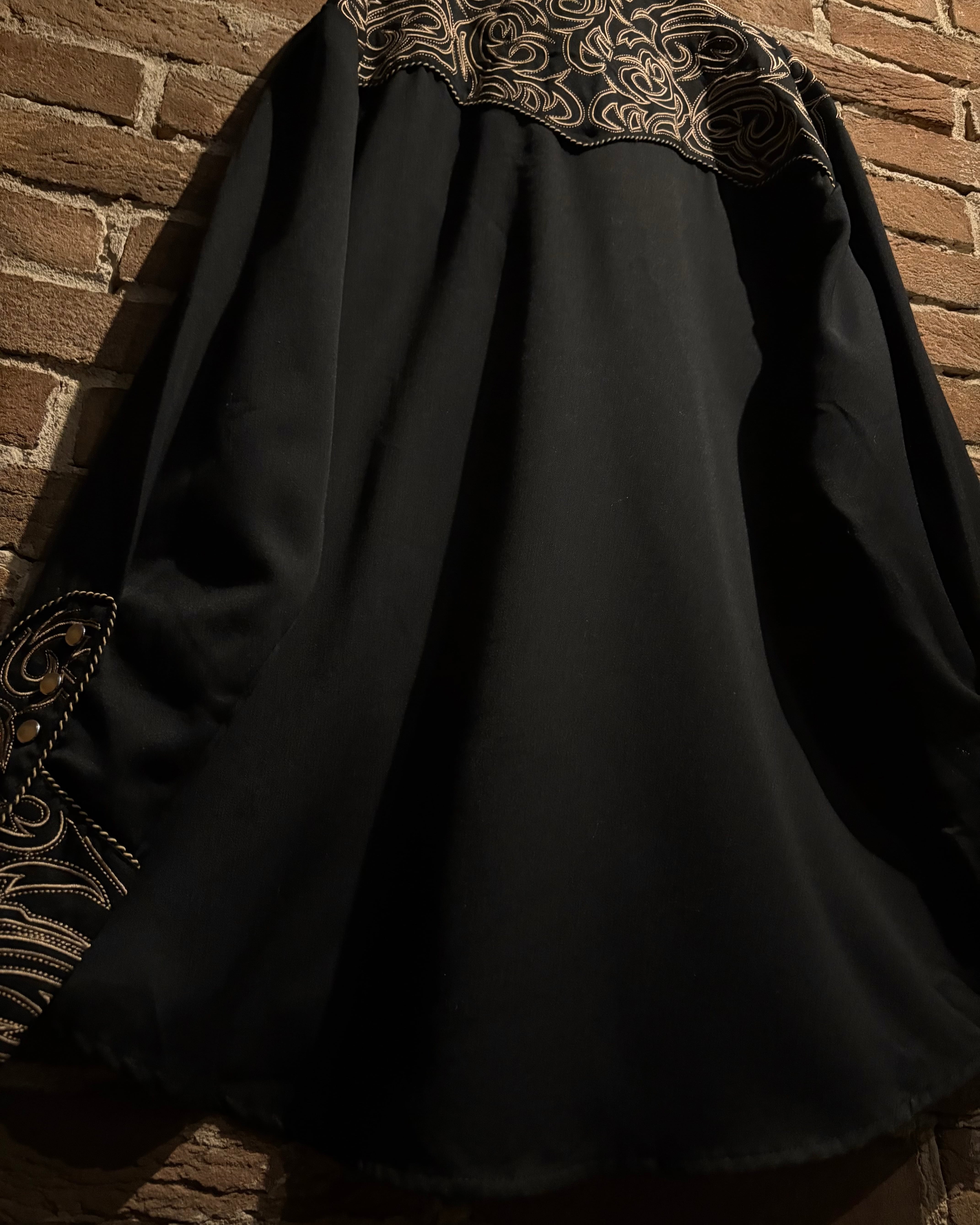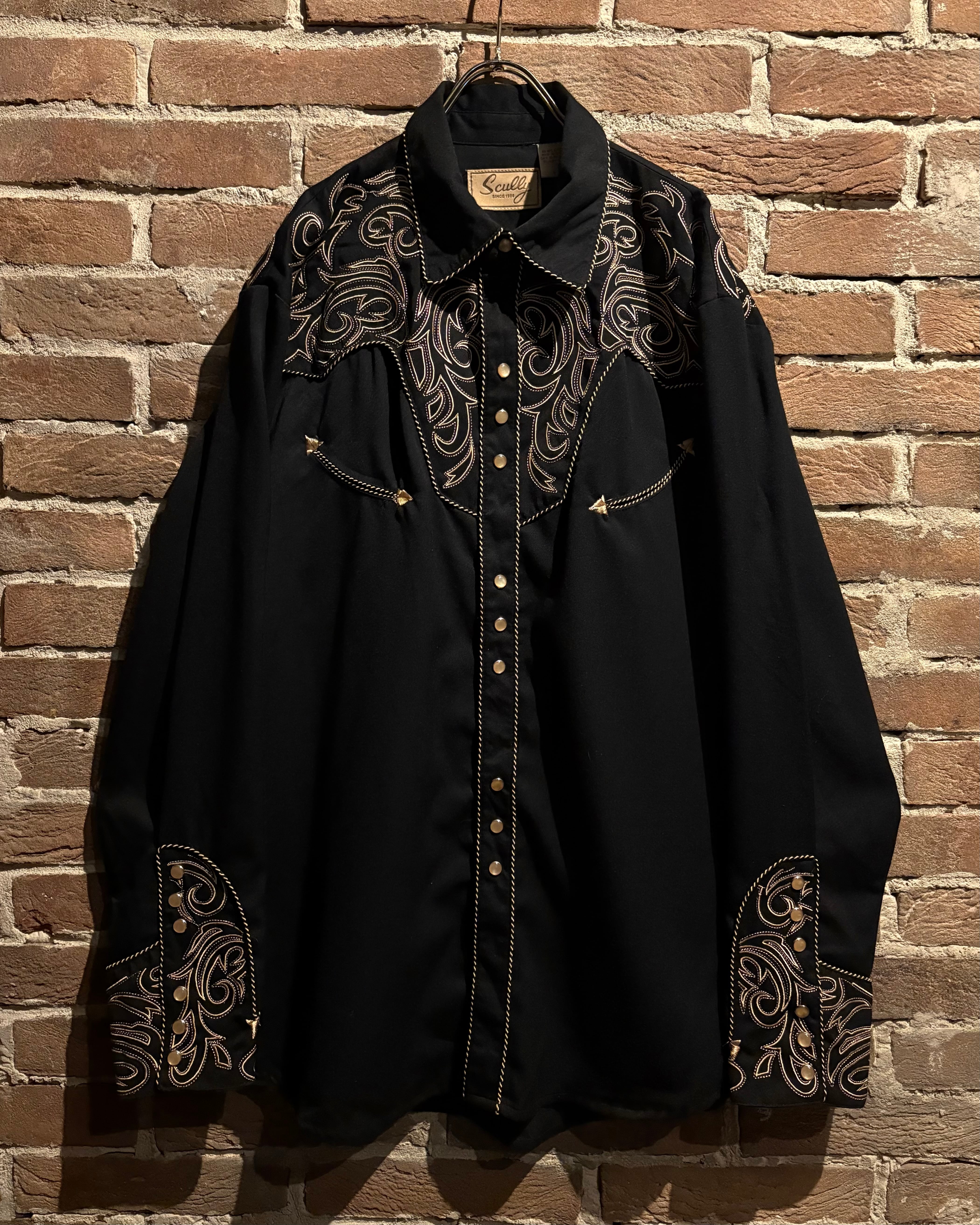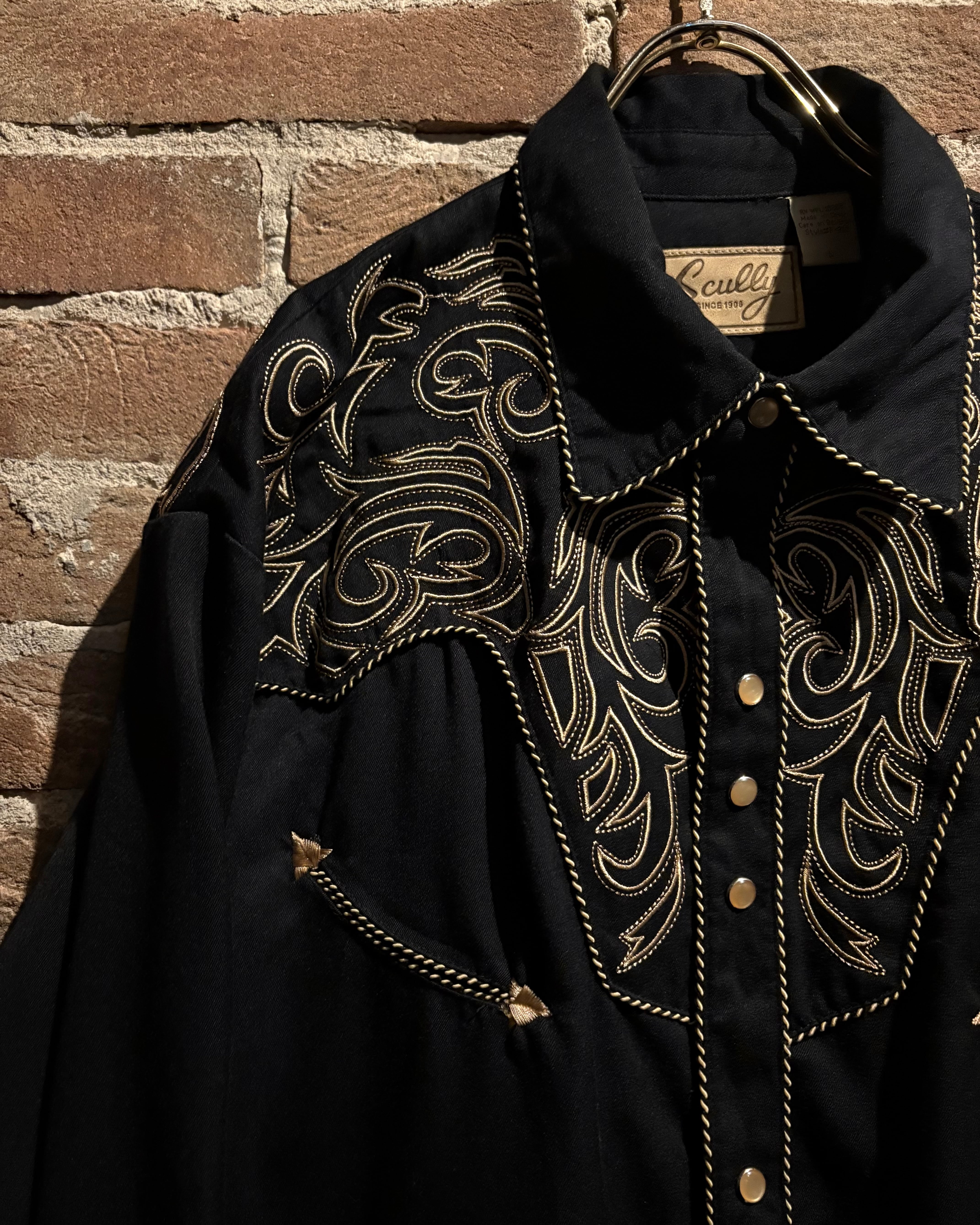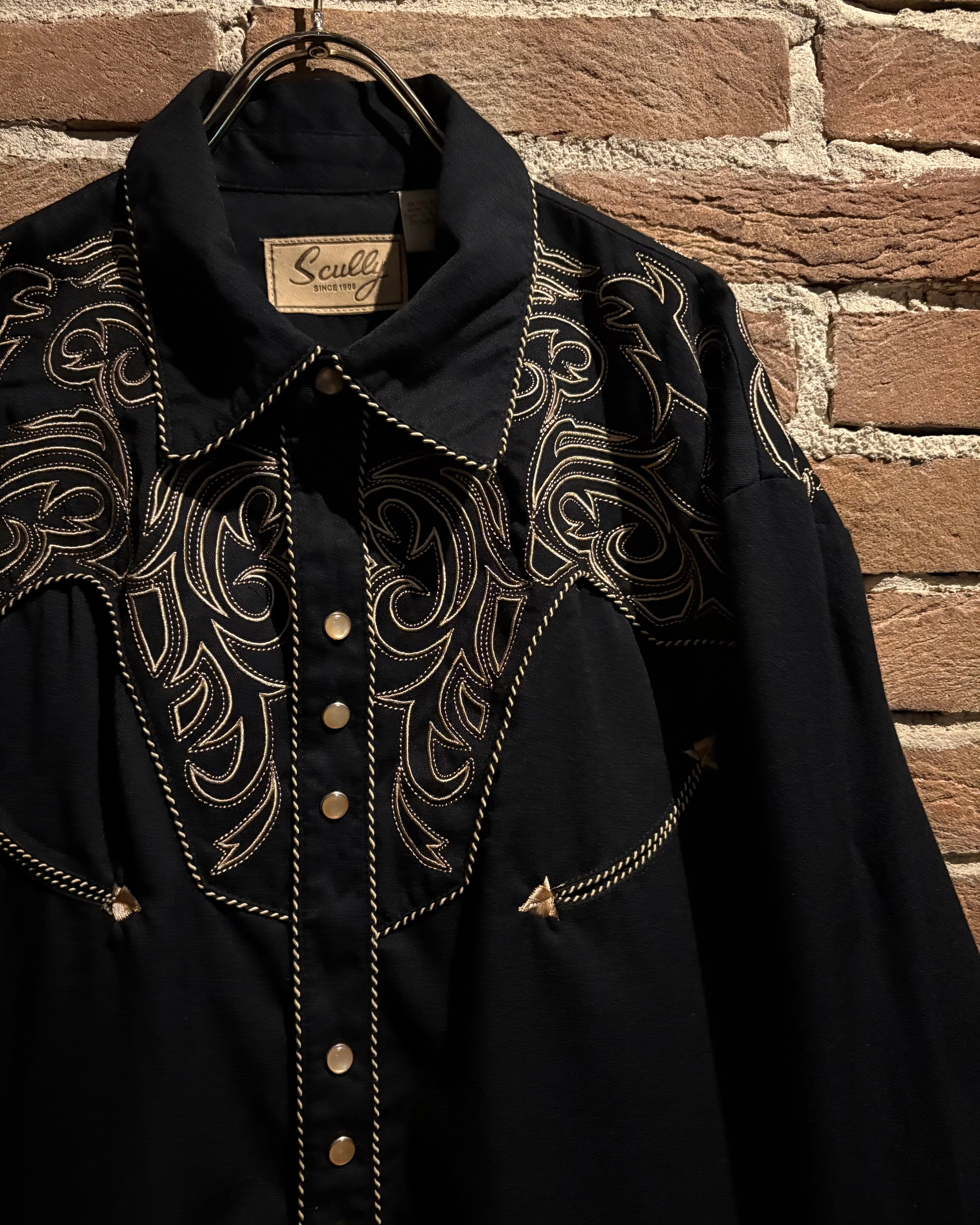 ブラックのボディをベースに、前後のヨーク、袖口にまでトライバル調の金刺繍を刻んだスペシャルなウエスタンシャツ。