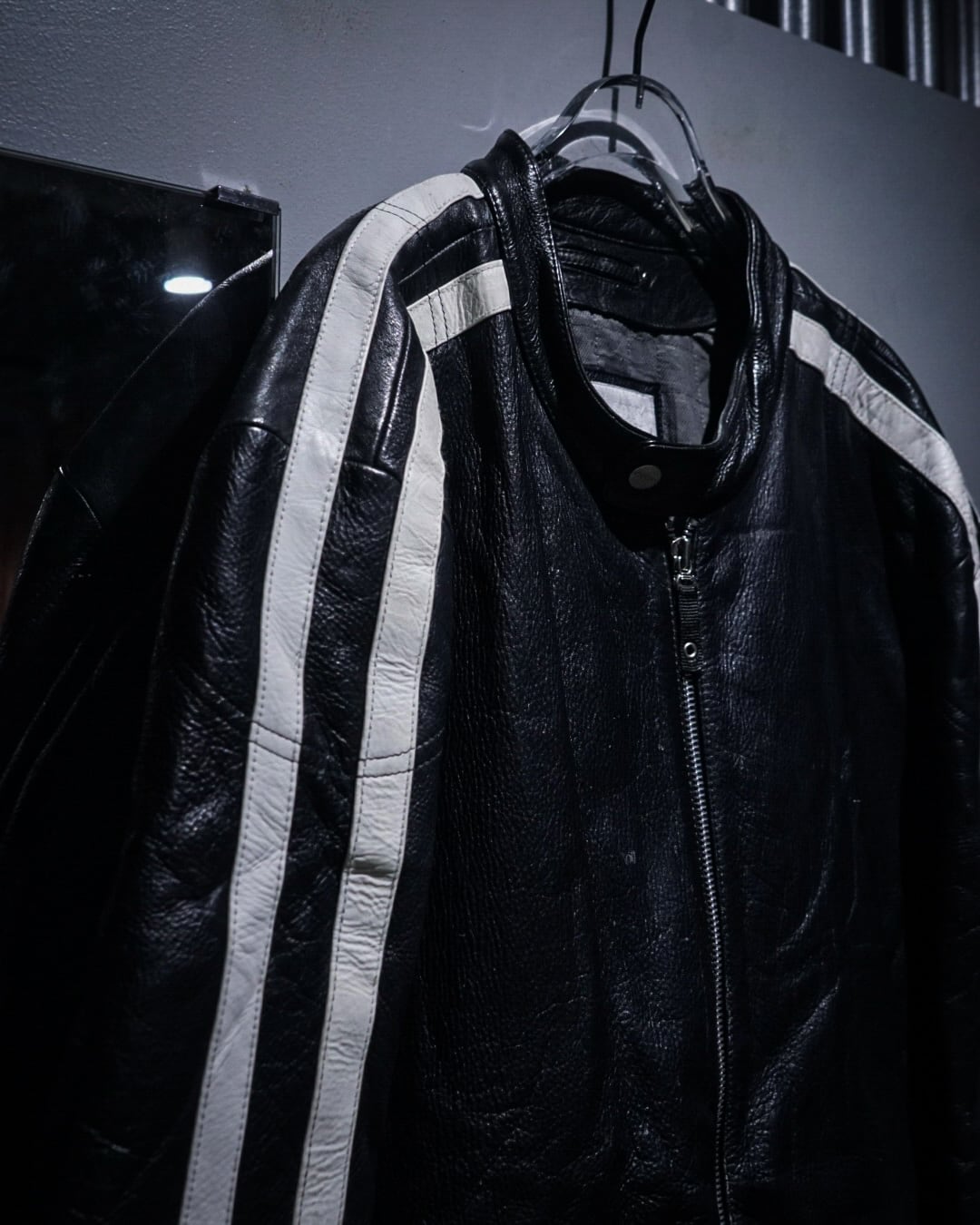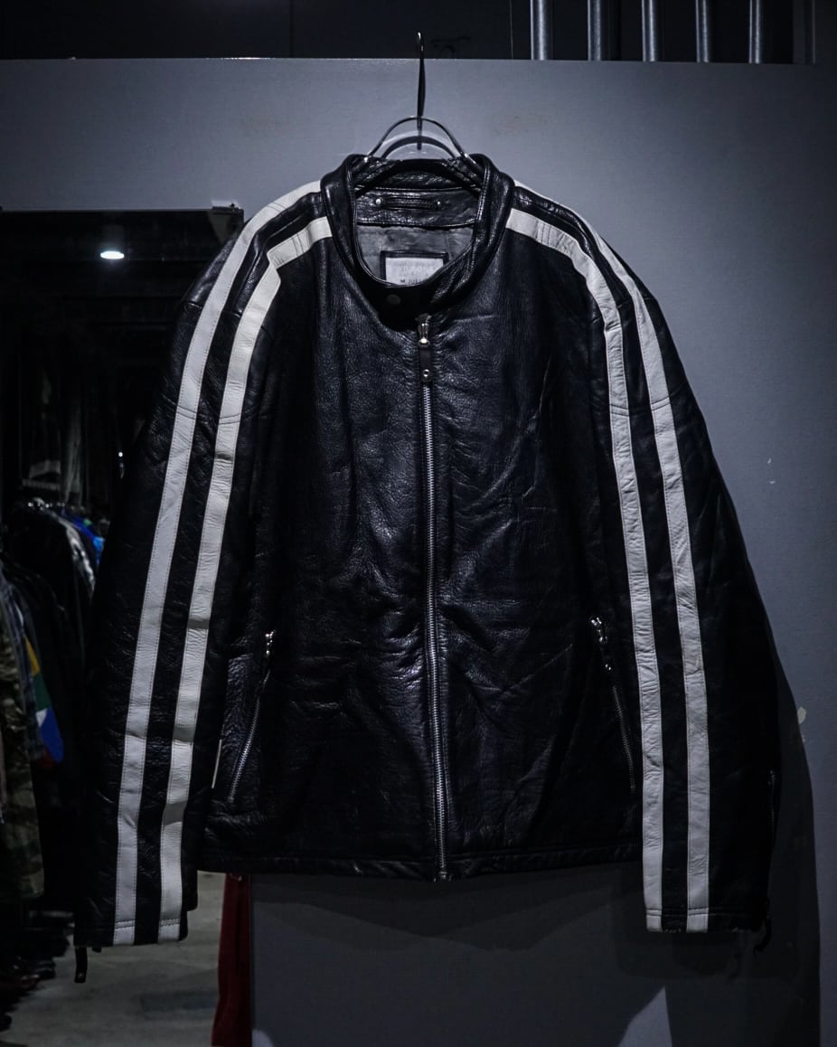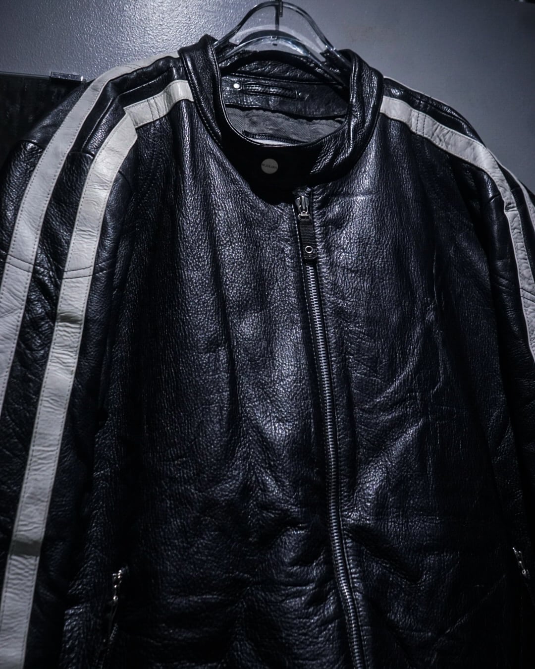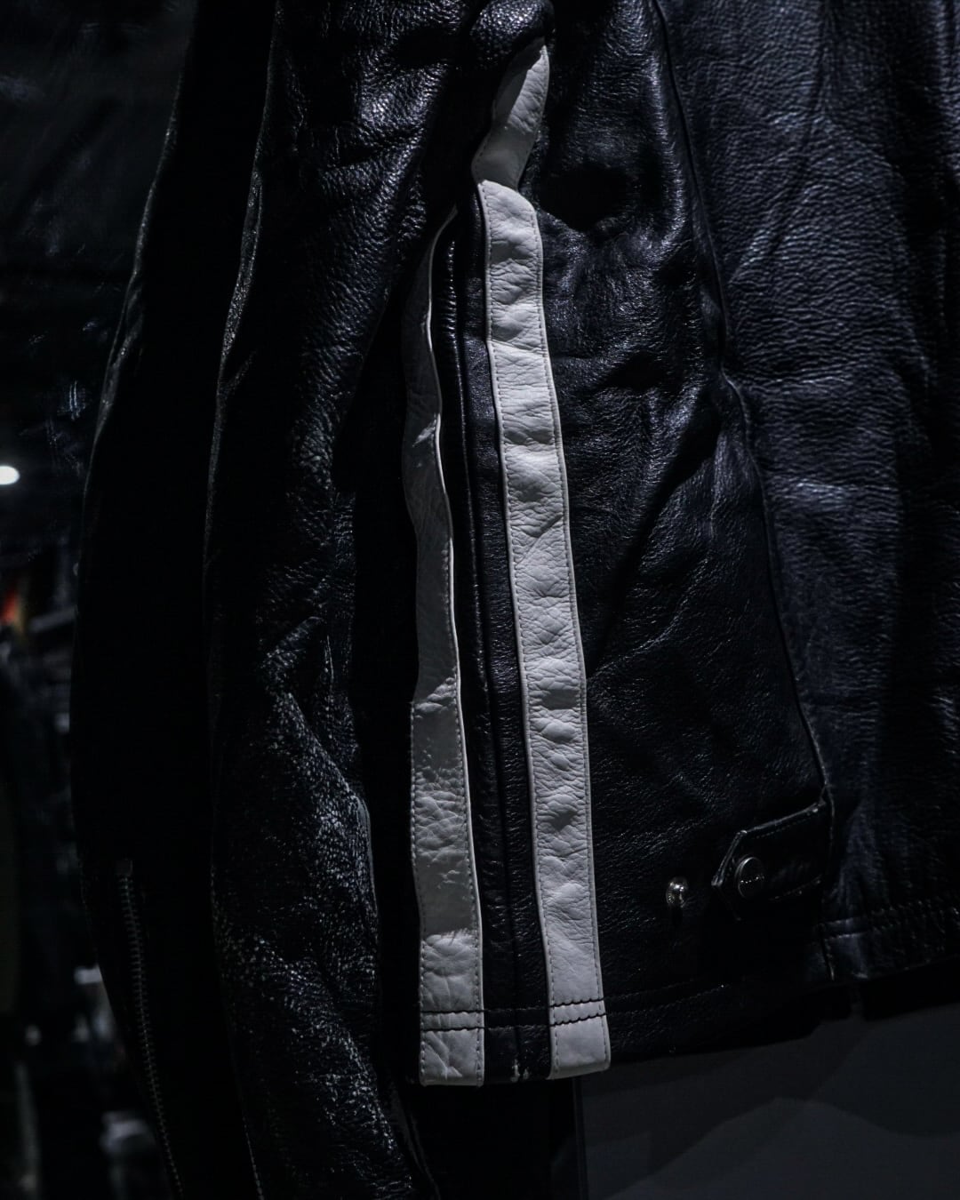 アームからボディサイドにかけて走るホワイトのレザーラインがレーシングジャケットを彷彿とさせ、シンプルなブラックボディの中に鋭いコントラストを生み出すデザインに。そしてフロントはジップ仕様にスタンドカラー、袖口にもジップを備えたバイカージャケットライクなディテールが光ります。