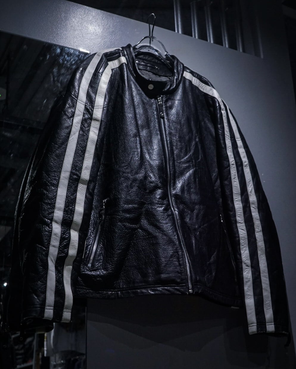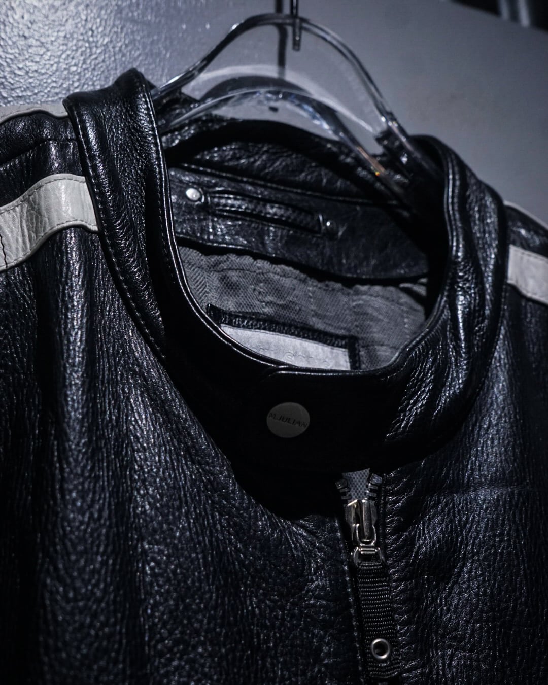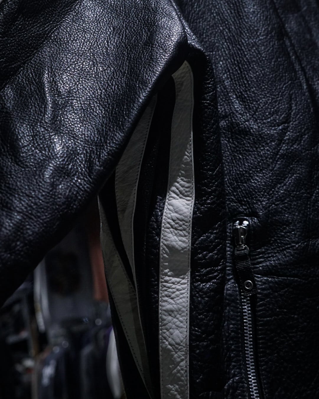 アームからボディサイドにかけて走るホワイトのレザーラインがレーシングジャケットを彷彿とさせ、シンプルなブラックボディの中に鋭いコントラストを生み出すデザインに。そしてフロントはジップ仕様にスタンドカラー、袖口にもジップを備えたバイカージャケットライクなディテールが光ります。