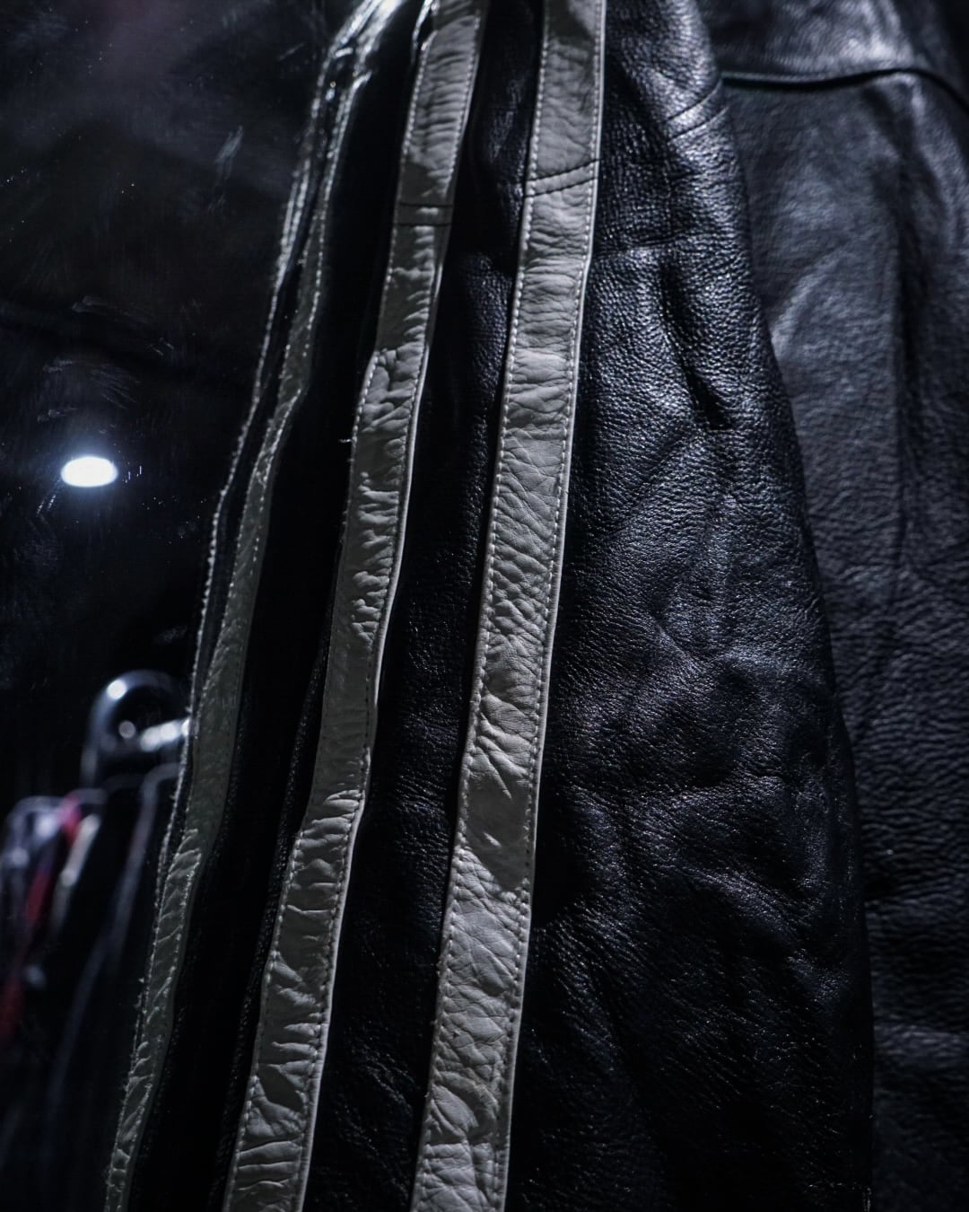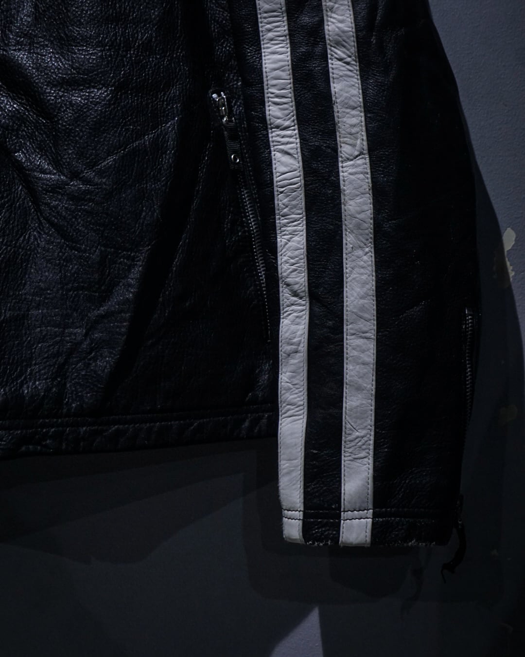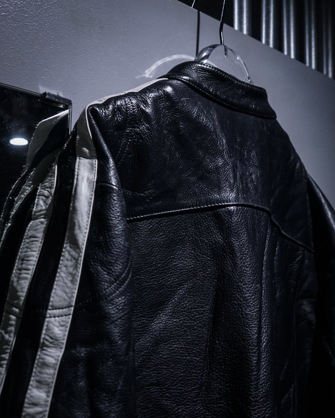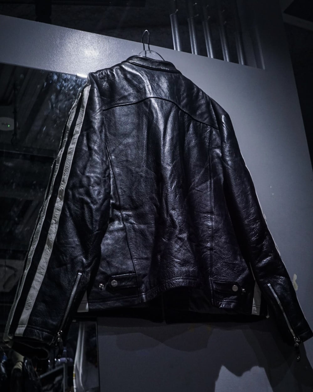 アームからボディサイドにかけて走るホワイトのレザーラインがレーシングジャケットを彷彿とさせ、シンプルなブラックボディの中に鋭いコントラストを生み出すデザインに。そしてフロントはジップ仕様にスタンドカラー、袖口にもジップを備えたバイカージャケットライクなディテールが光ります。