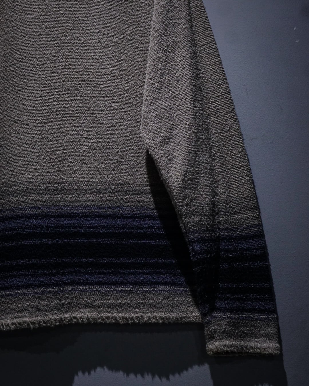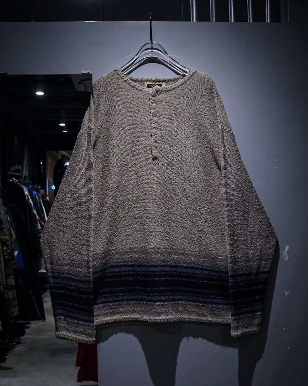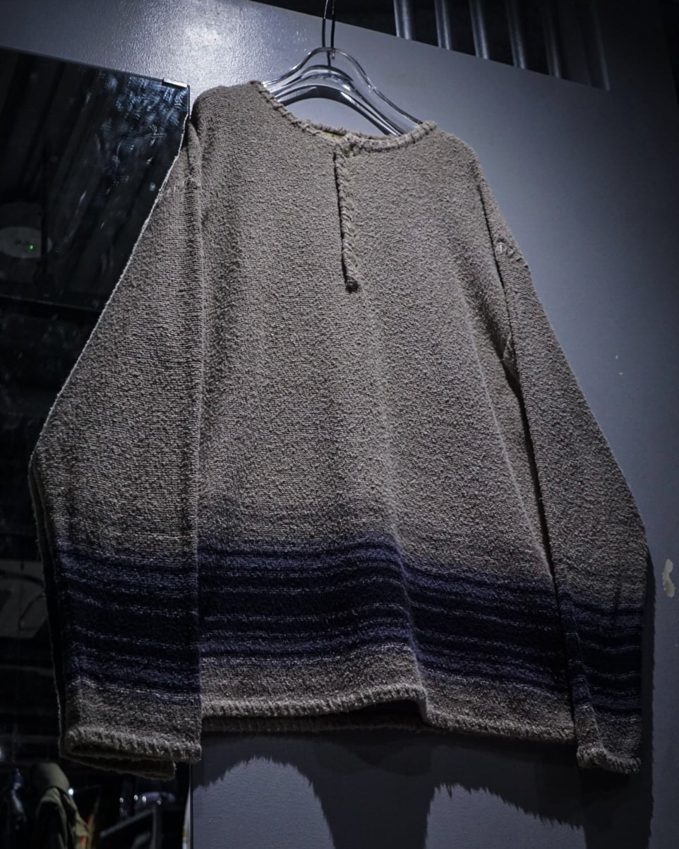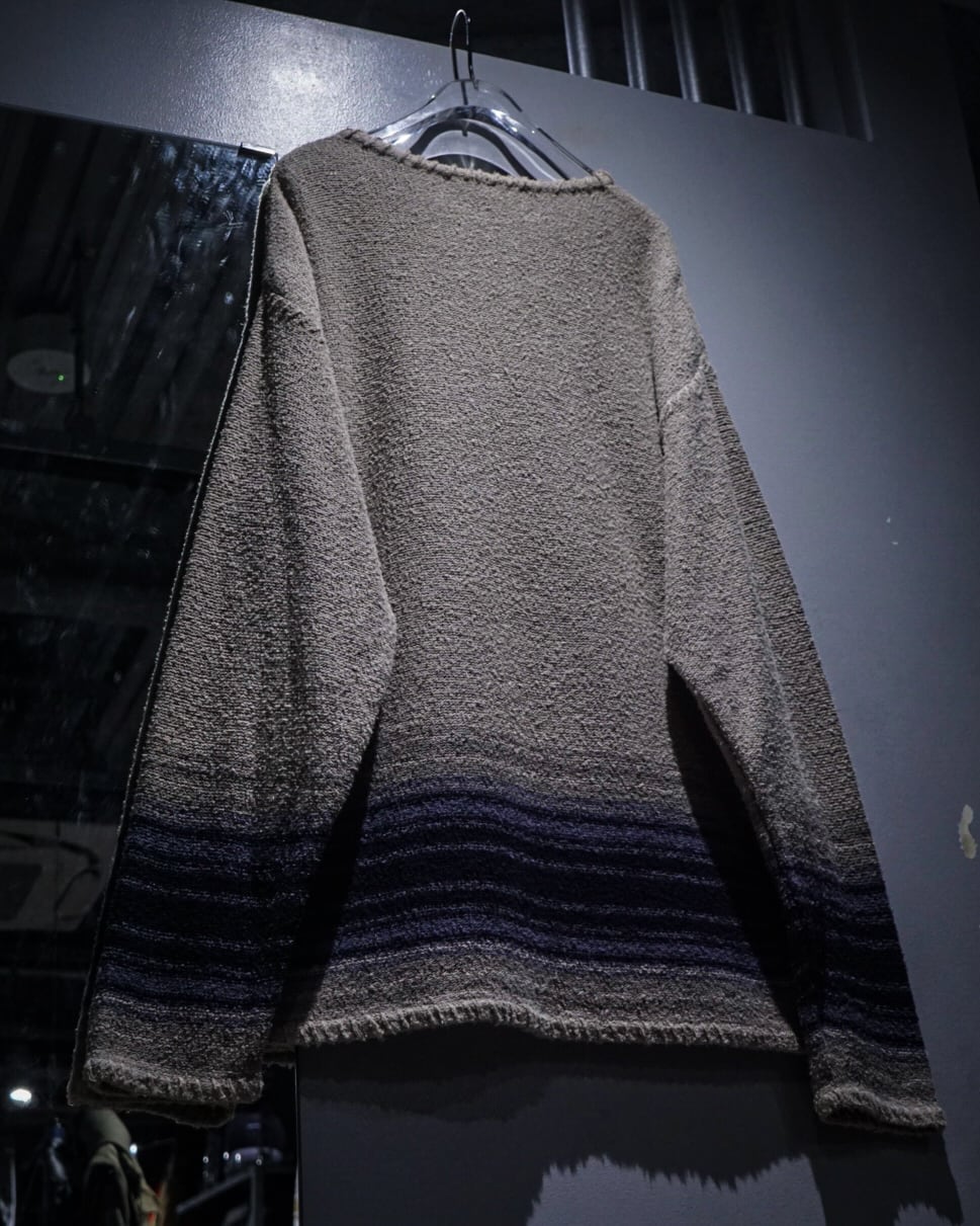 ベージュカラーをベースにグラデーションの効いたネイビーのボーダーが爽やかな印象を演出。程よいカジュアル感と品の良さを兼ね備えた仕上がりとなっています。ヘンリーネックの抜け感も◎