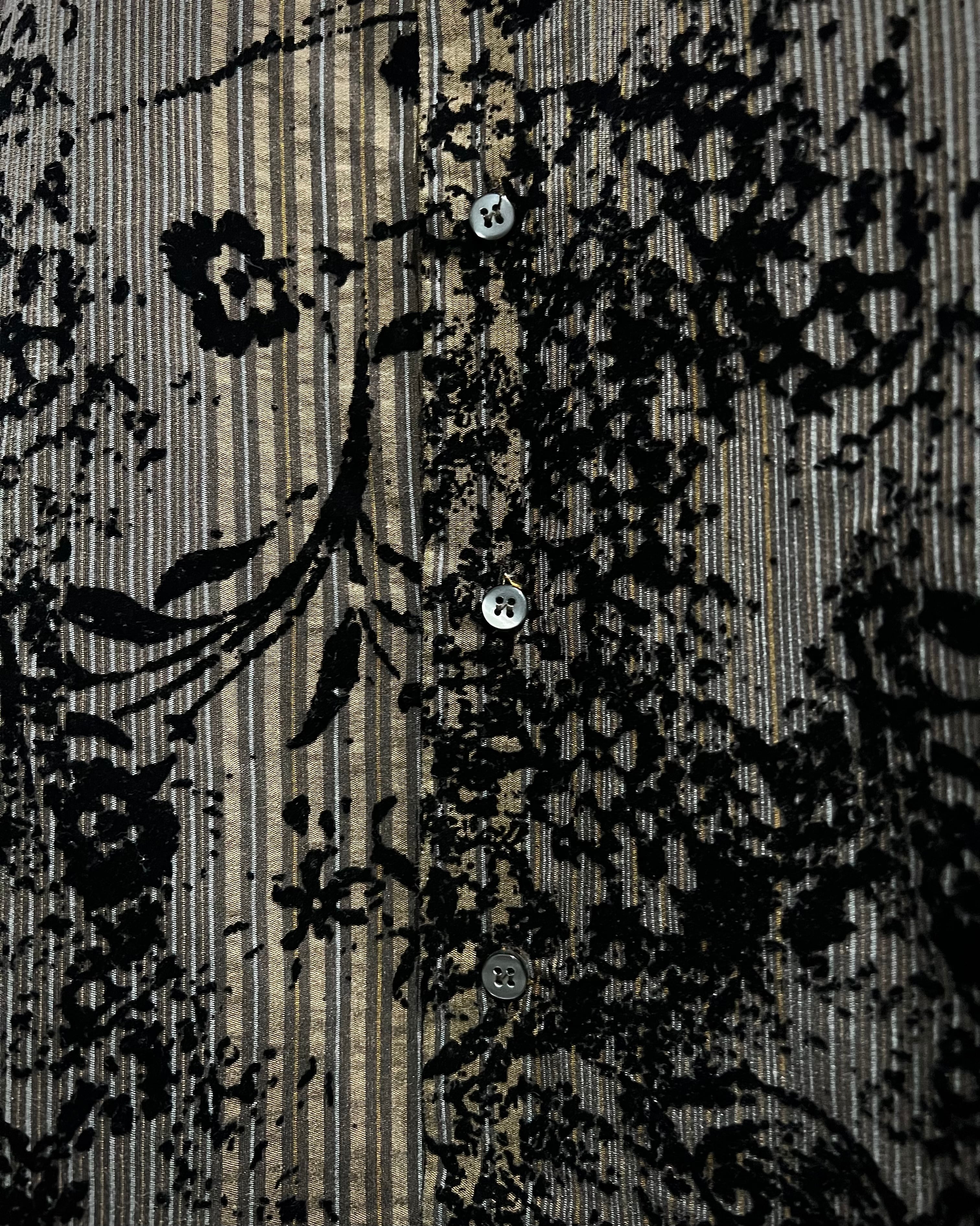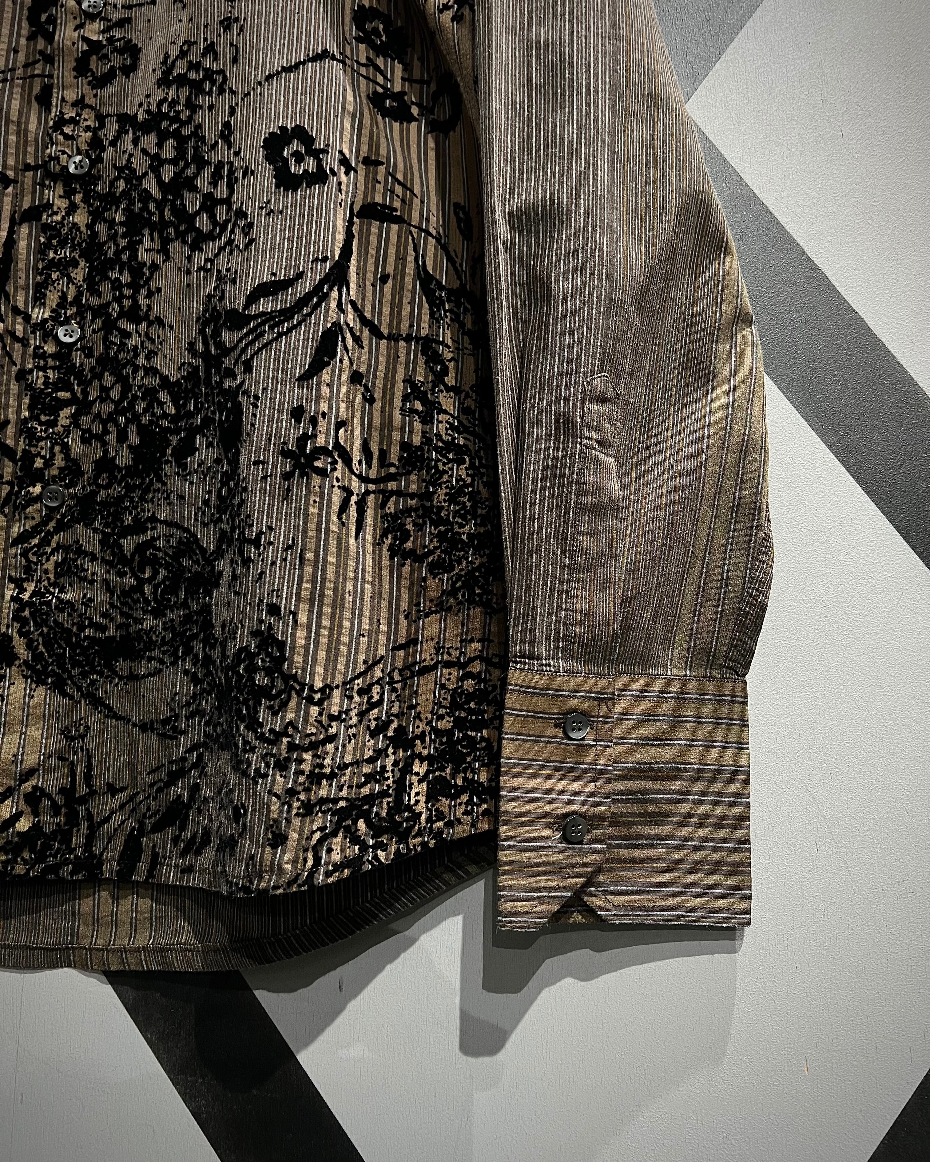 落ち着いたトーンのストライプボディに、立体的なボタニカル柄を重ねた長袖シャツ。