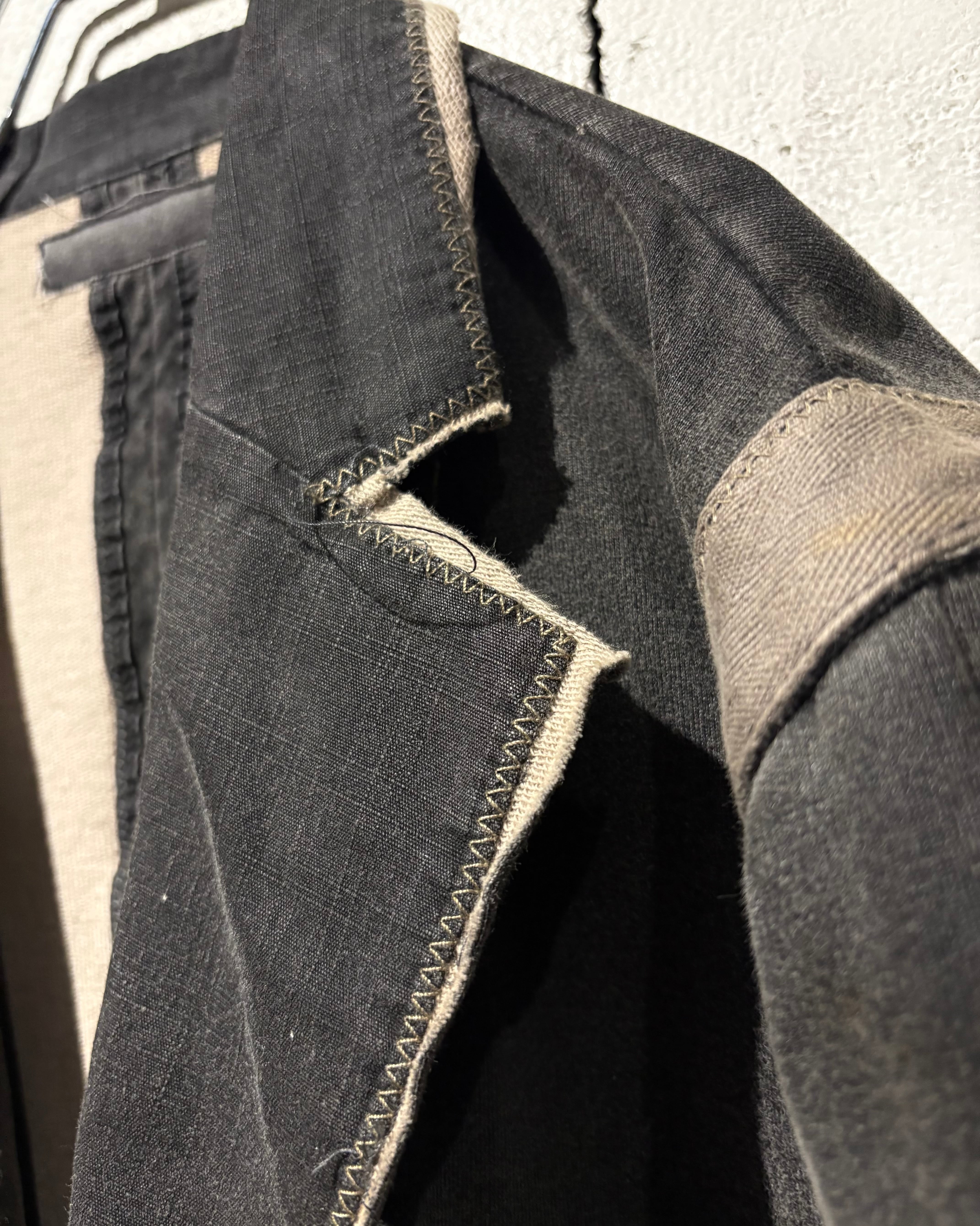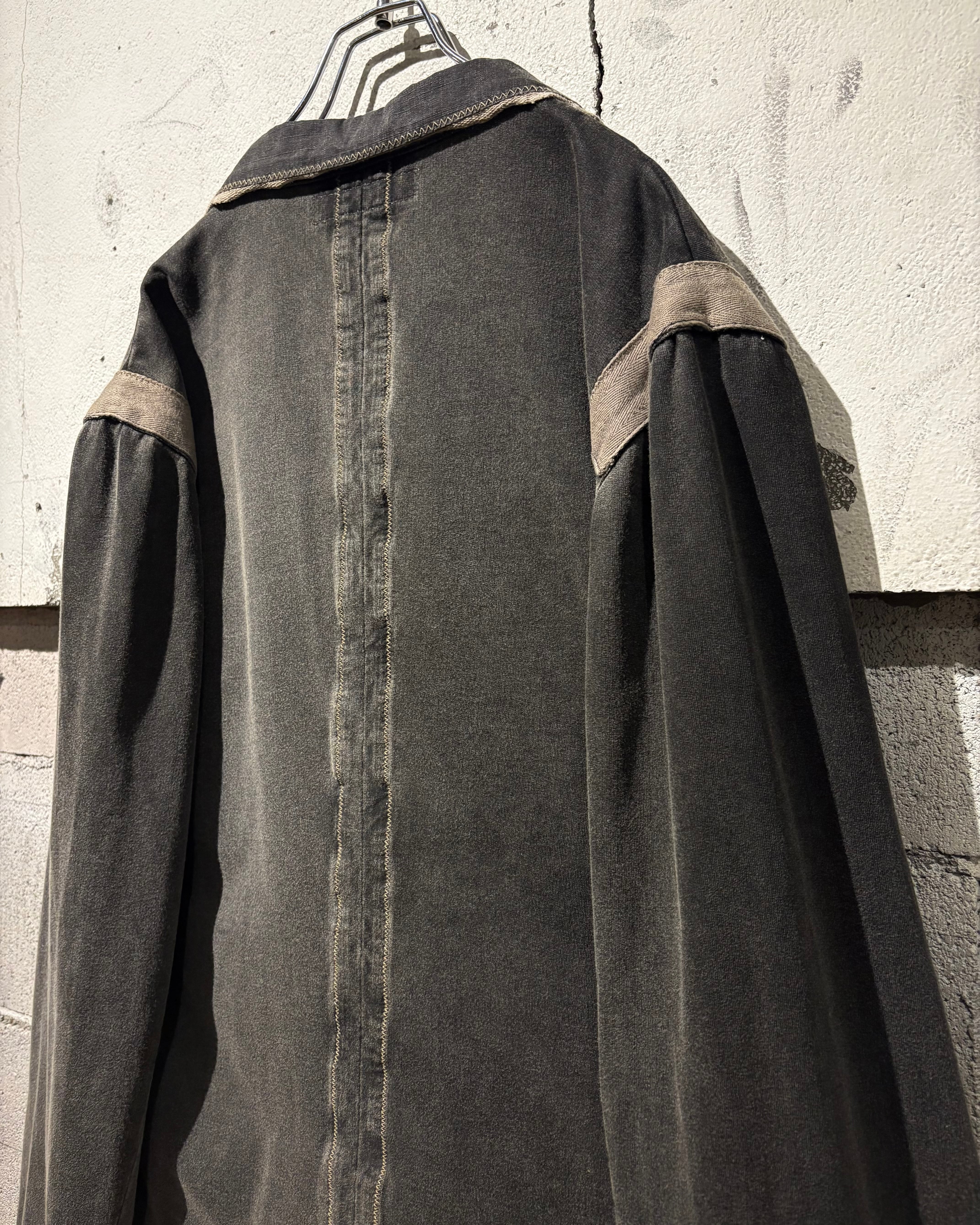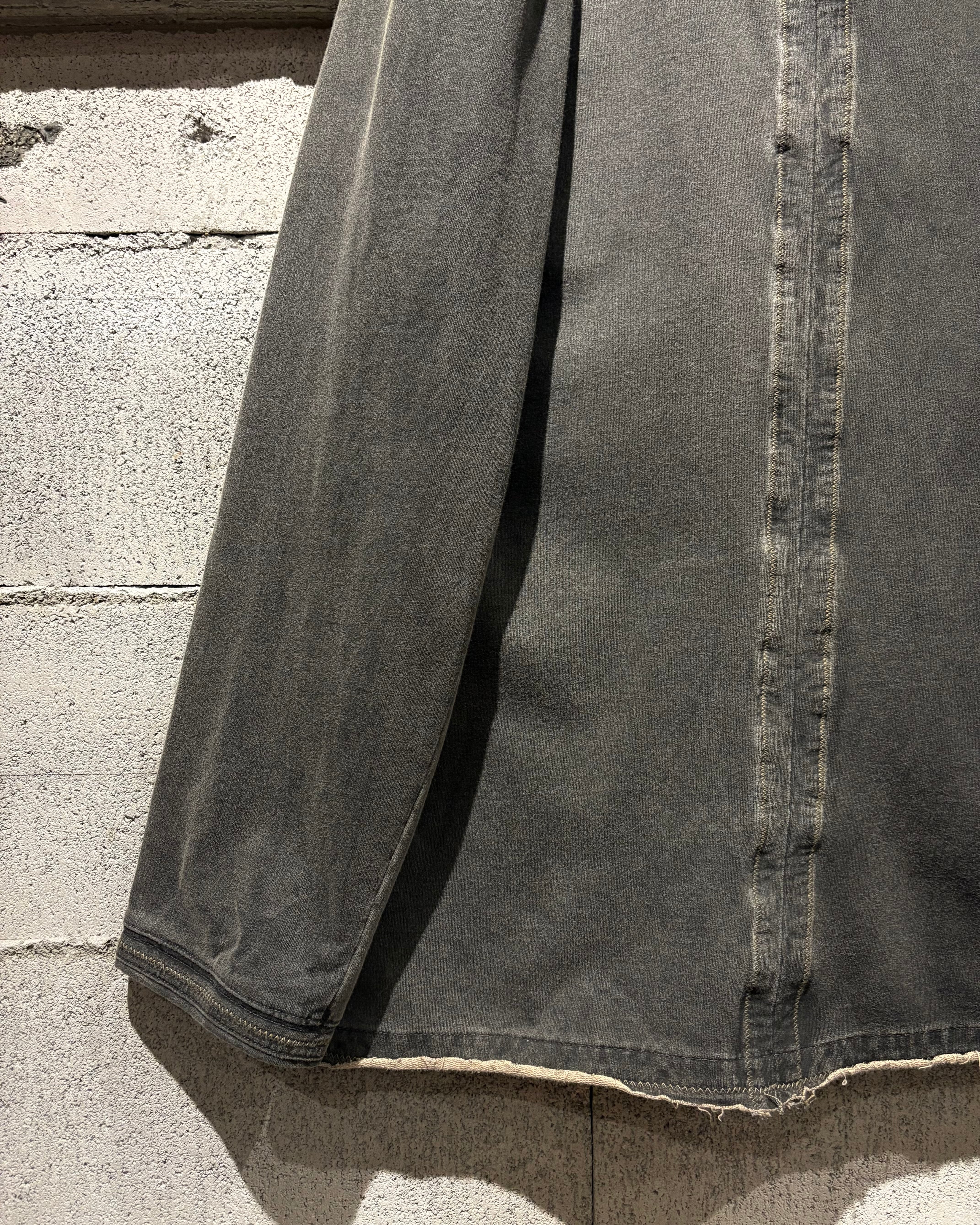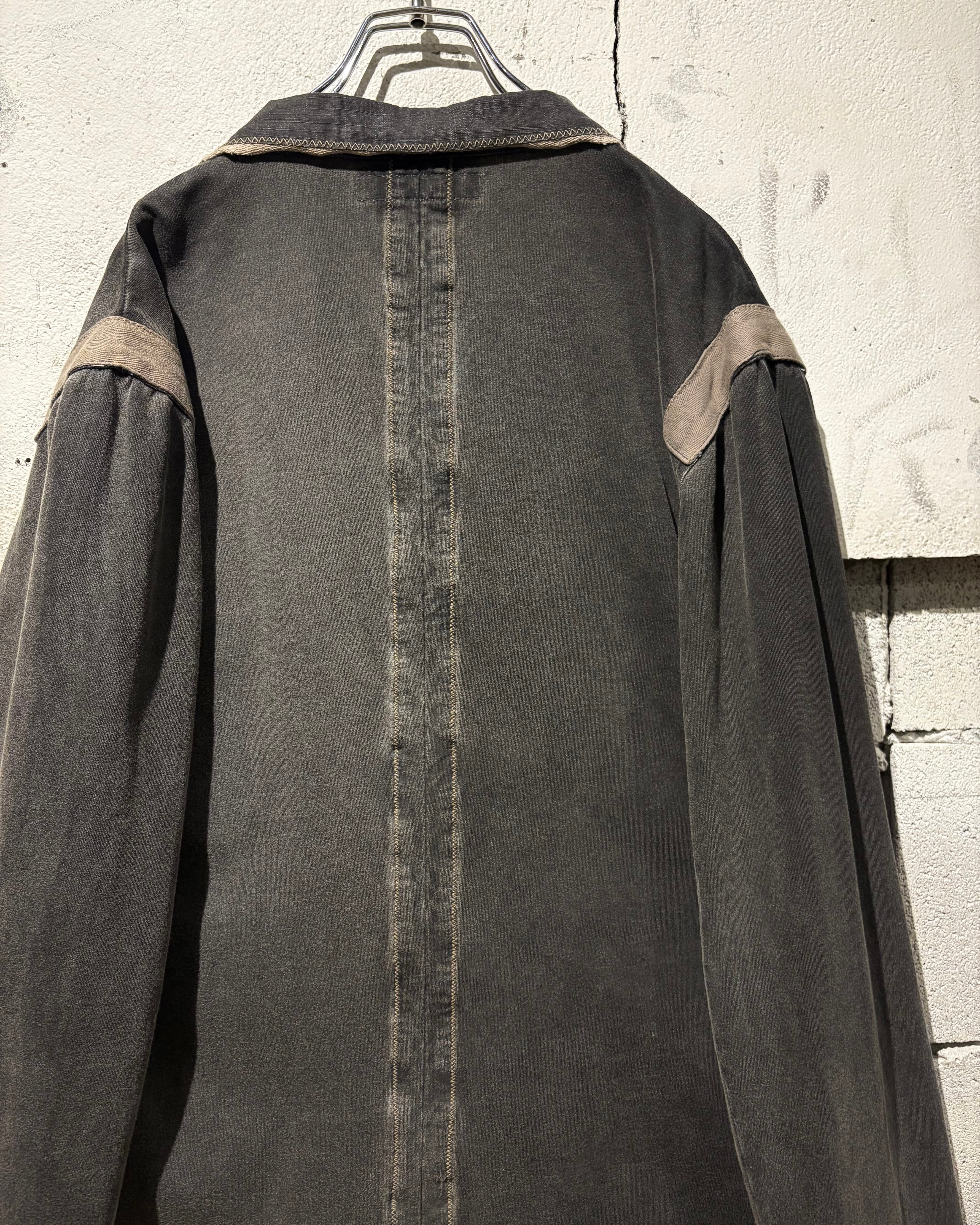 ボディはトーンの異なるコットン生地を組み合わせたパッチワーク風のデザイン。フェード感のある表情に加え、裁ち端をあえて残したディテールや随所に走るステッチワークが絶妙なボロ感を演出しています。