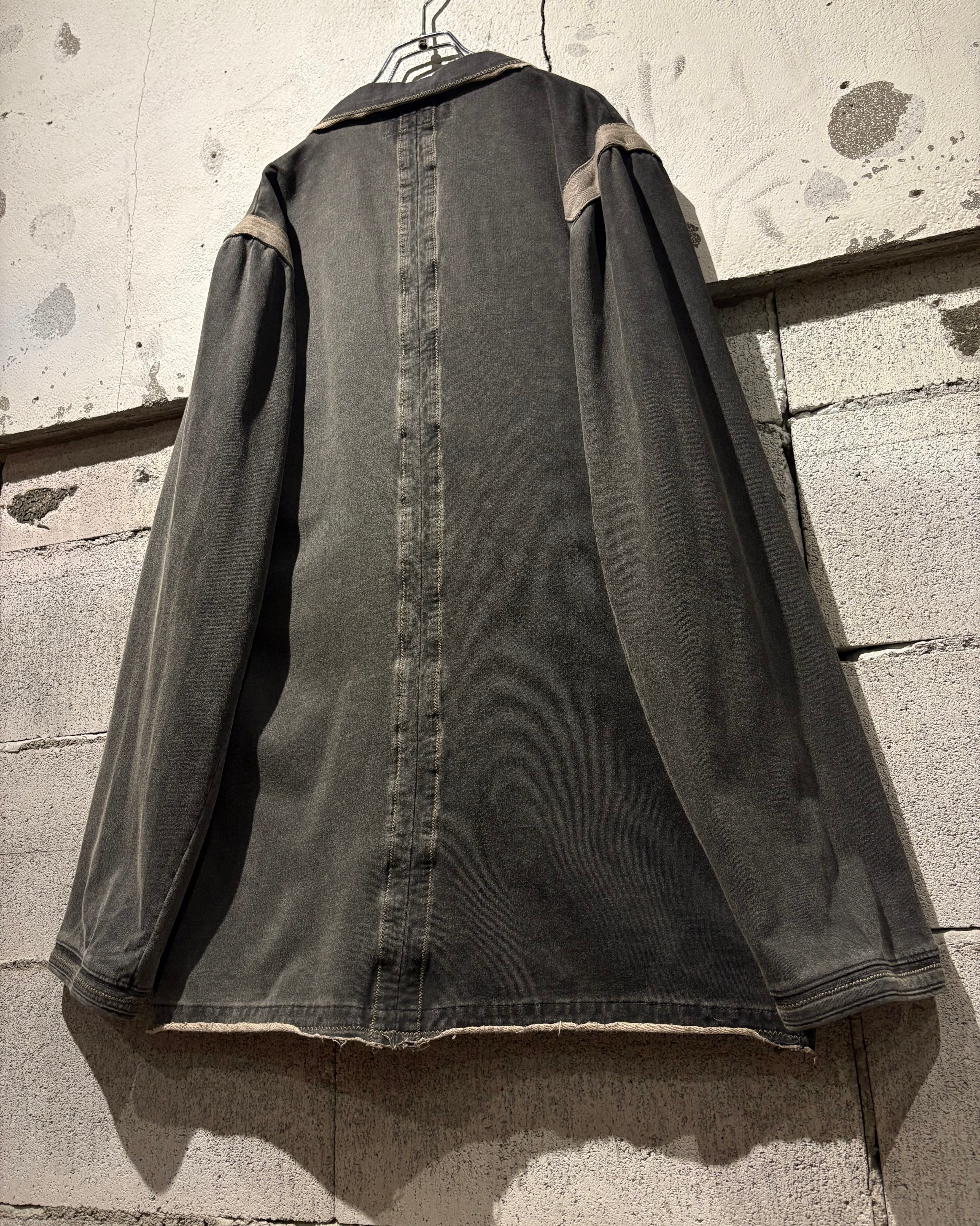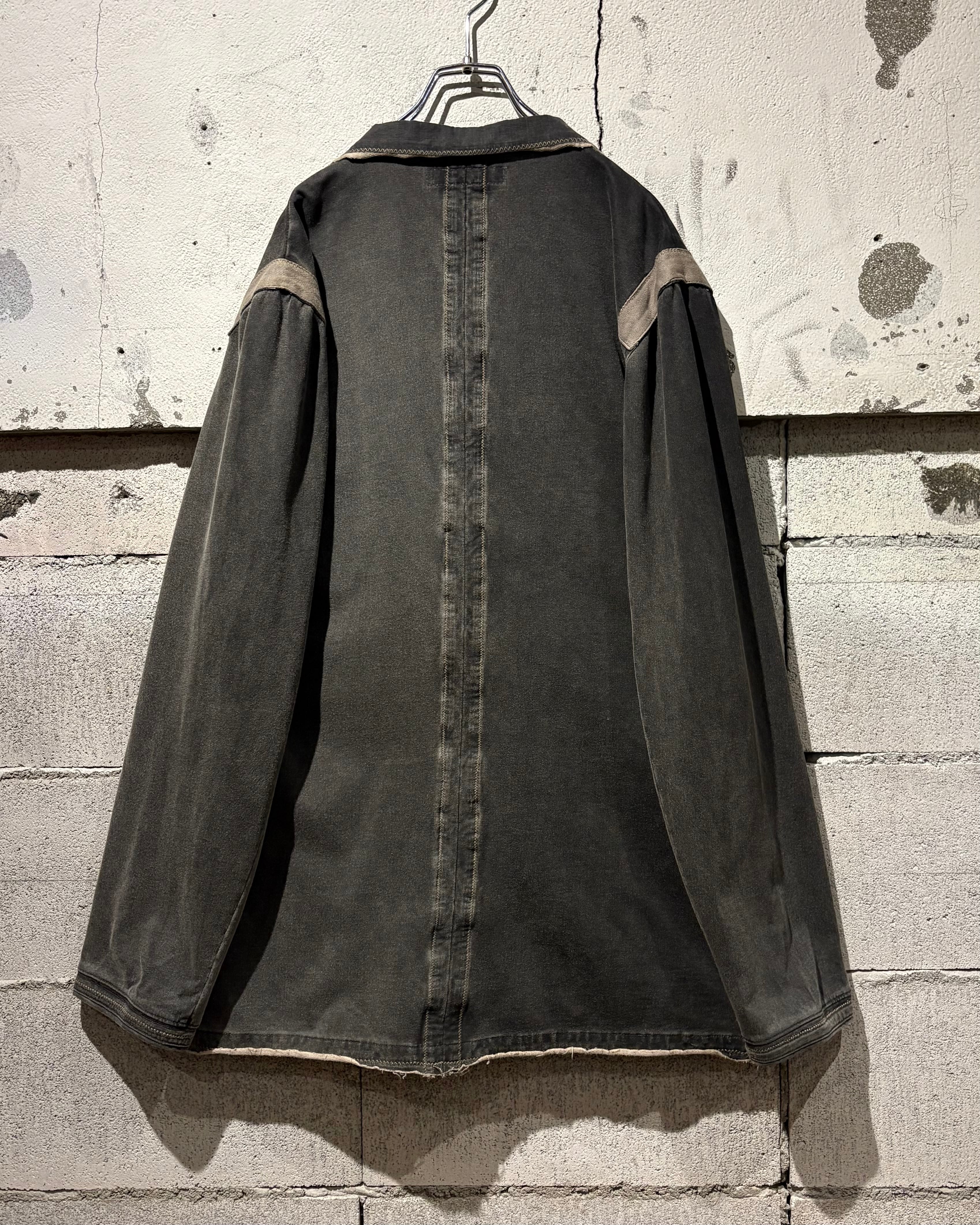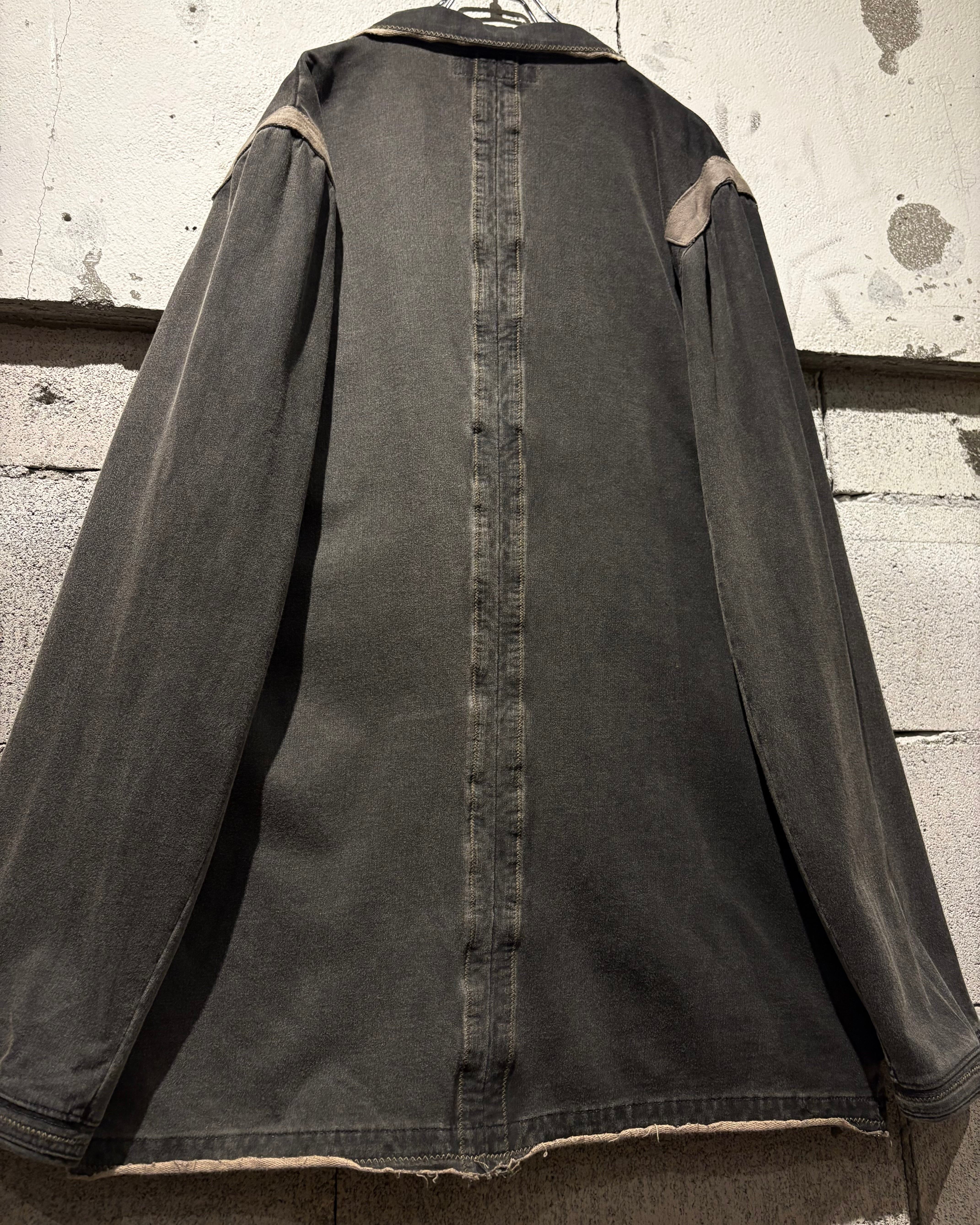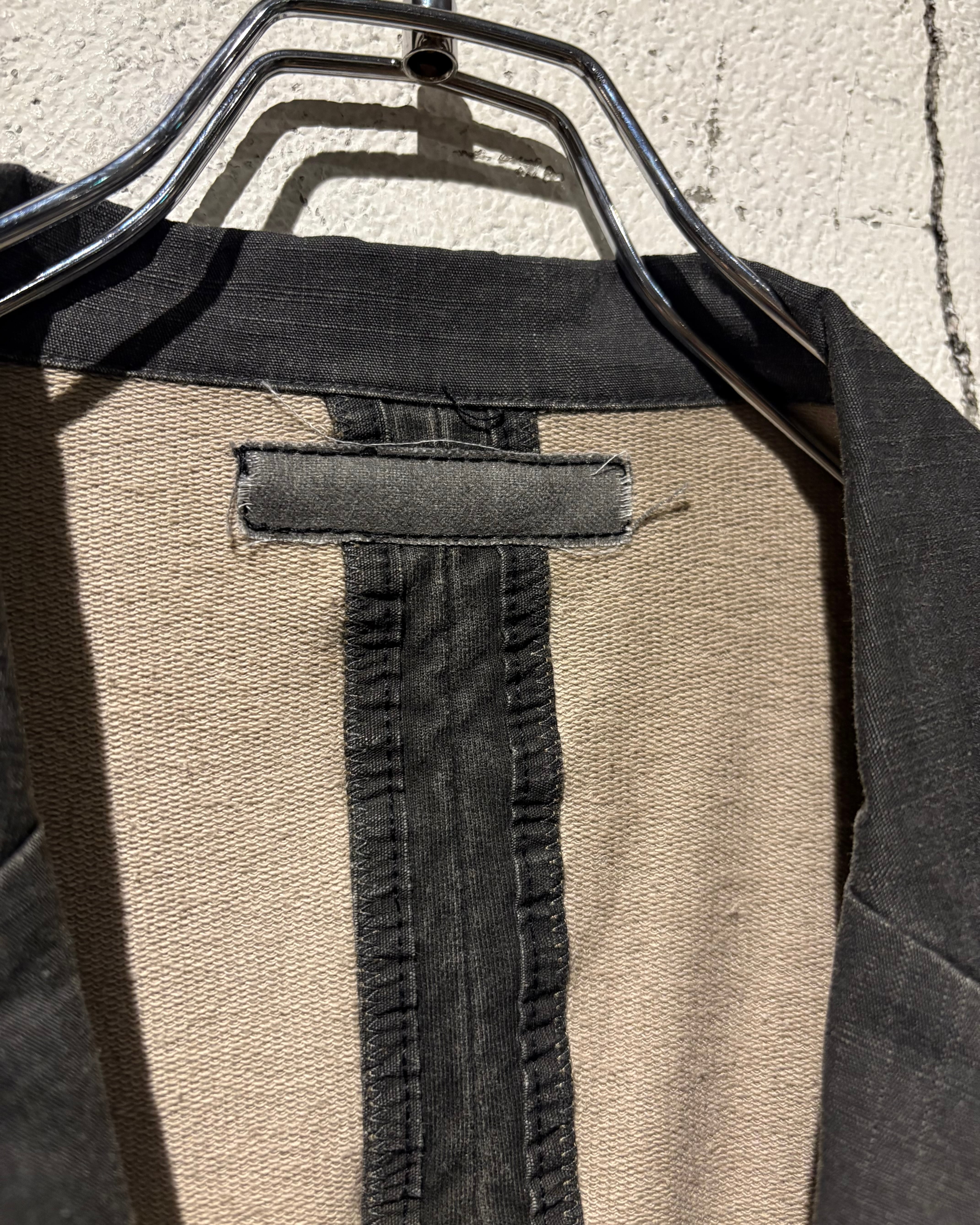 ボディはトーンの異なるコットン生地を組み合わせたパッチワーク風のデザイン。フェード感のある表情に加え、裁ち端をあえて残したディテールや随所に走るステッチワークが絶妙なボロ感を演出しています。