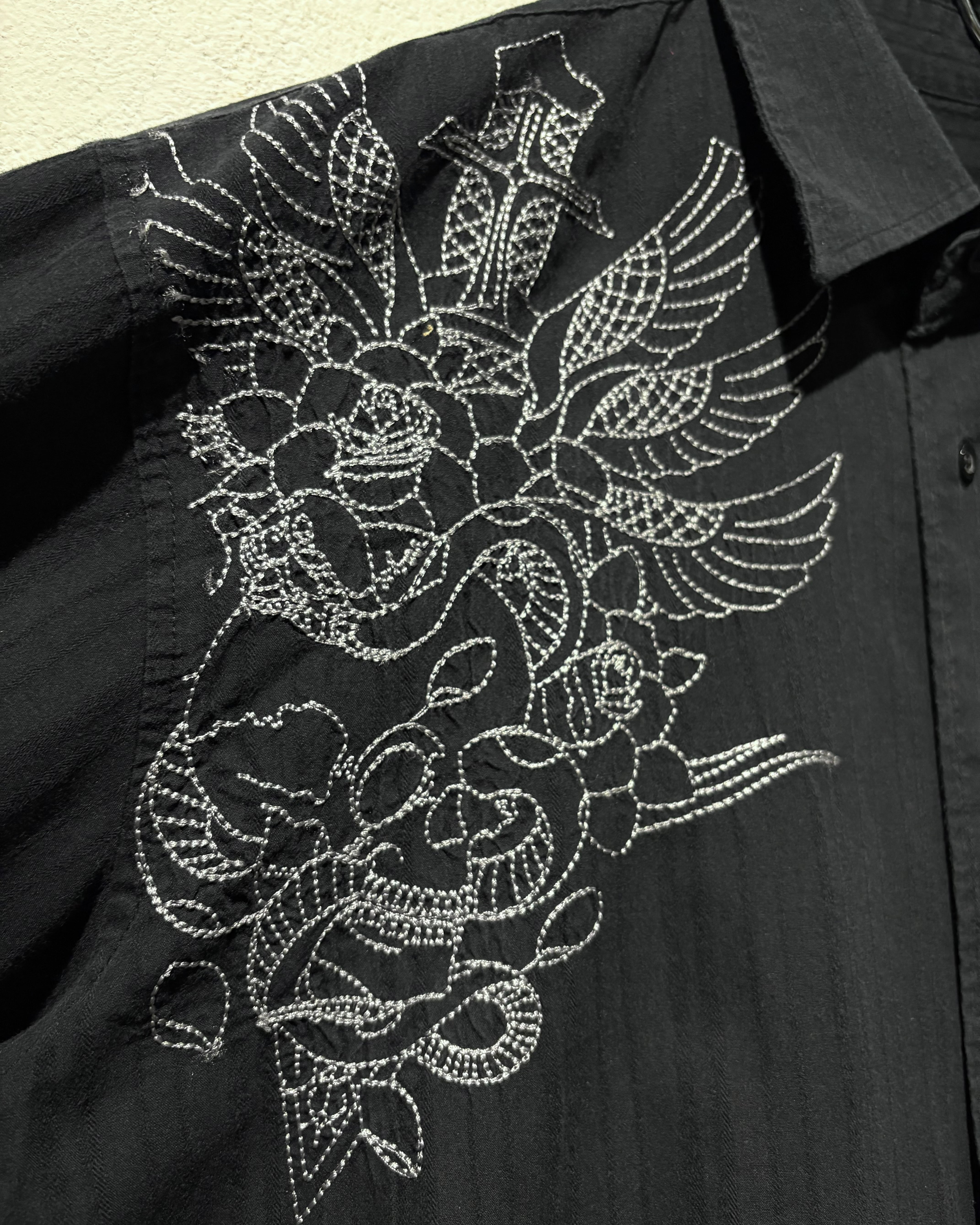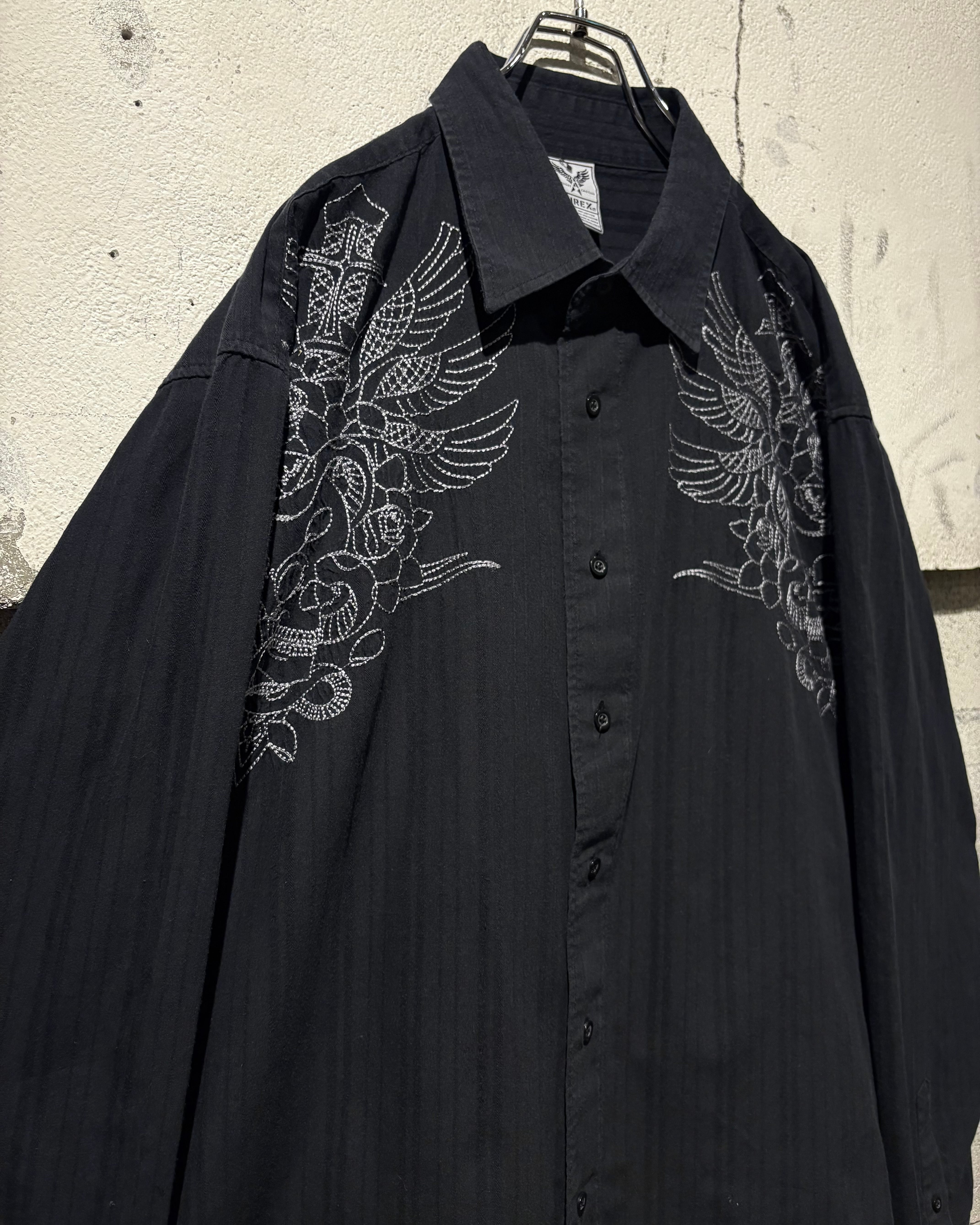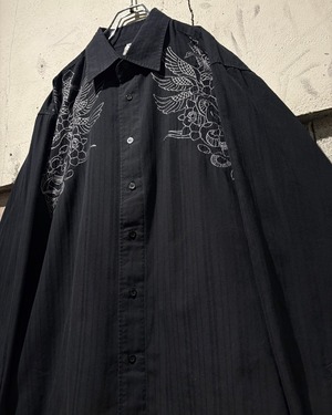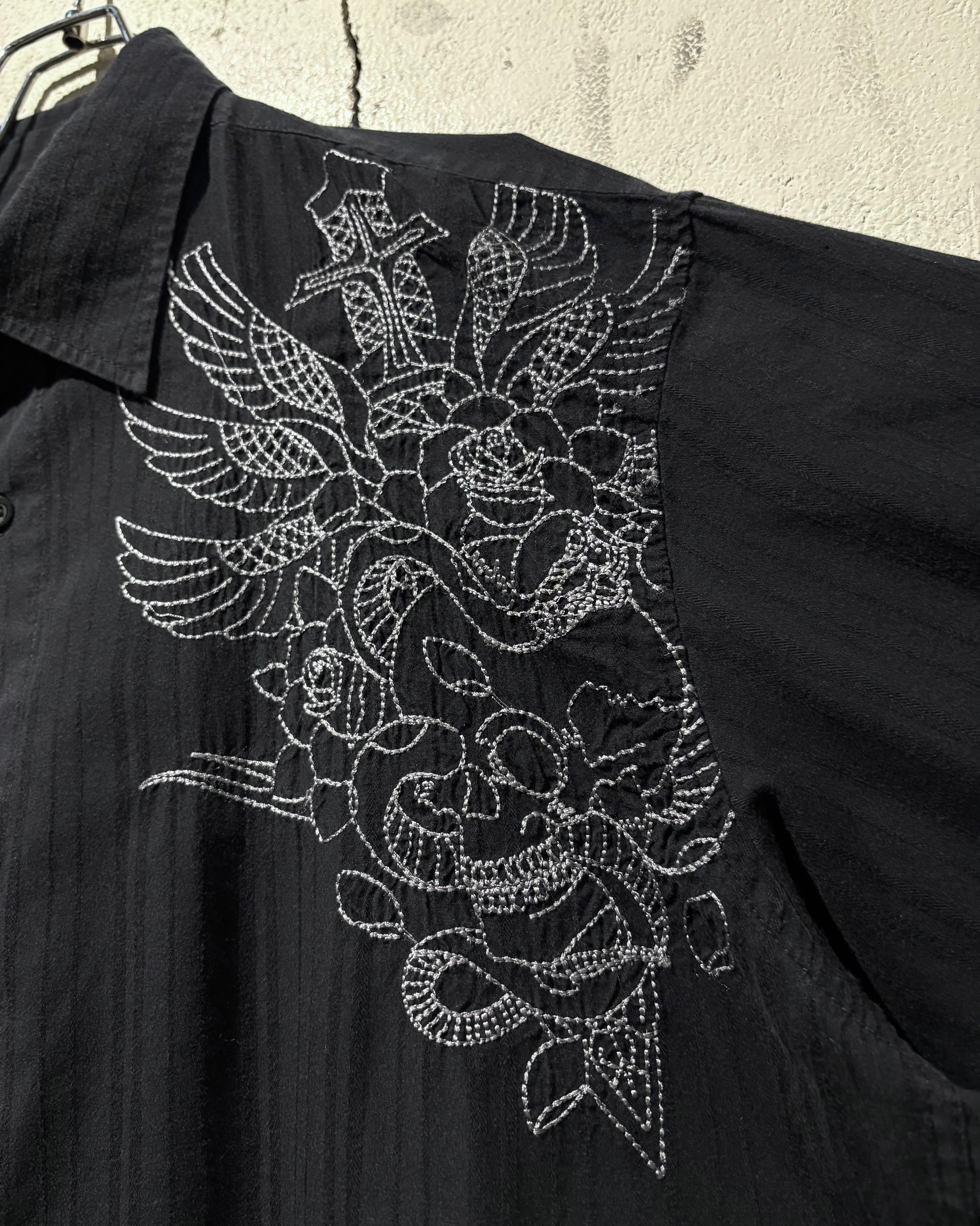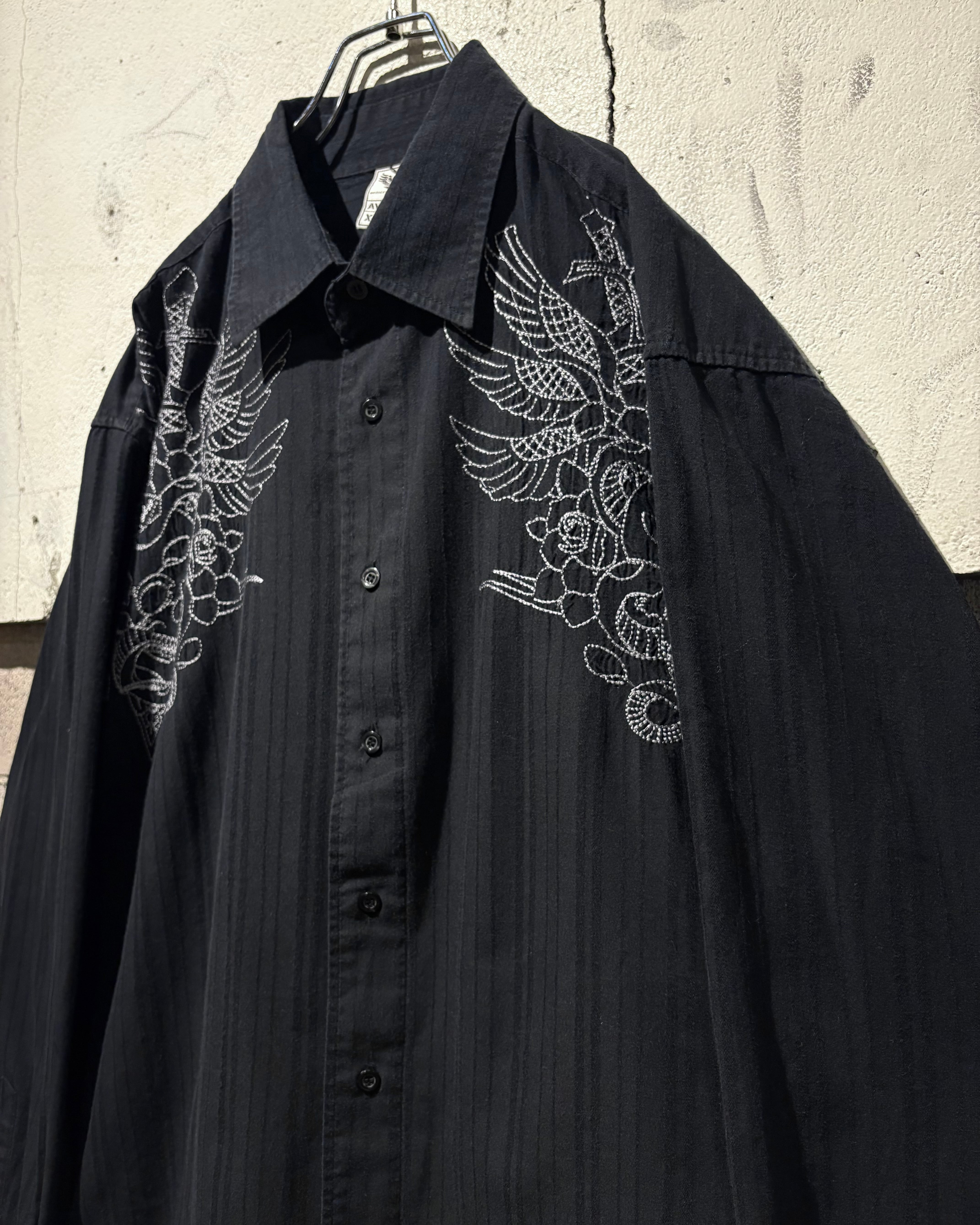 ストライプのボディをベースに、フロント両肩にはスカルやダガー、薔薇、翼などを組み合わせたアメトラタトゥーモチーフの刺繍を刻んだ1着。