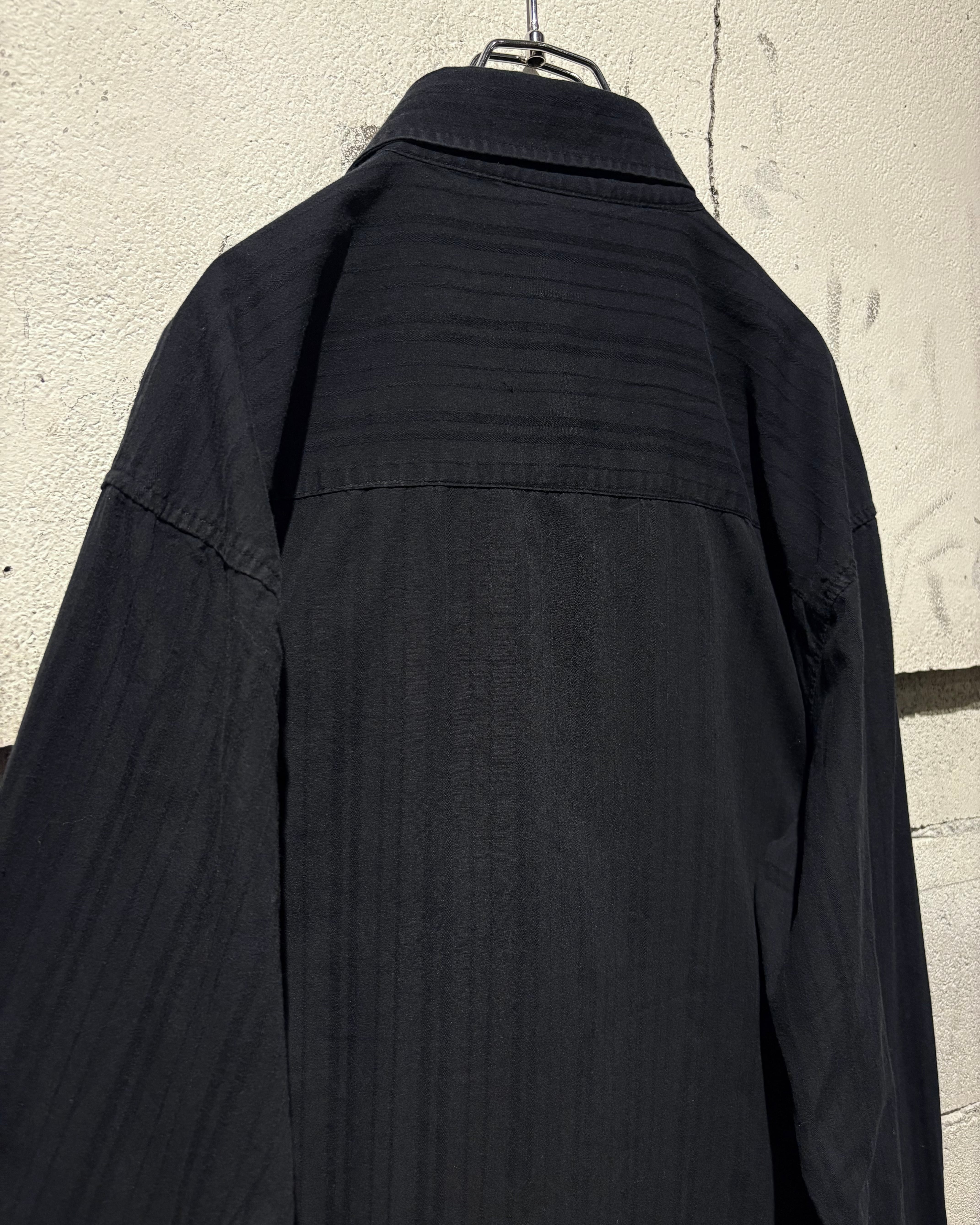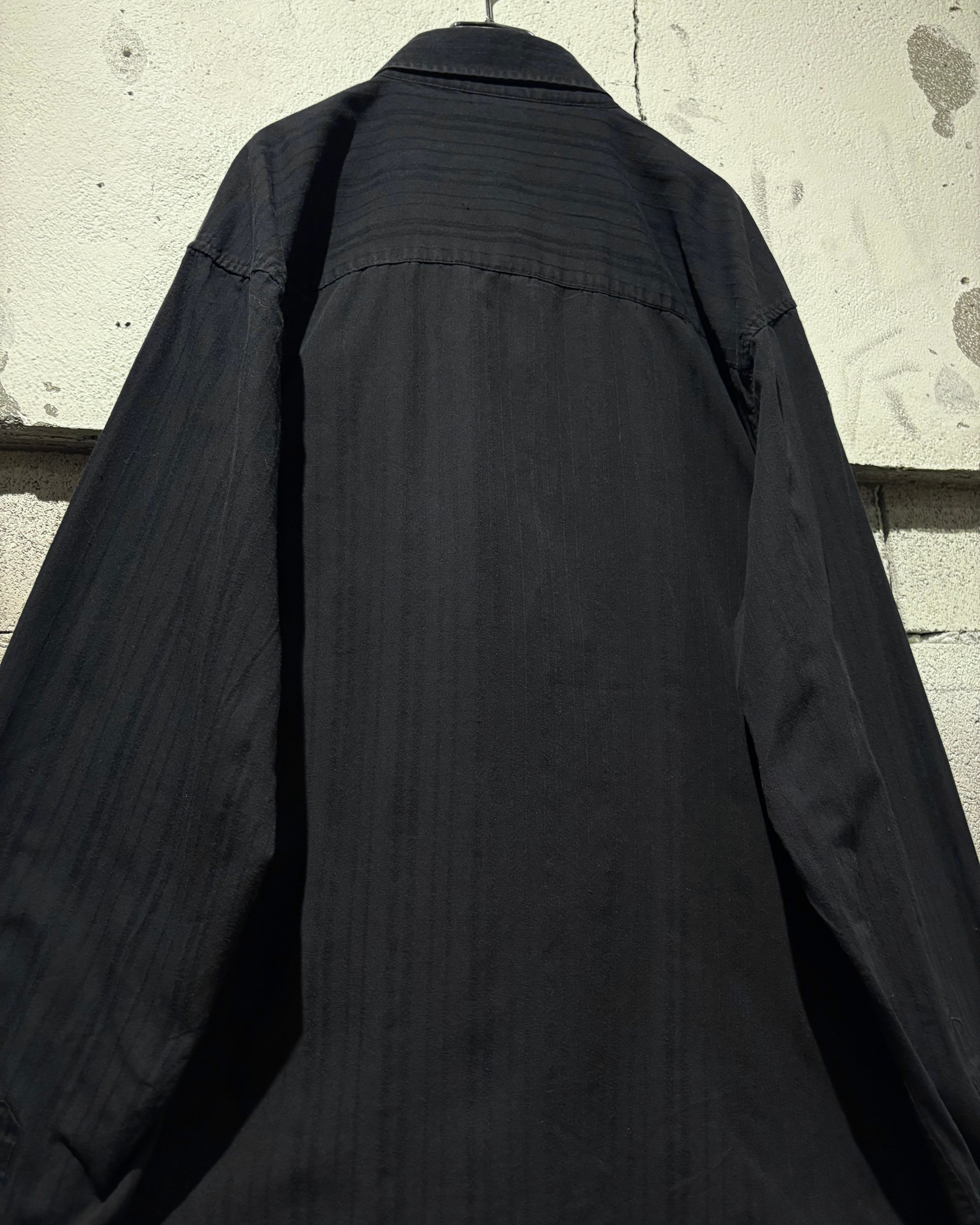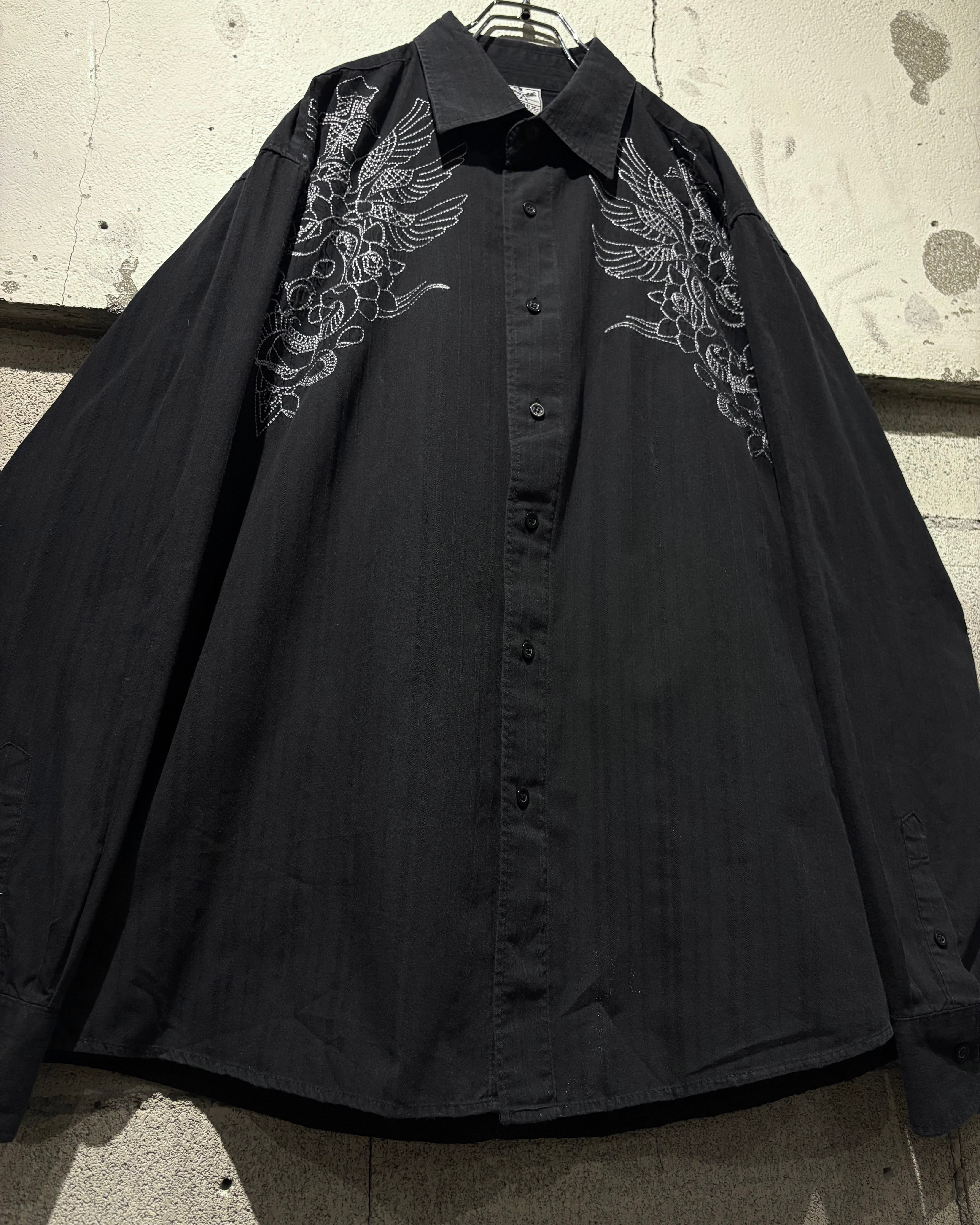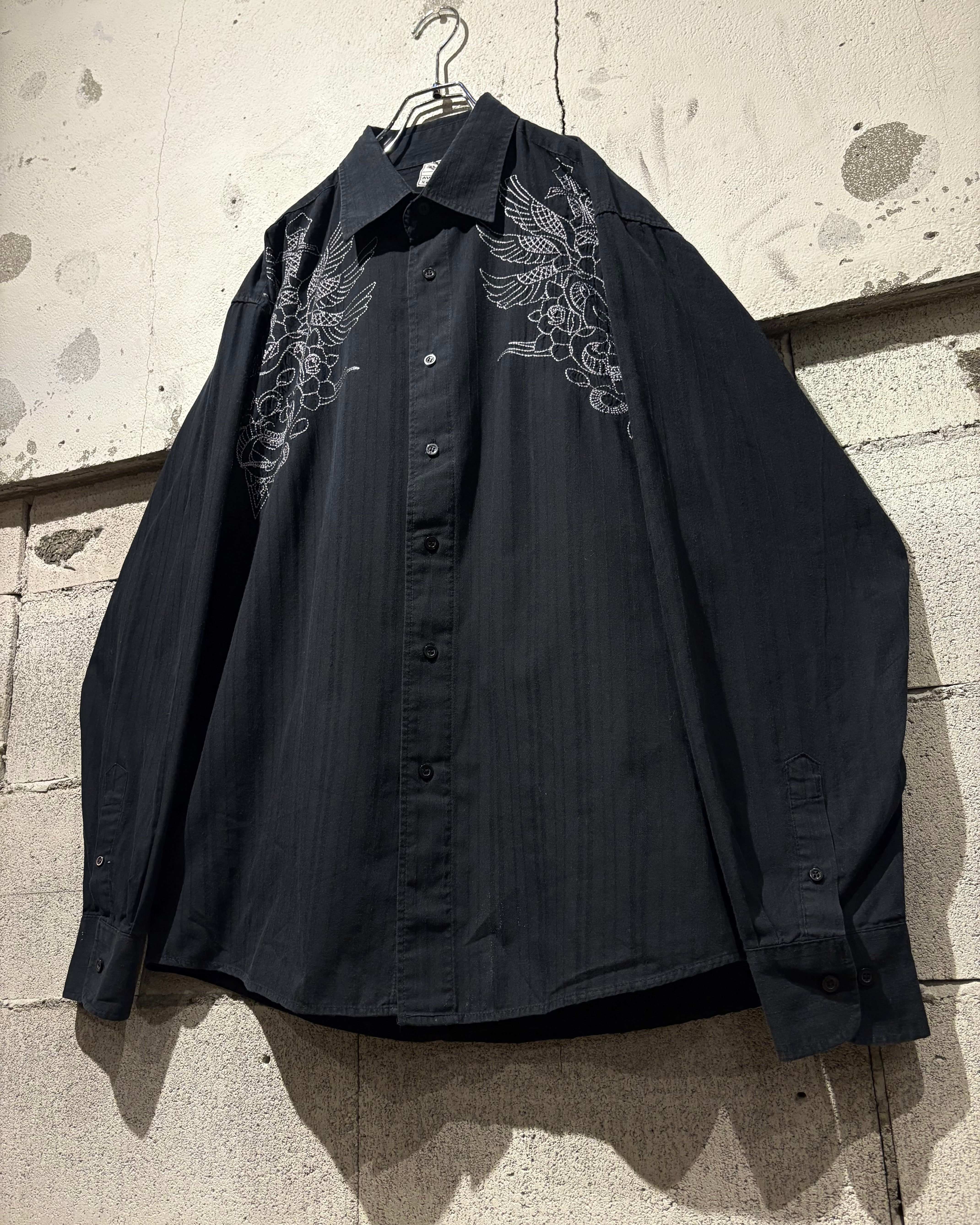 ストライプのボディをベースに、フロント両肩にはスカルやダガー、薔薇、翼などを組み合わせたアメトラタトゥーモチーフの刺繍を刻んだ1着。
