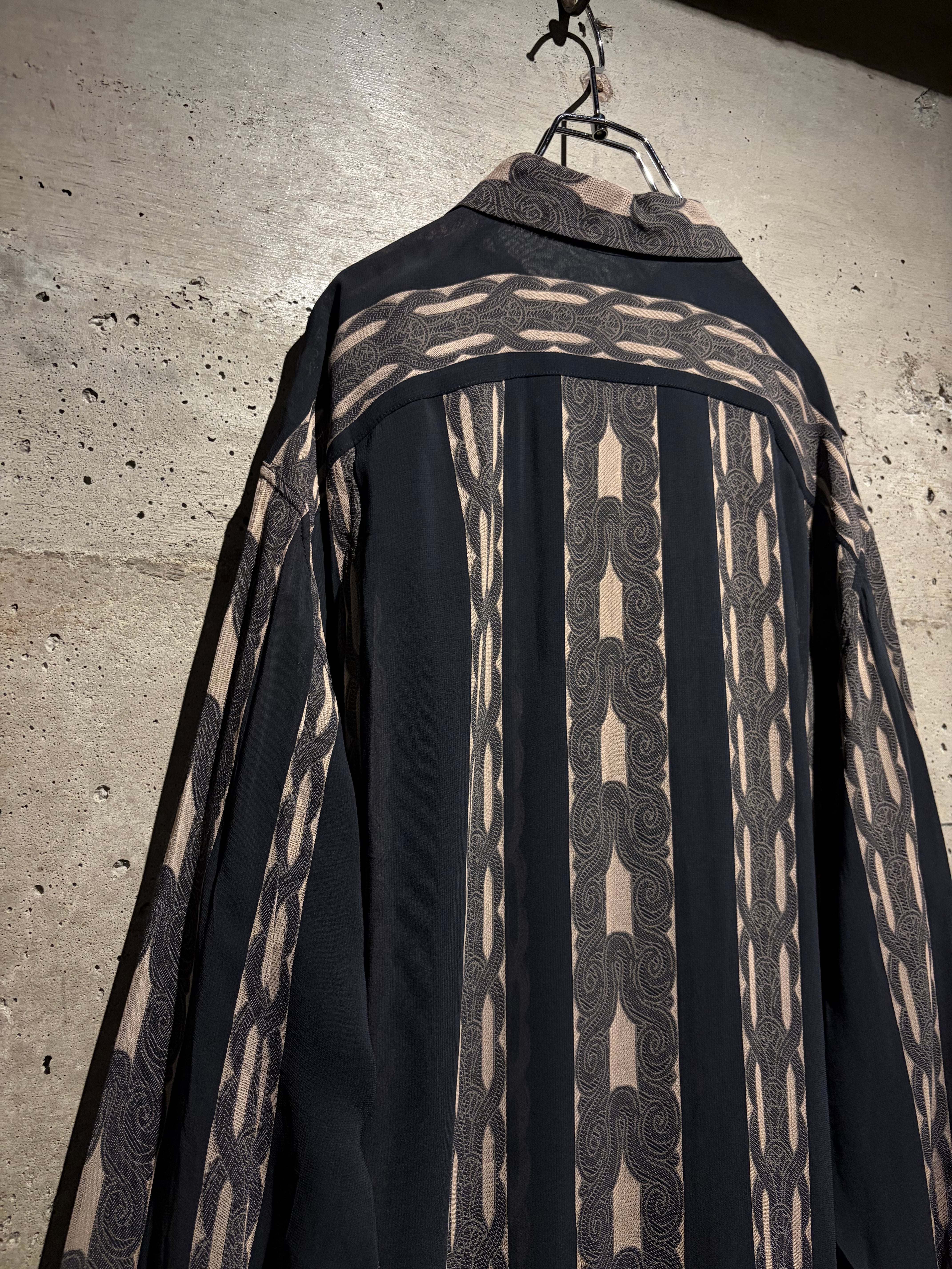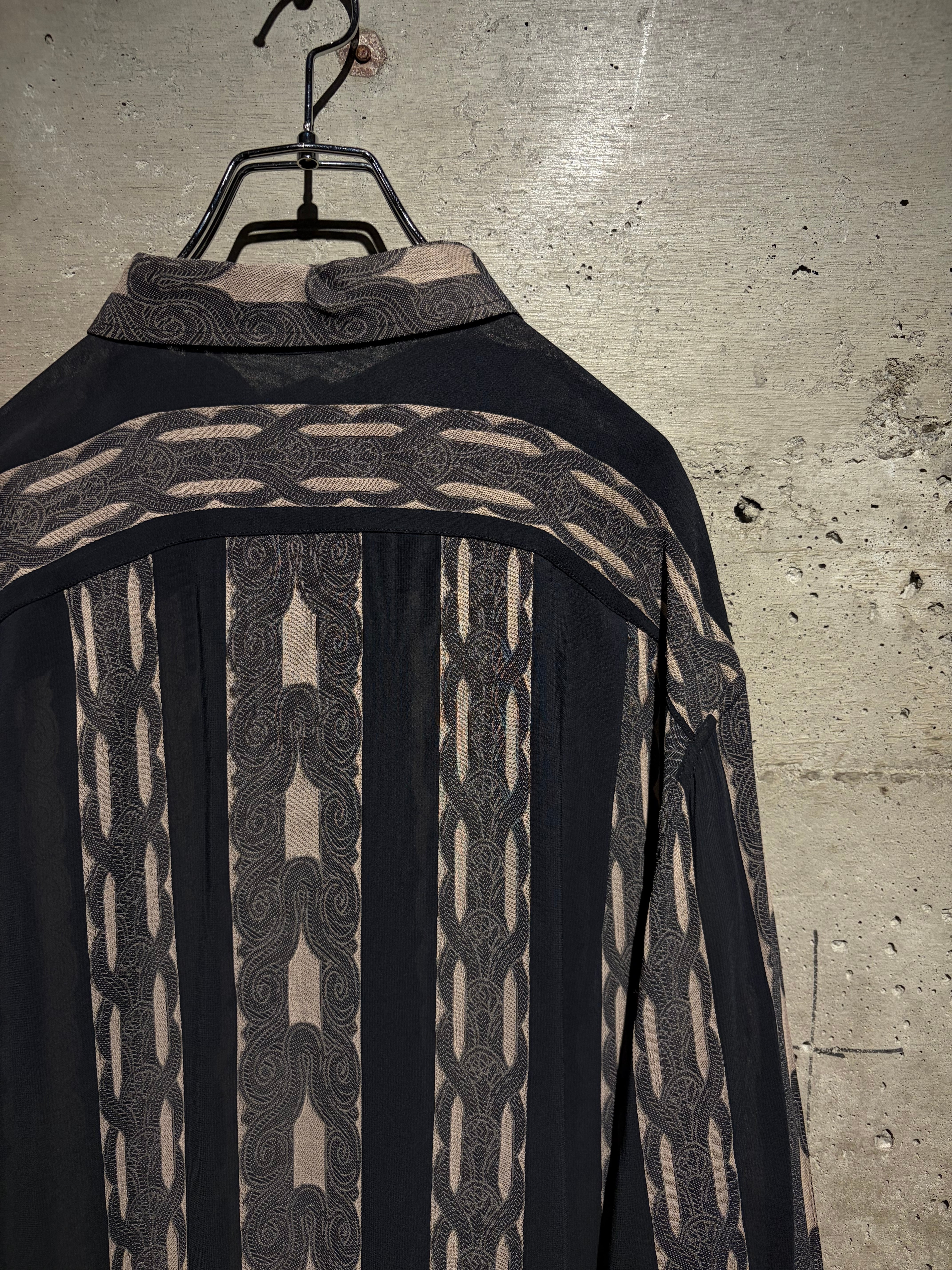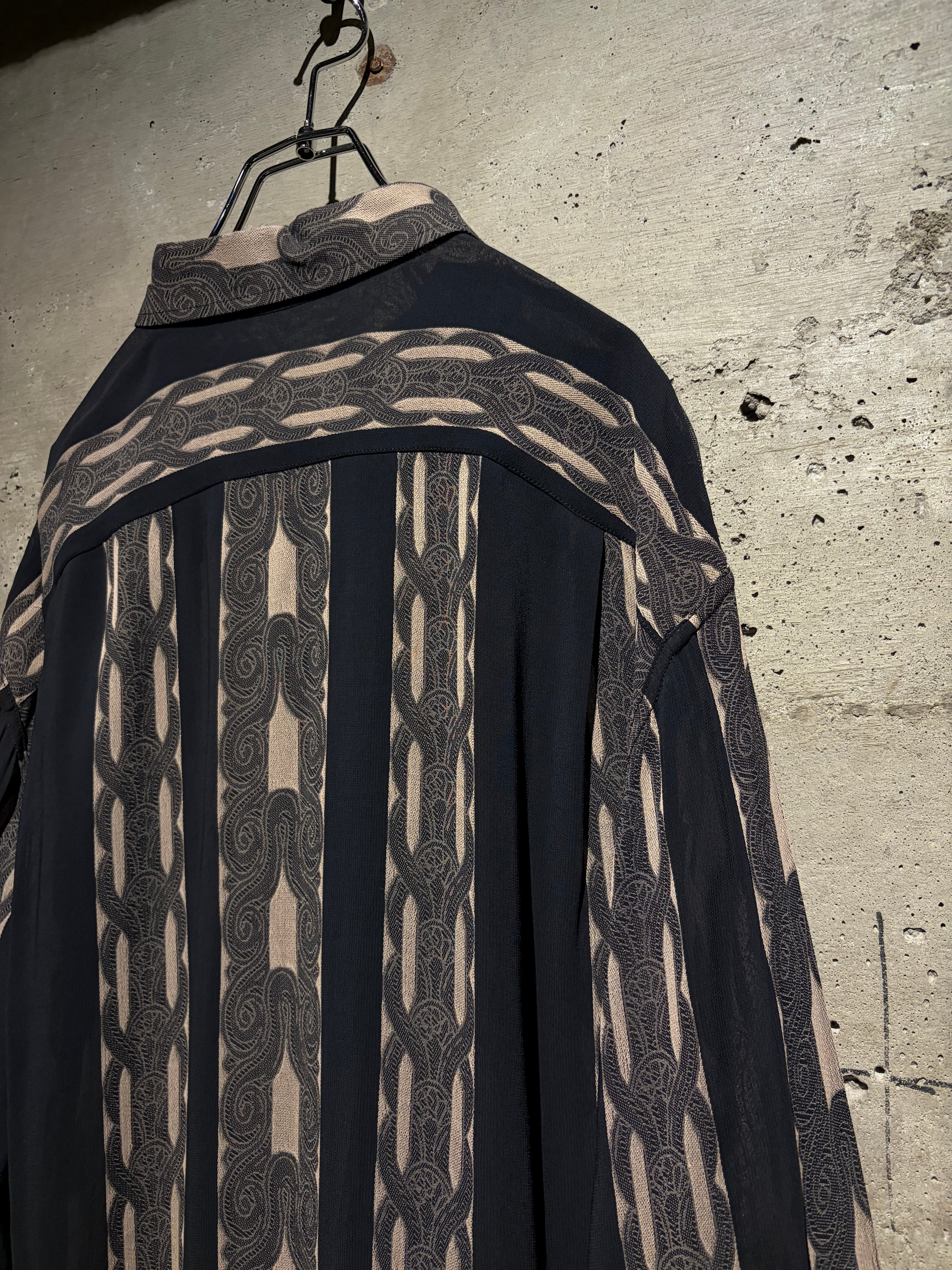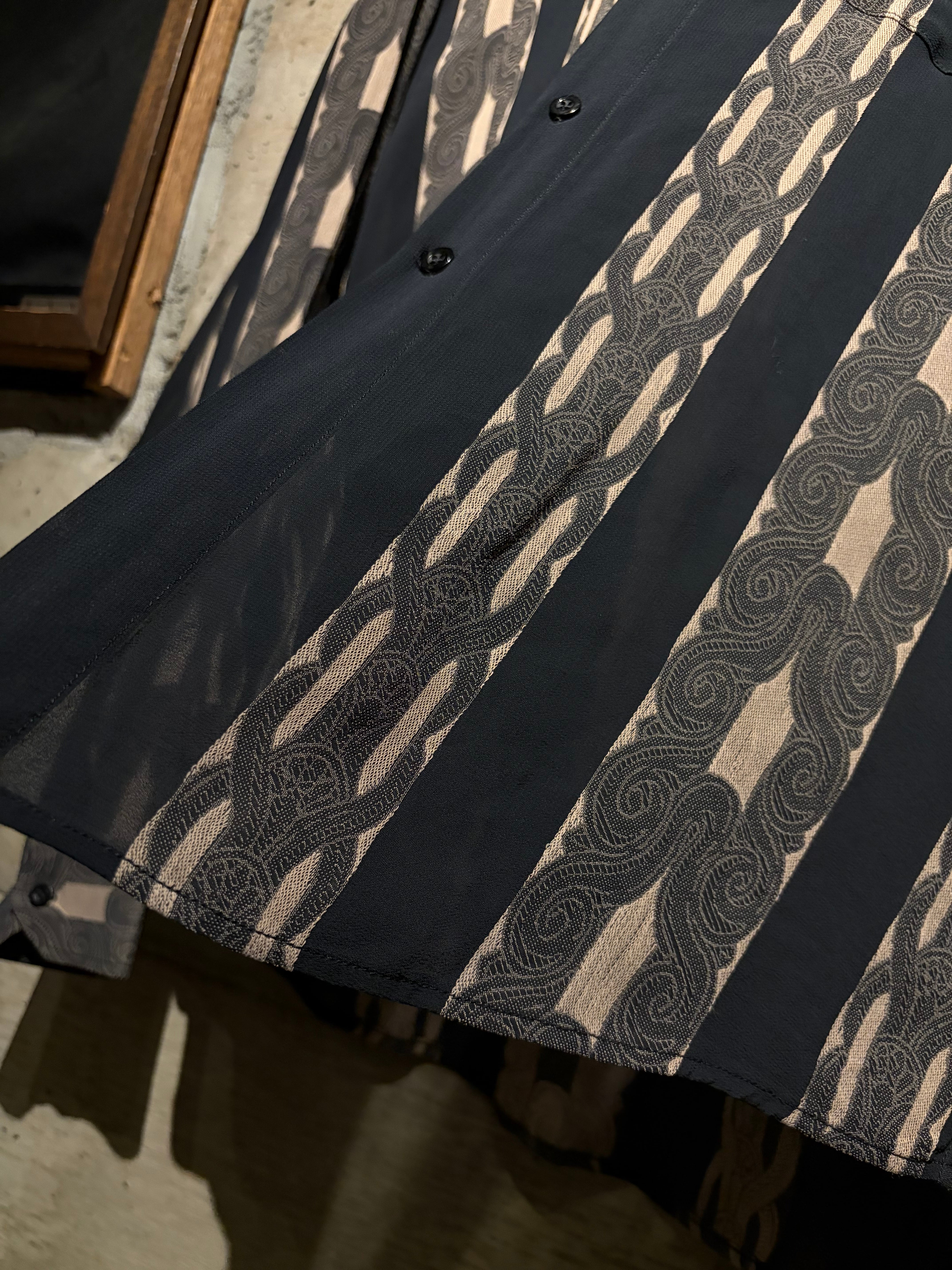 透け感のあるシアー生地をボディに使用し、トライバルなニュアンスを感じさせる織り柄をストライプ状に切り替えた1着。