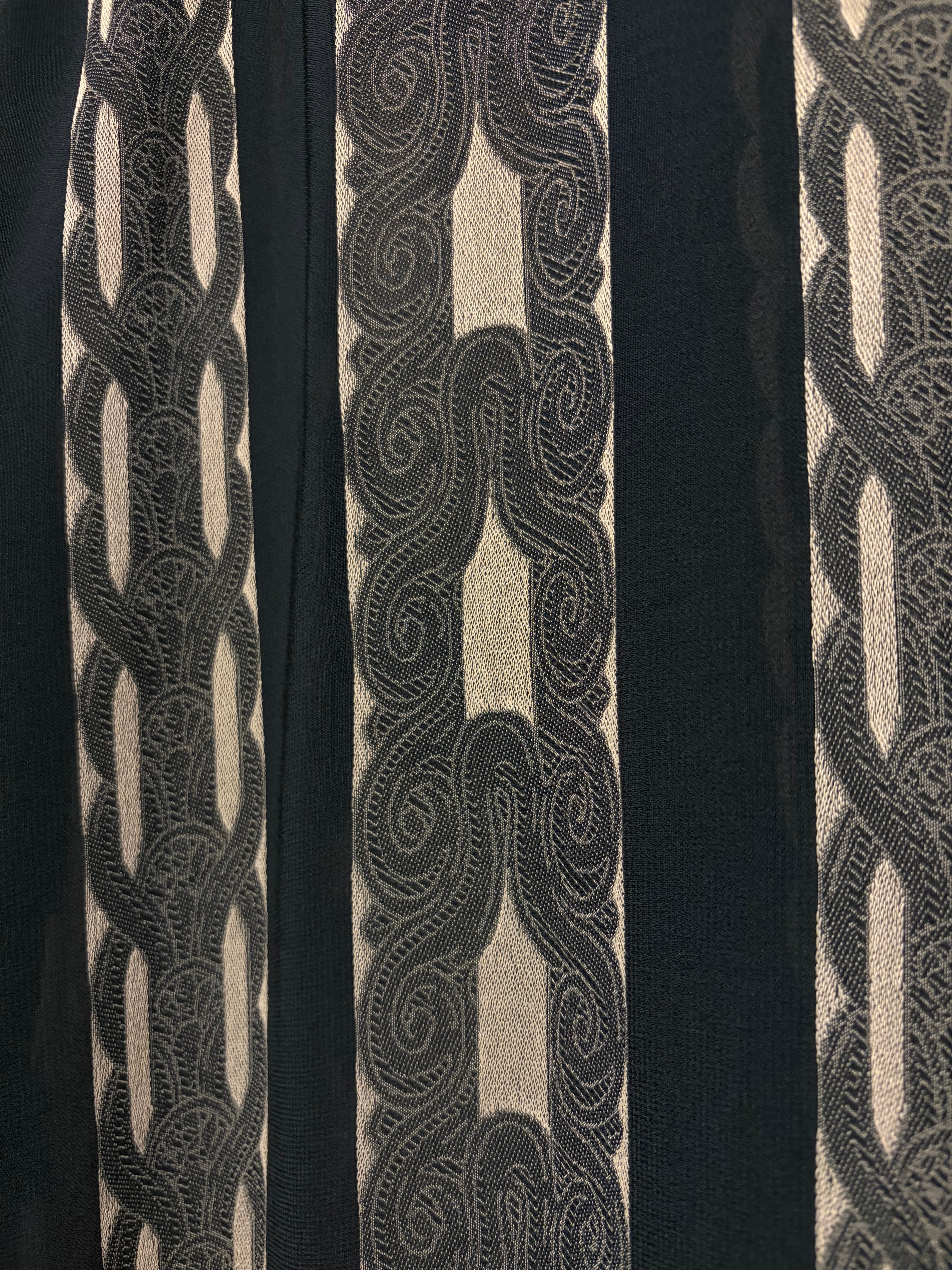 ベージュ、グレーの細やかに表現された柄模様にブラックシアーの透け感が重なり、奥行きと独特な表情を演出。唯一無二感のある表情に仕上げられています。