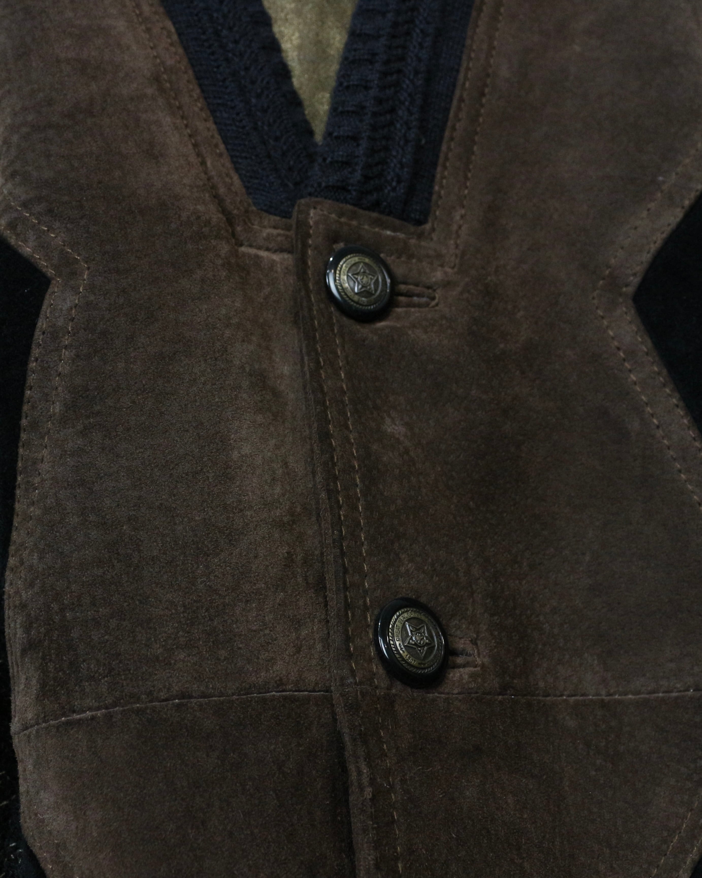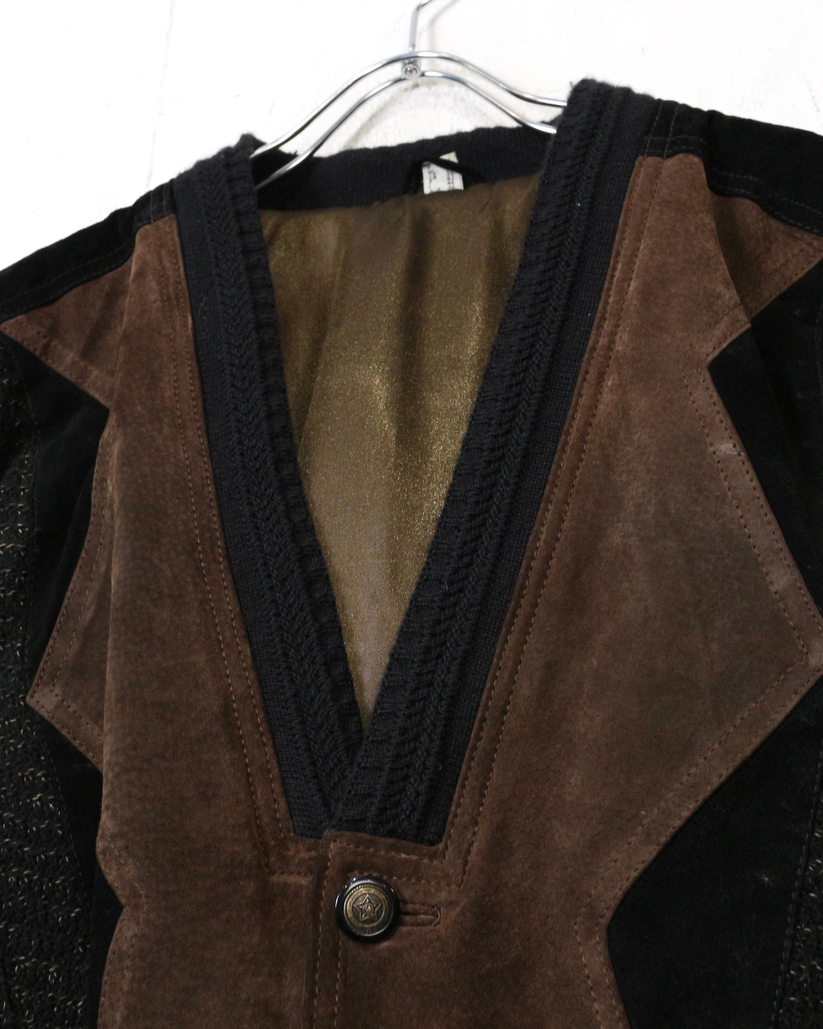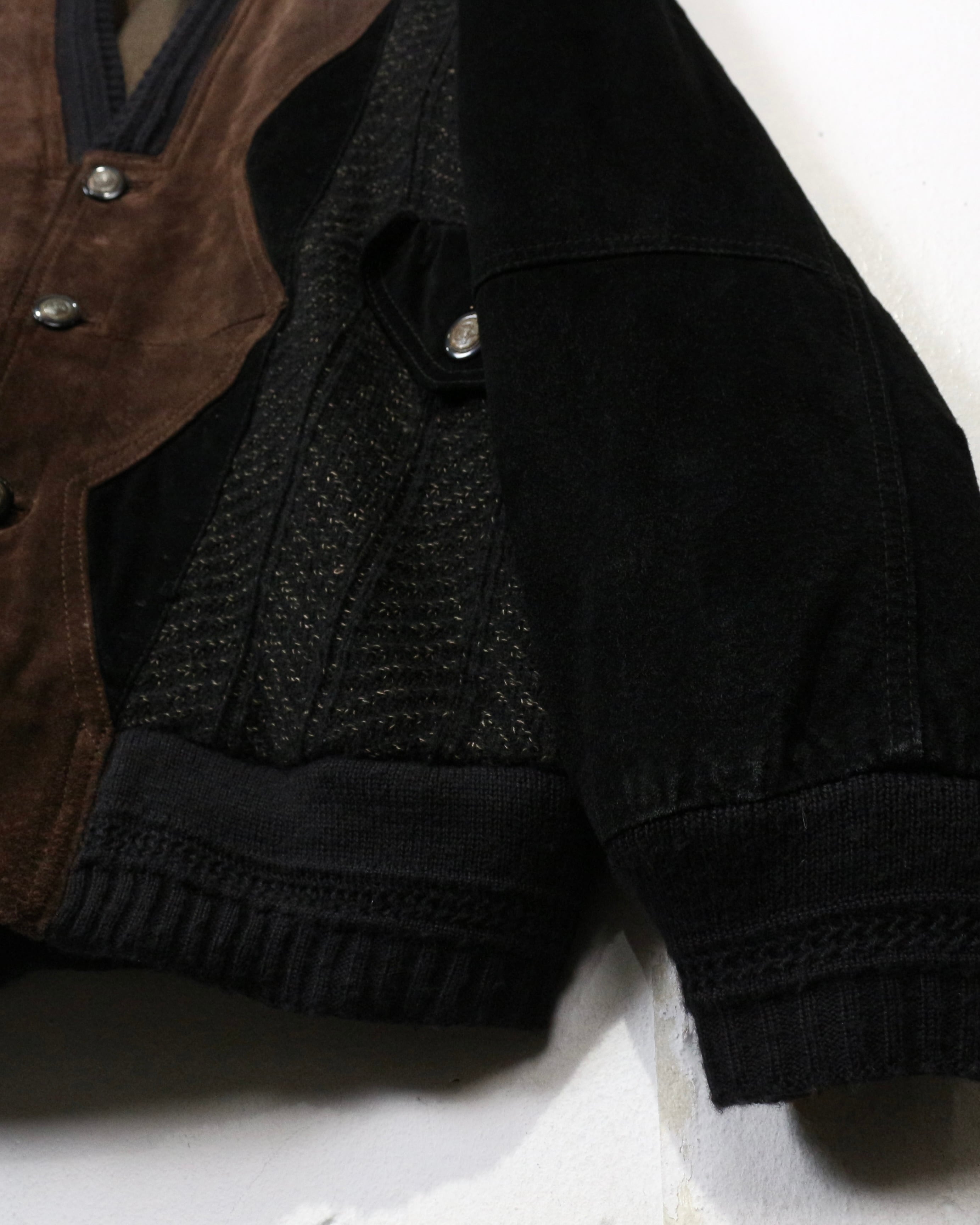 メランジニットをベースに、フロントへ大胆にブラウンのスエードをジグザグ状に切り替えたデザインが目を引く1着。