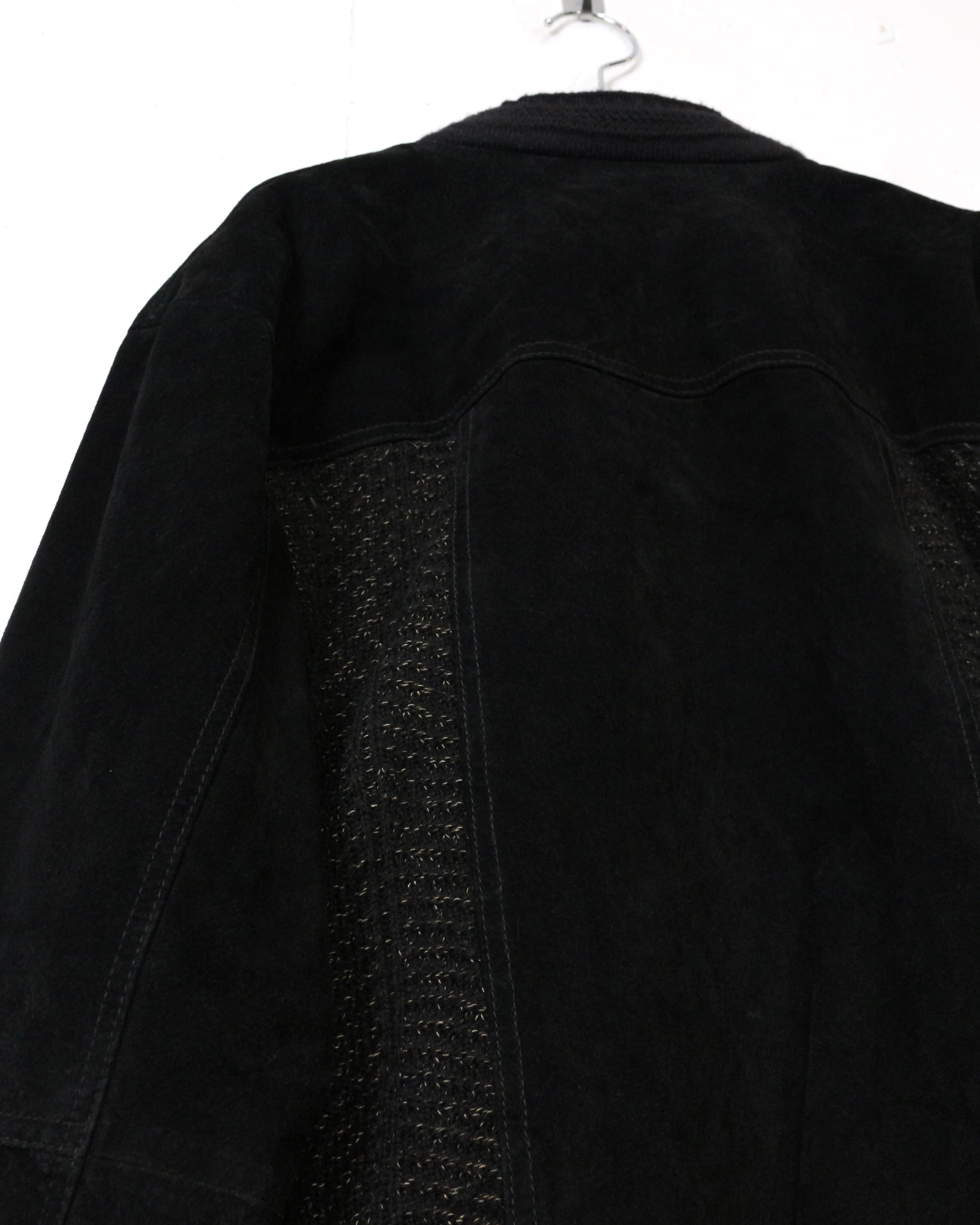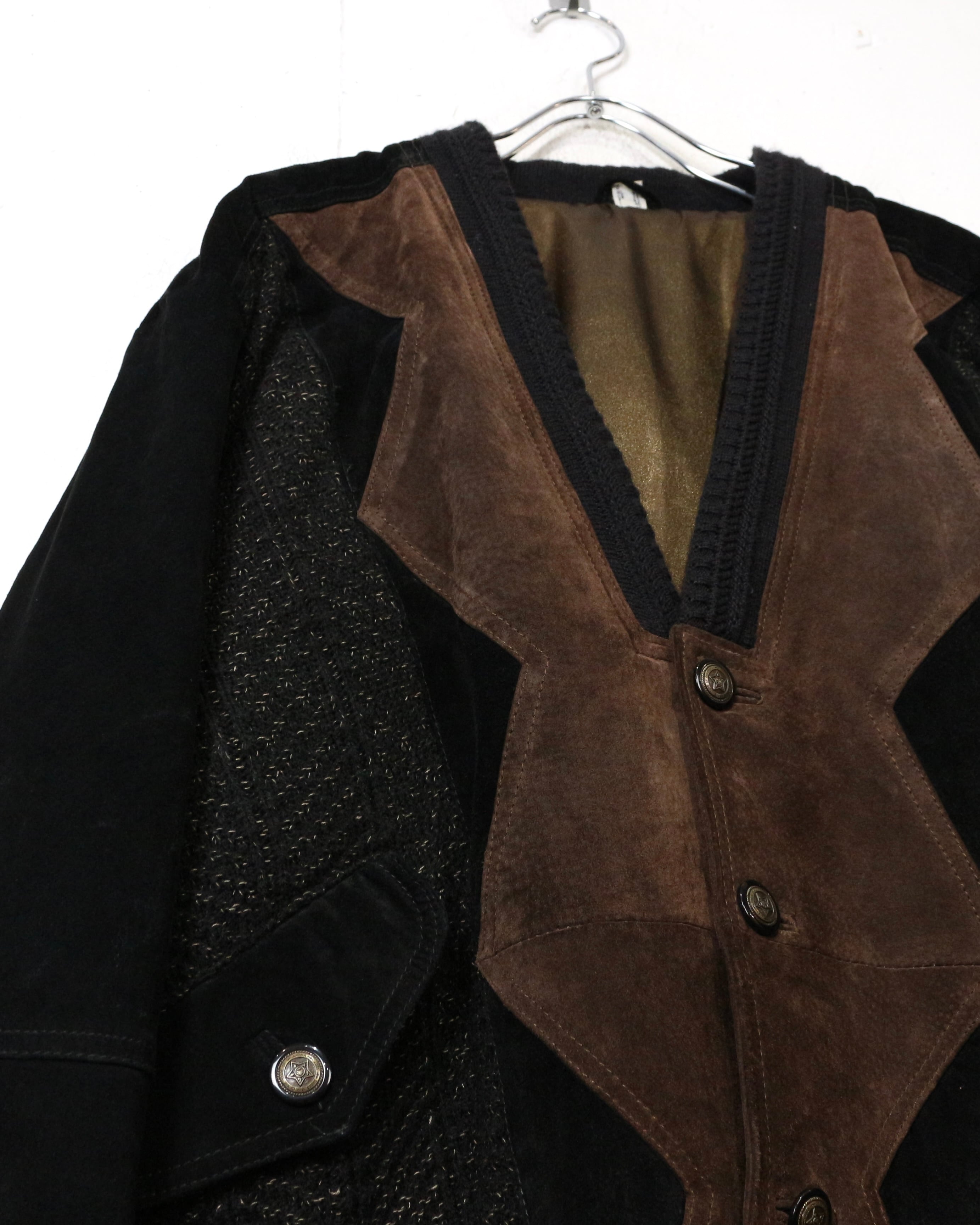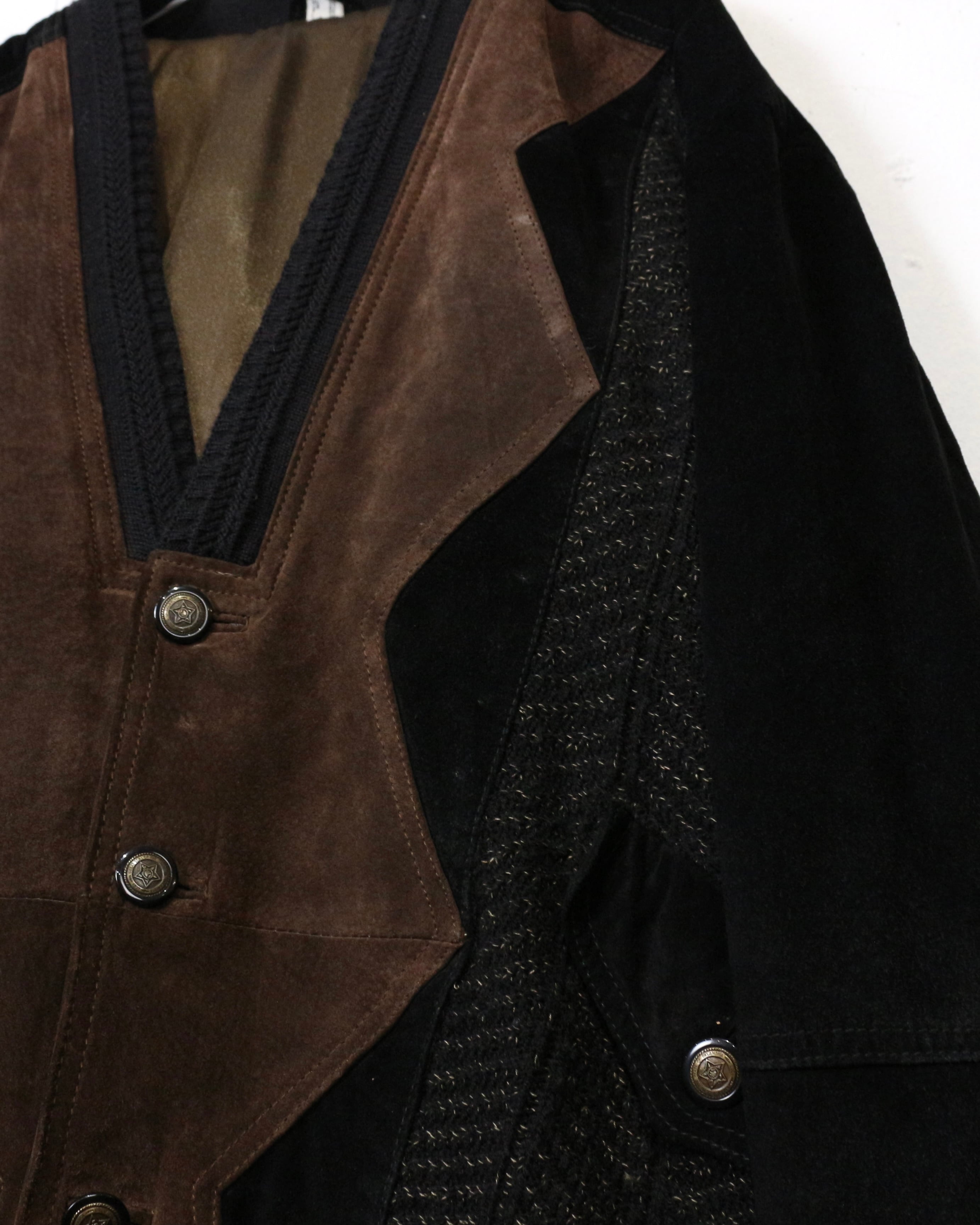 肩からアーム、背面中央にはブラックのスエードを切り替え、2色のレザー使いと非常に贅沢な仕上がり。デザインの効いたボタン使いも素晴らしく、細部まで作り込まれたディテールも魅力です。
