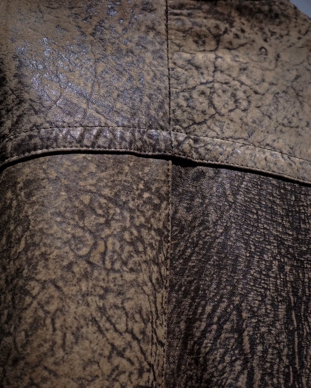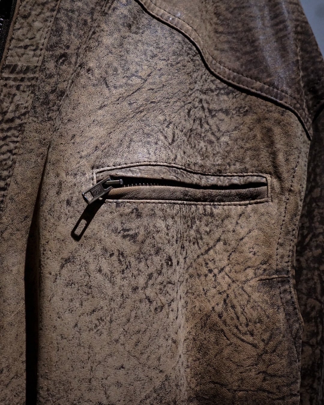 ボディにはエイジングによって浮かび上がった独特のムラとひび割れのような表情を纏った柔らかい質感のレザー。ブラウンをベースにブラックが滲むように広がる色味は、無骨でありながらどこかアートピースのような奥行きを持つ仕上がりでヴィンテージとしての色気をムンムンに感じます、、、