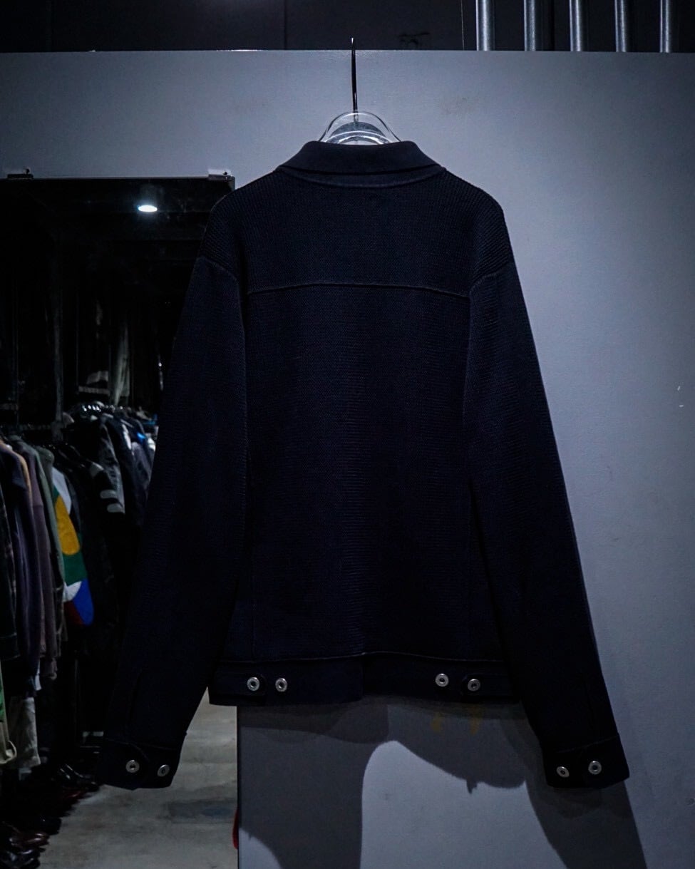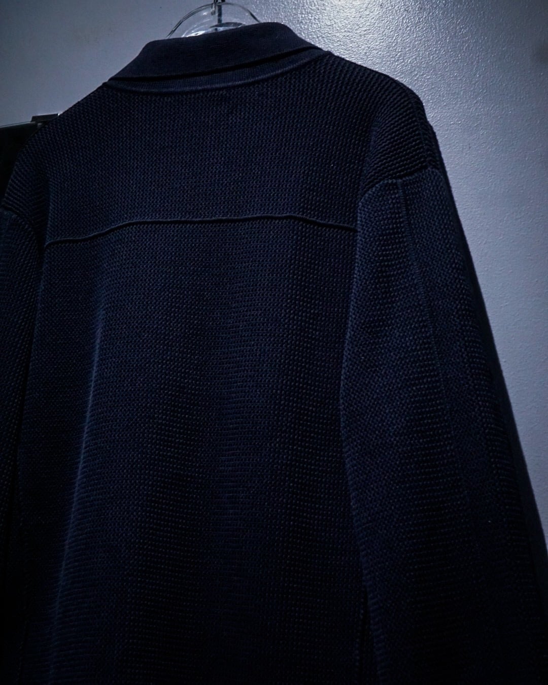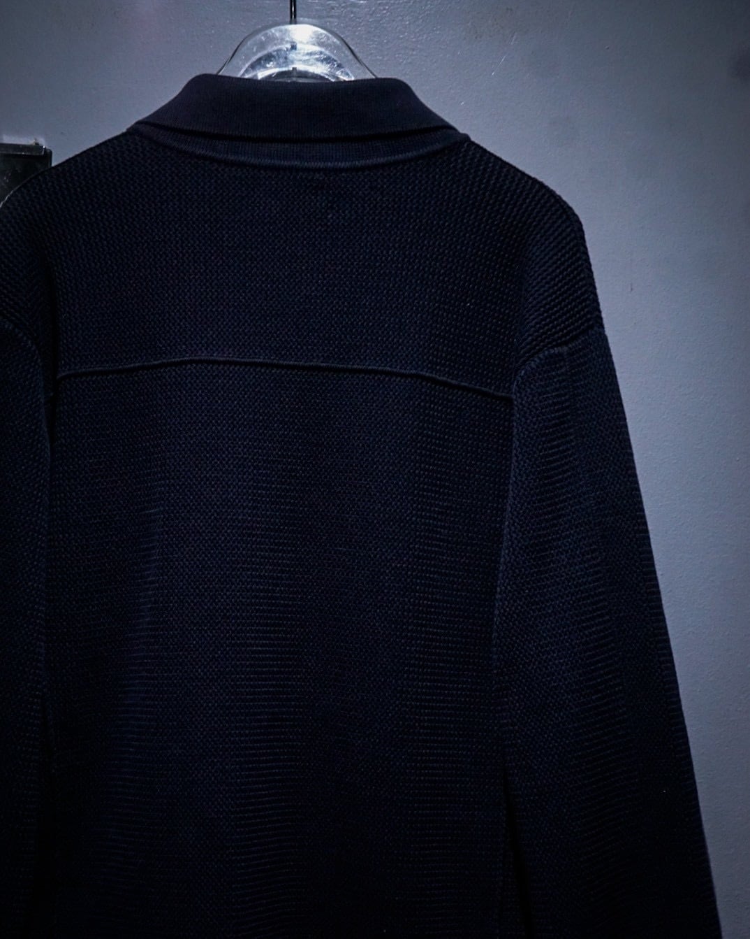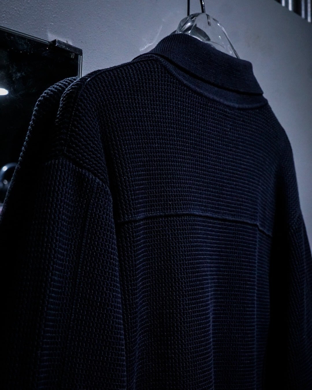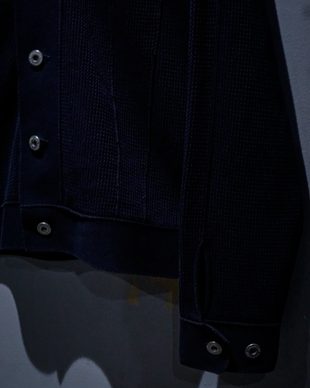 ベースはトラッカージャケットを踏襲しつつ、ファブリックには立体感のある編み地のニットを採用。ネイビーで統一されたミニマルな佇まいの中に、編みの陰影による奥行きが生まれ、シンプルでありながらも確かな存在感を放つ仕上がりに。