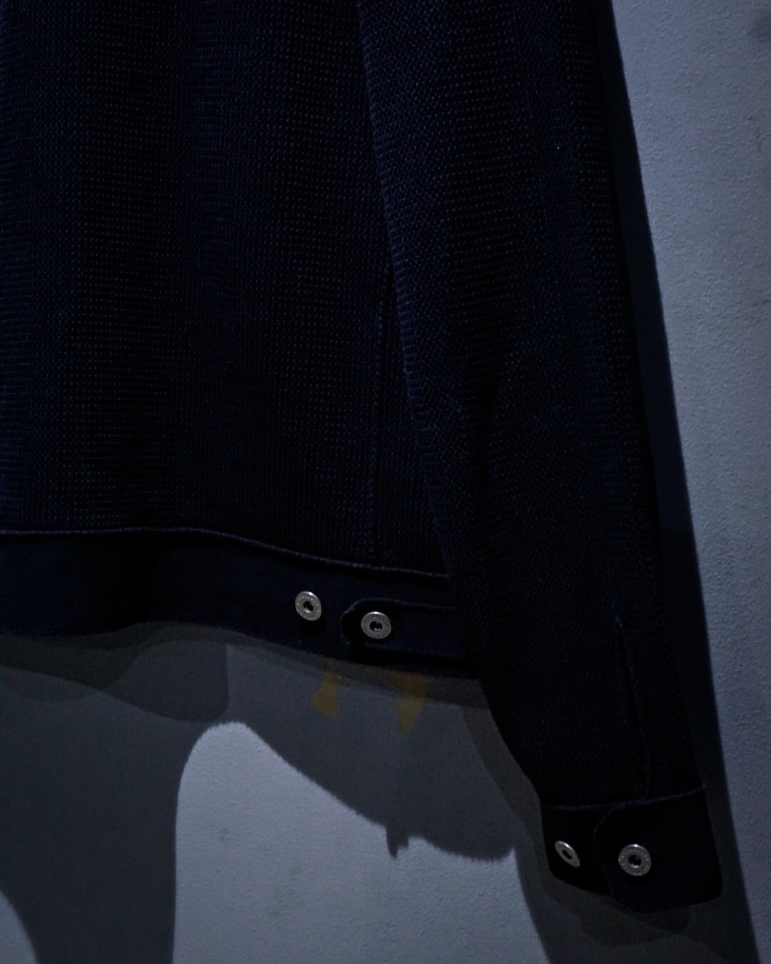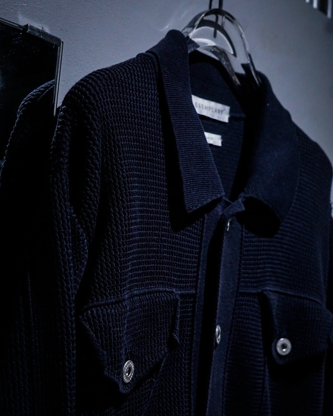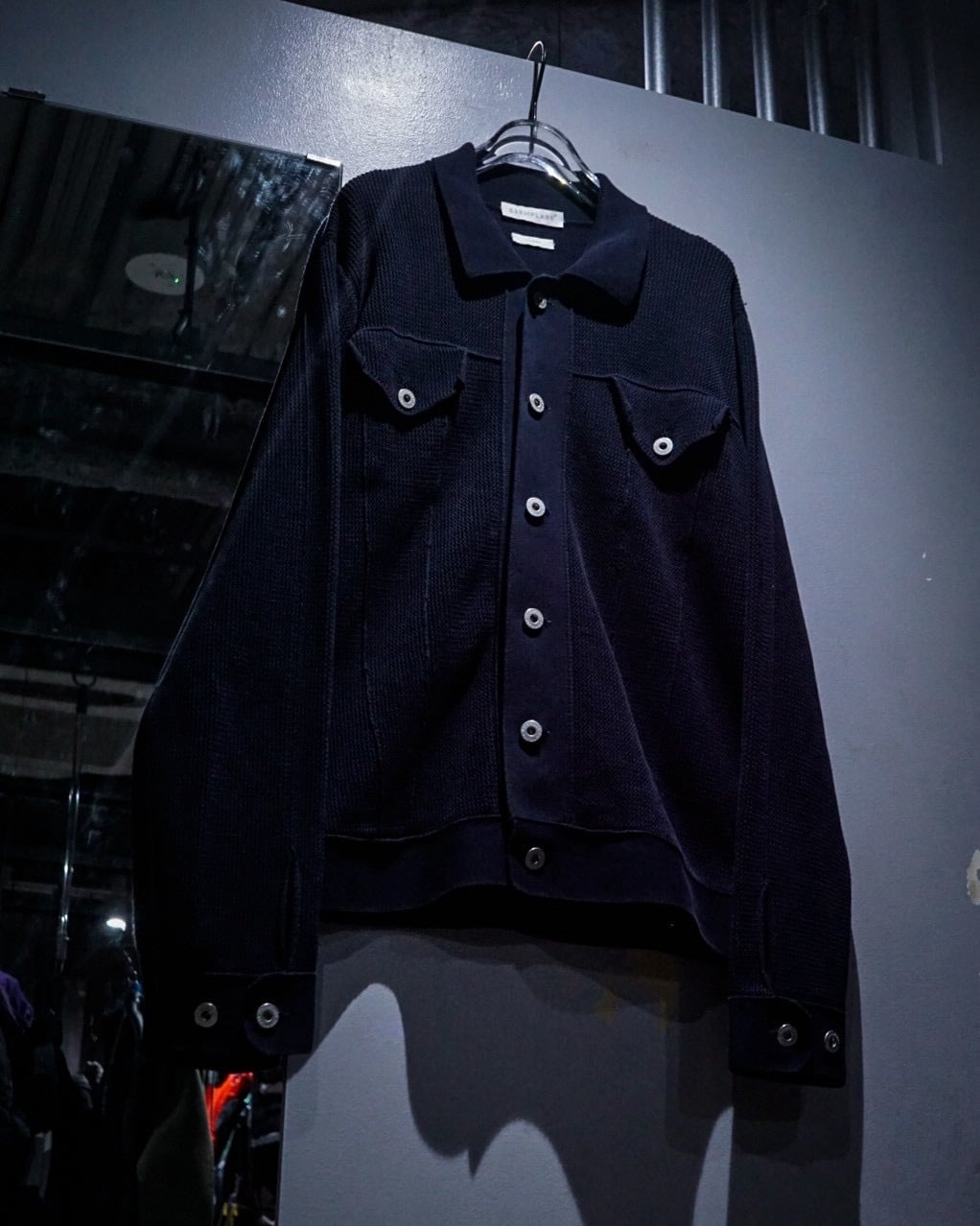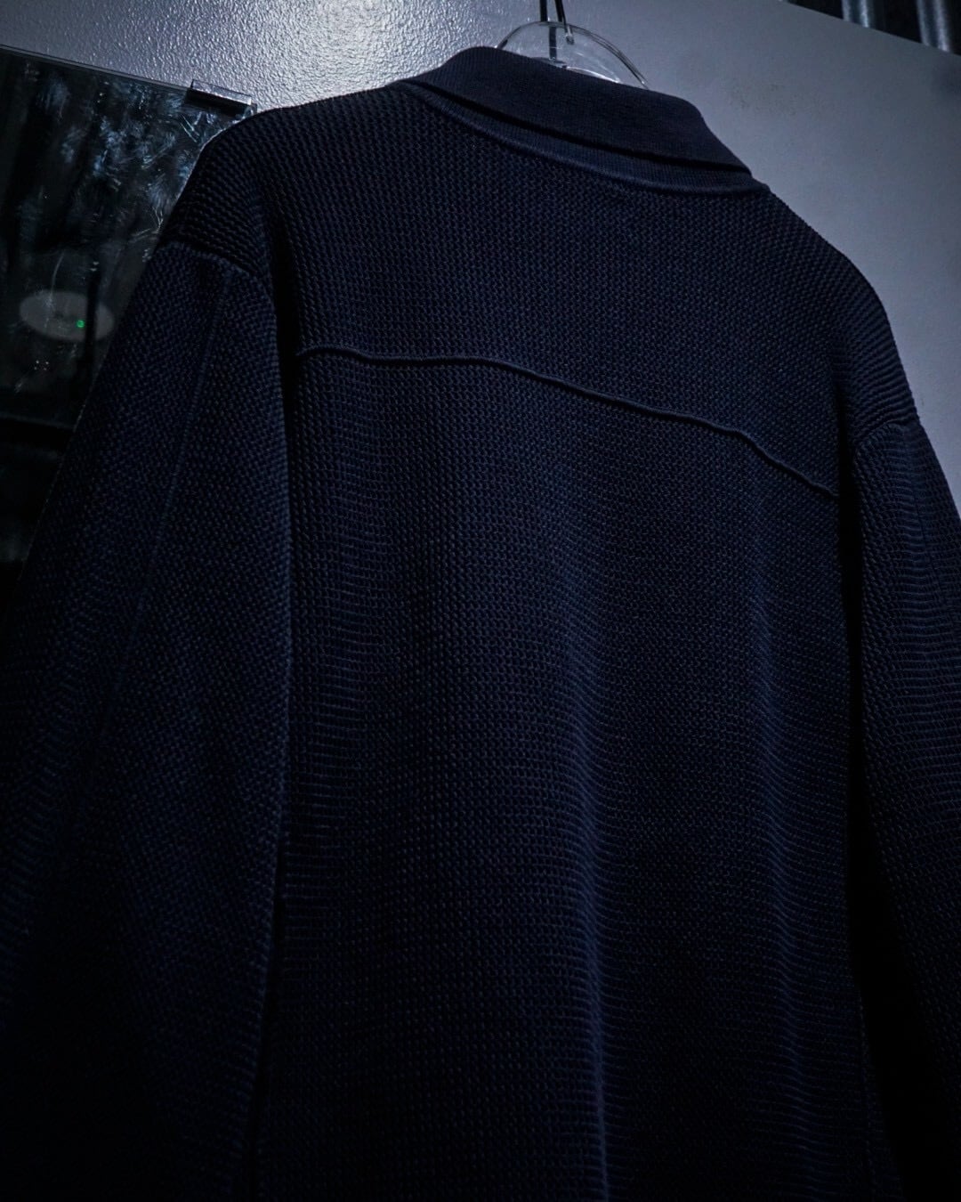 ベースはトラッカージャケットを踏襲しつつ、ファブリックには立体感のある編み地のニットを採用。ネイビーで統一されたミニマルな佇まいの中に、編みの陰影による奥行きが生まれ、シンプルでありながらも確かな存在感を放つ仕上がりに。