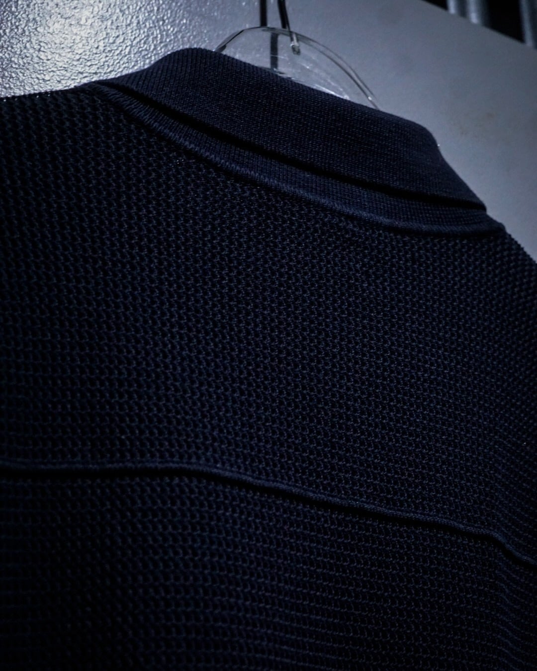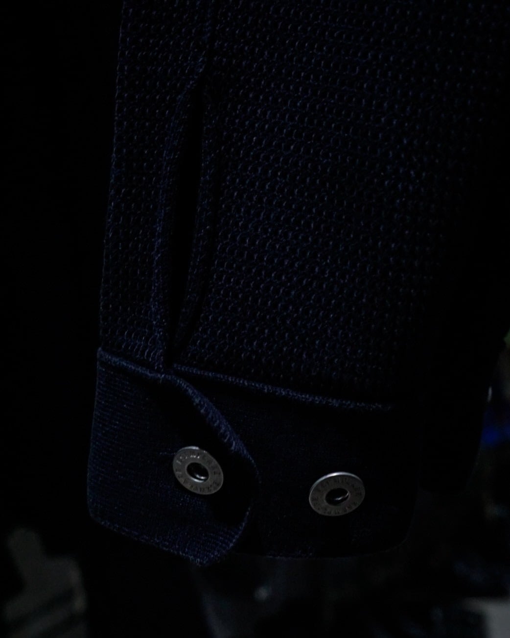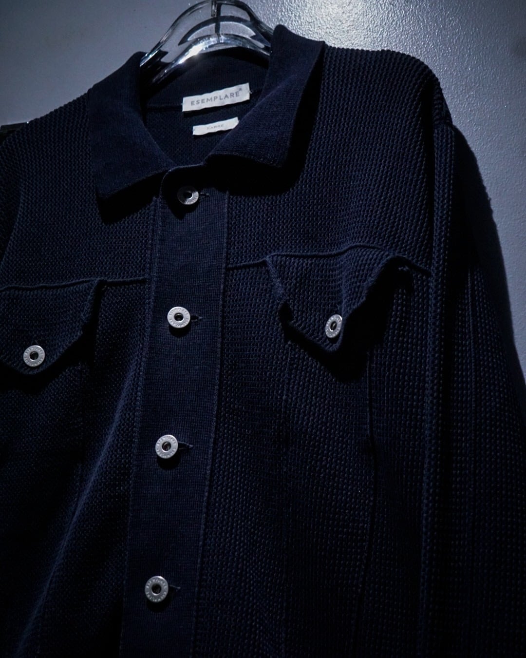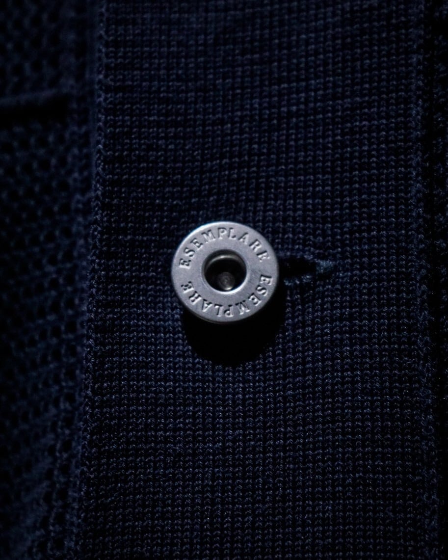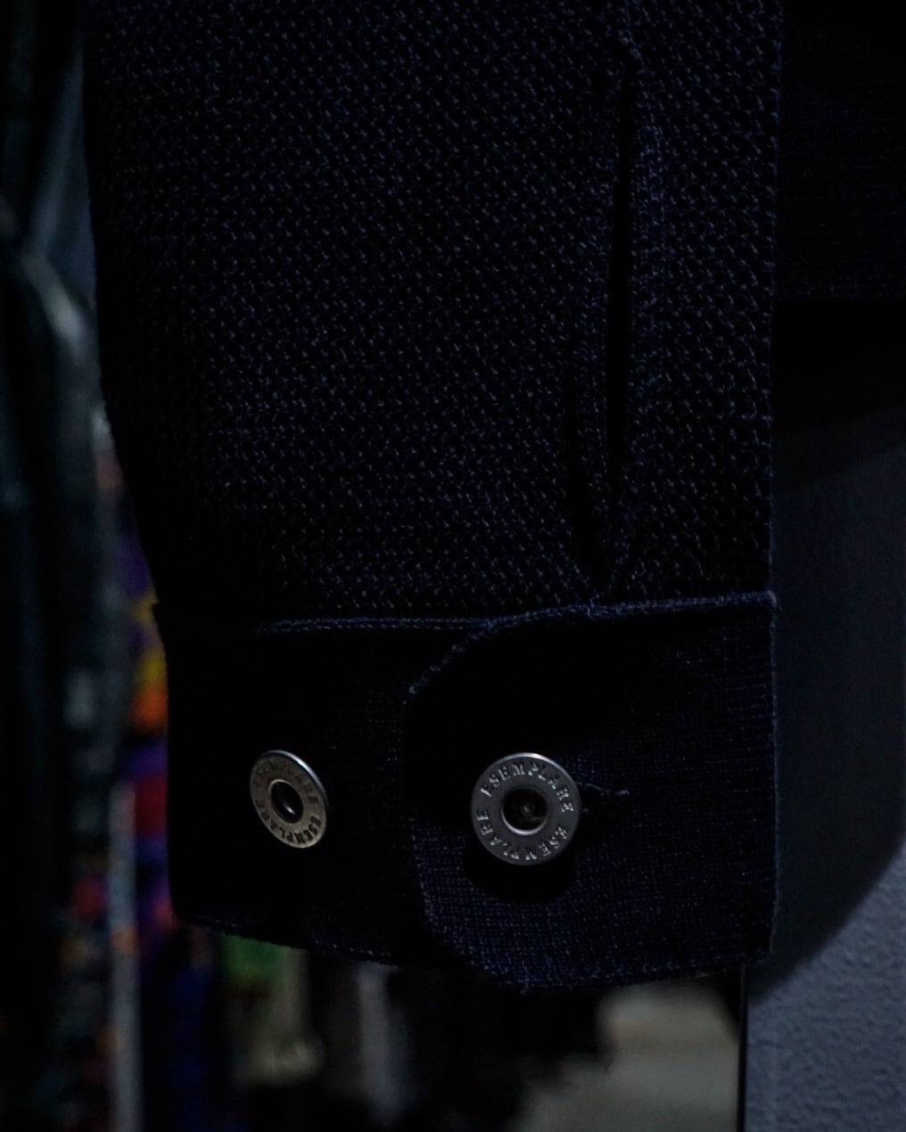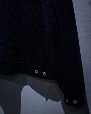 ベースはトラッカージャケットを踏襲しつつ、ファブリックには立体感のある編み地のニットを採用。ネイビーで統一されたミニマルな佇まいの中に、編みの陰影による奥行きが生まれ、シンプルでありながらも確かな存在感を放つ仕上がりに。