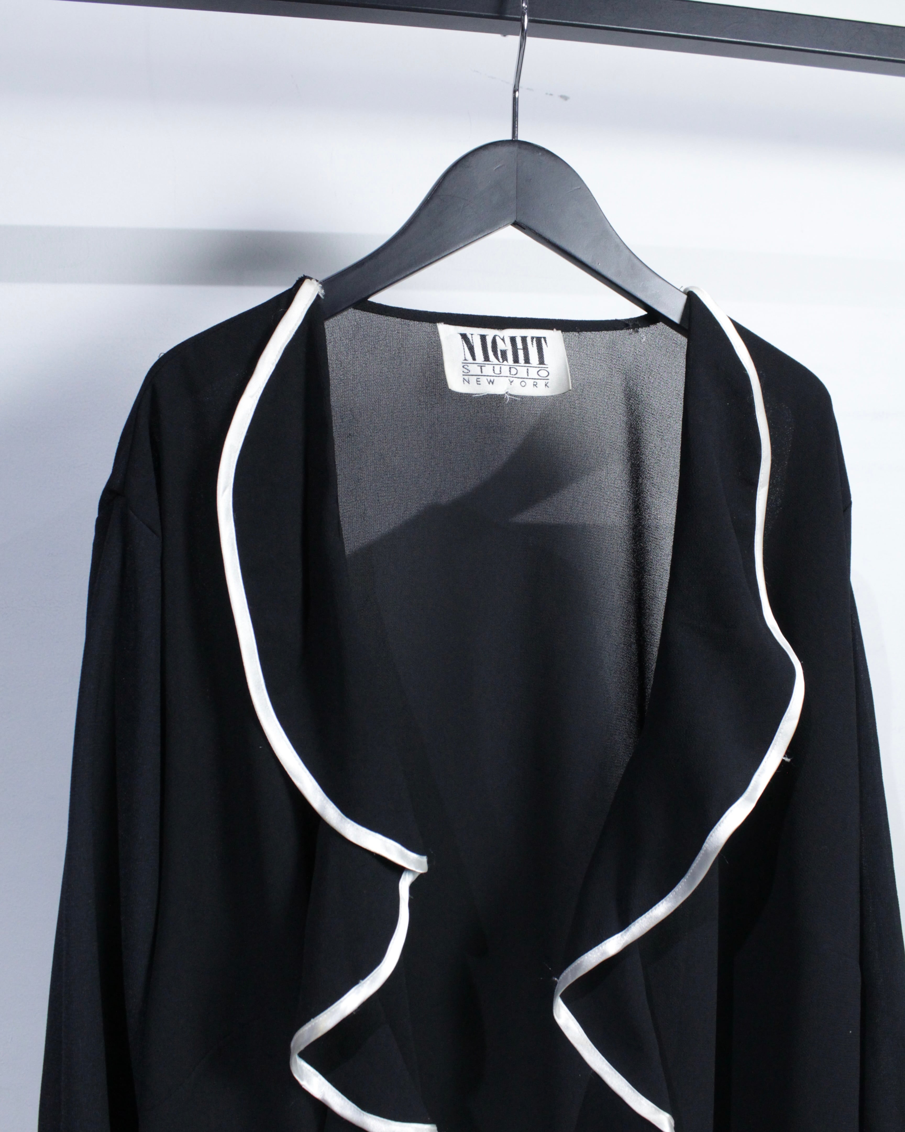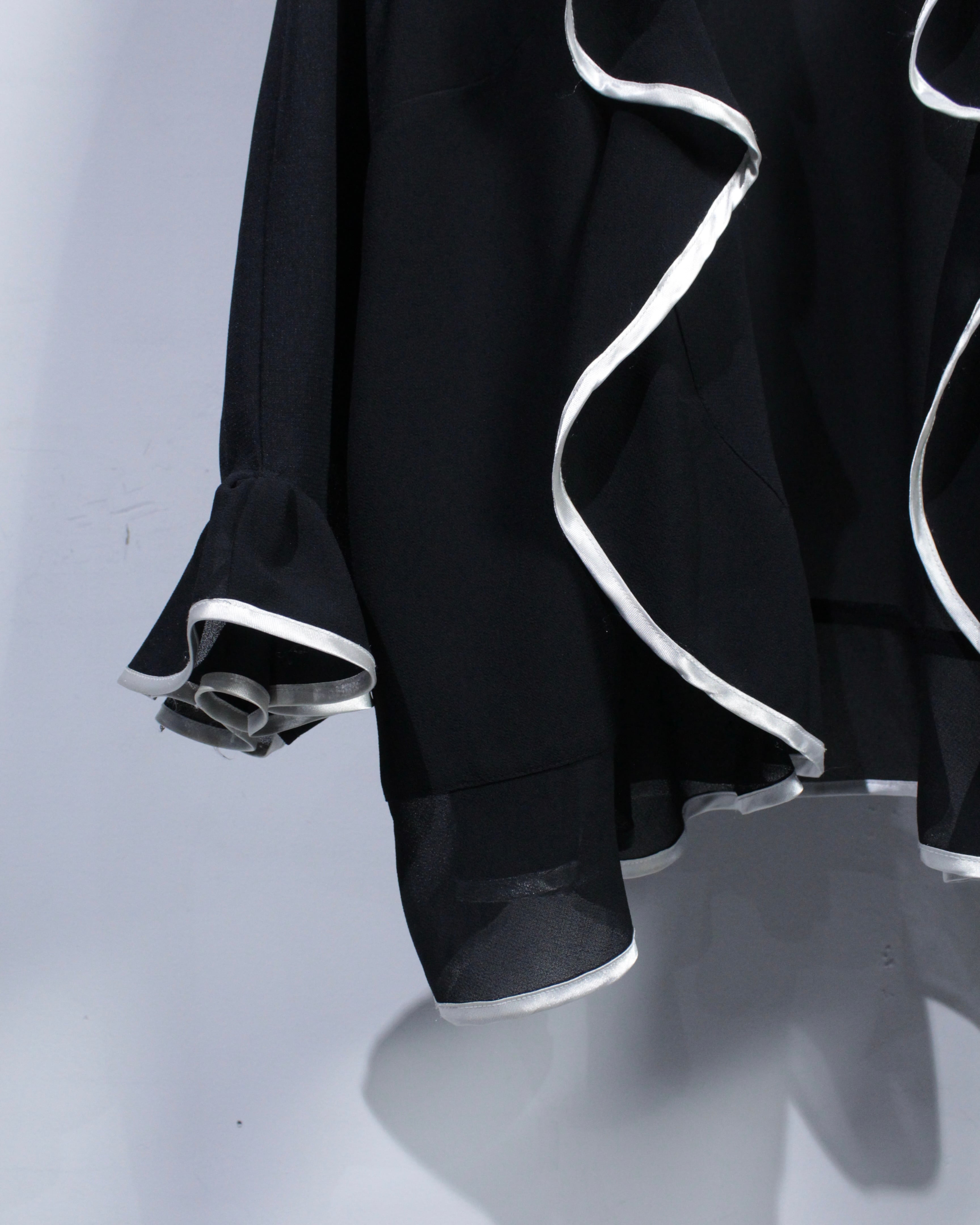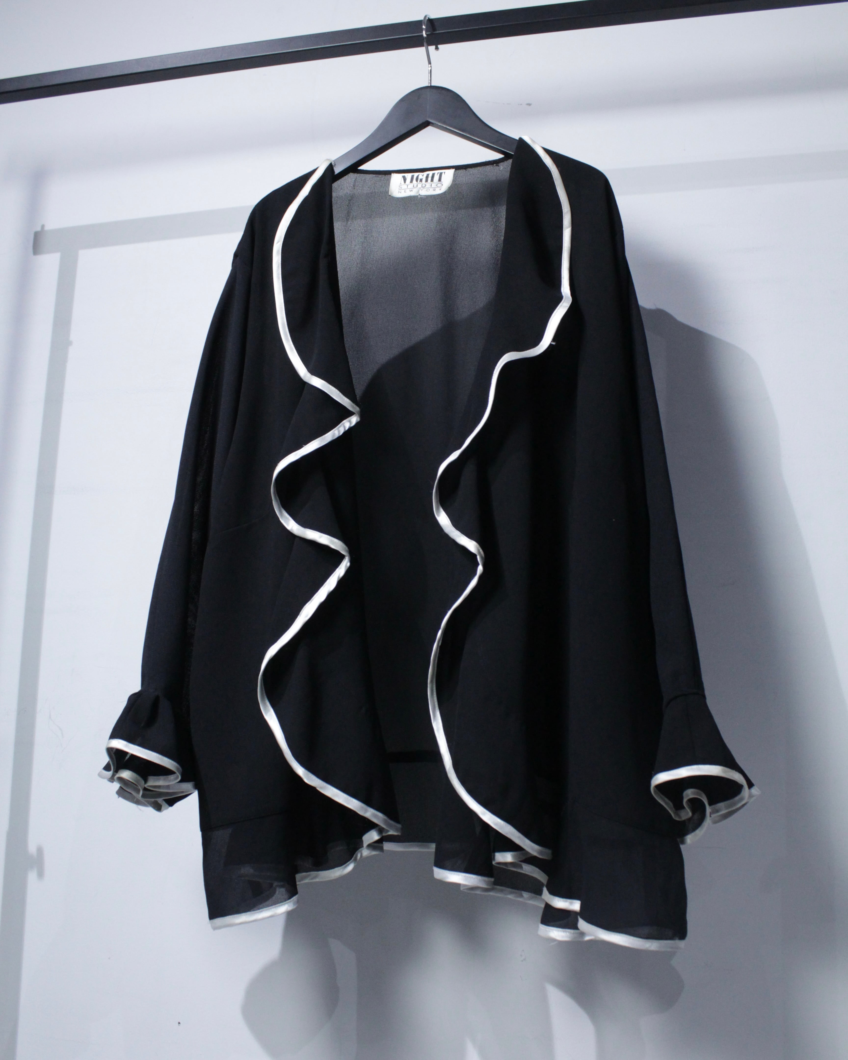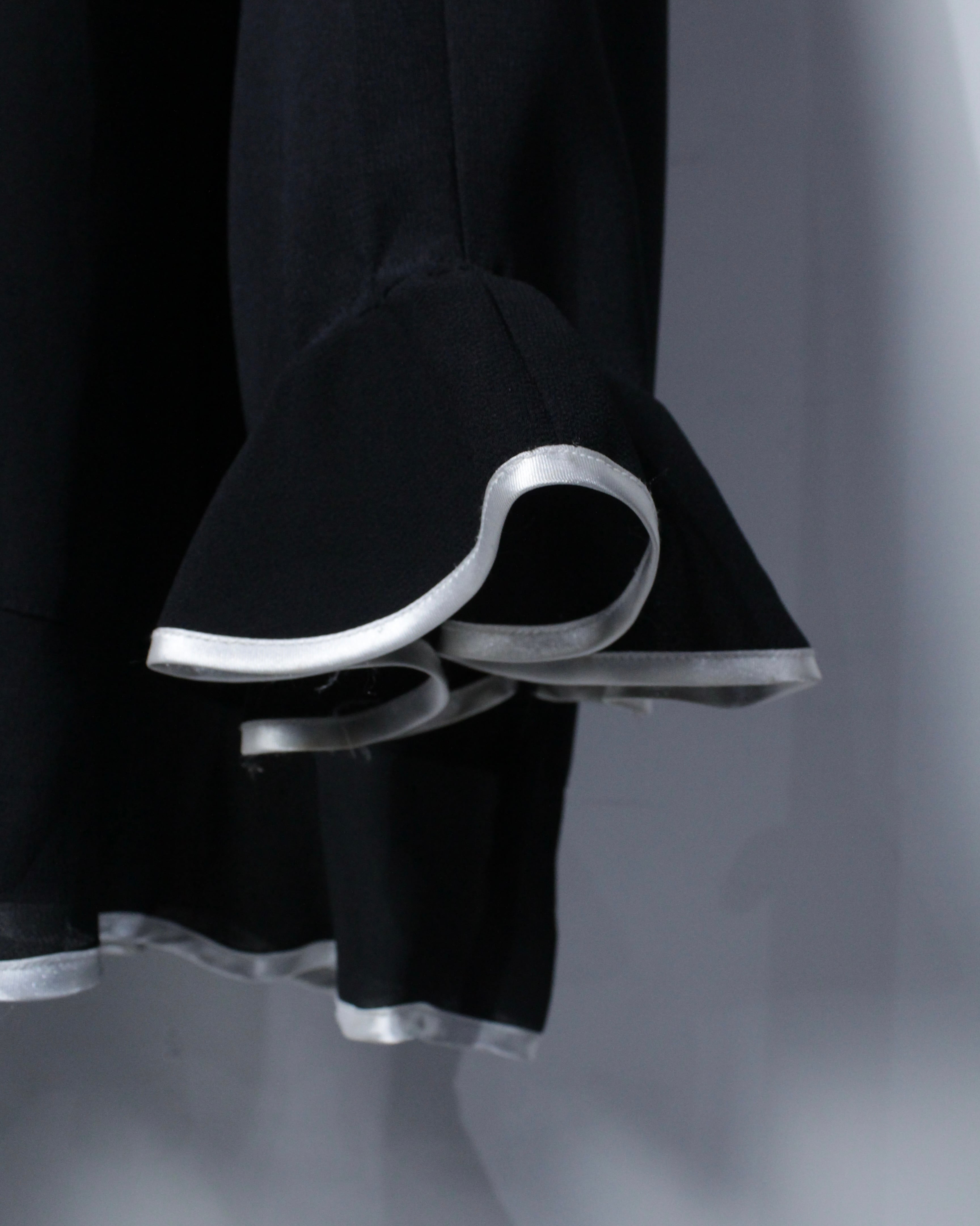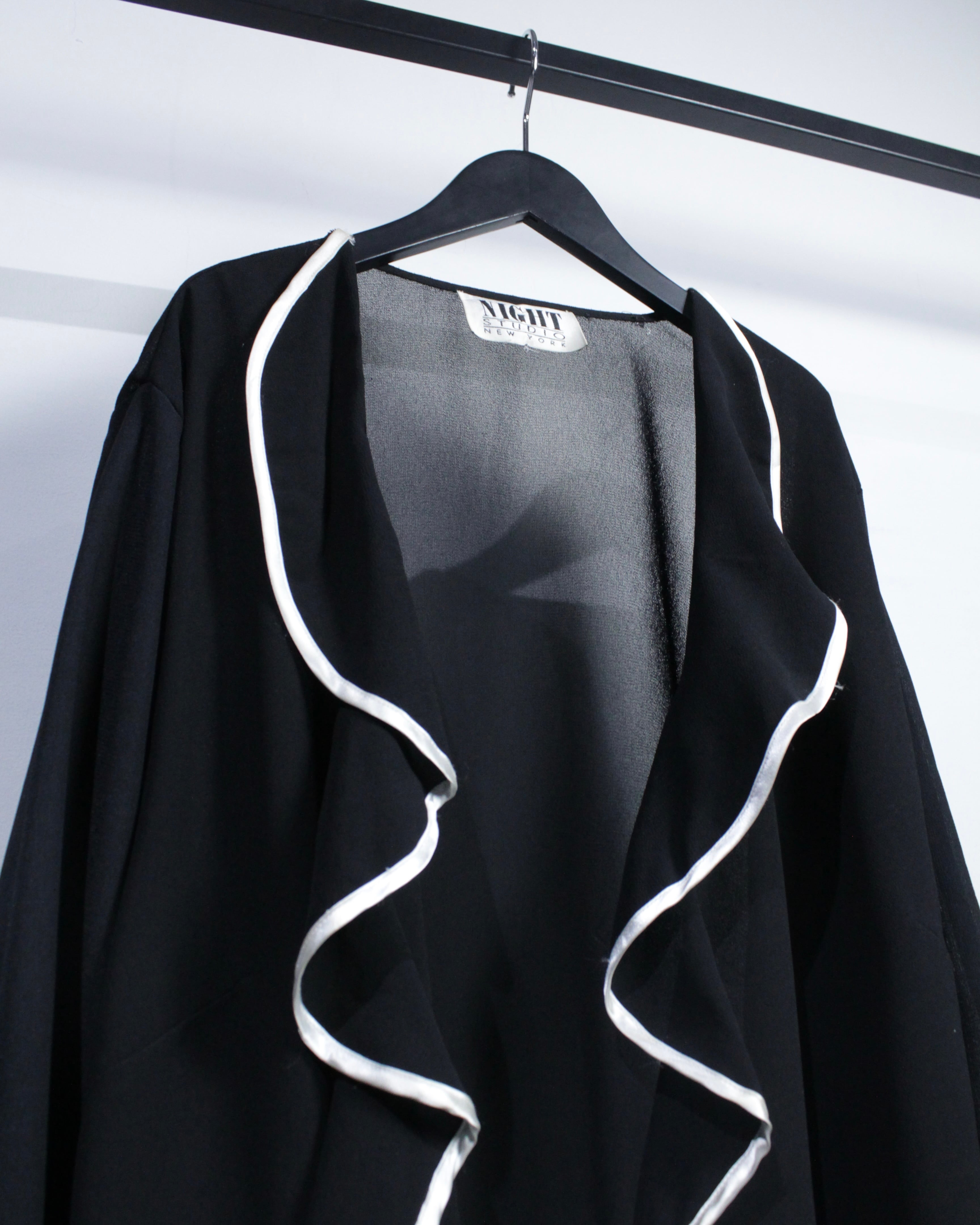 フロントにはホワイトのパイピングを施し、波打つようなラインでデザインされたラペルが最大の特徴。ミニマルなボディに対してこのディテールが強いコントラストを生み、インパクトのある仕上がりに。
