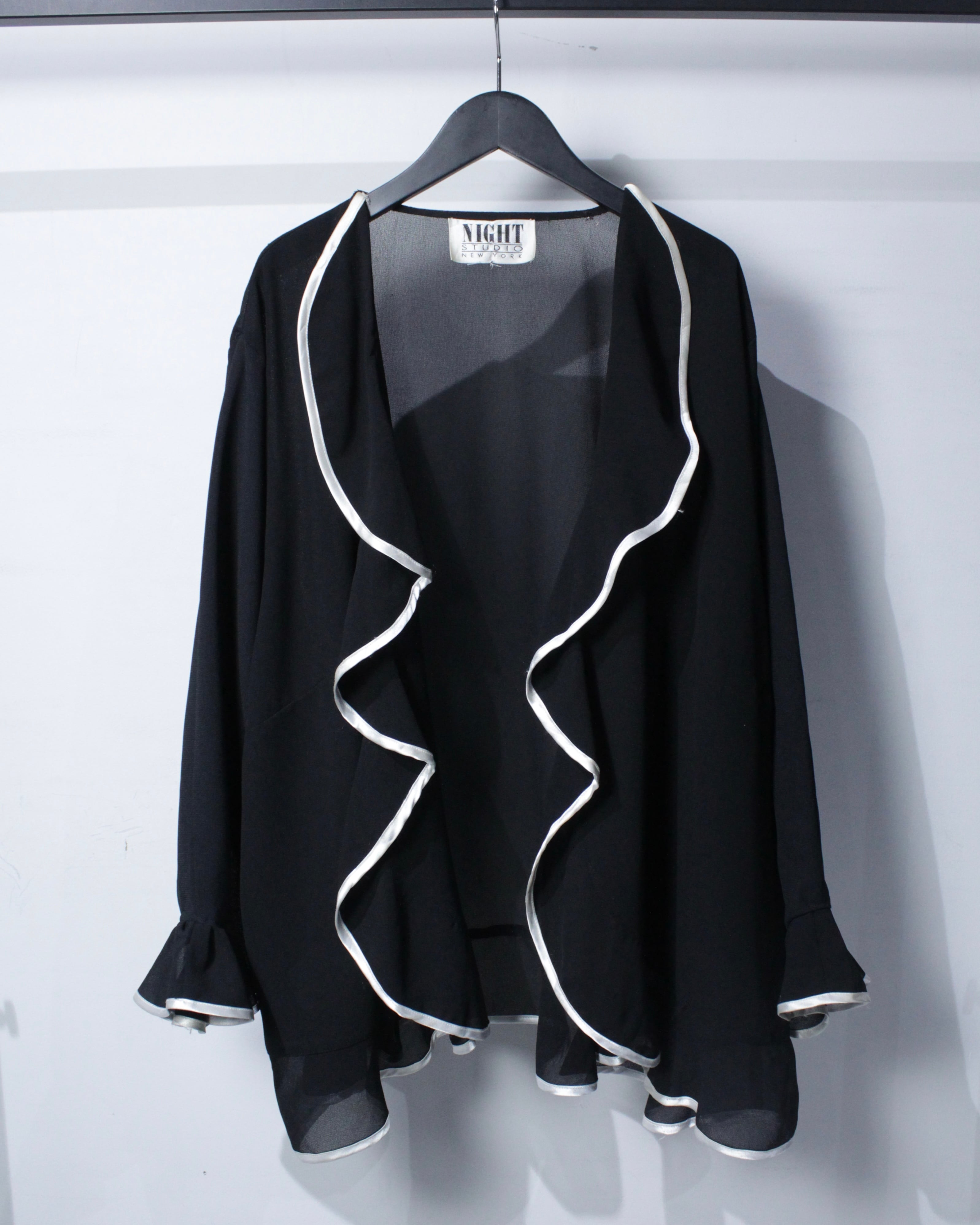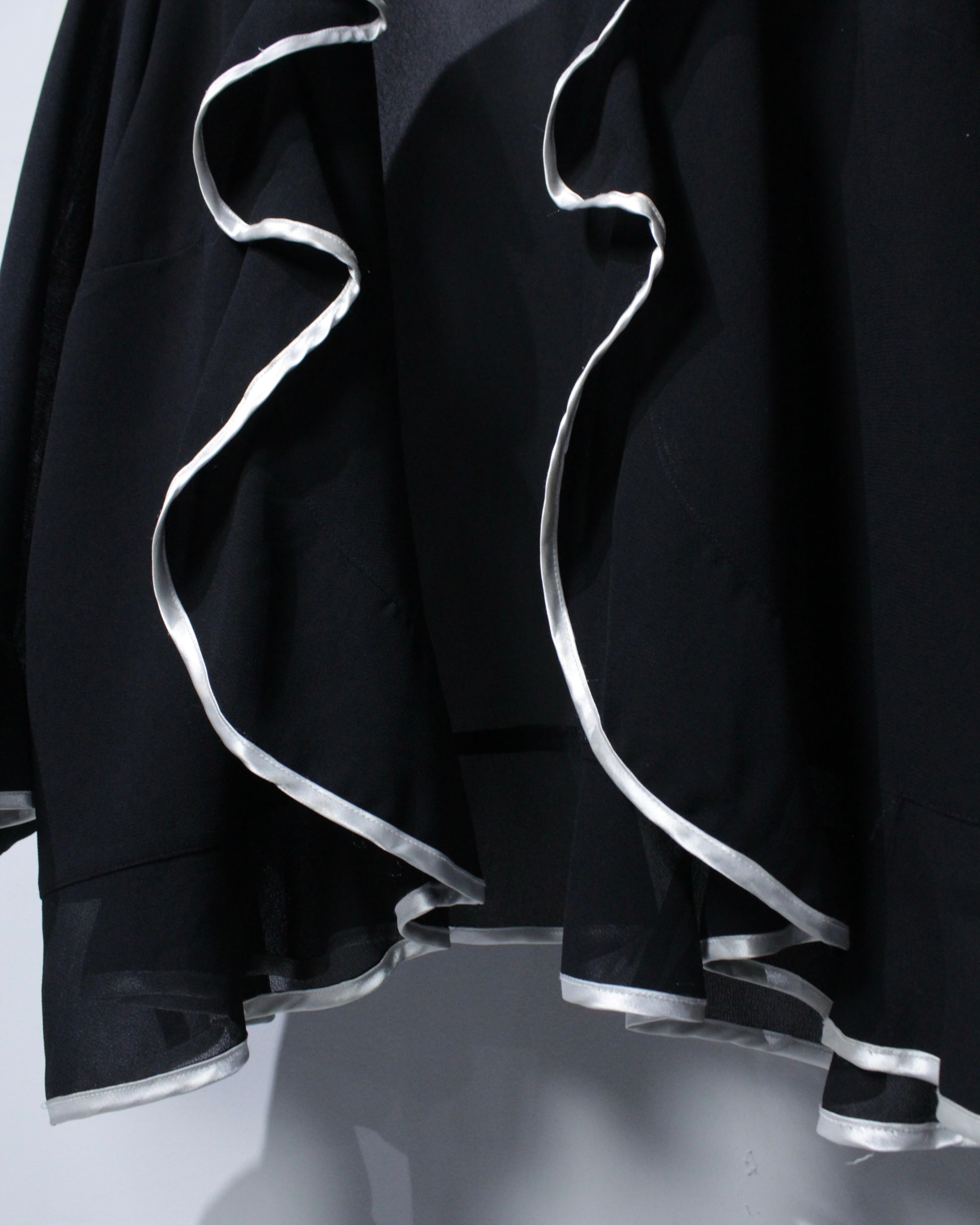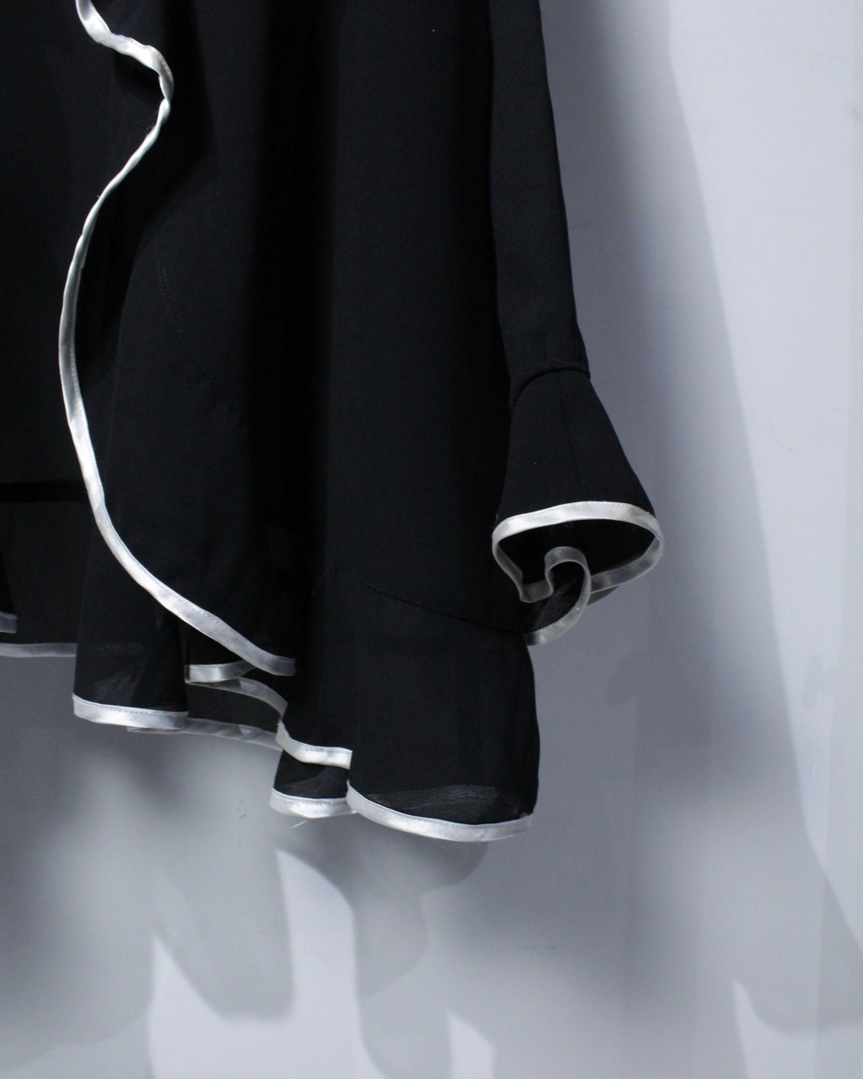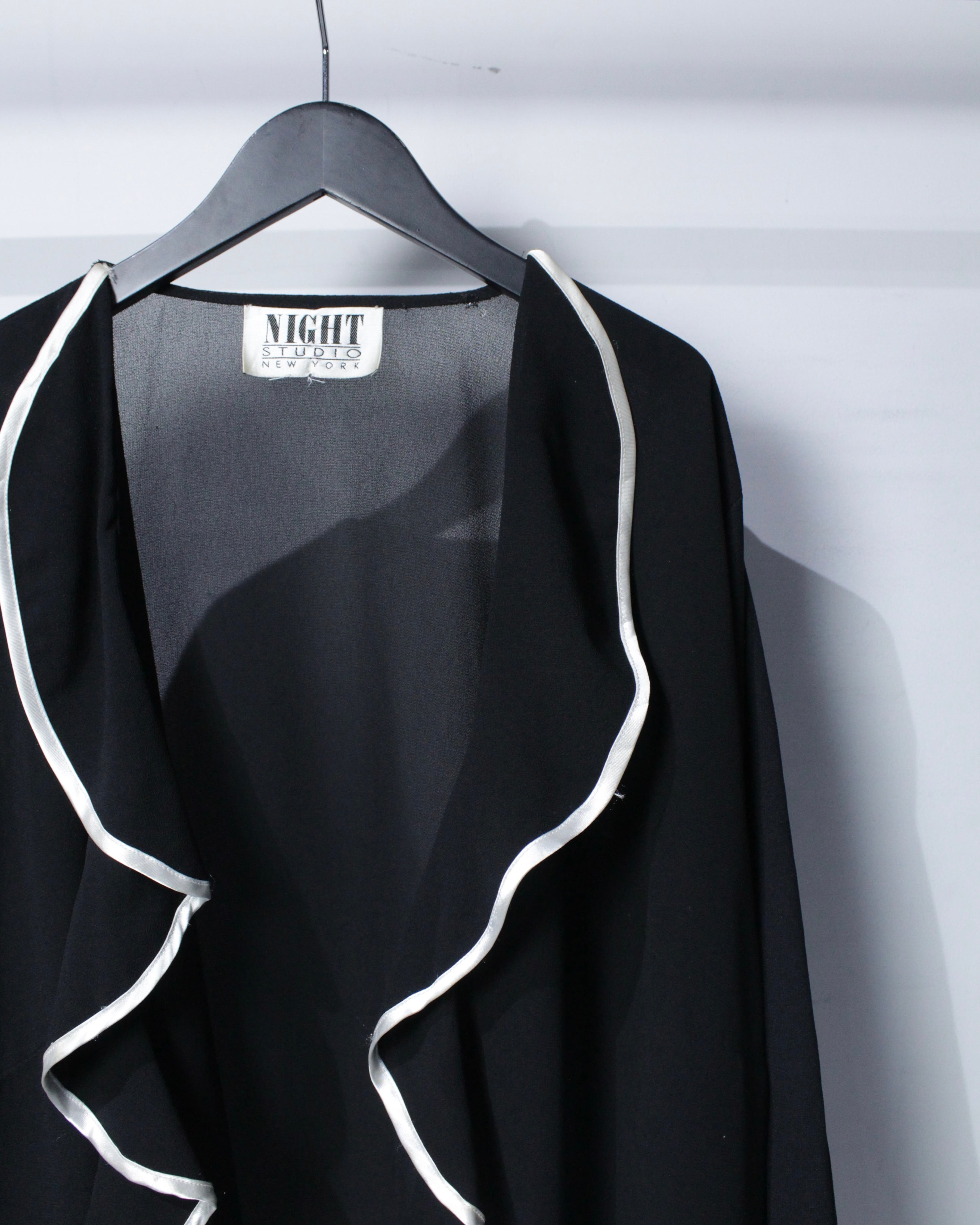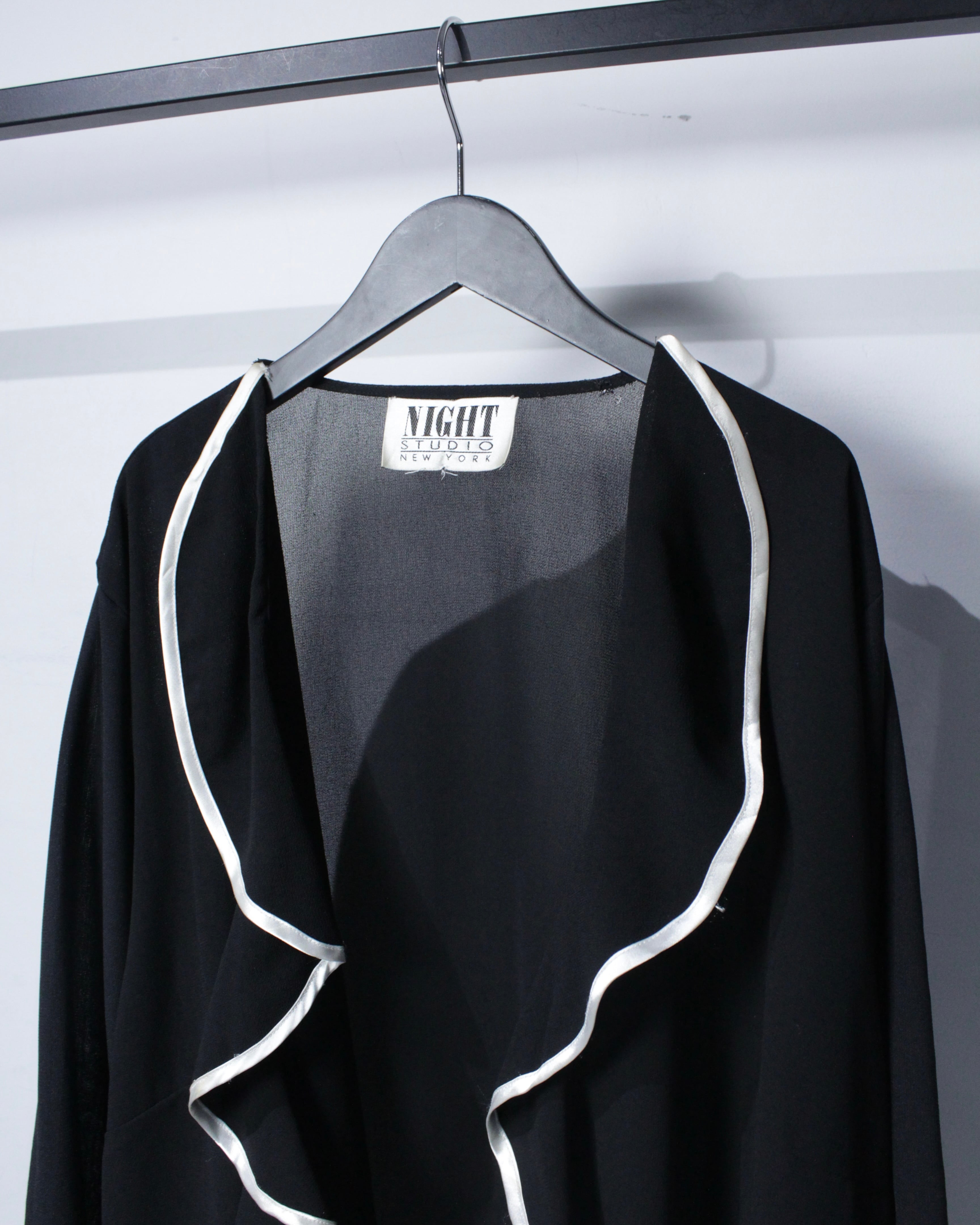フロントにはホワイトのパイピングを施し、波打つようなラインでデザインされたラペルが最大の特徴。ミニマルなボディに対してこのディテールが強いコントラストを生み、インパクトのある仕上がりに。