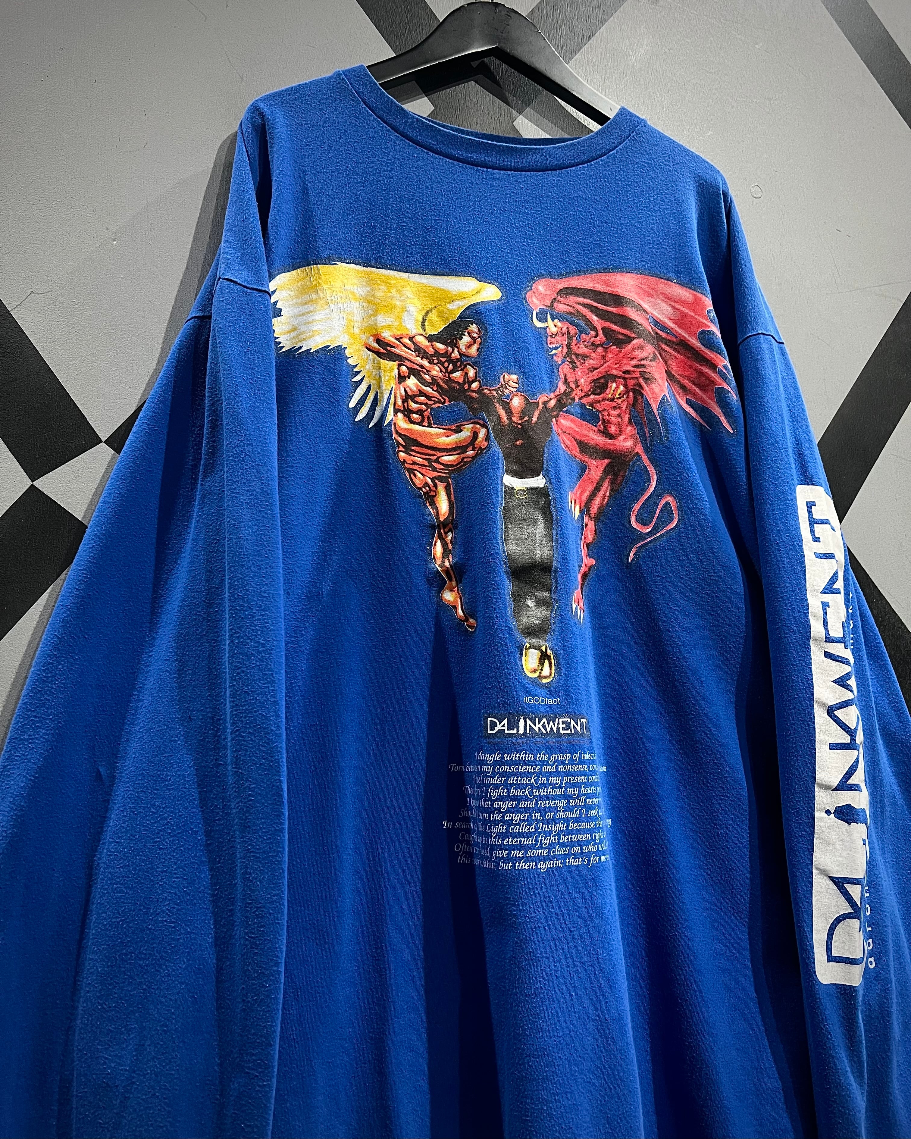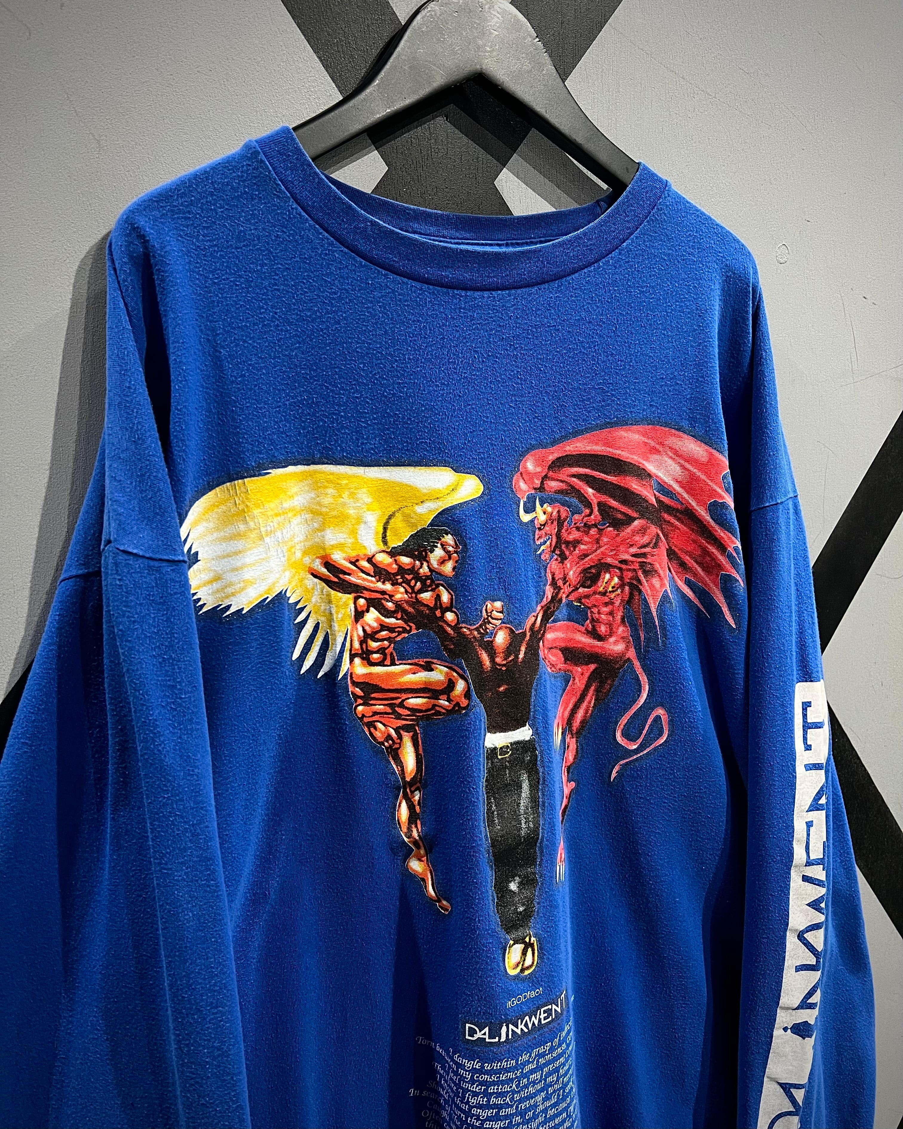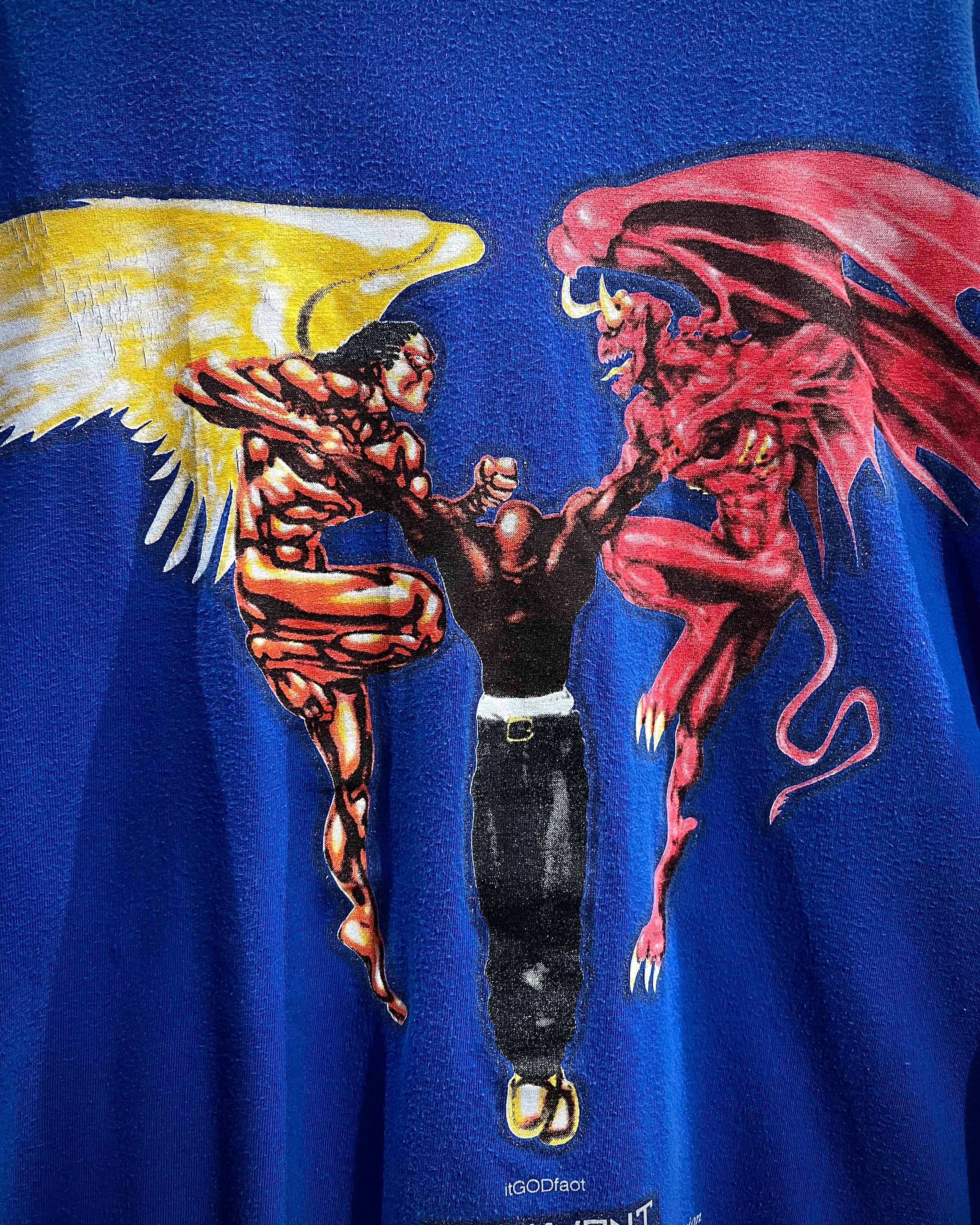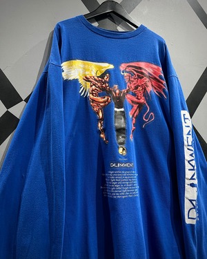 ボディは発色の良いブルーカラーをベースに、フロントには天使と悪魔が対峙する大胆なグラフィックをラメプリントを交えながら配置した1着。