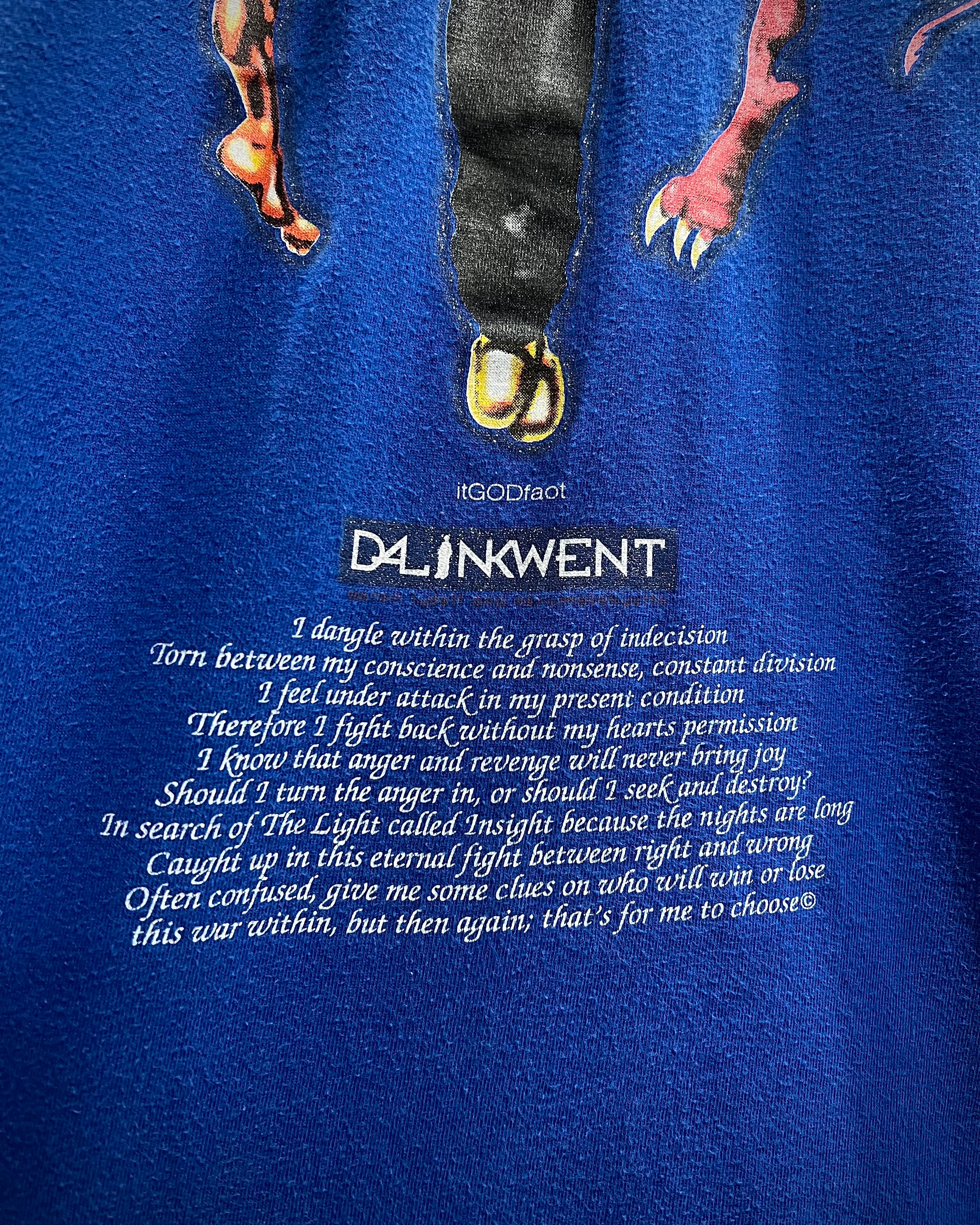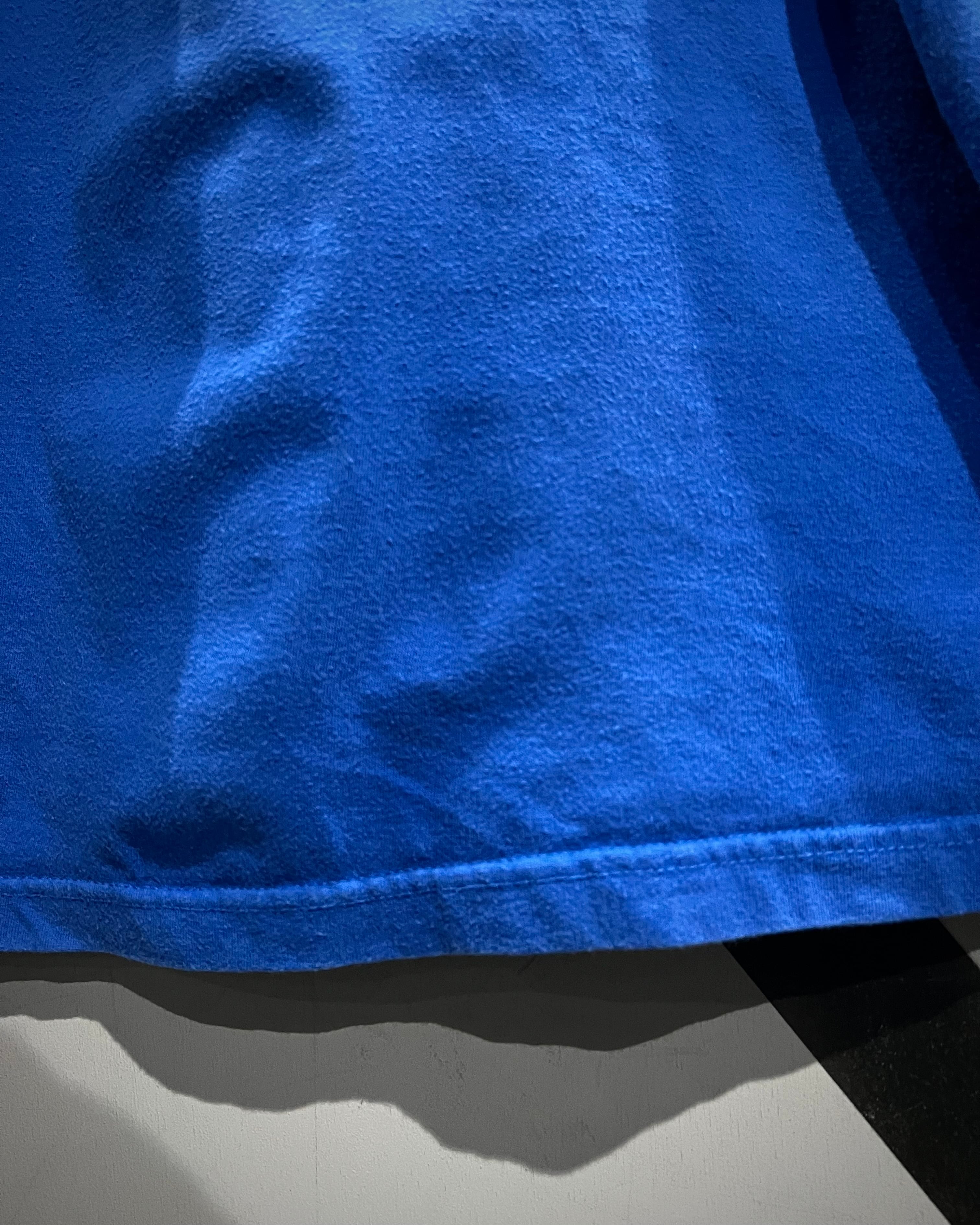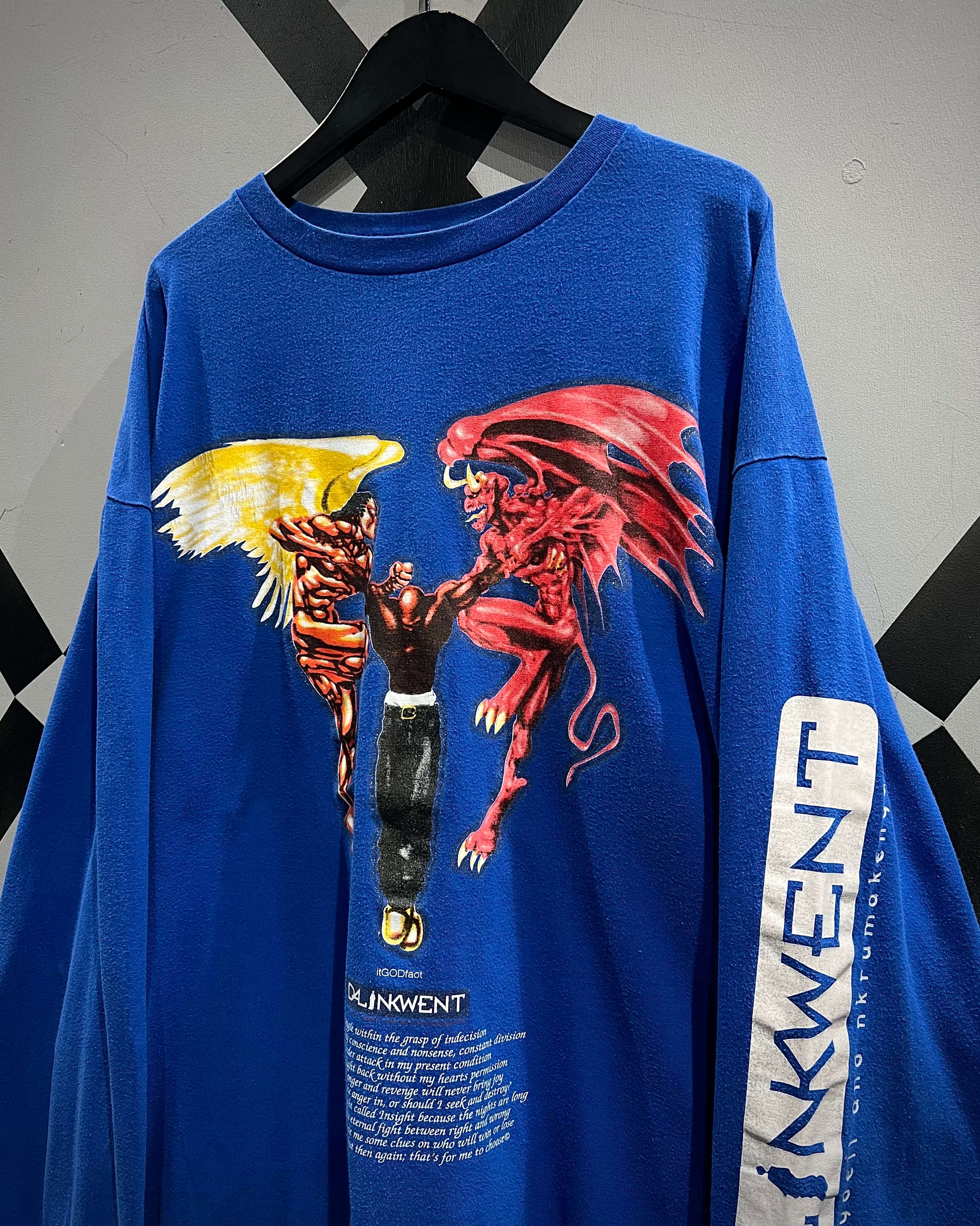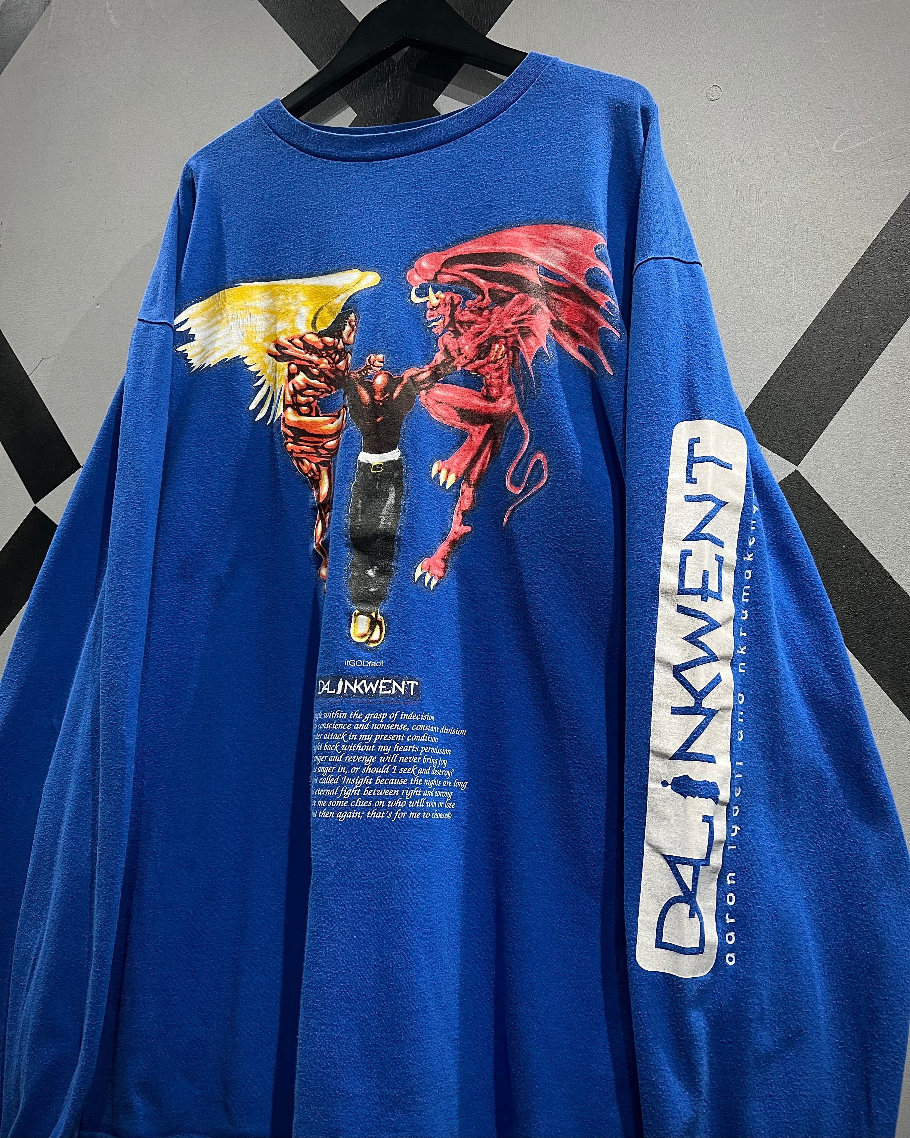 ボディは発色の良いブルーカラーをベースに、フロントには天使と悪魔が対峙する大胆なグラフィックをラメプリントを交えながら配置した1着。