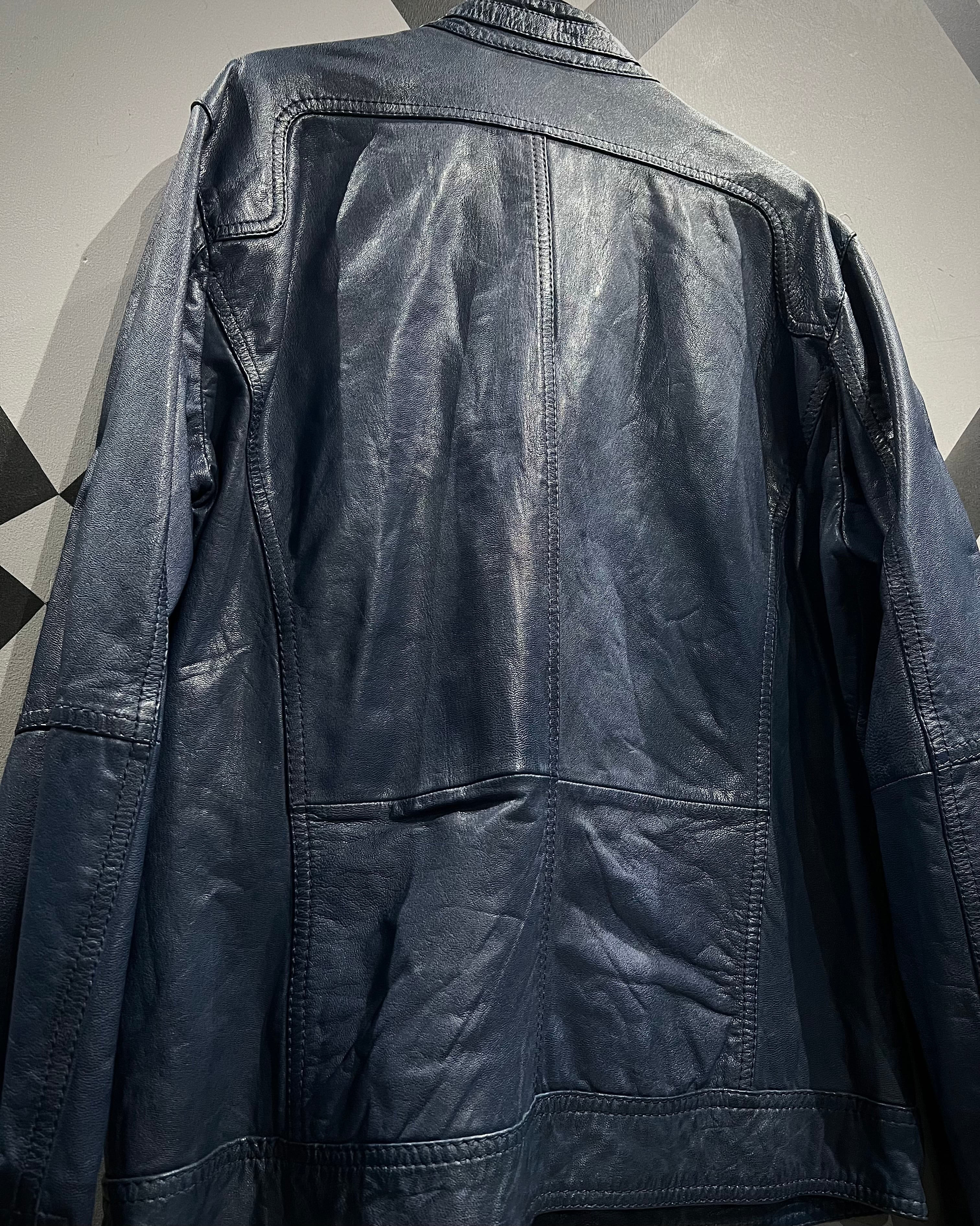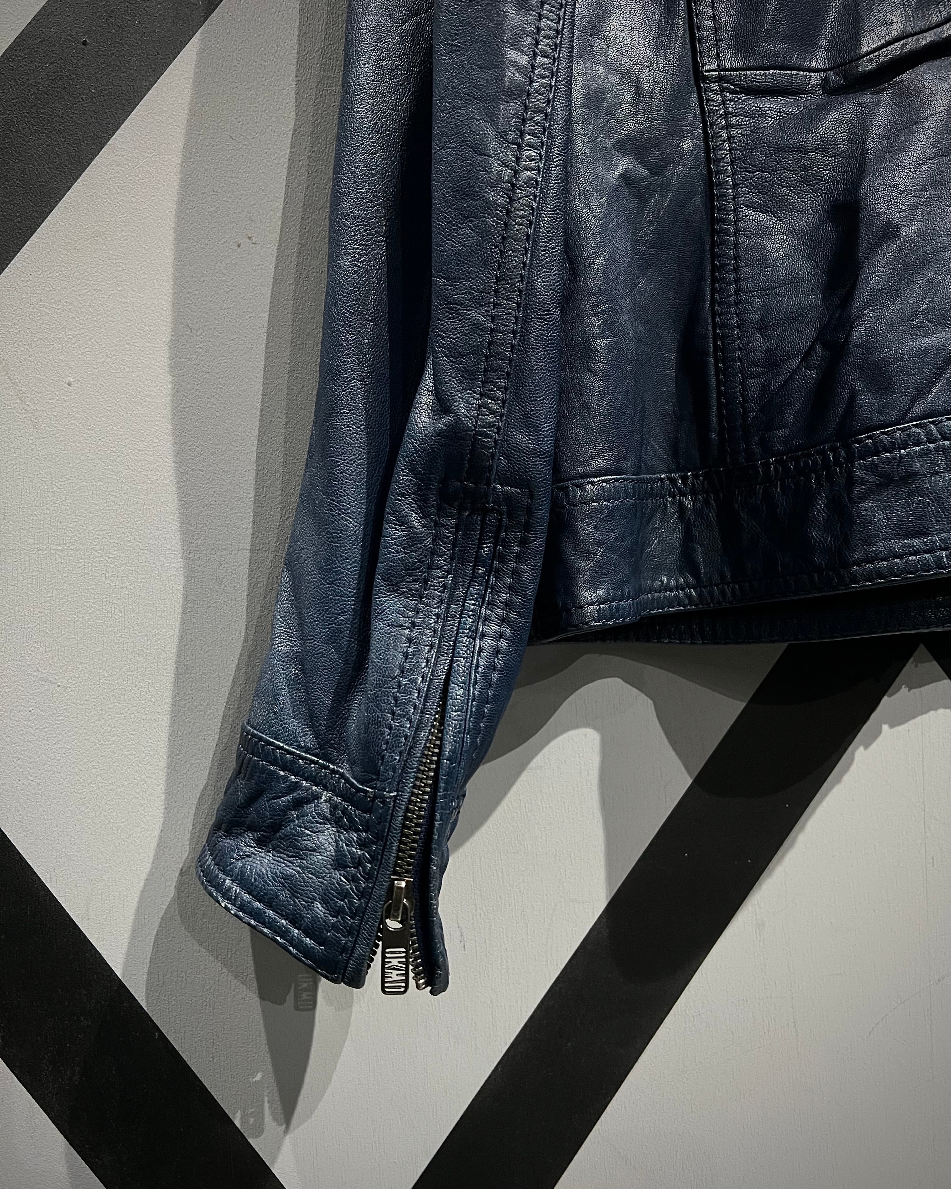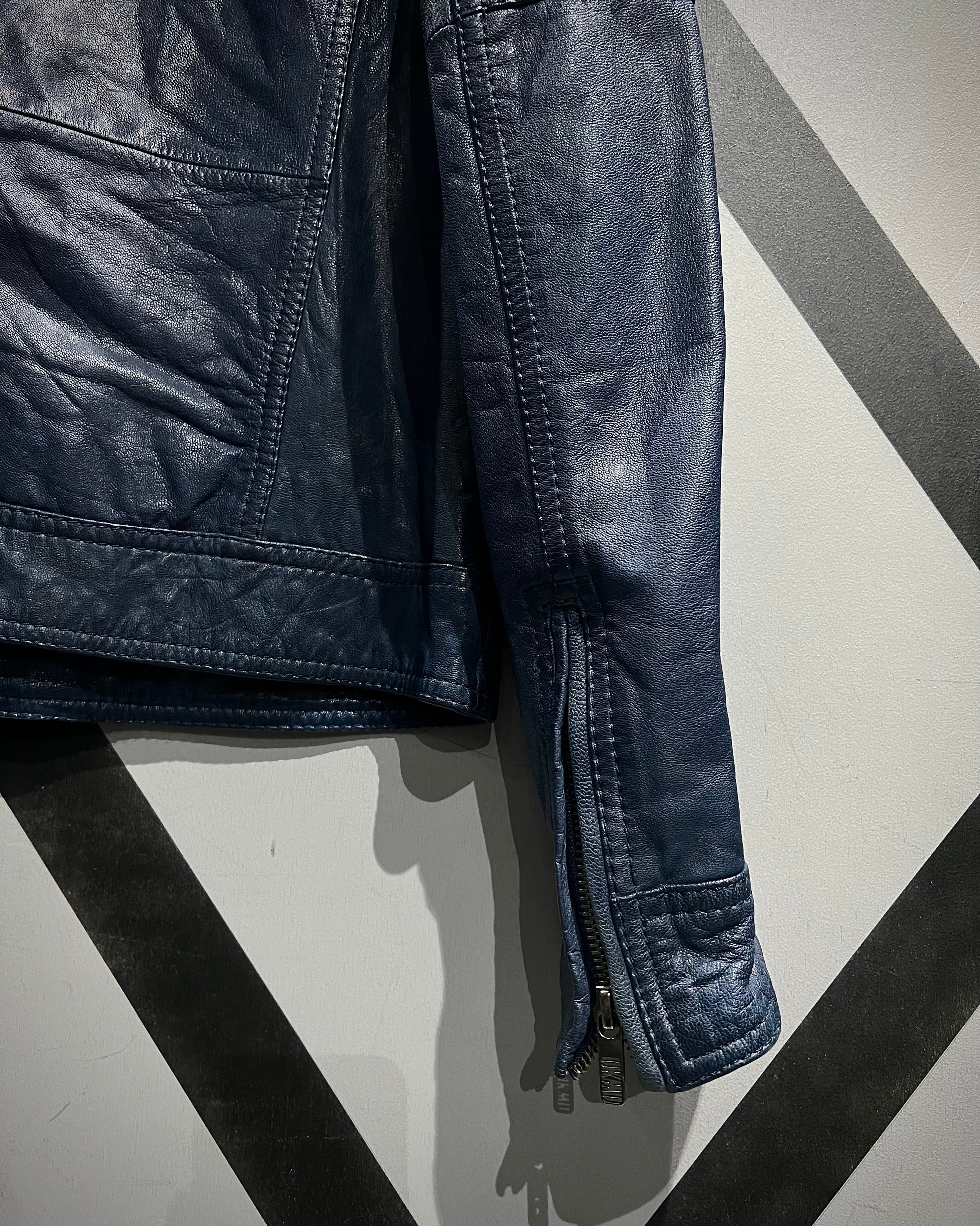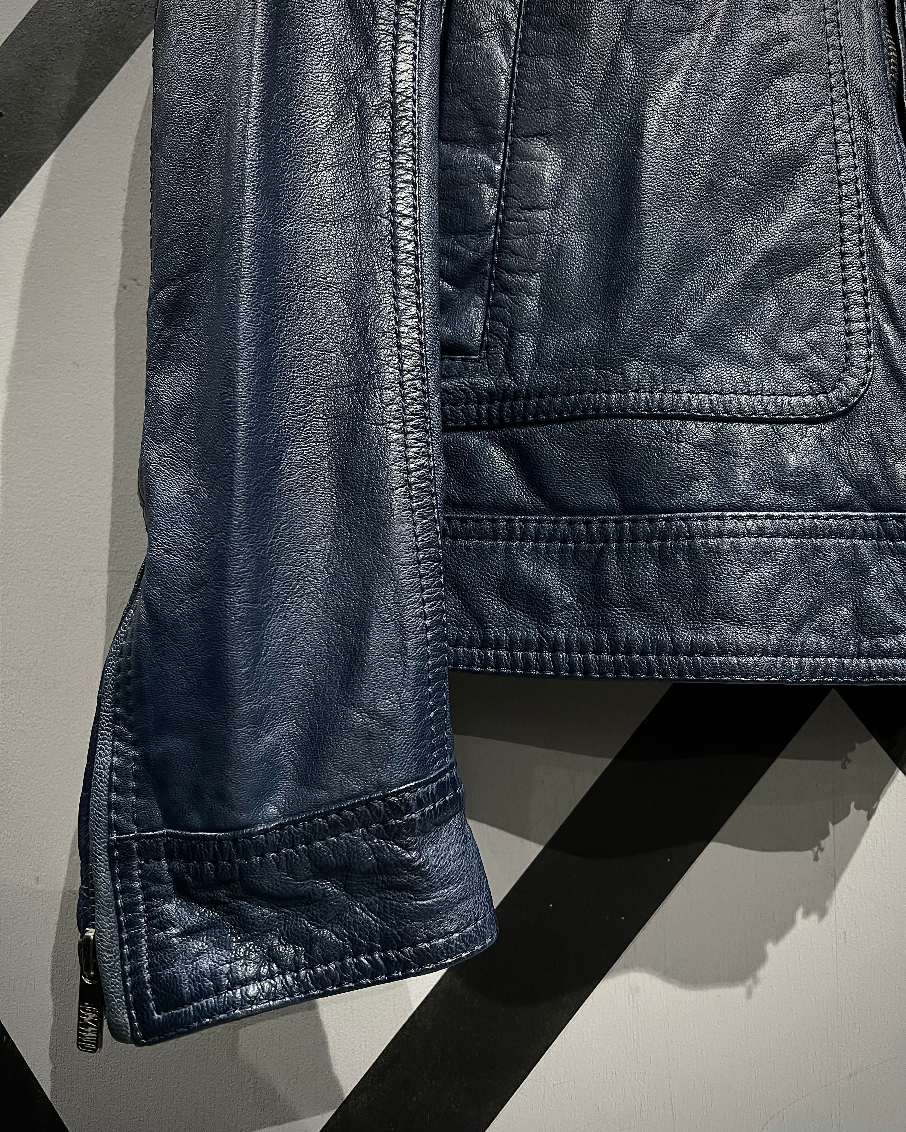 ボディにはしなやかで艶のあるレザーを使用し、深みのあるブルーの色味が光の当たり方で微妙に変化。ライダースならではのタフさがありながら、どこかモードな雰囲気を放つ1着に仕上がっています。