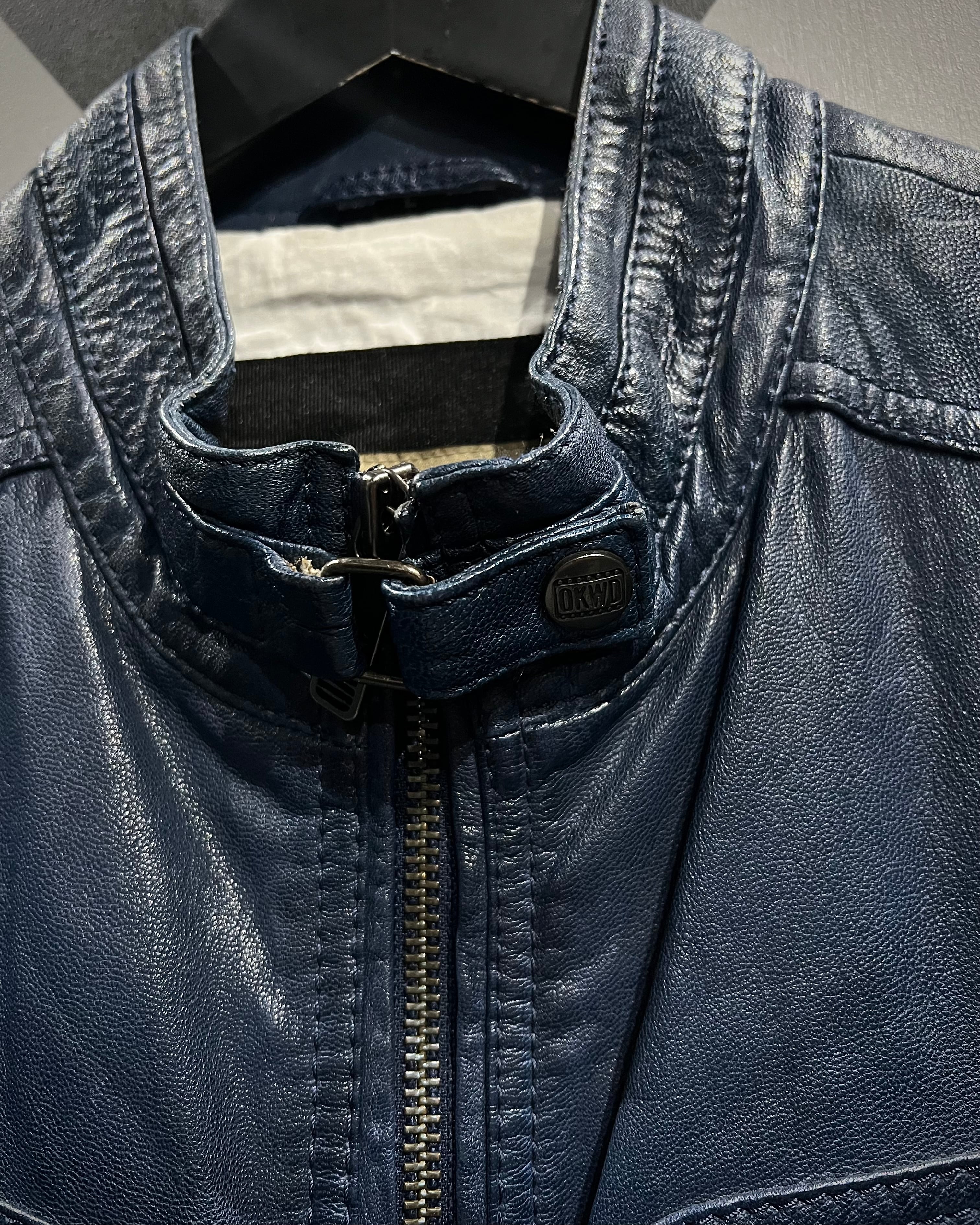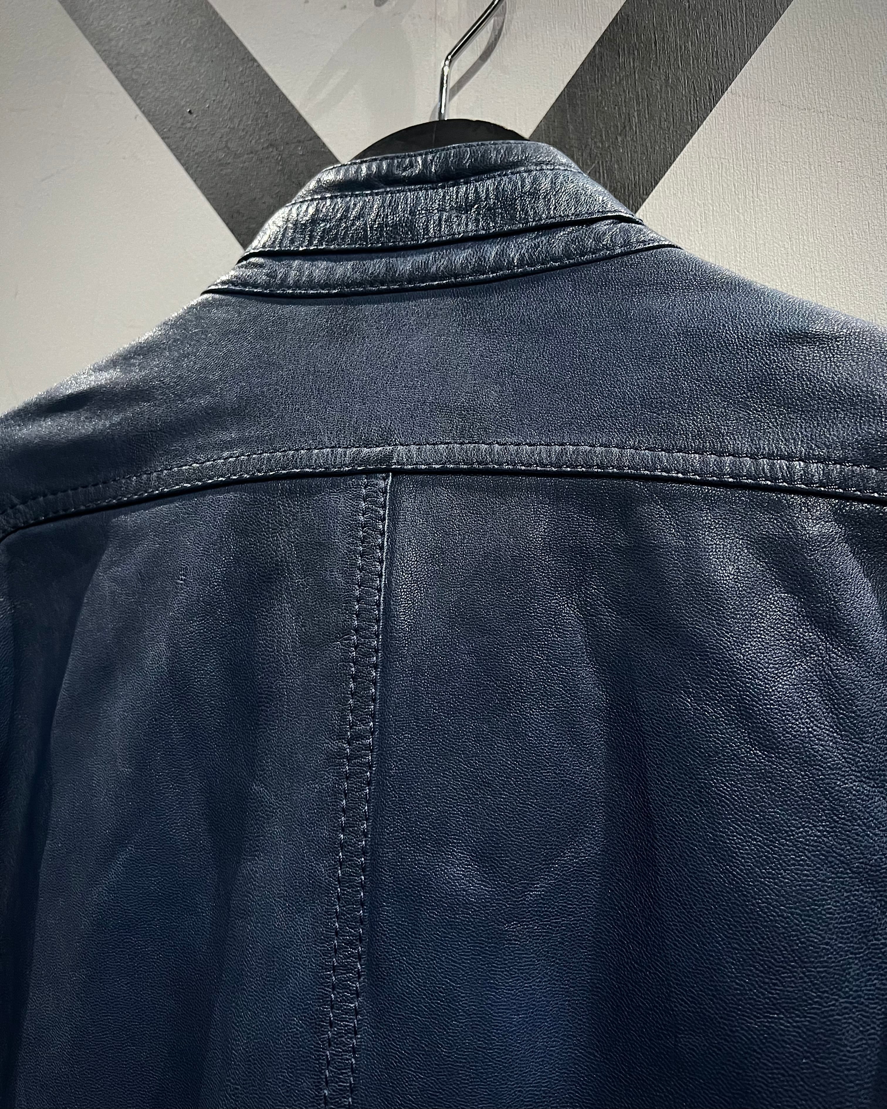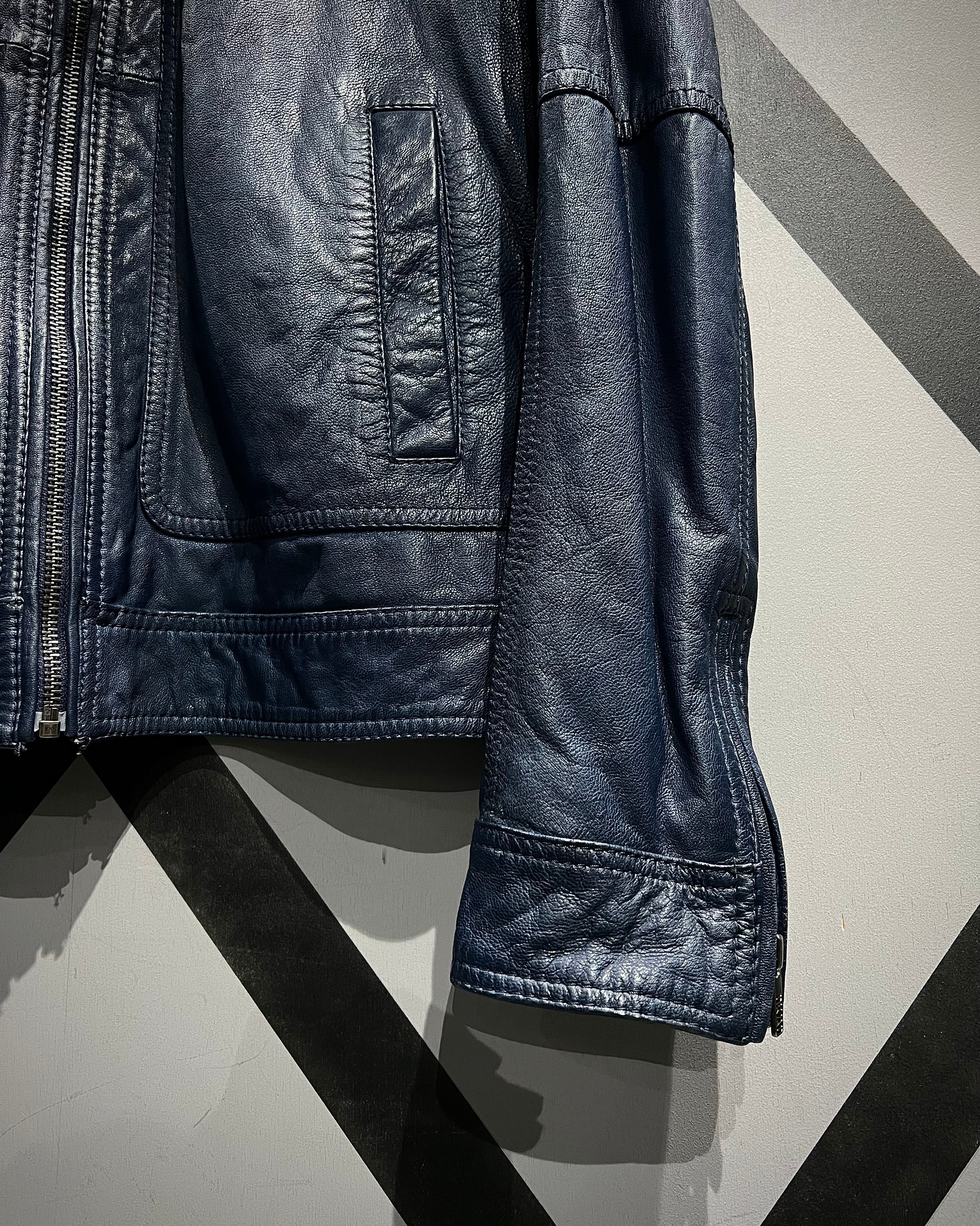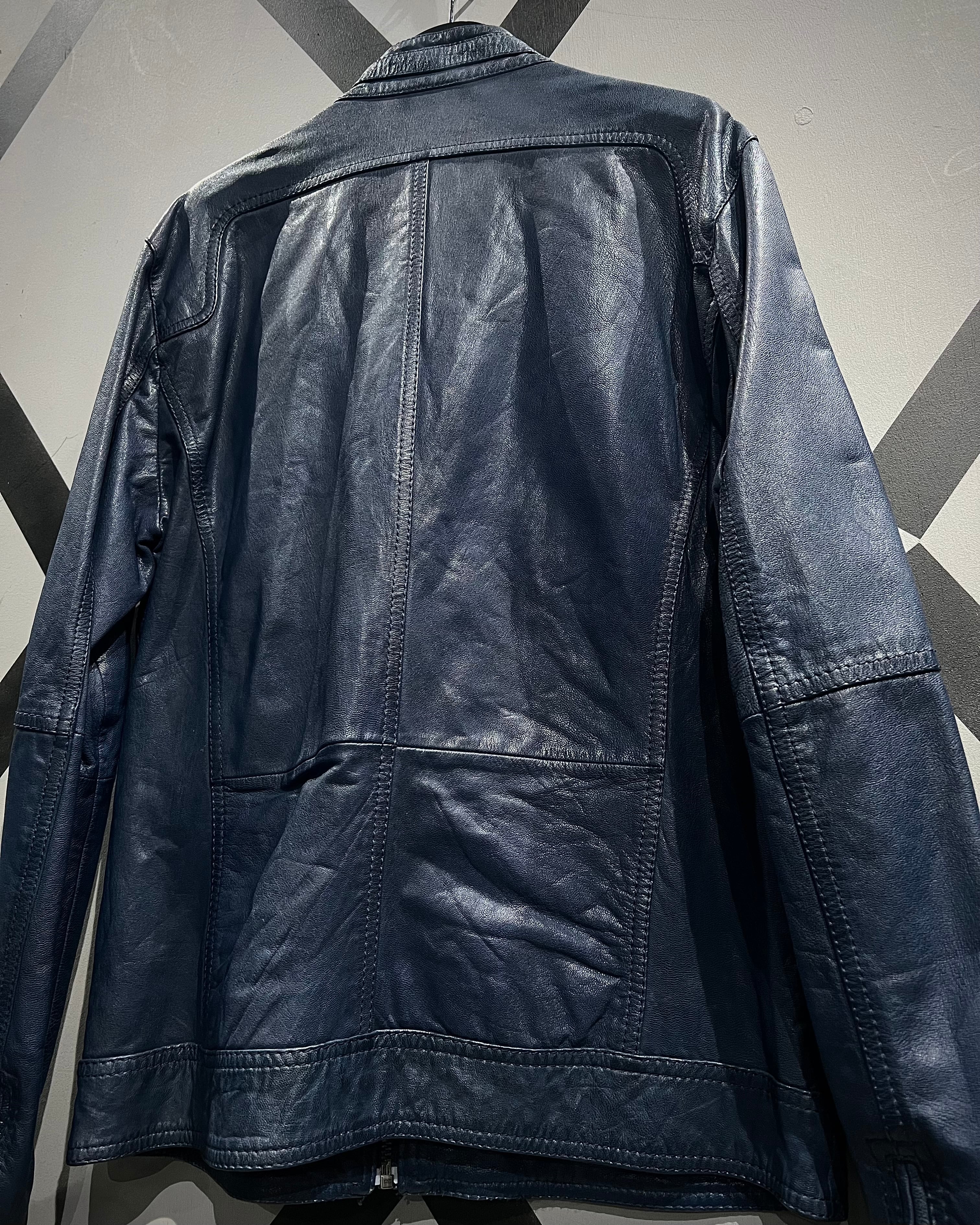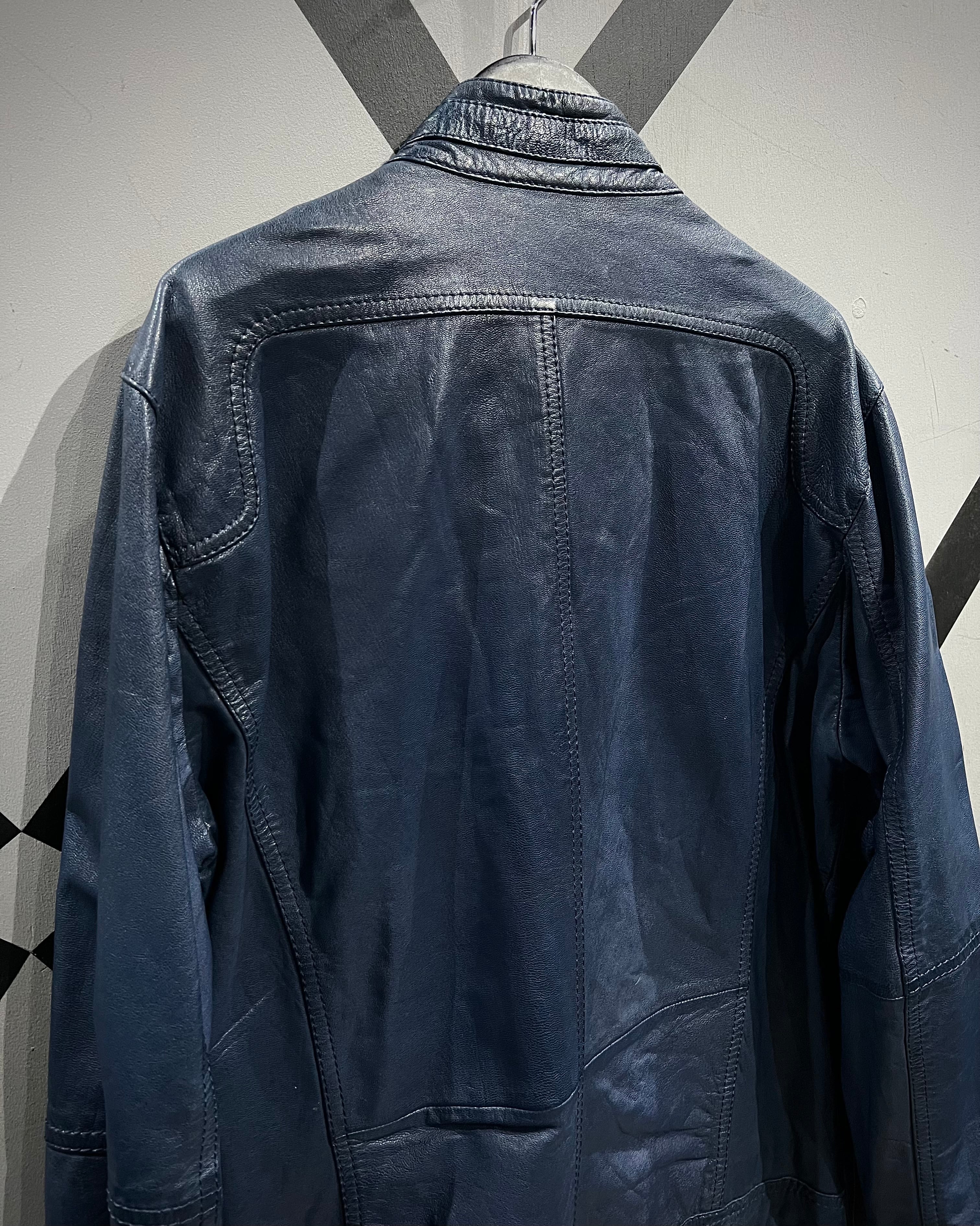 ボディにはしなやかで艶のあるレザーを使用し、深みのあるブルーの色味が光の当たり方で微妙に変化。ライダースならではのタフさがありながら、どこかモードな雰囲気を放つ1着に仕上がっています。
