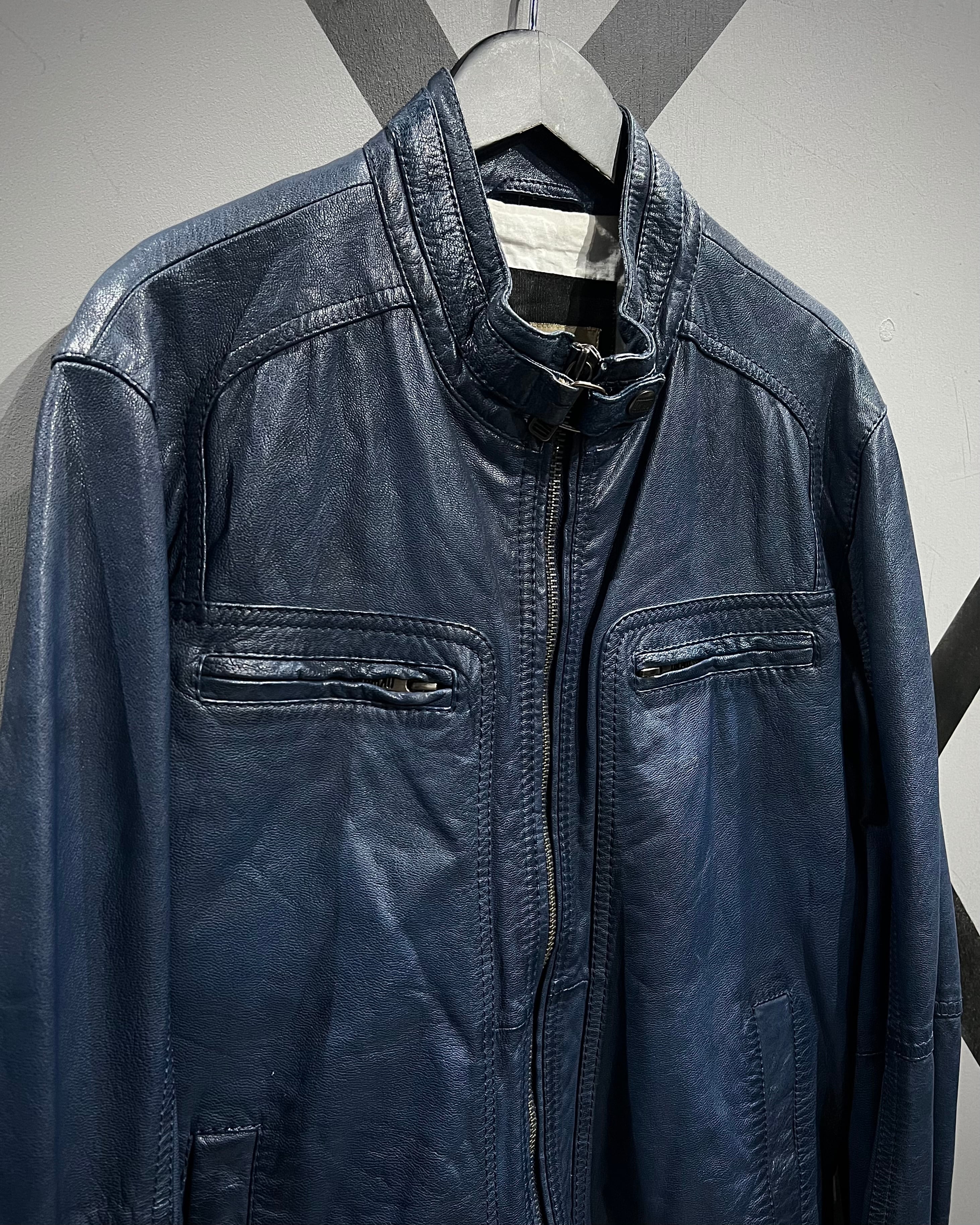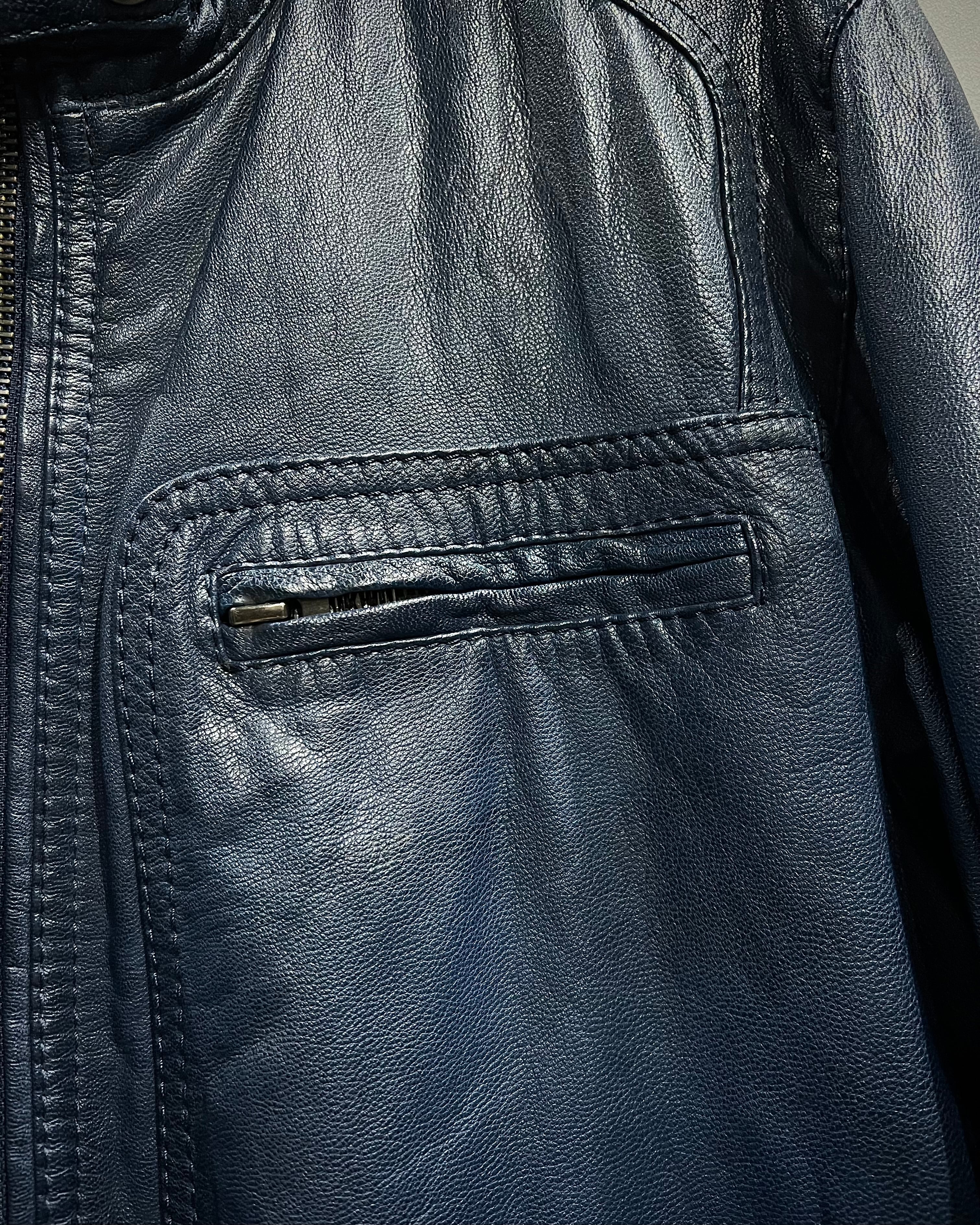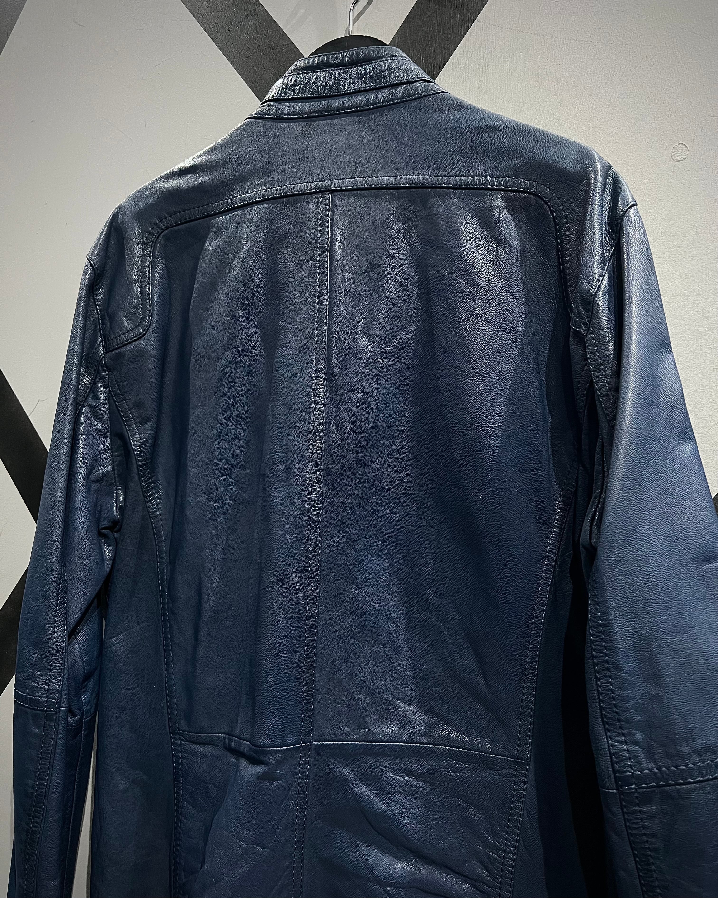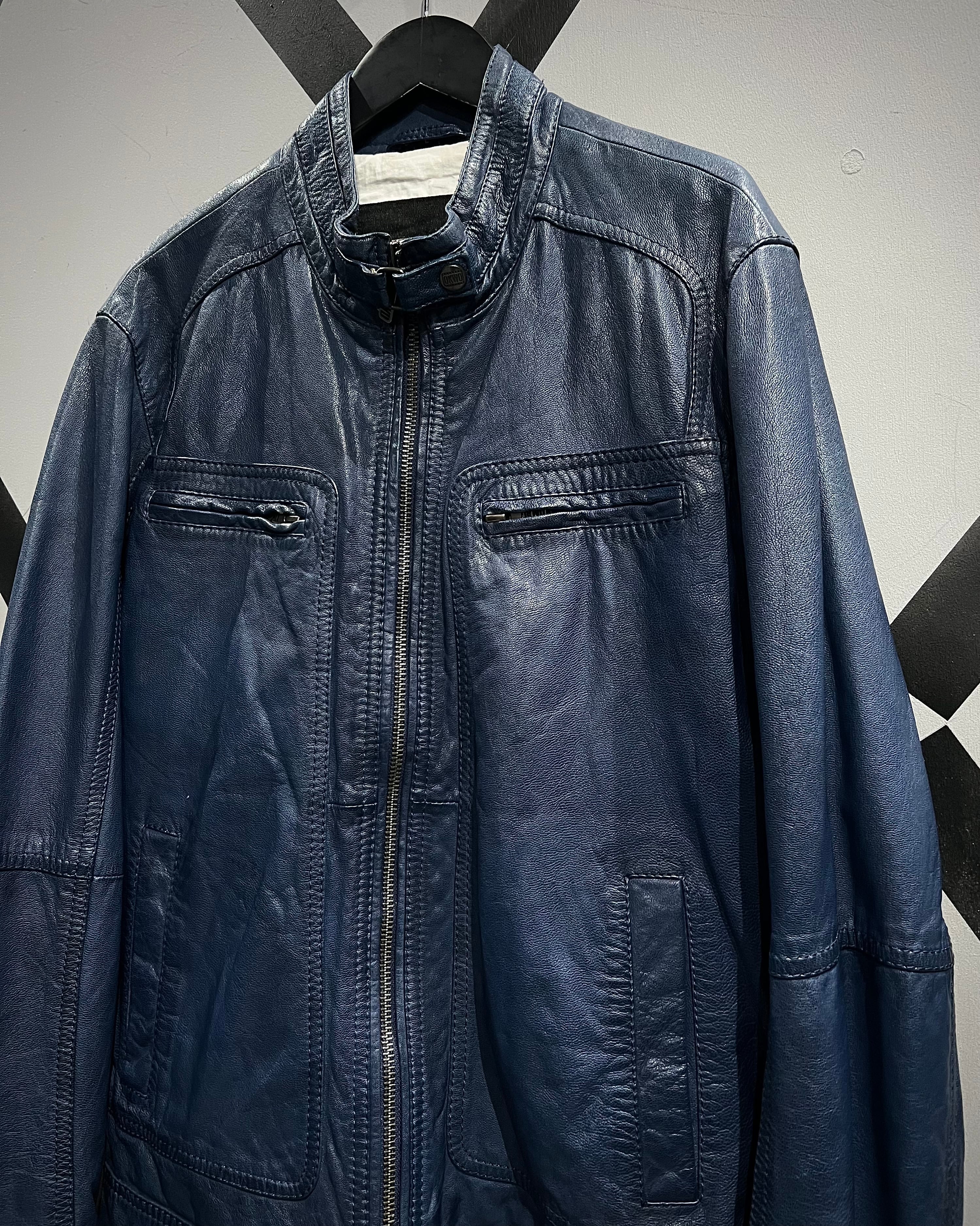 ボディにはしなやかで艶のあるレザーを使用し、深みのあるブルーの色味が光の当たり方で微妙に変化。ライダースならではのタフさがありながら、どこかモードな雰囲気を放つ1着に仕上がっています。