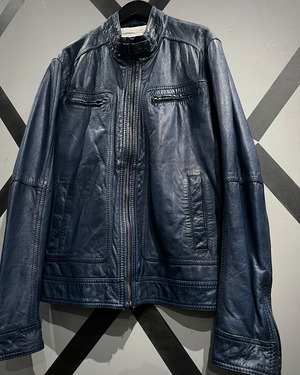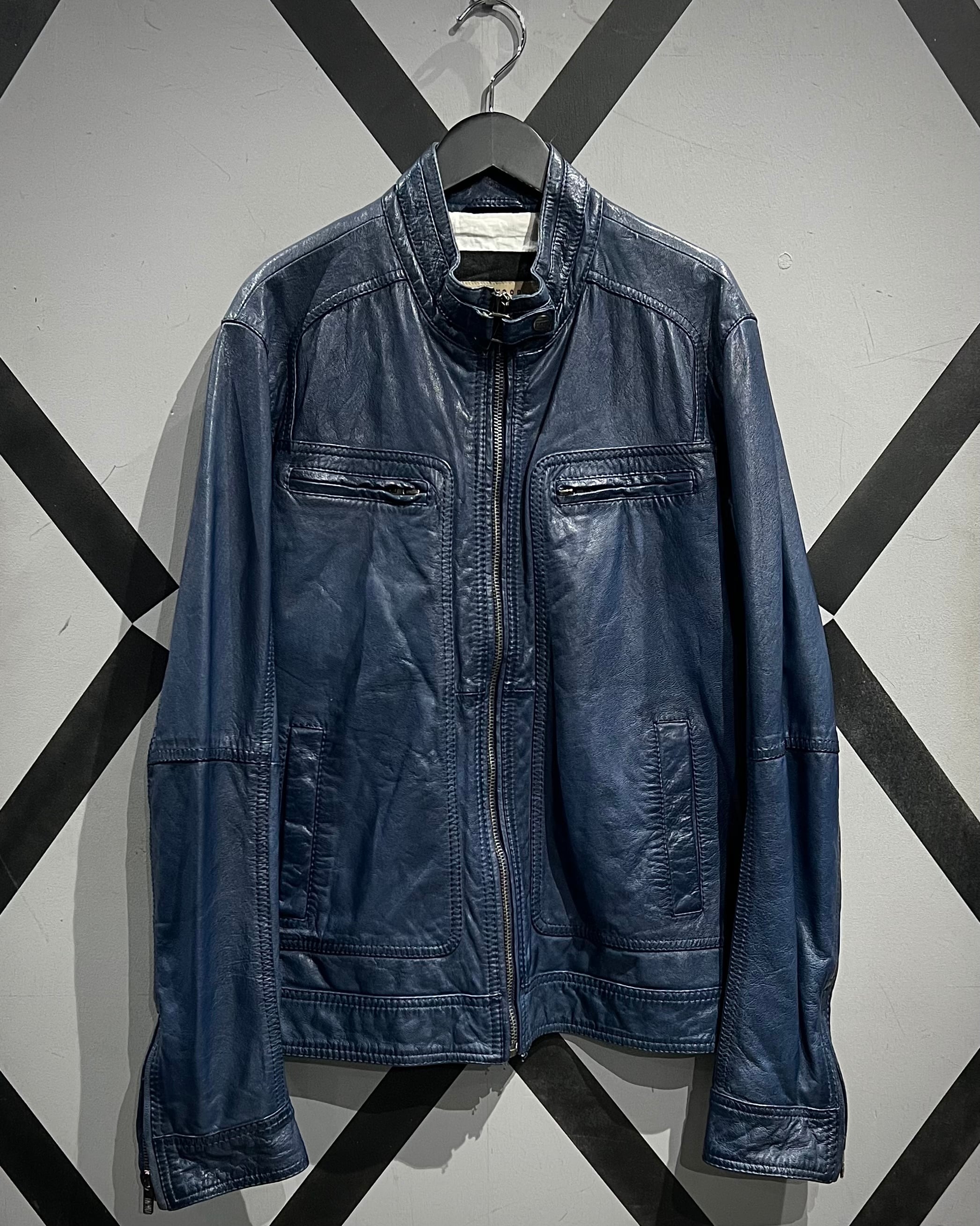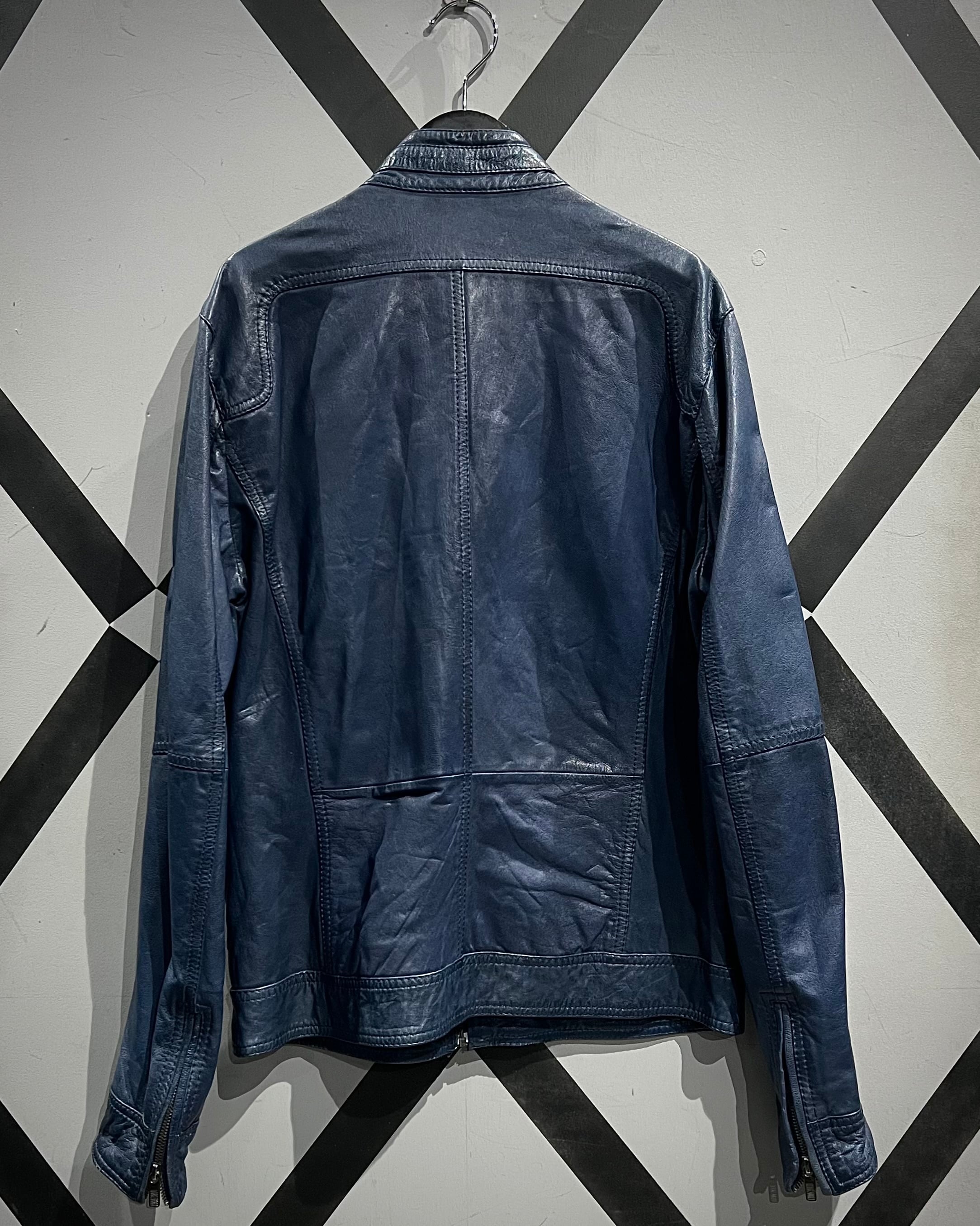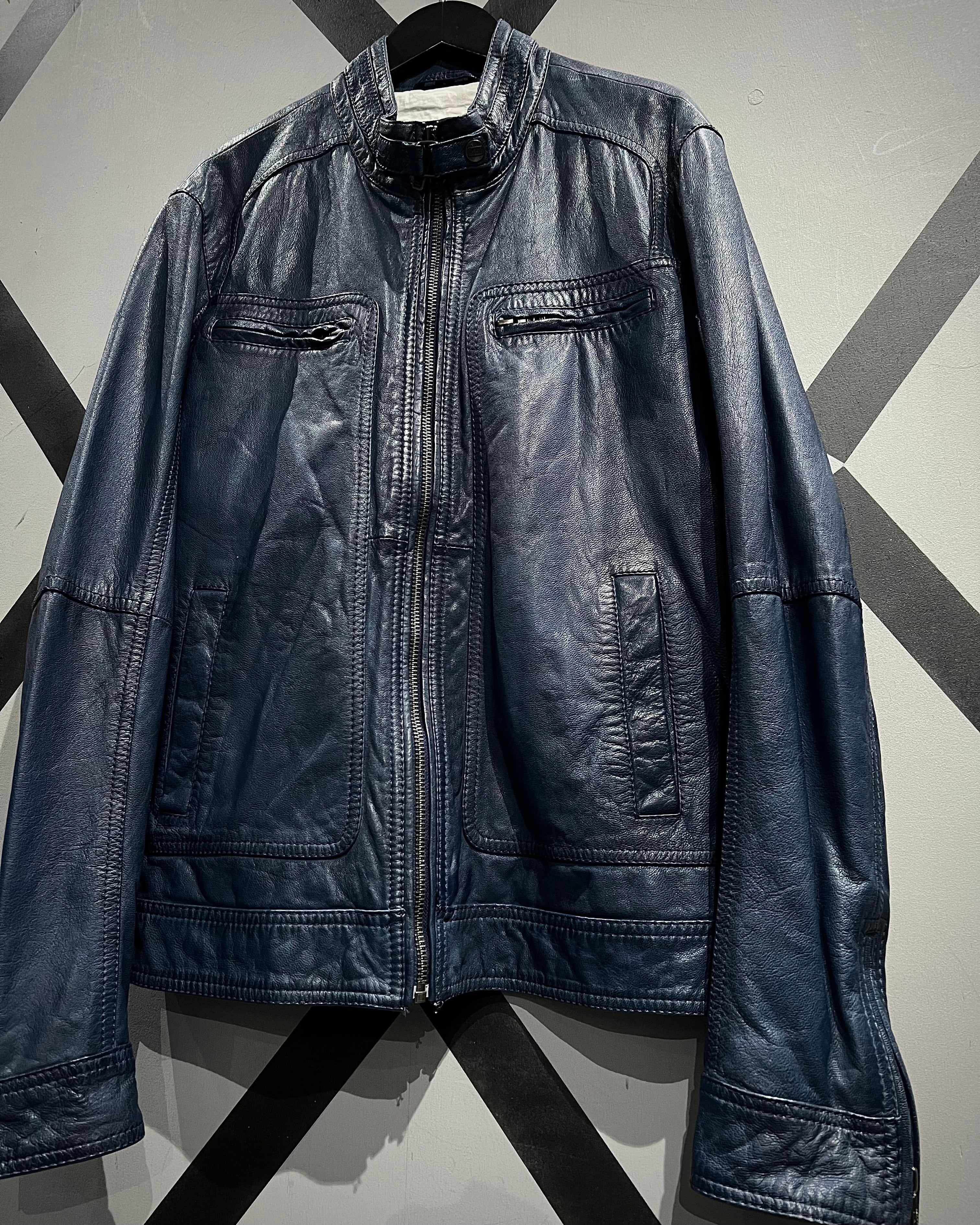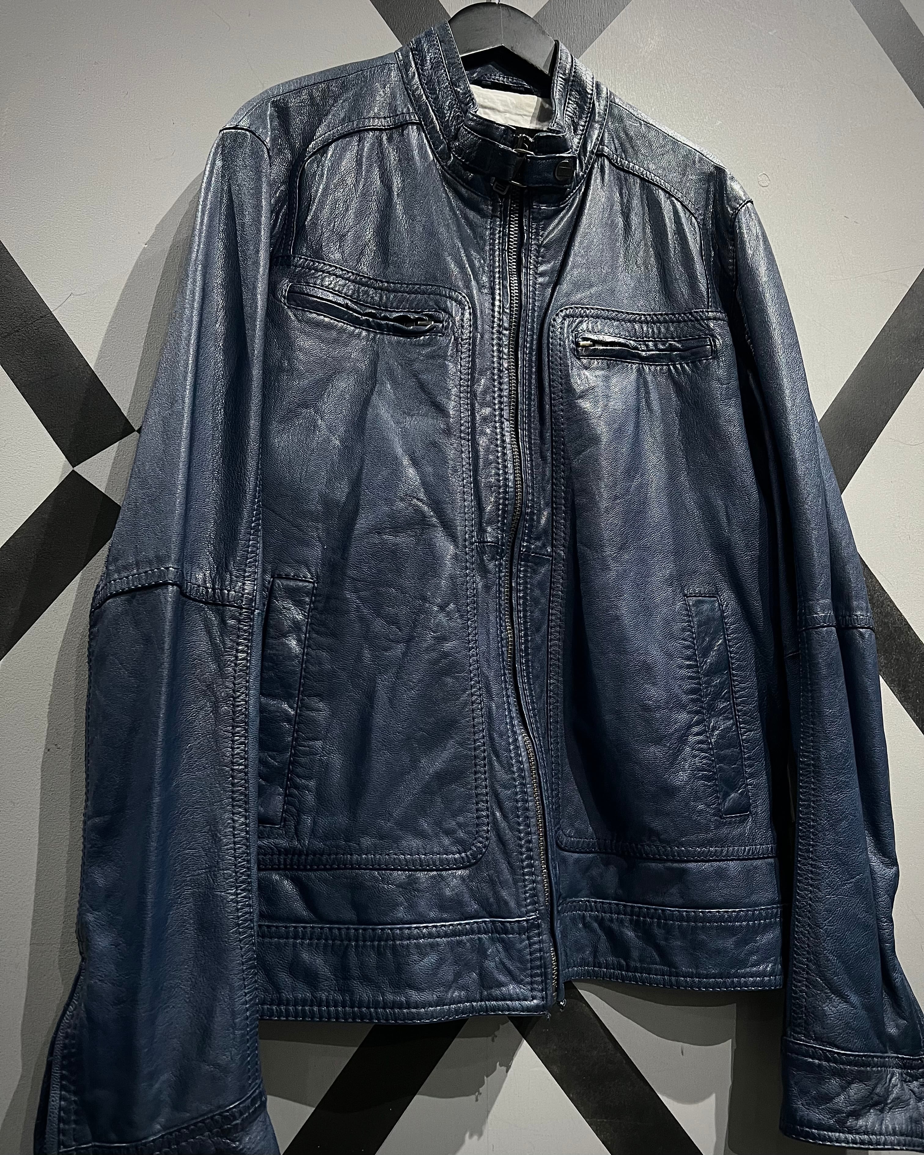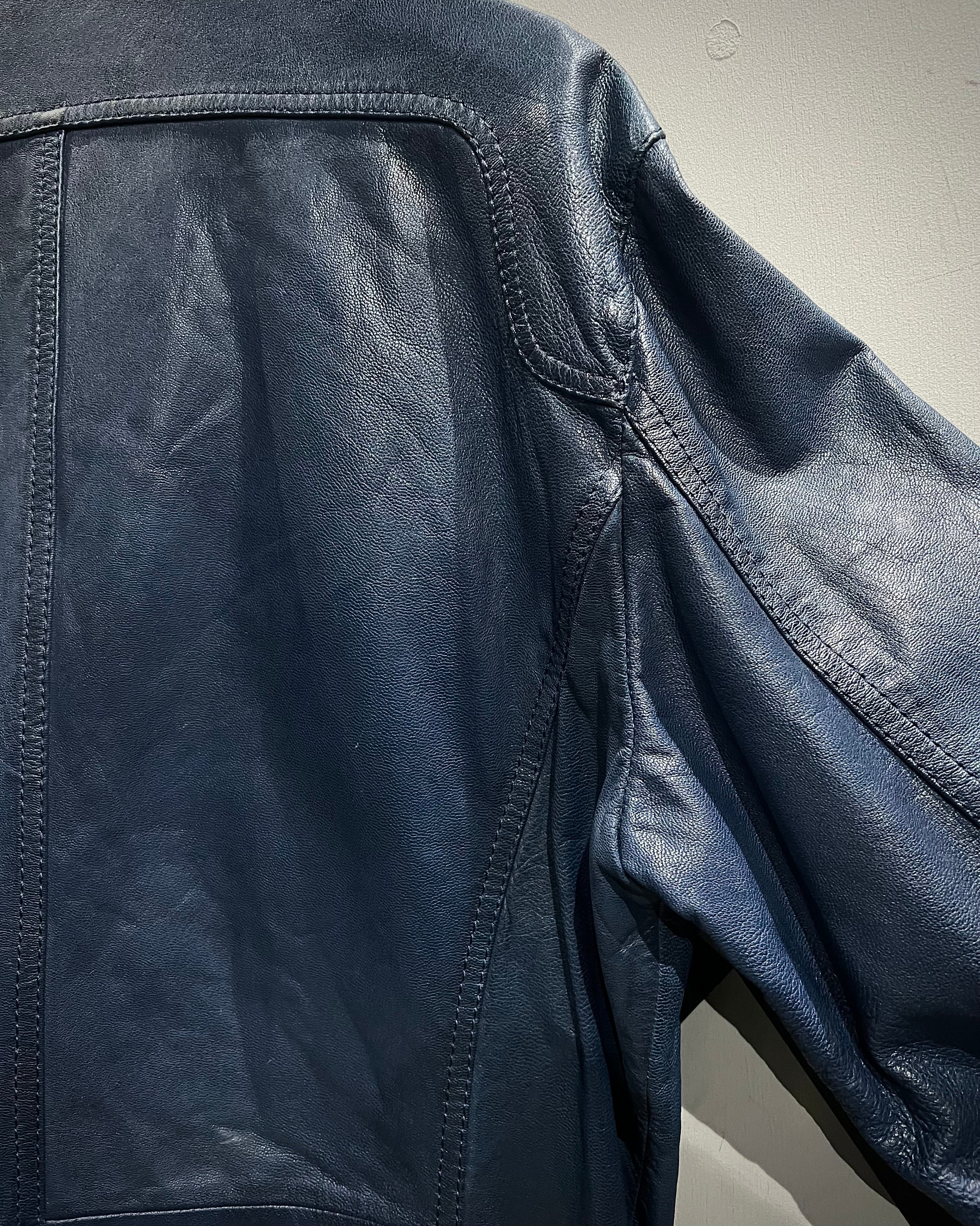 無骨なライダースの中でも一際異彩を放つ、ブルーカラーのゴートナッパレザーのシングルライダースジャケット。