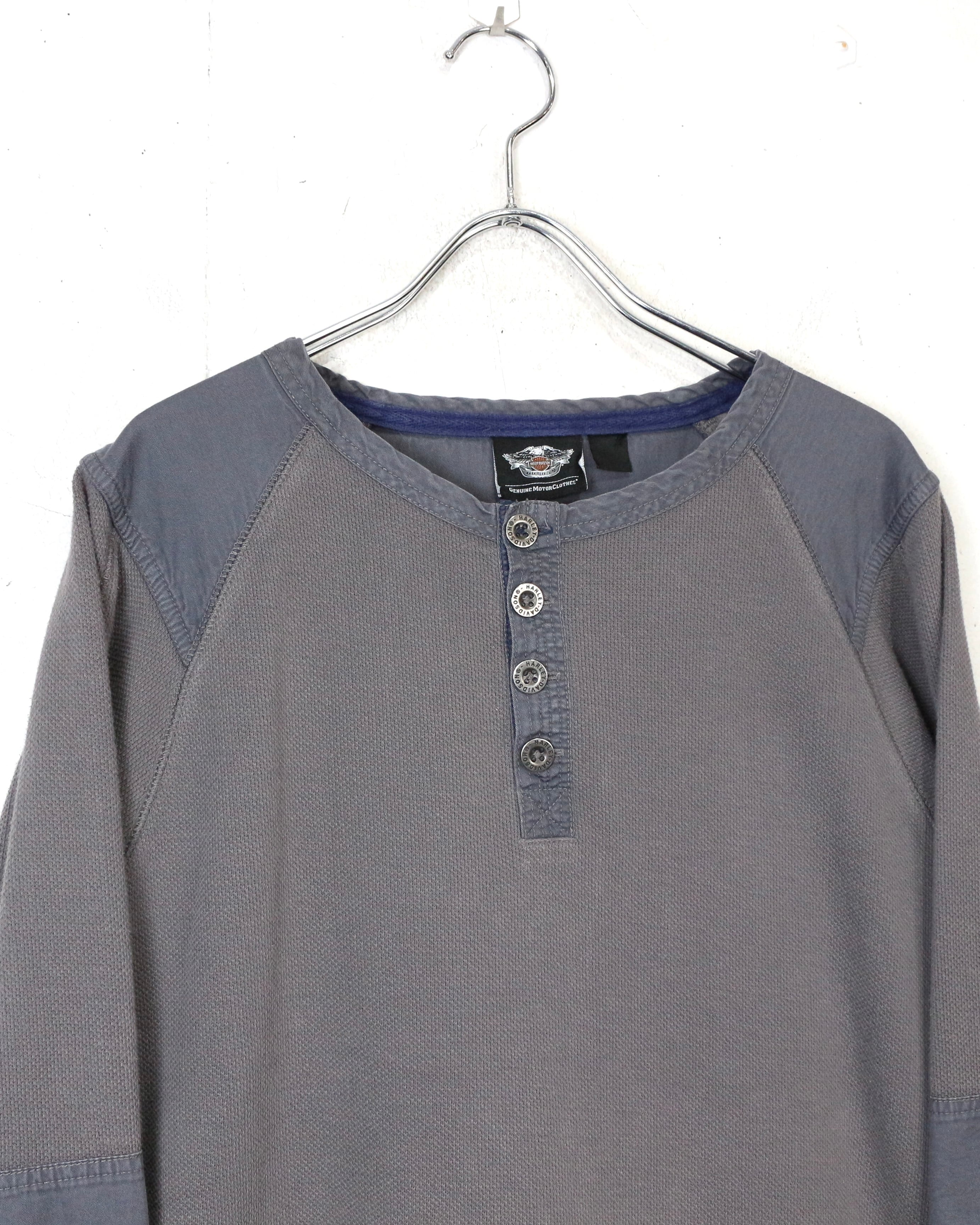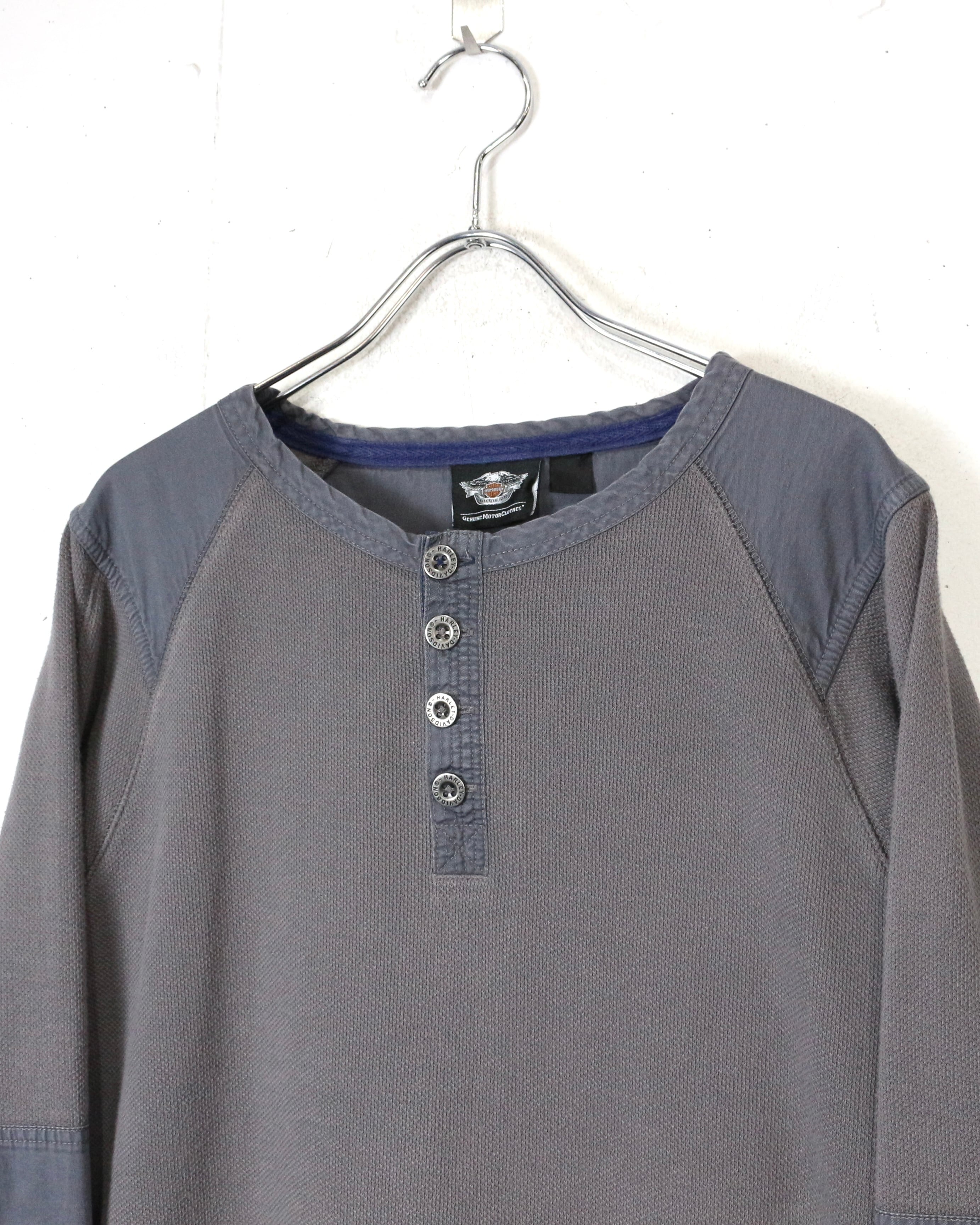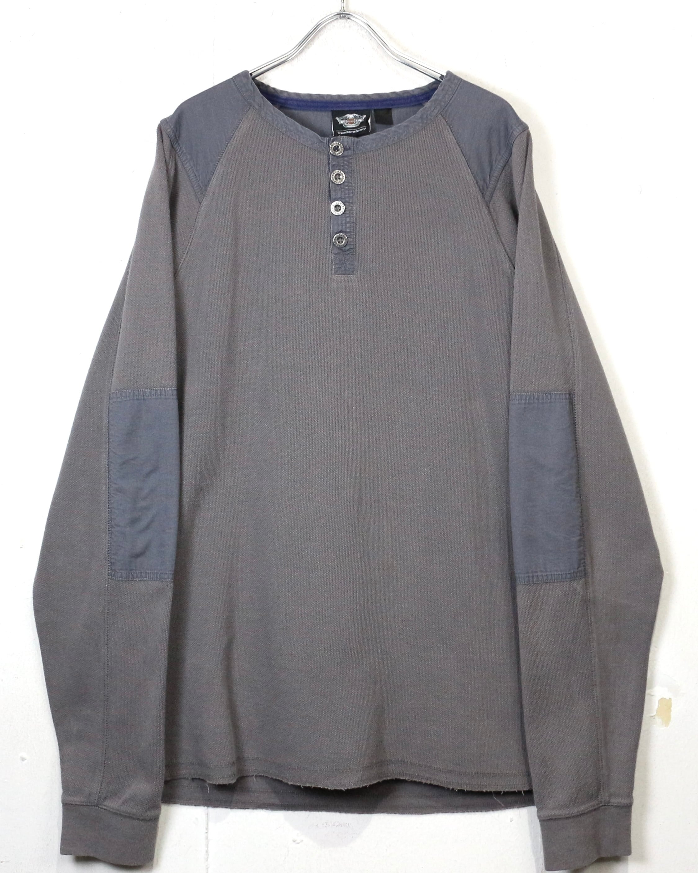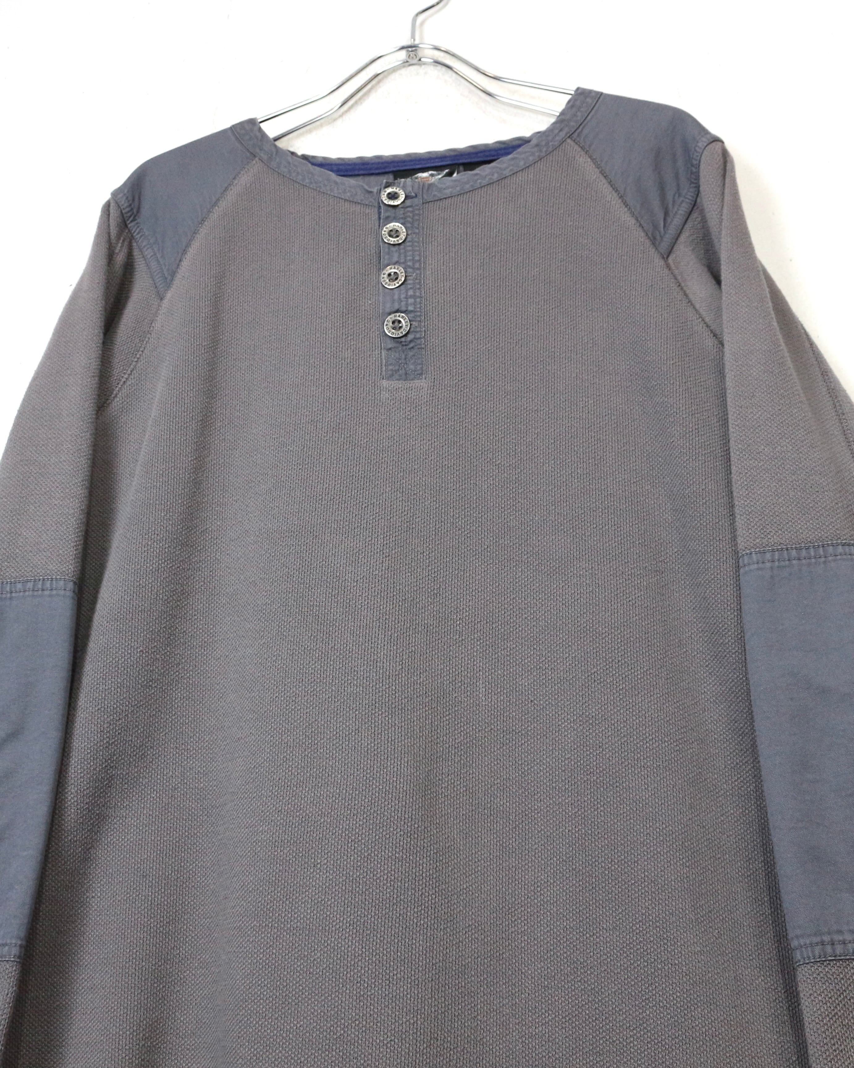 首元はブランド刻印入りのボタンを備えたヘンリーネック仕様に、肩と肘には補強パッチを配置。ライディング時の摩耗を想定したディテールで、Harleyらしい実用性とデザイン性が見事に合わさっています。