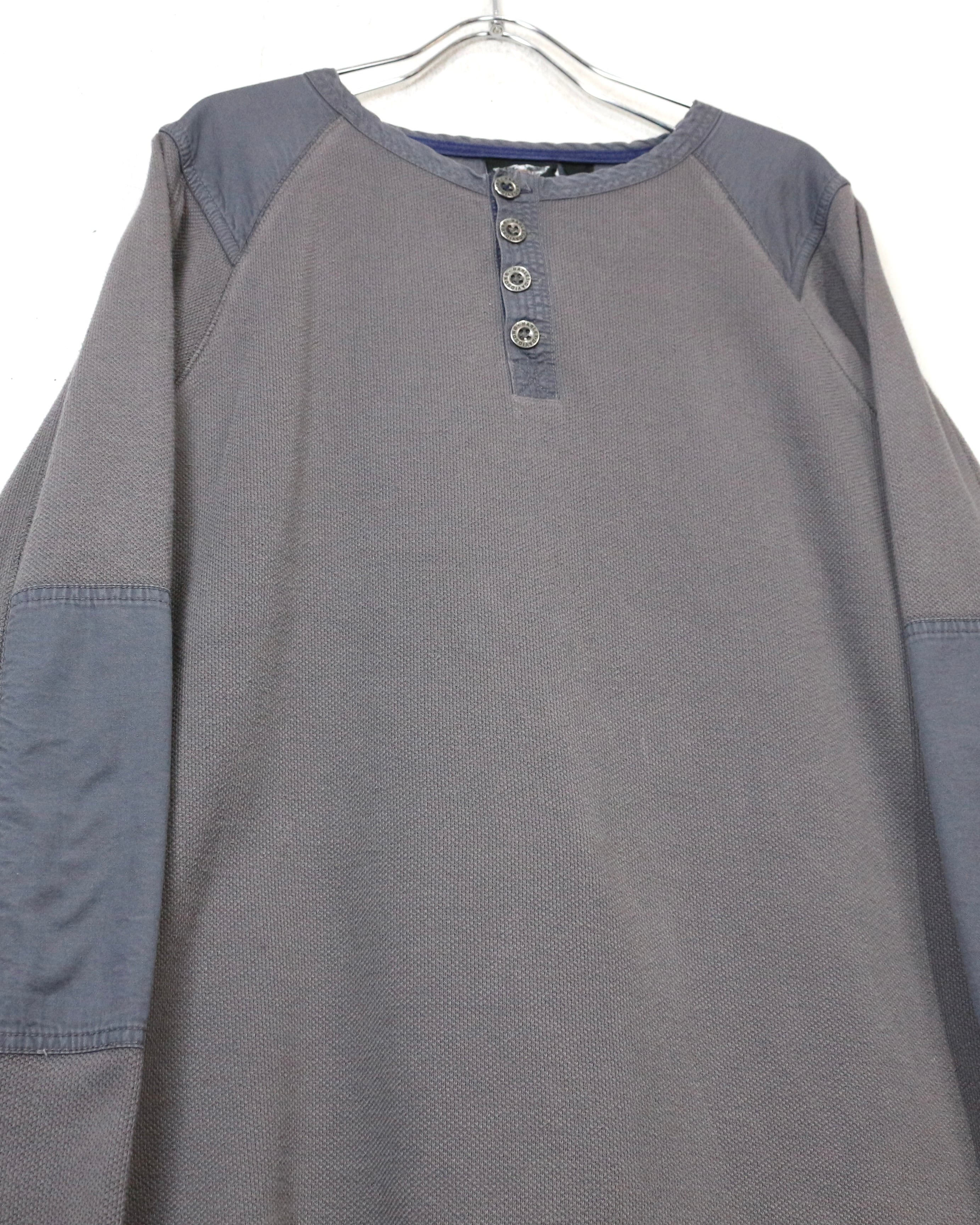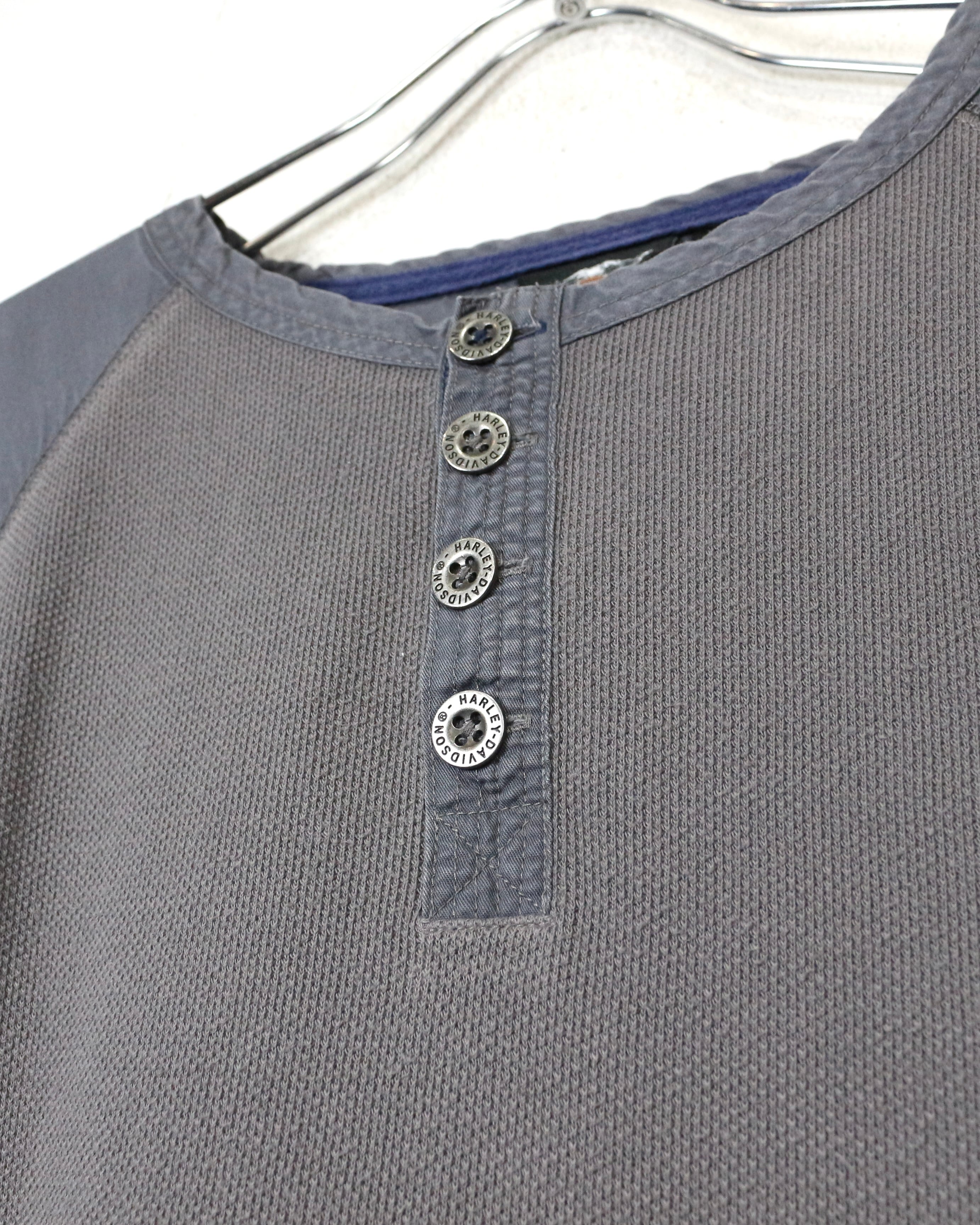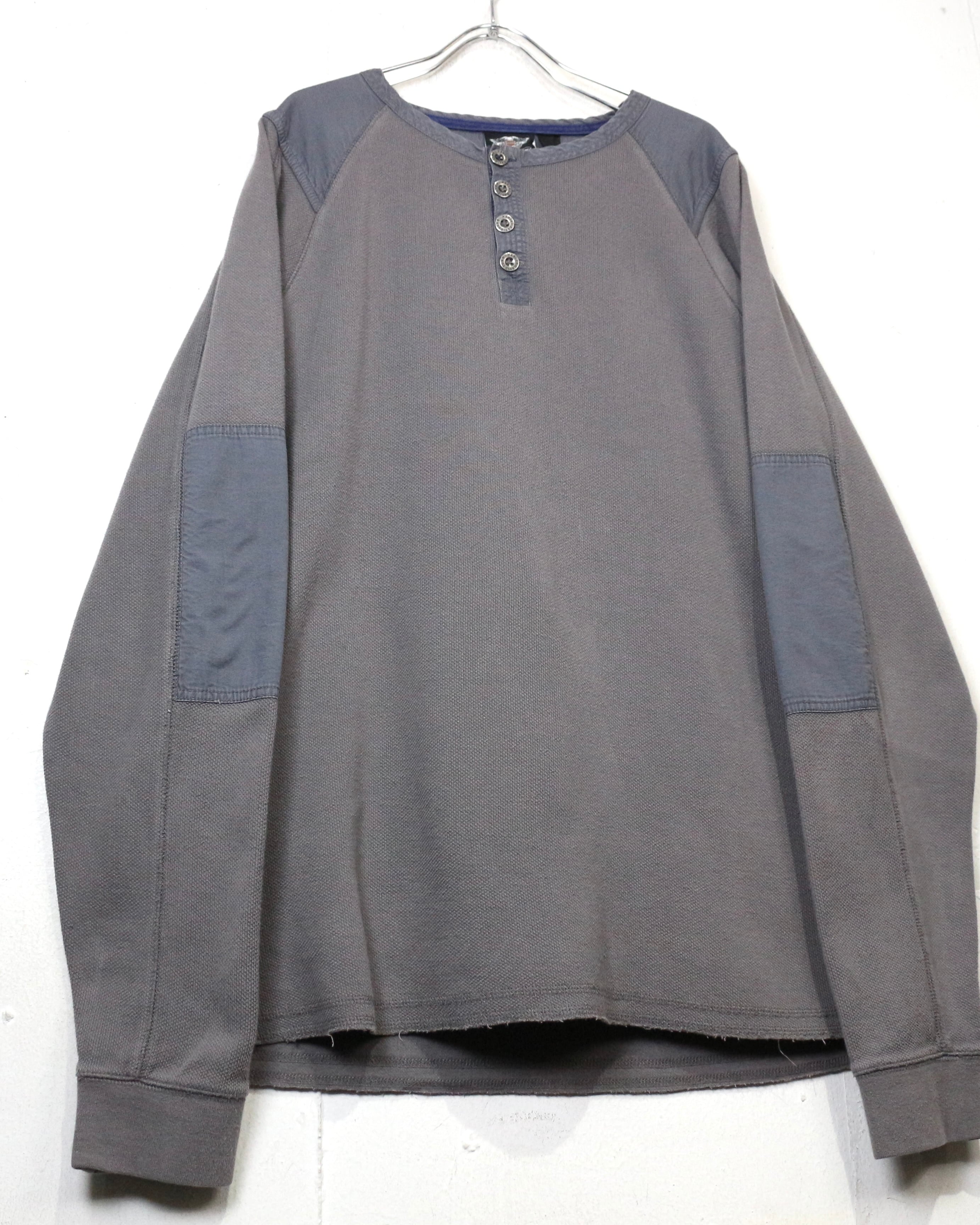 首元はブランド刻印入りのボタンを備えたヘンリーネック仕様に、肩と肘には補強パッチを配置。ライディング時の摩耗を想定したディテールで、Harleyらしい実用性とデザイン性が見事に合わさっています。