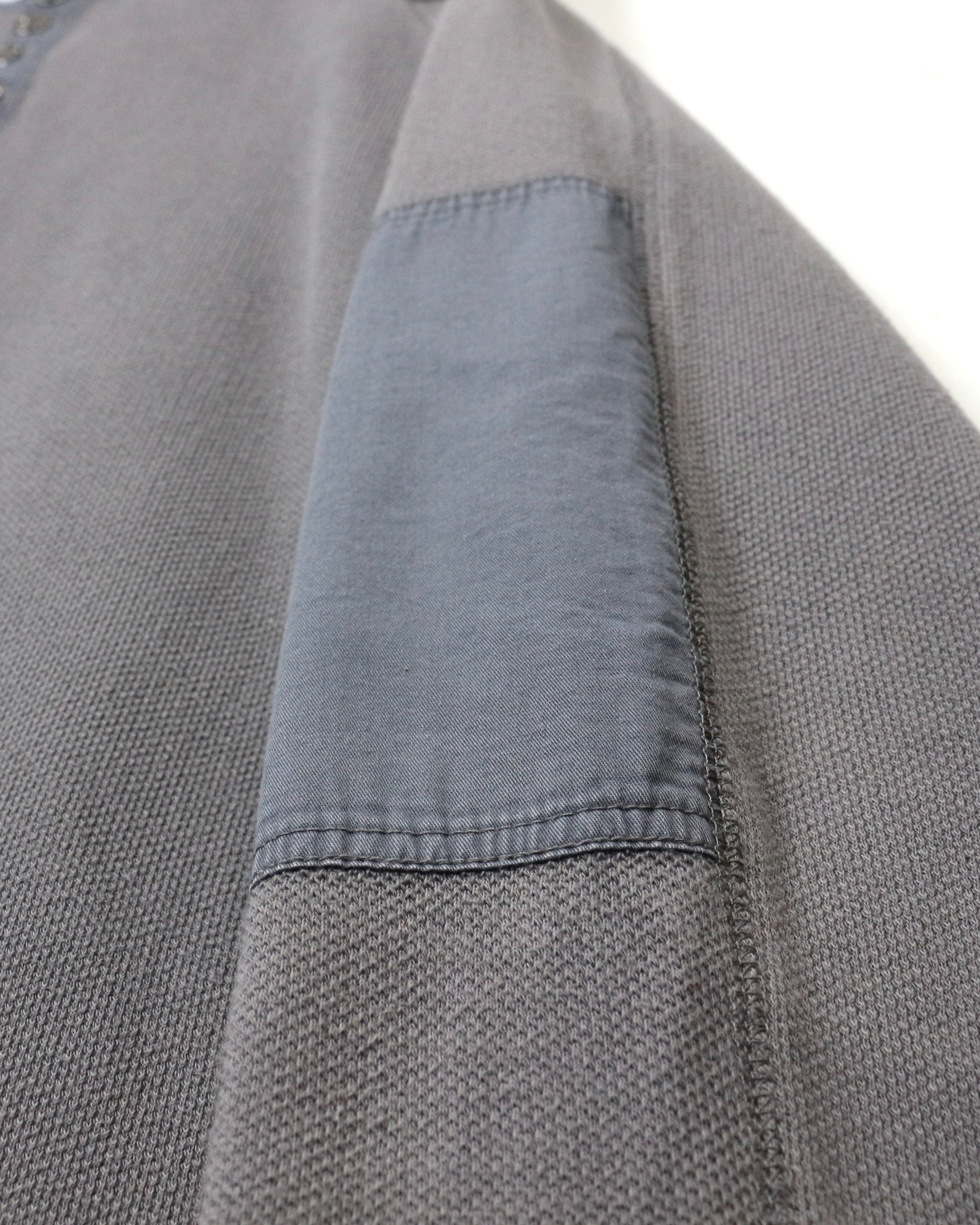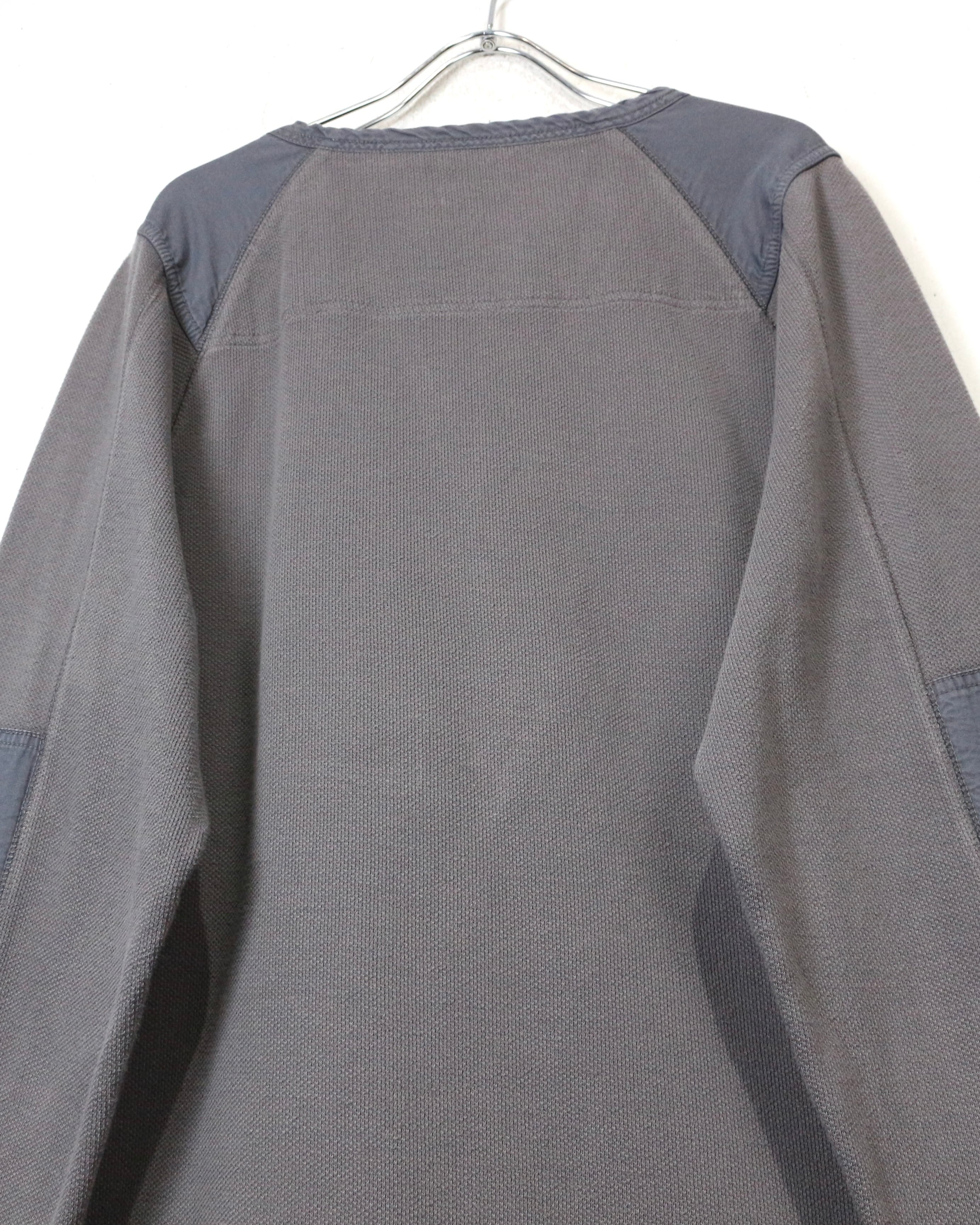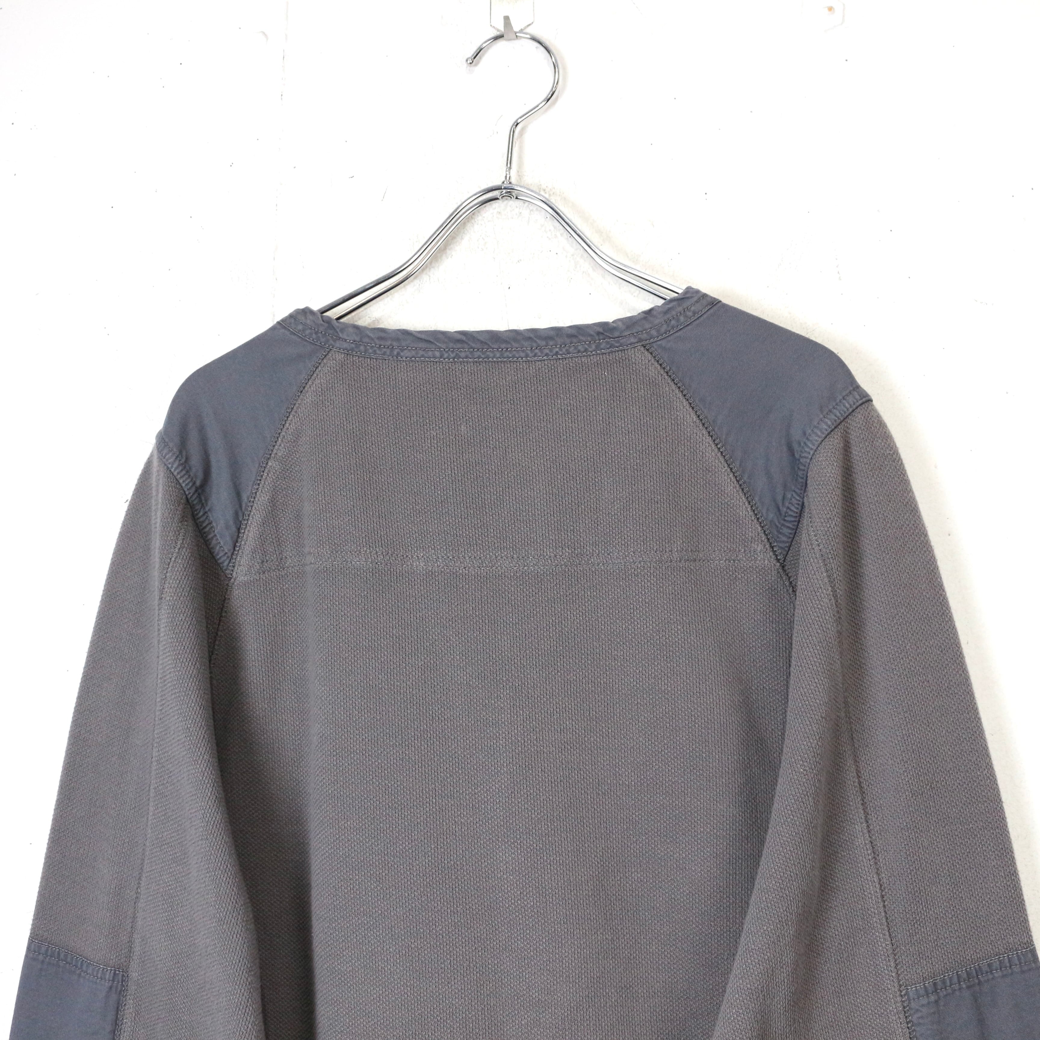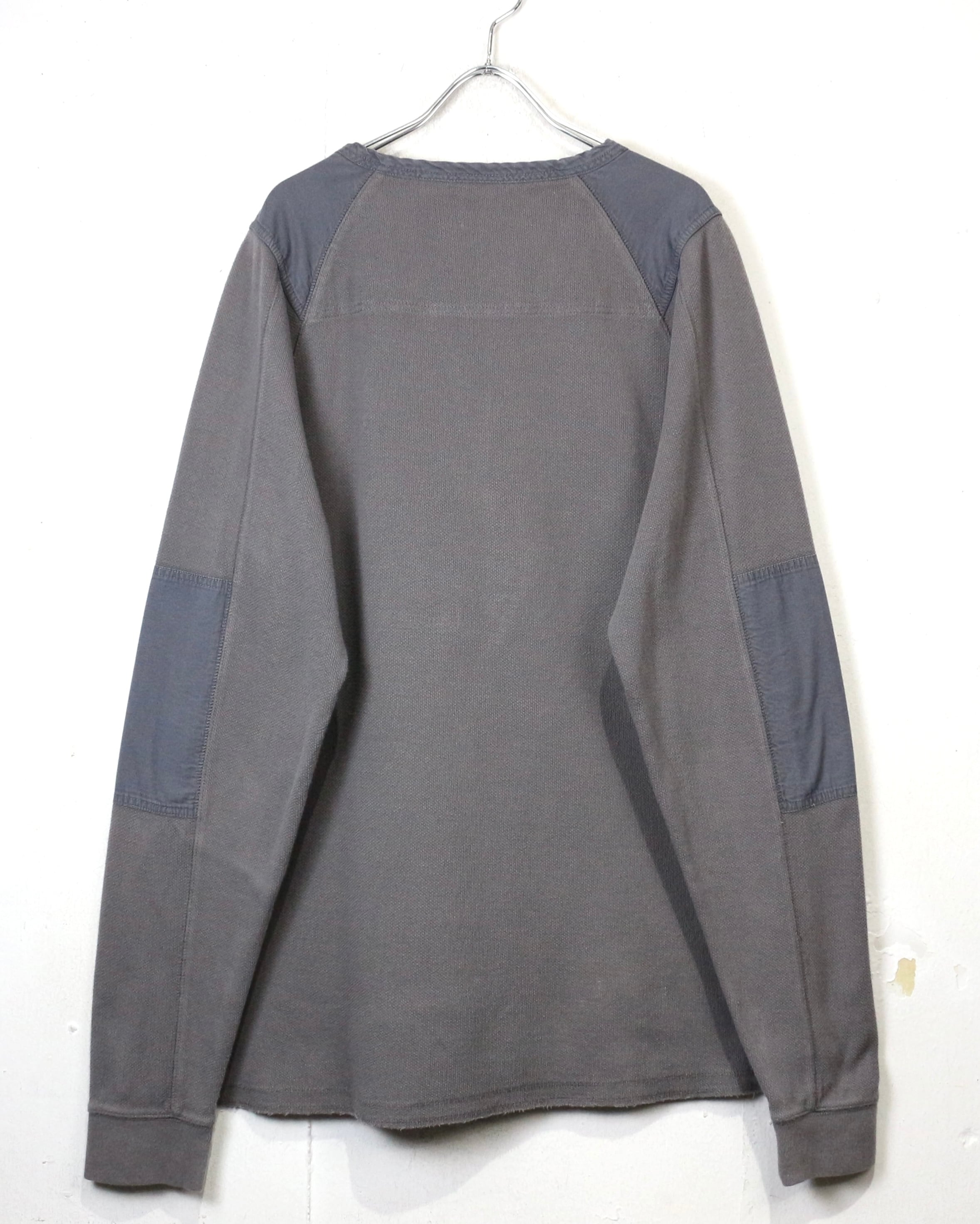 首元はブランド刻印入りのボタンを備えたヘンリーネック仕様に、肩と肘には補強パッチを配置。ライディング時の摩耗を想定したディテールで、Harleyらしい実用性とデザイン性が見事に合わさっています。