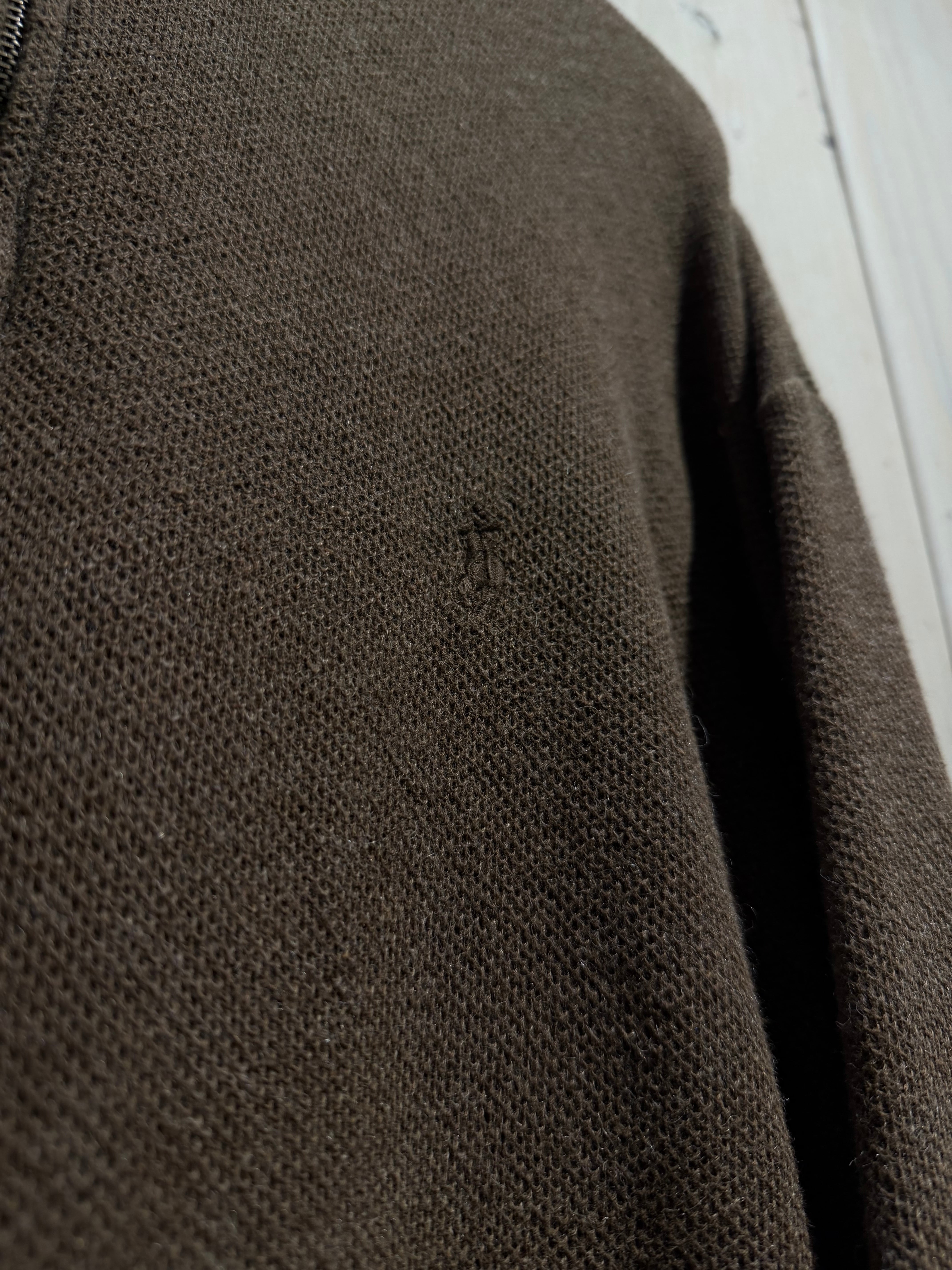 フロントはハーフジップ仕様に、胸元には同色であしらわれたポニー刺繍。主張を抑えたミニマルなデザインながら、ブランドアイコンがさりげなく存在感を演出します。