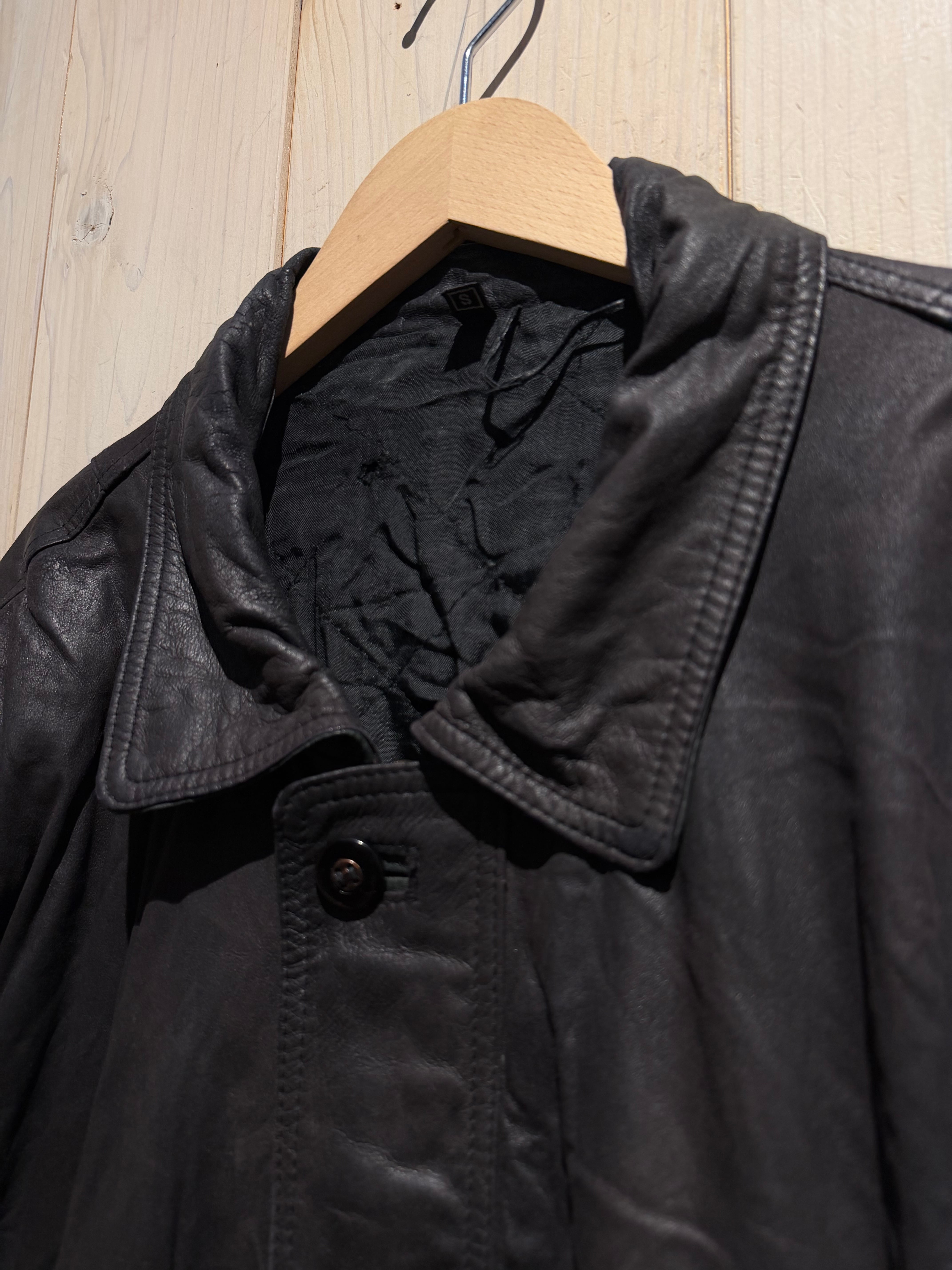 襟裏やボタンの留め口部分など随所にカーキのレザーを切り替え、ブラックのボディにアクセントとして映える1着。