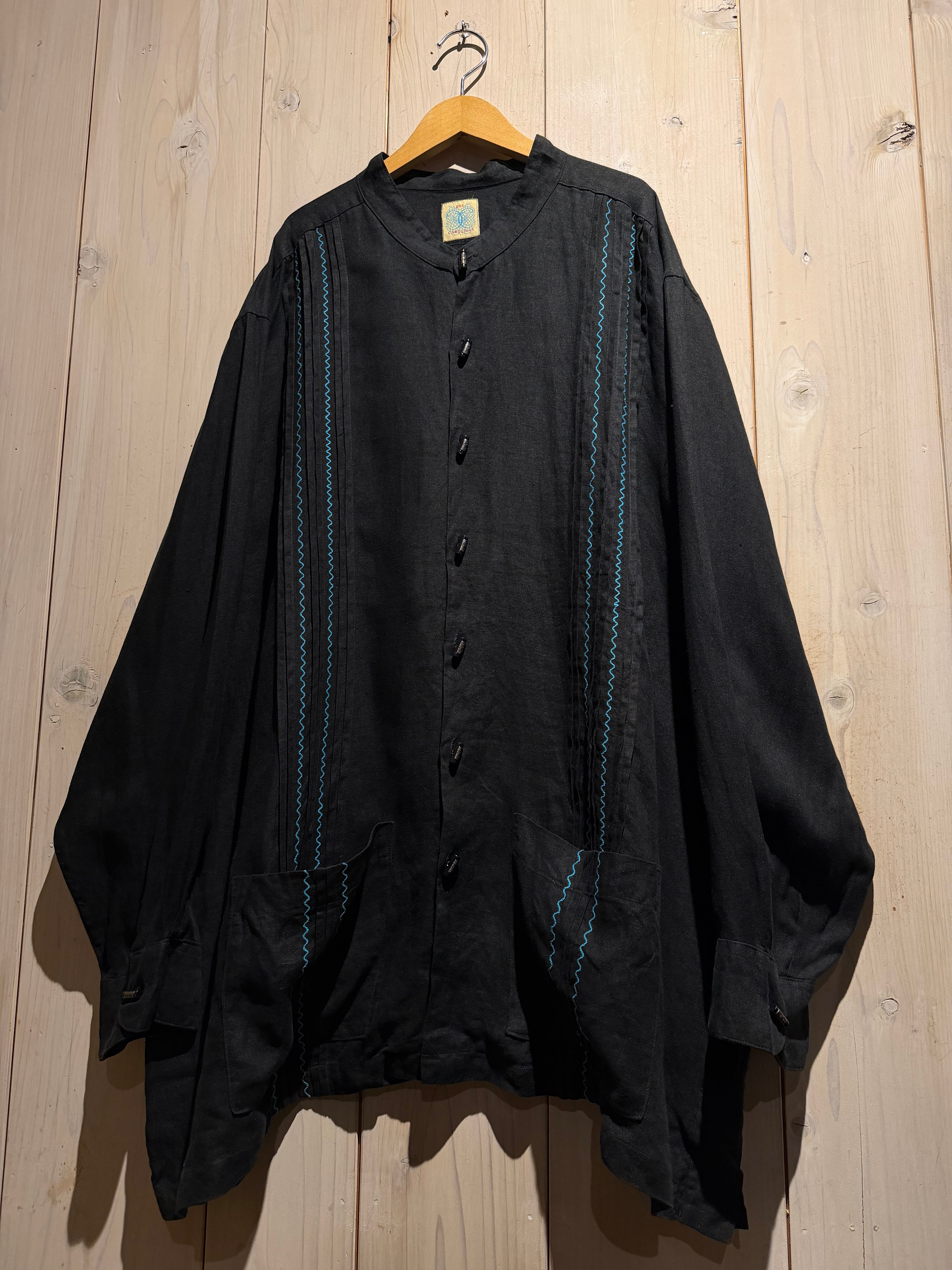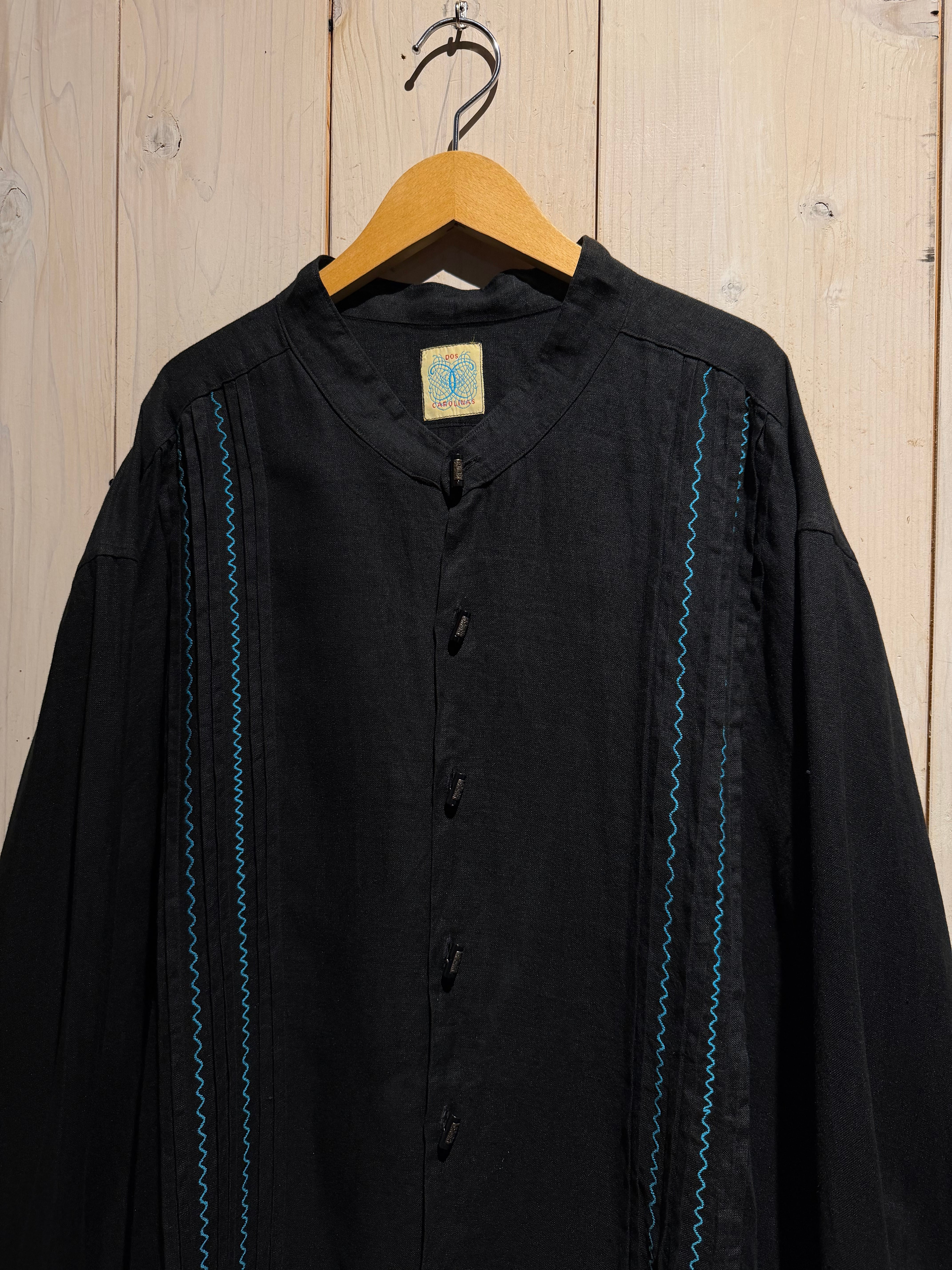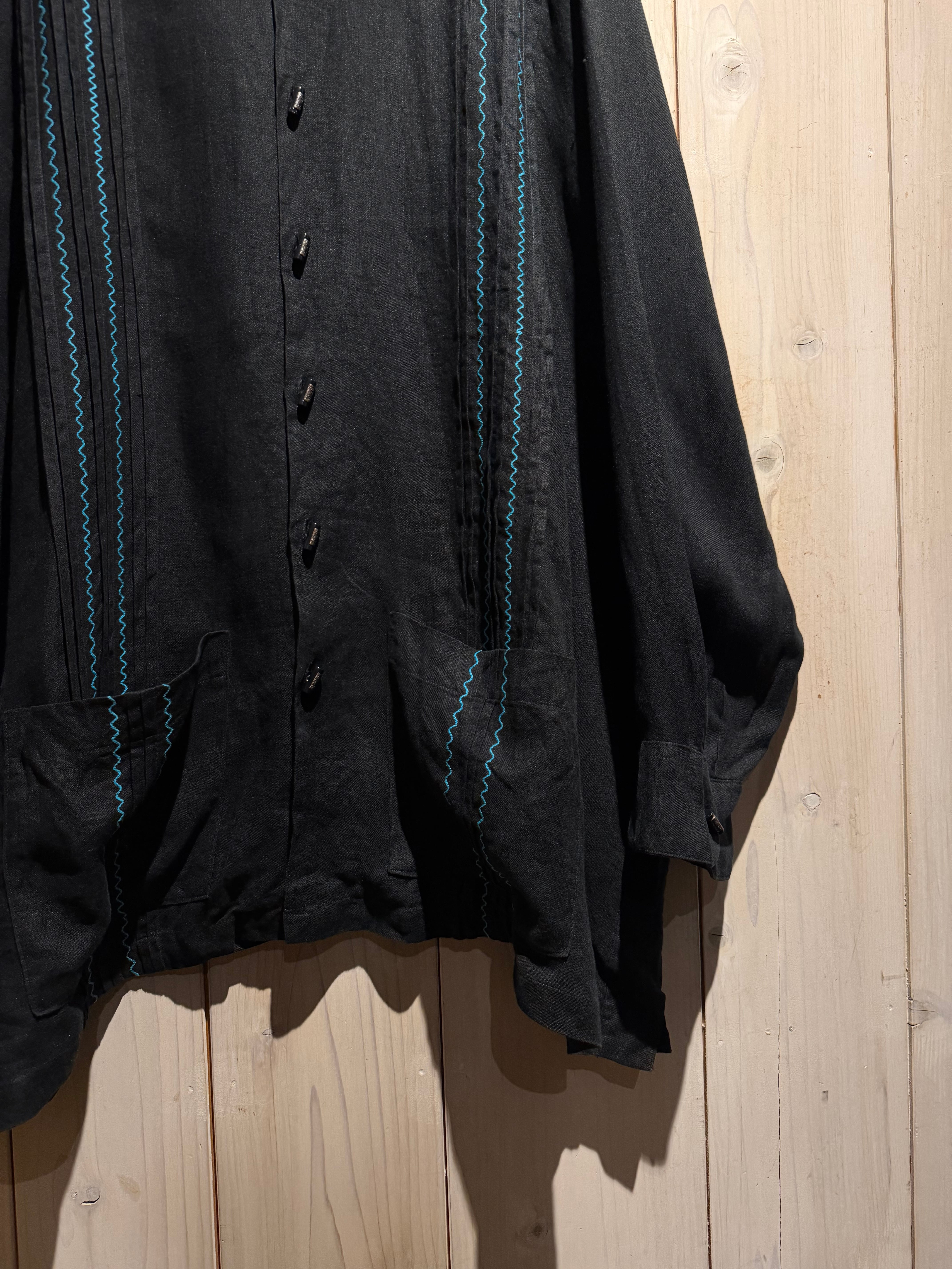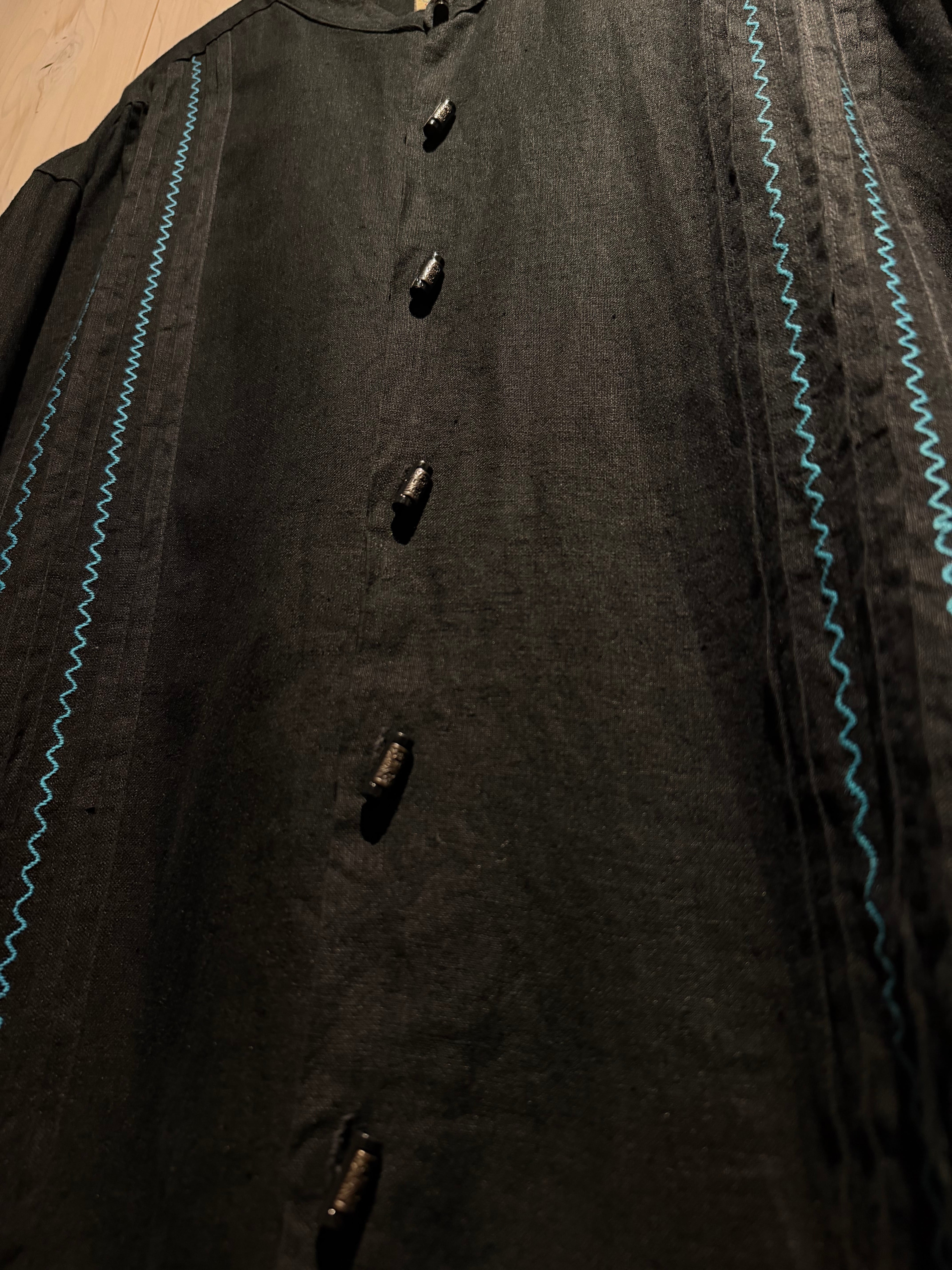 フロントには装飾性の高い飾りボタンを配置、随所にメキシカンやキューバシャツを彷彿とさせるディテールに、ターコイズカラーのジグザグ刺繍が民族的な雰囲気を一層引き立てています。