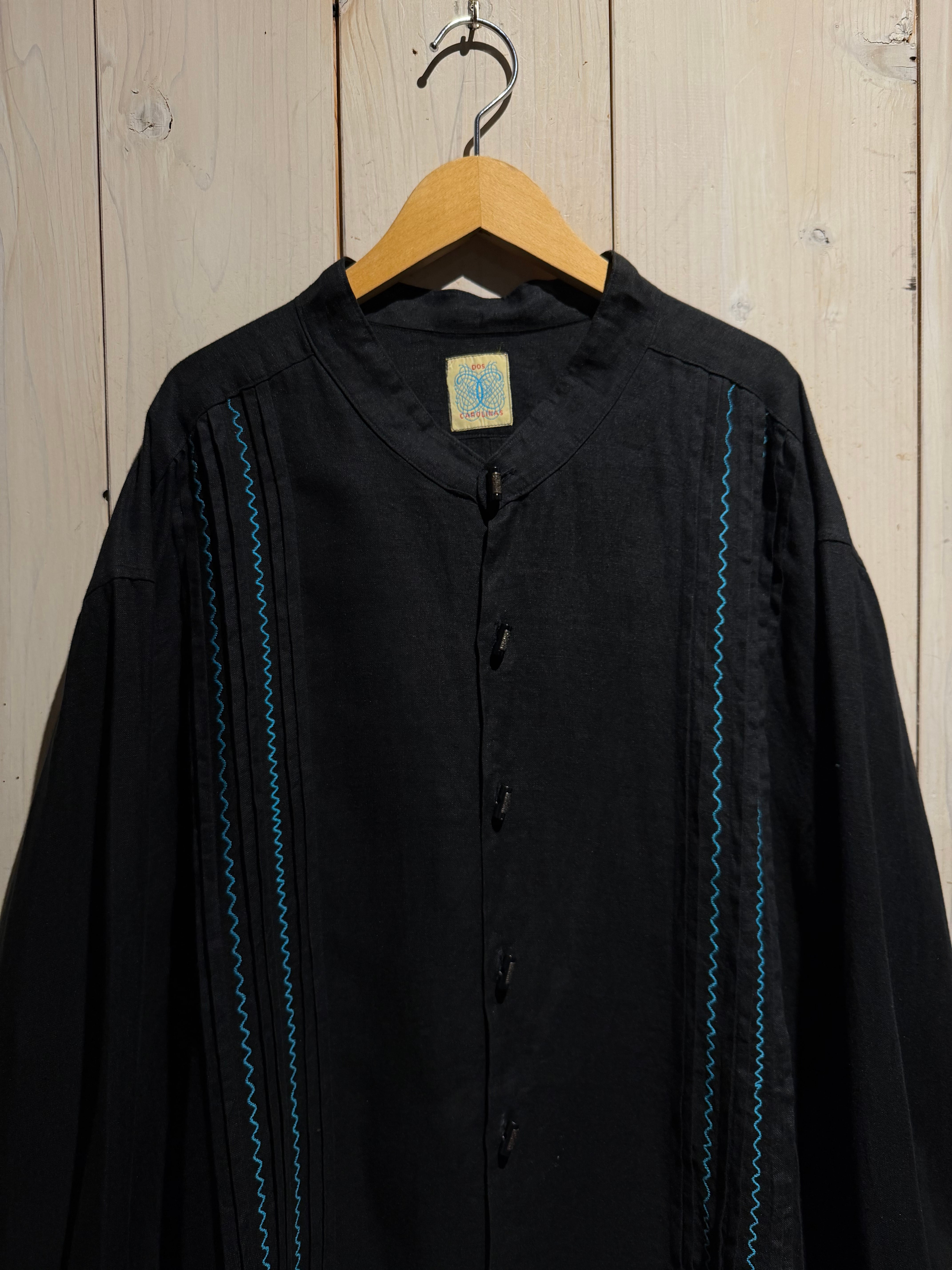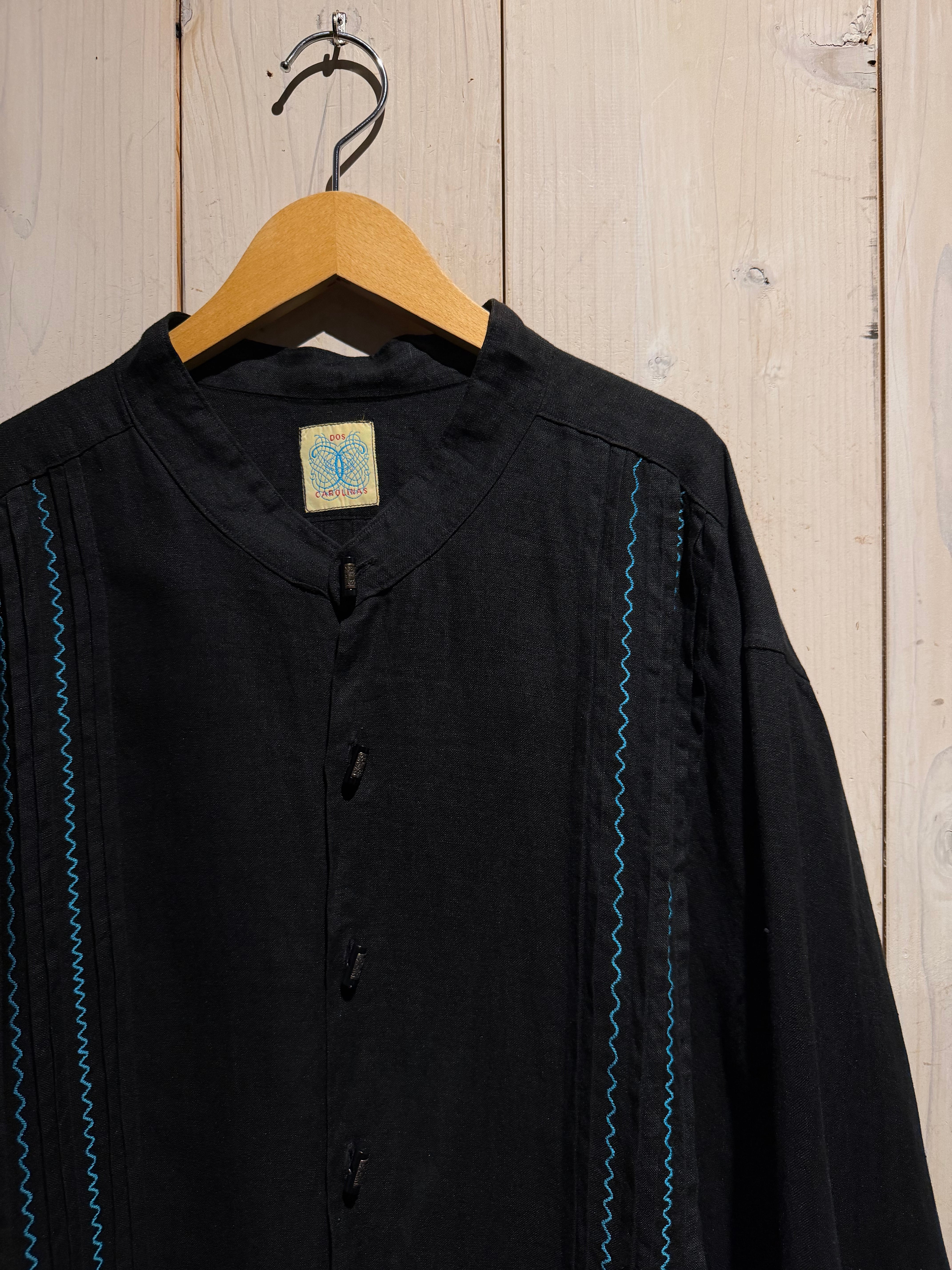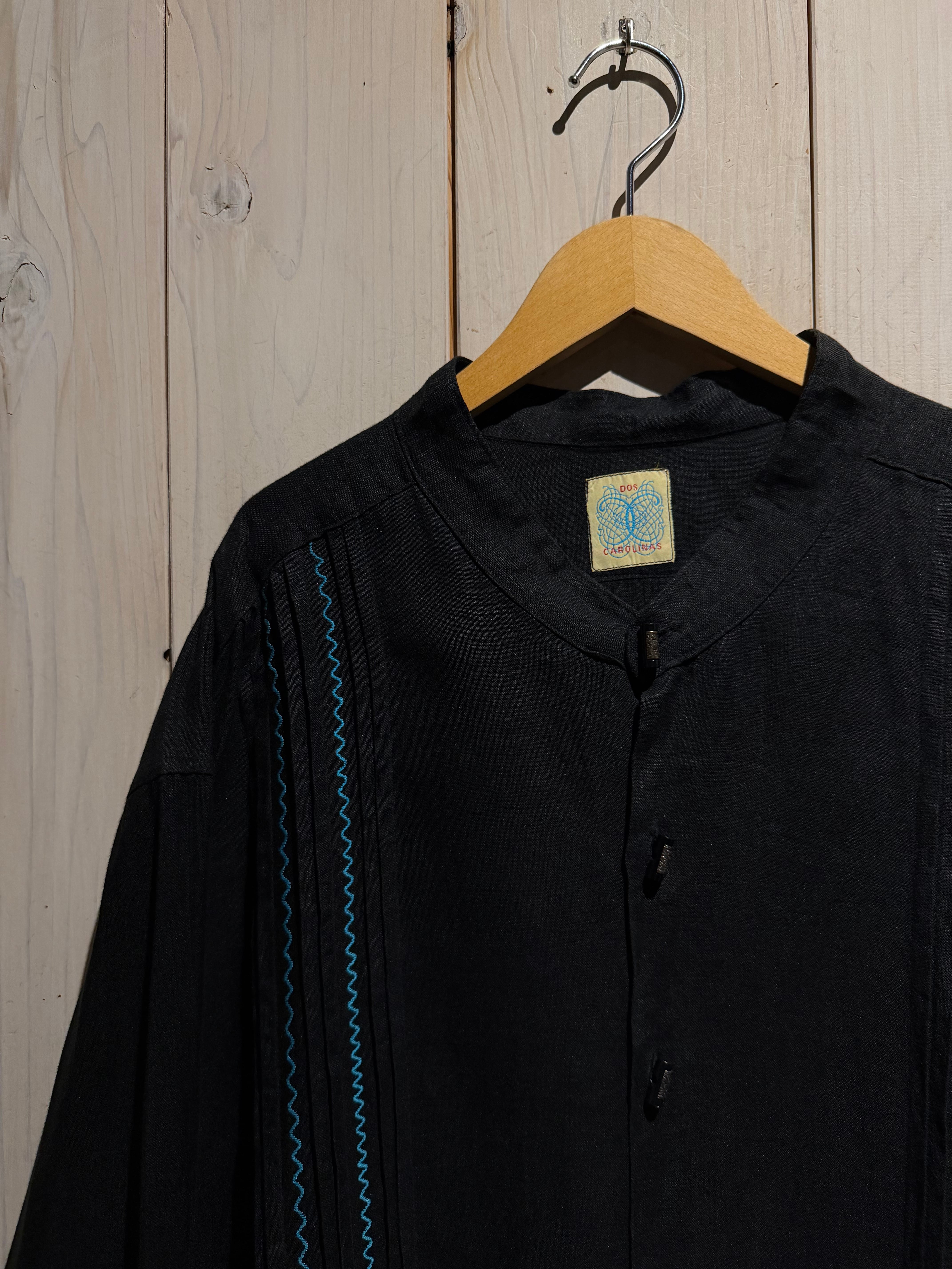 フロントには装飾性の高い飾りボタンを配置、随所にメキシカンやキューバシャツを彷彿とさせるディテールに、ターコイズカラーのジグザグ刺繍が民族的な雰囲気を一層引き立てています。