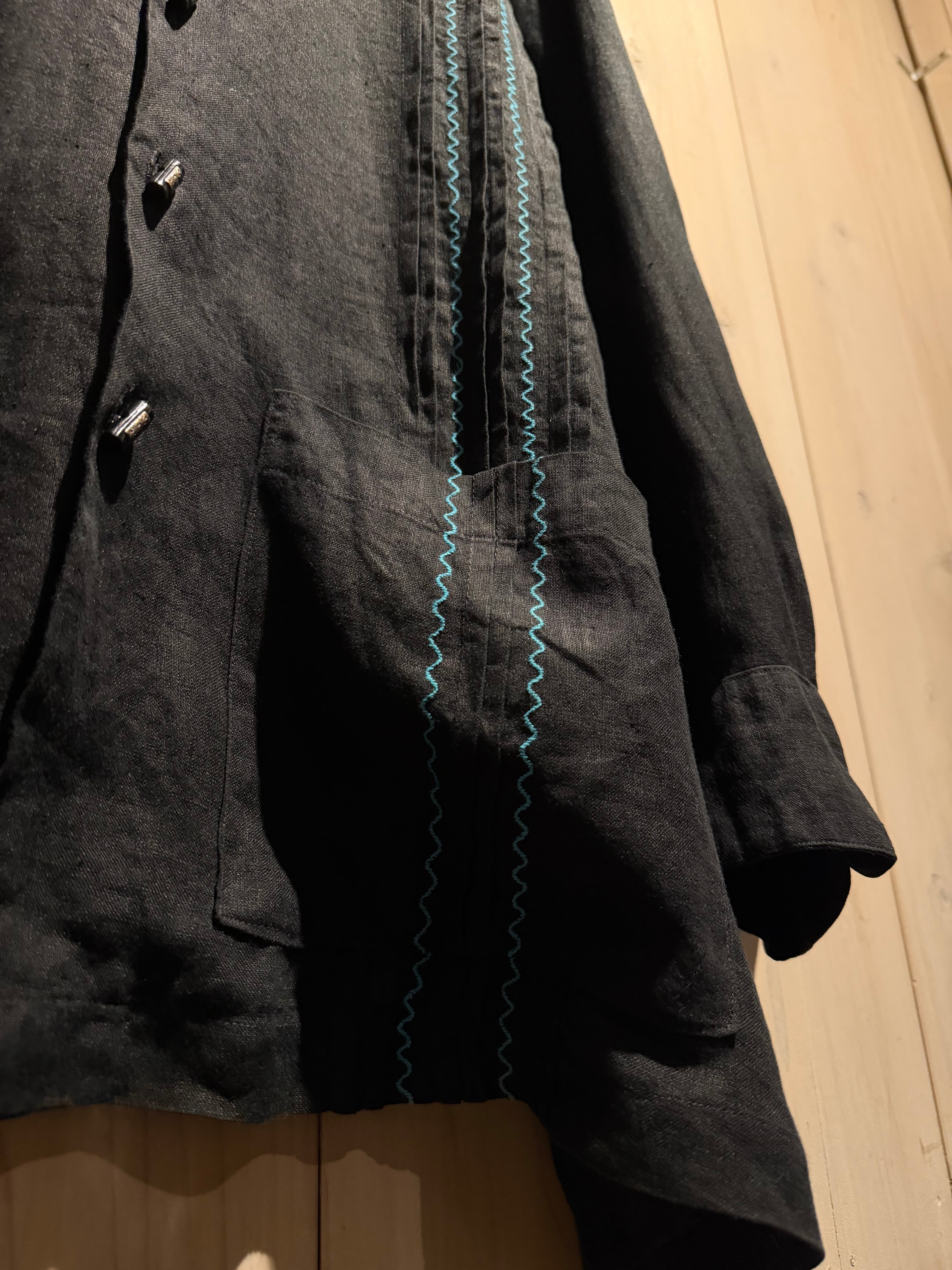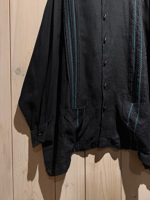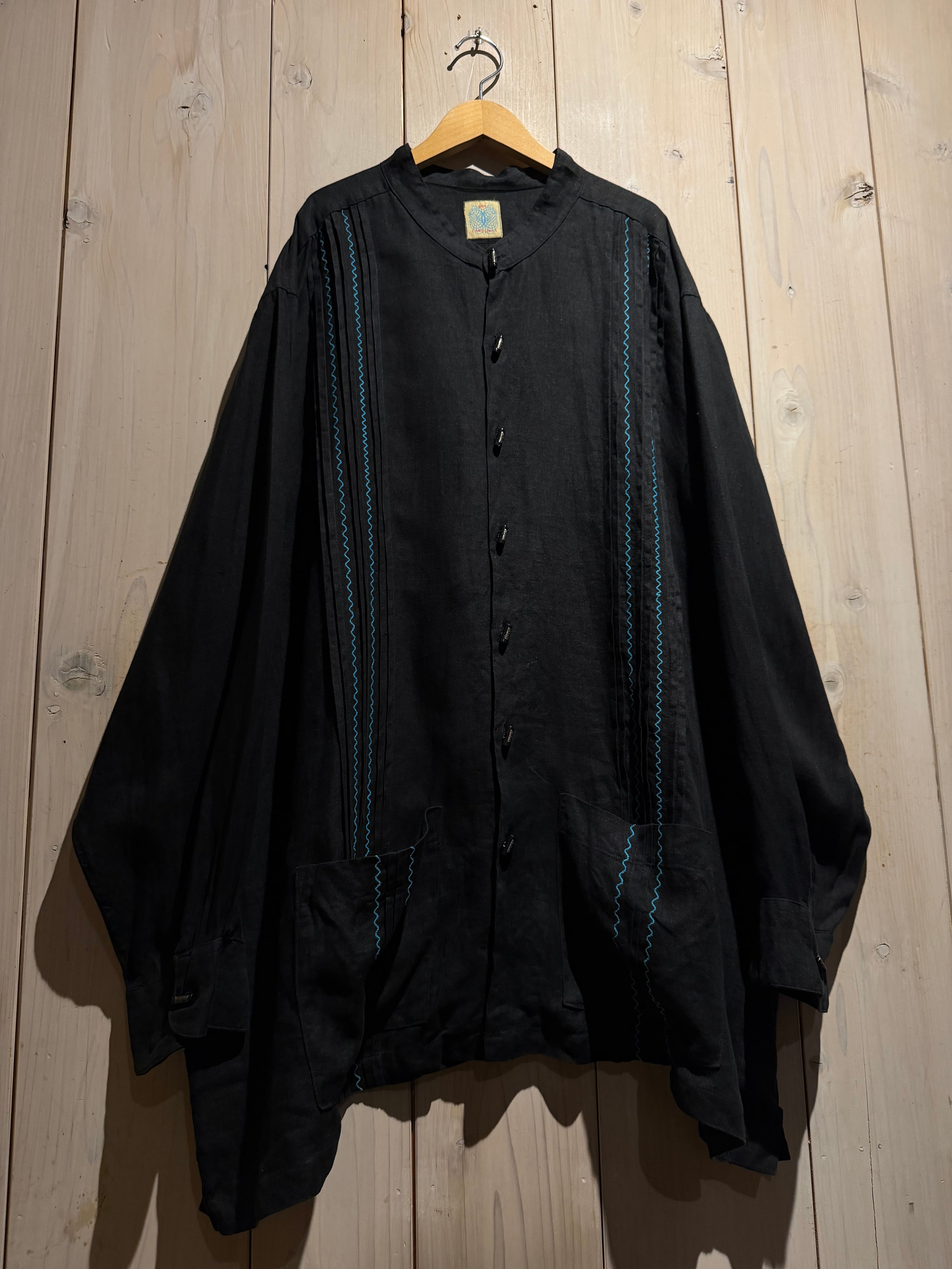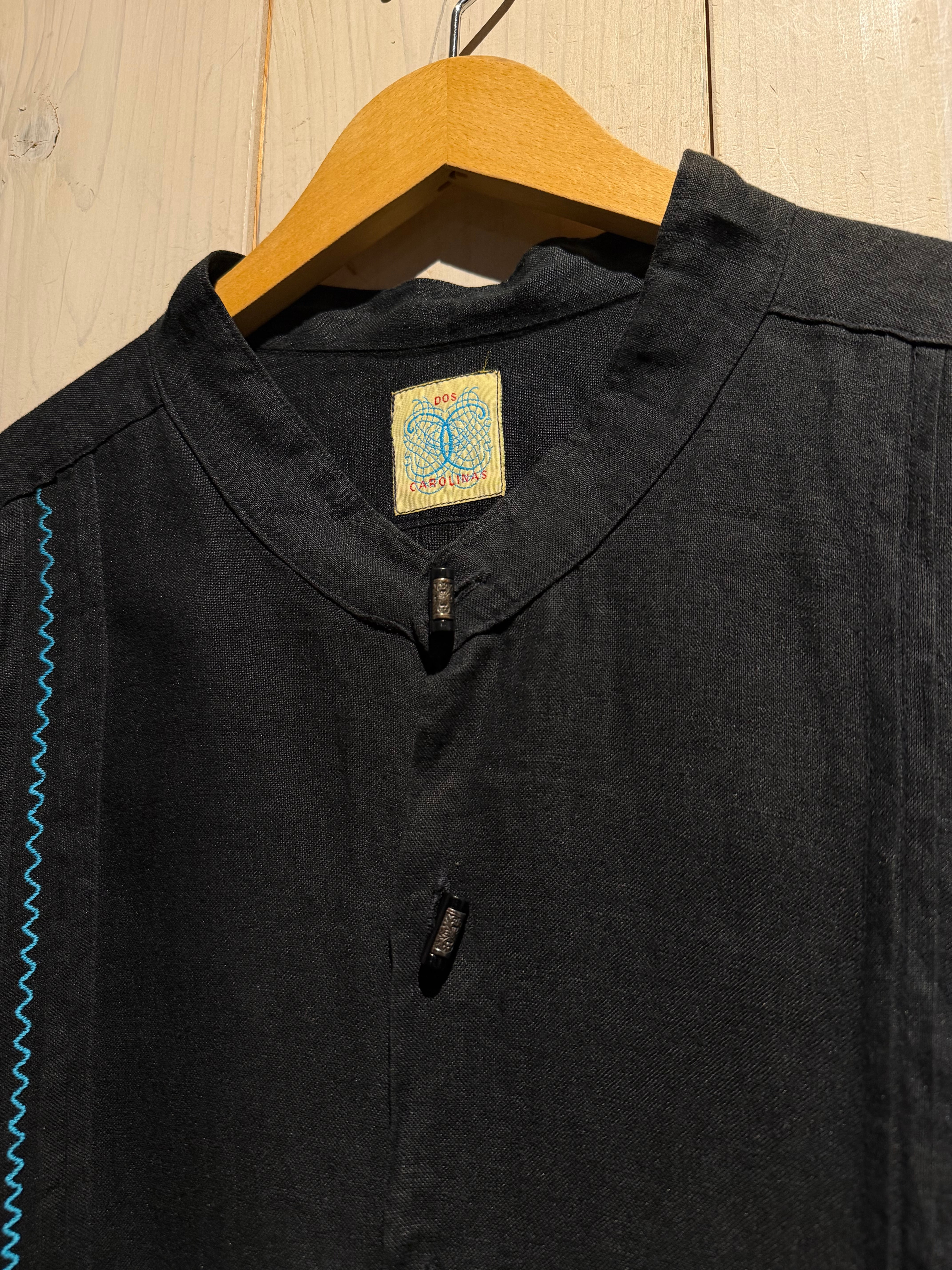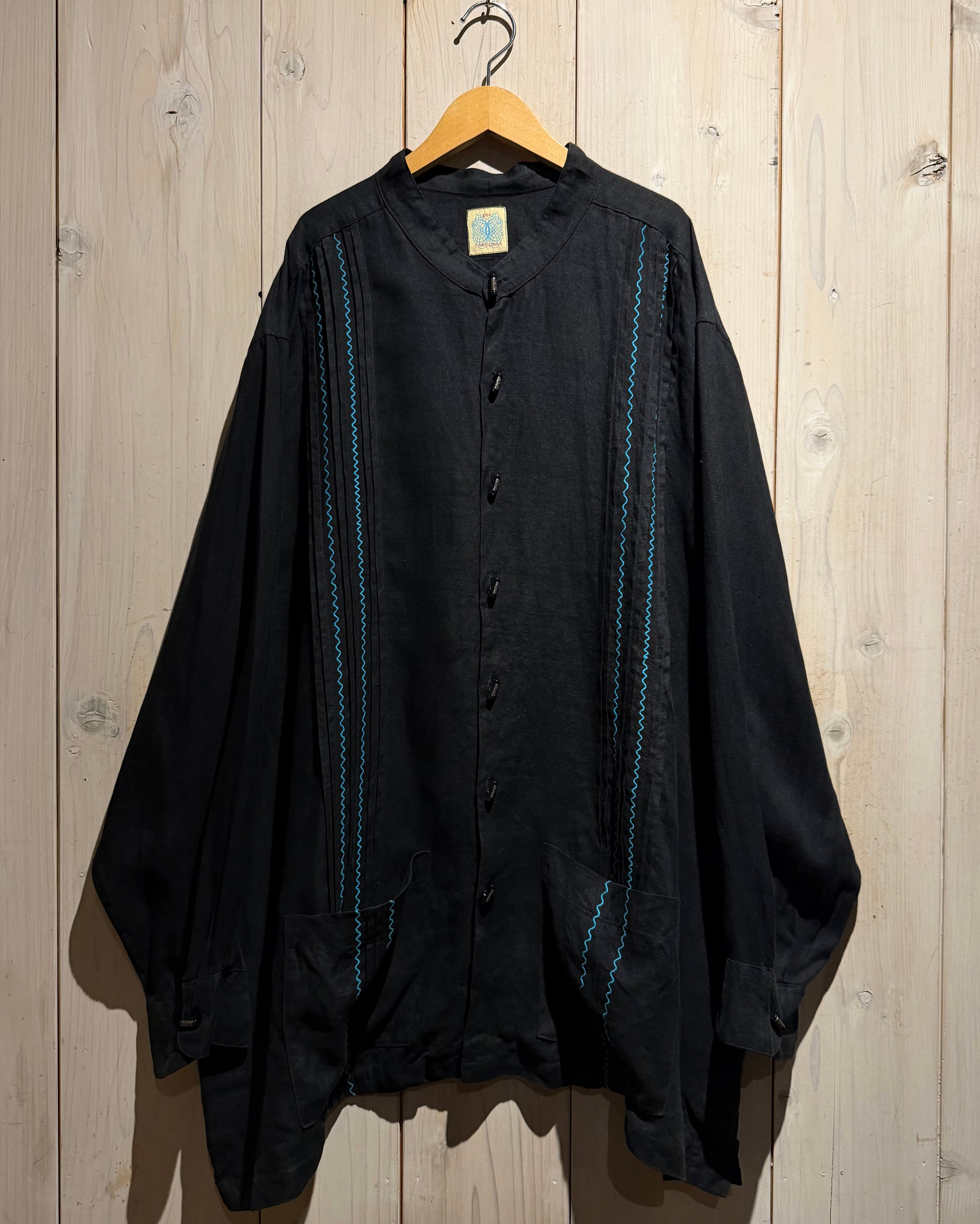 フロントには装飾性の高い飾りボタンを配置、随所にメキシカンやキューバシャツを彷彿とさせるディテールに、ターコイズカラーのジグザグ刺繍が民族的な雰囲気を一層引き立てています。