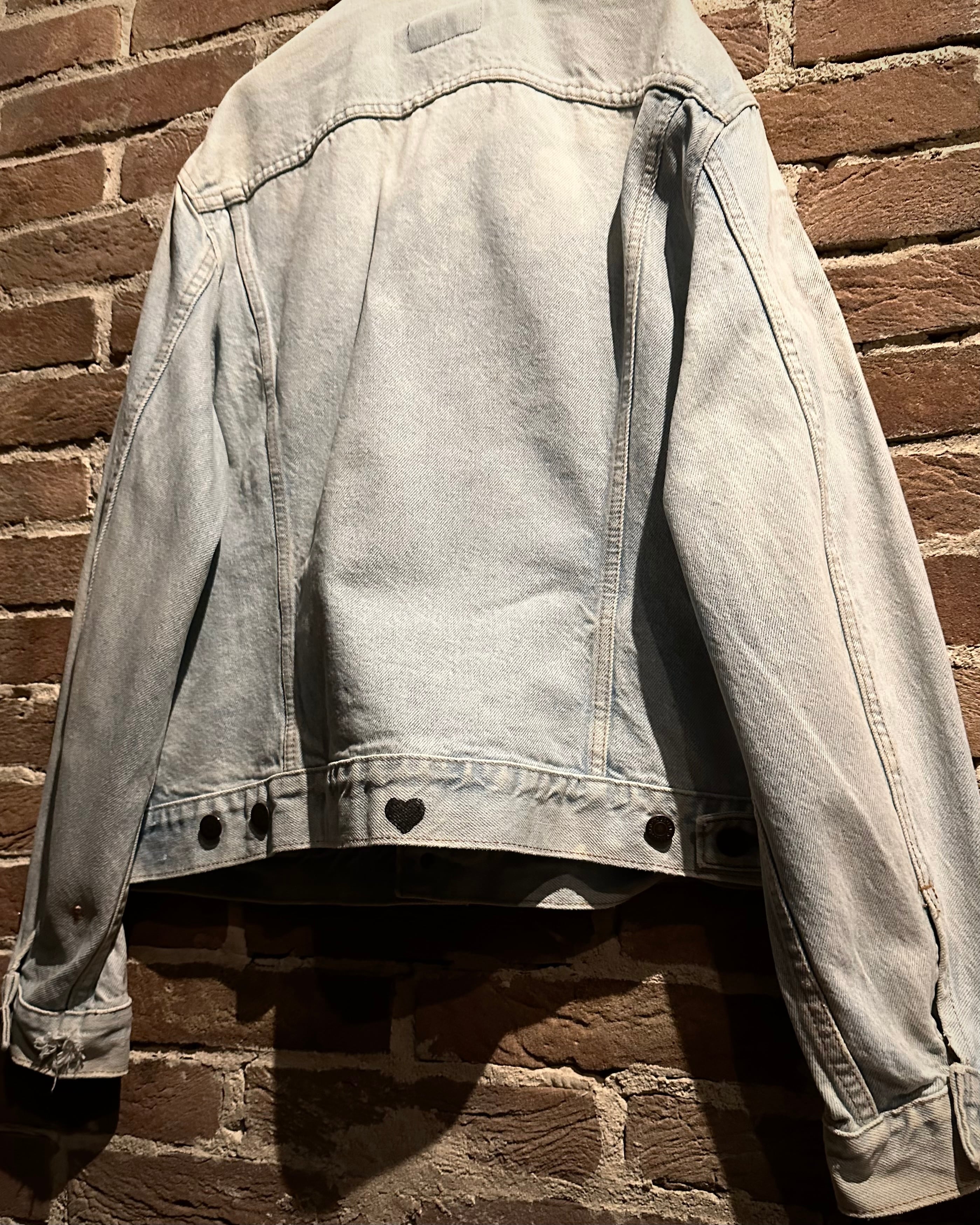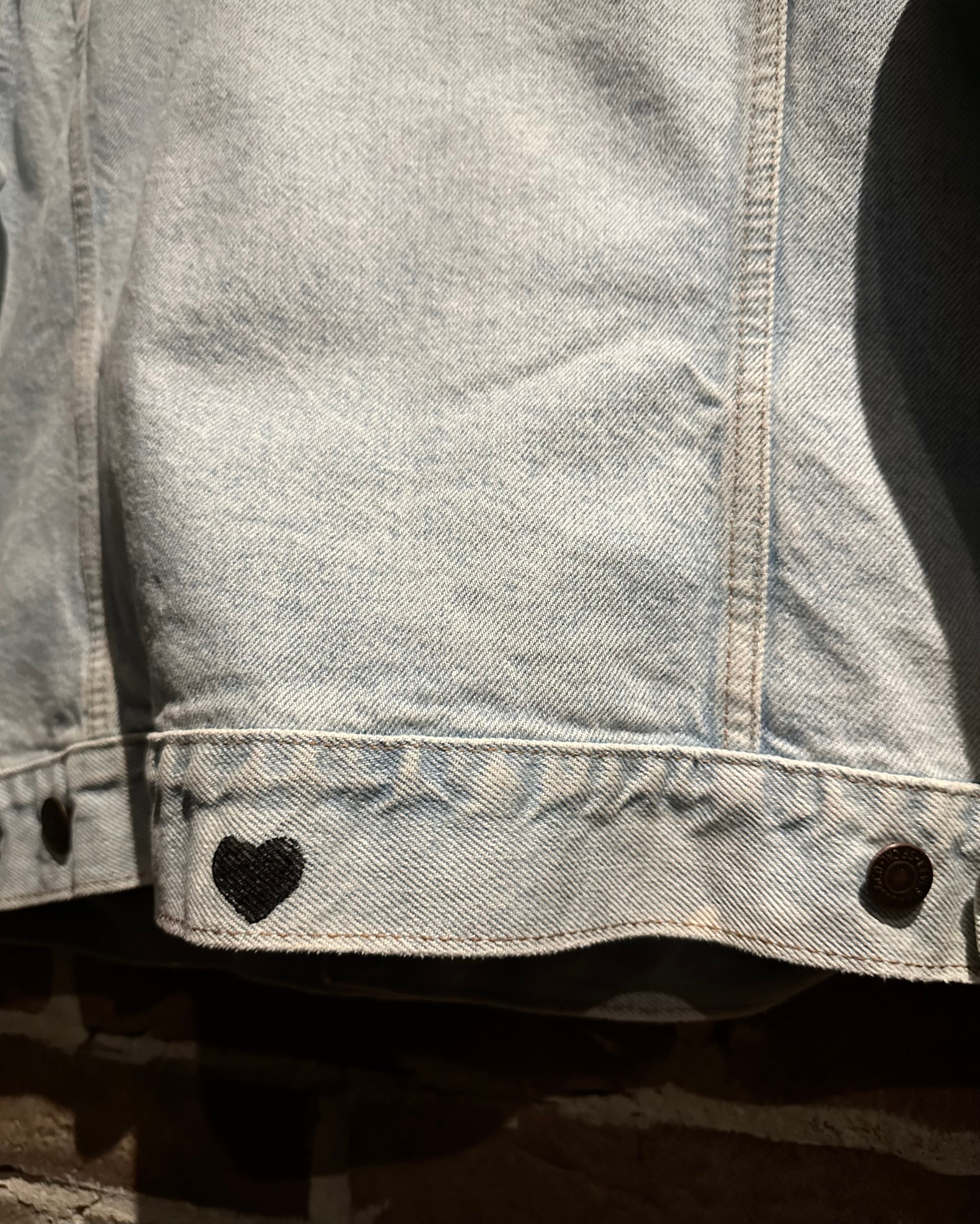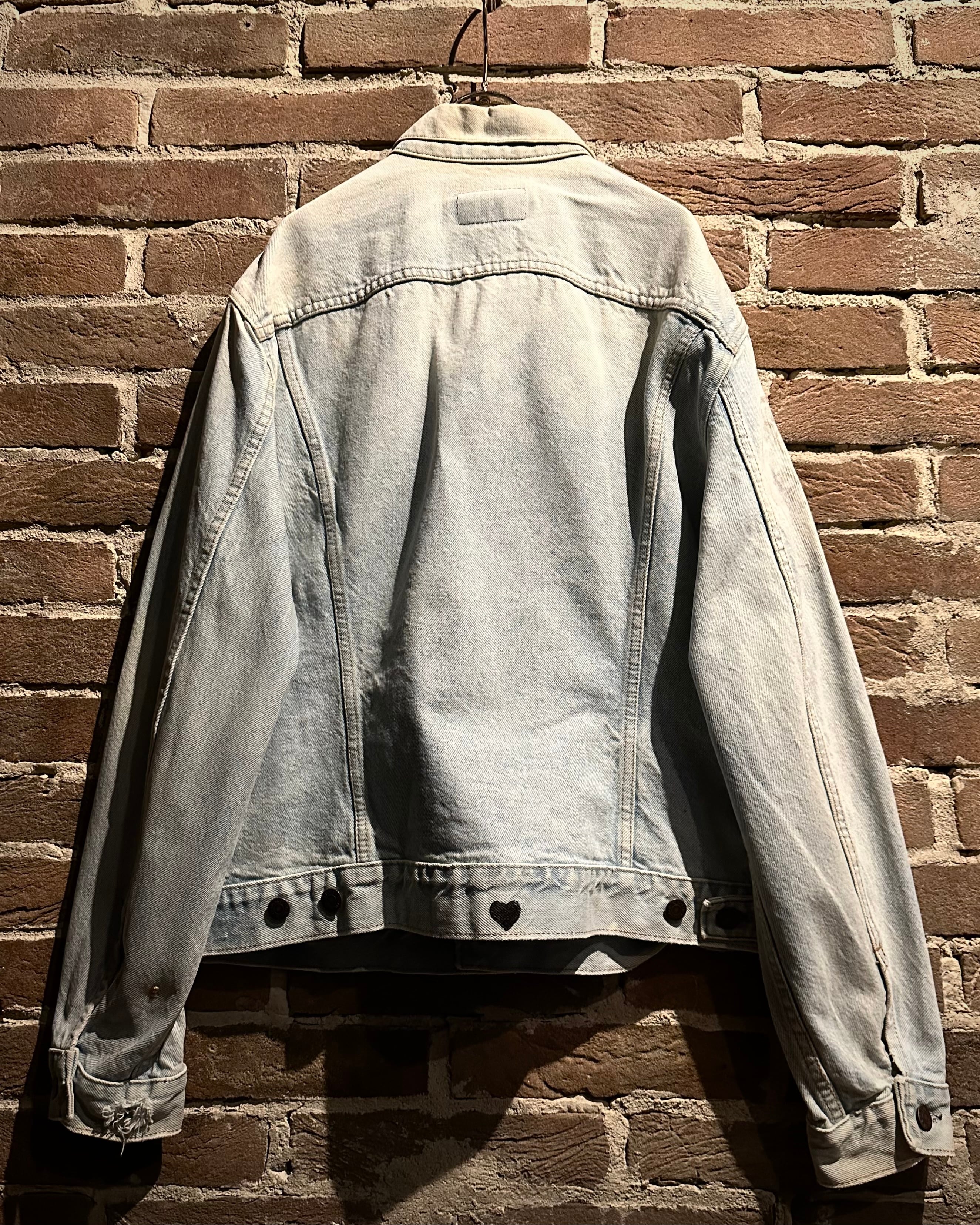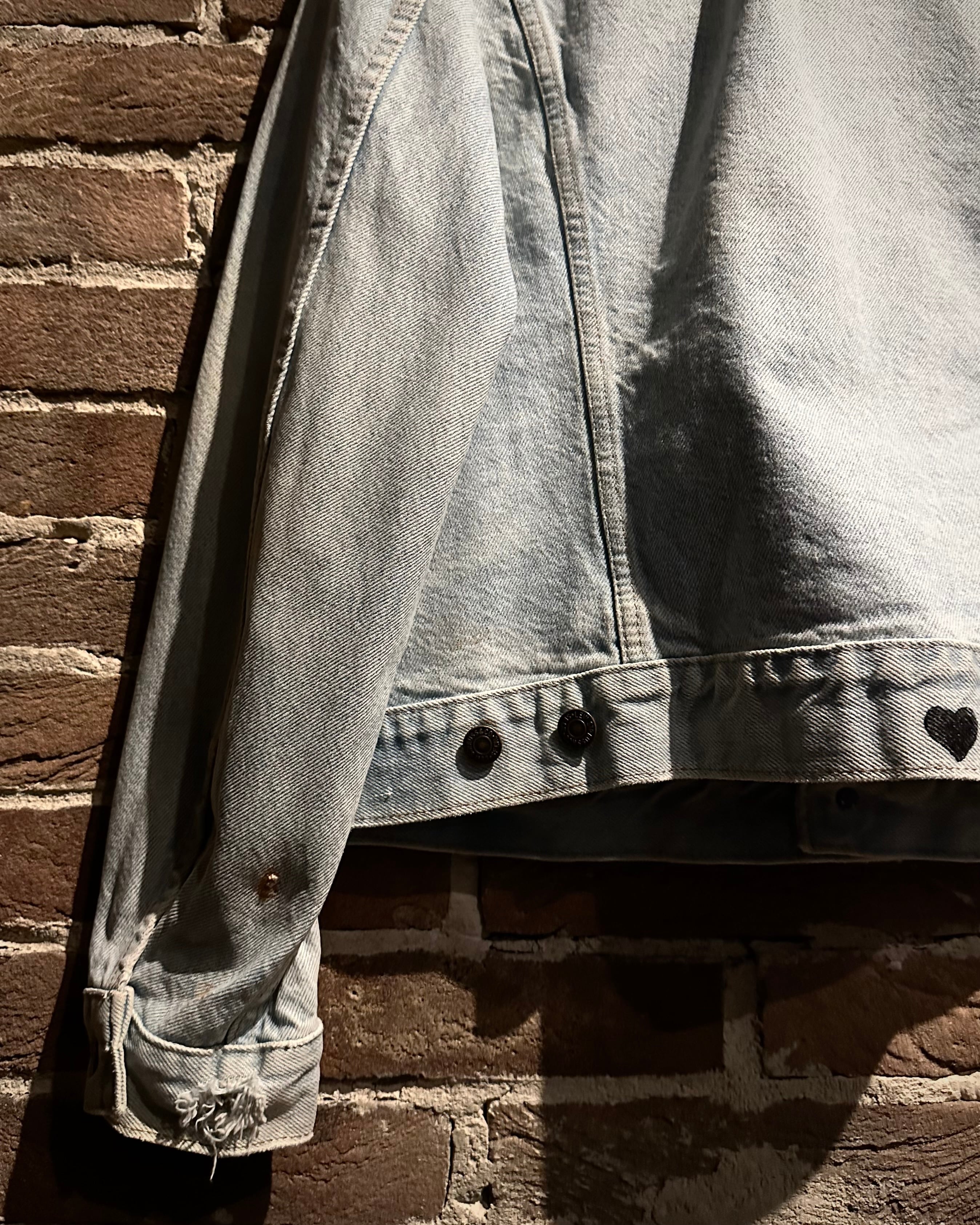 フロントにはフラップポケットやオリジナルボタンといった王道ディテールを踏襲しつつ、最大の特徴は胸元に施されたハンドドローイングのカスタム。ギターを抱えた人物とハートモチーフのラフなタッチは、どこかジミ・ヘンドリックスを彷彿とさせるアート性の高いデザインに仕上がっています。