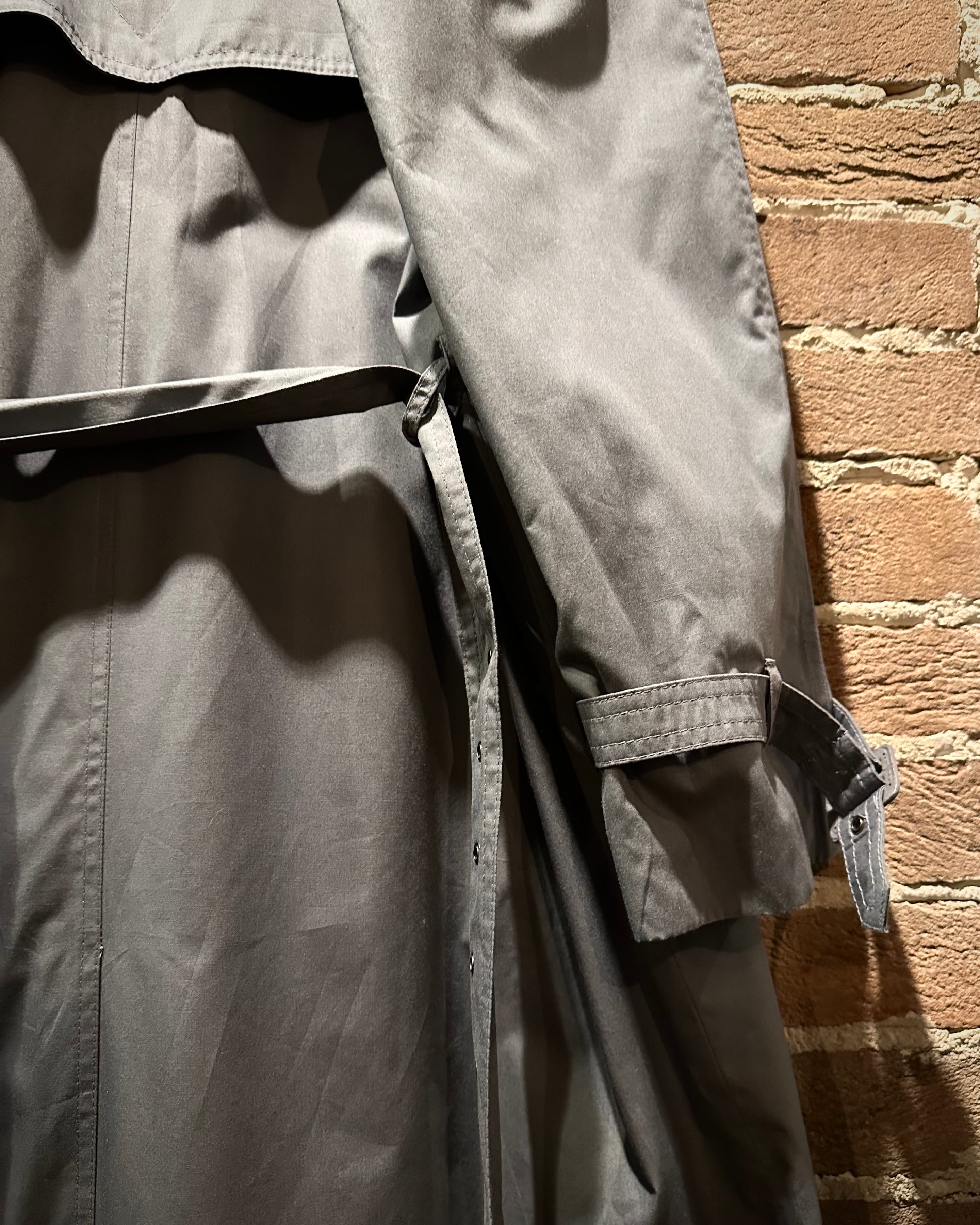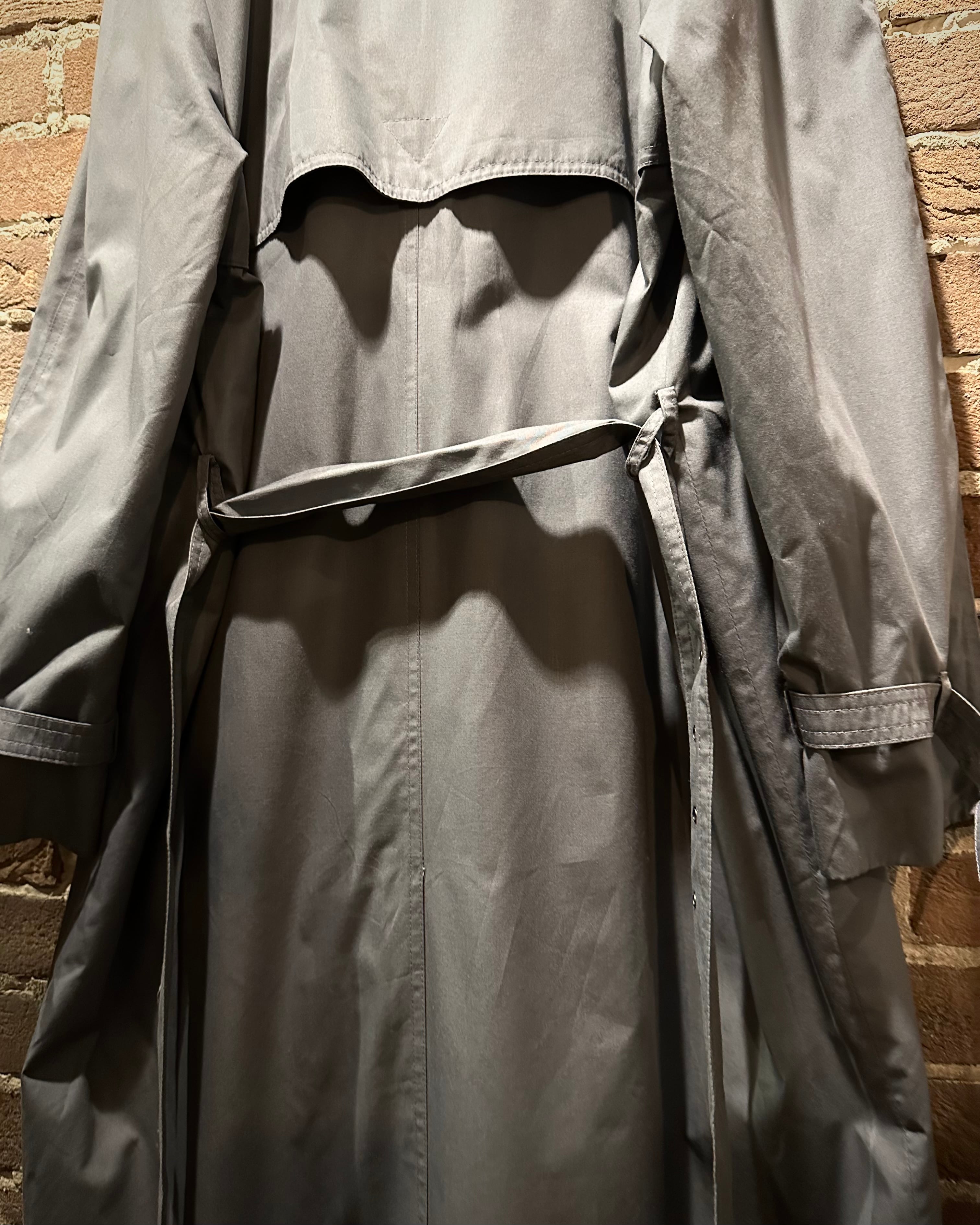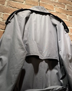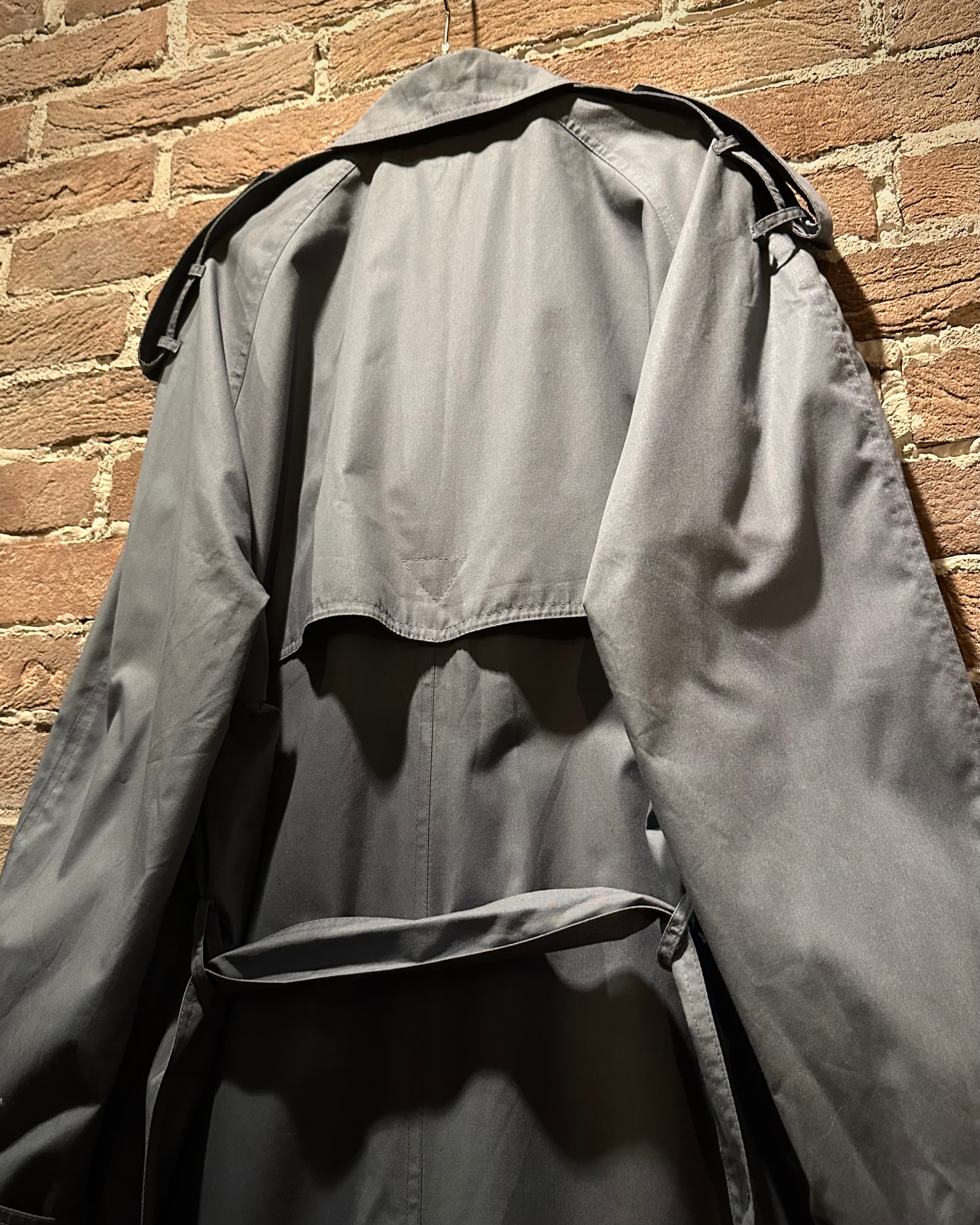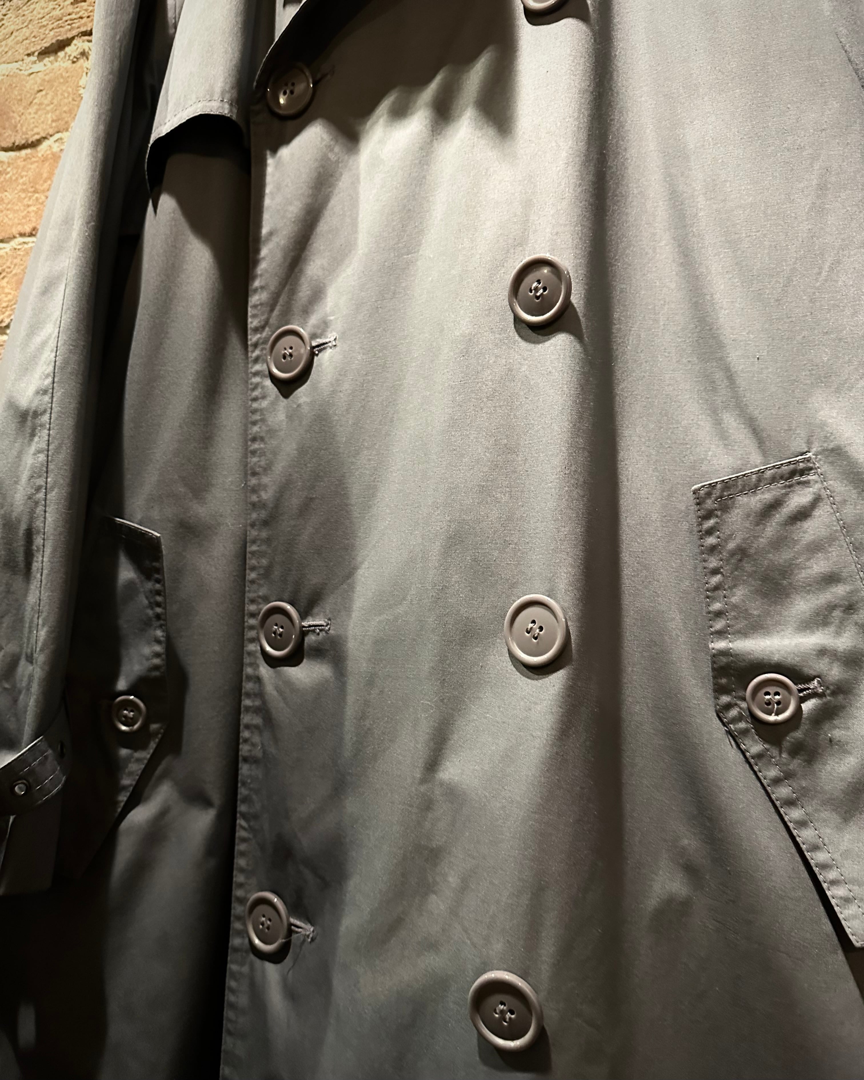 ハリとコシを持ちながらも、滑らかな質感に仕上げられた、くすんだグレーカラーの上質な素材を使用したトレンチコート。